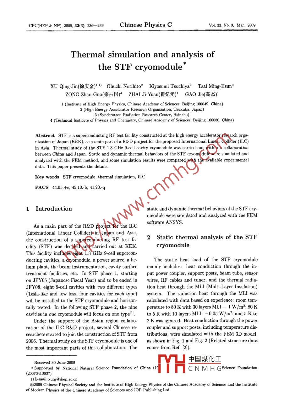 CPC(HEP & NP), 2009, 33(3): 236- -239Chinese Physics CVol. 33, No. 3, Mar., 2009Thermal simulation and analysis ofthe STF cryomodule'XU Qing Jin(徐慶金)") Ohuchi Norihito2 Kiyosumi Tsuchiya2Tsai Ming-Hsun3ZONG Zhan-Guo(宗占因)4 ZHAI Ji-Yuan(翟紀(jì)元) GAO Jie(高杰)'1 (Institute of High Energy Physics, Chinese Academy of Sciences, Beiing 100049, China)2 (High Energy Accelerator Research Organization, Tsukuba, Japan)3 (Synchrotron Radiation Research Center, Hsinchu)4 (Technical Intitute of Physics and Chemistry, Chinese Academy of Sciences, Beijing 10080, China)Abstract STF is a superconducting RF test facility constructed at the high energy accelerator research orga-nization of Japan (KEK), as a main part of a R&D project for the proposed International Linear Collider (LC)in Asia. Thermal study of the STF 1.3 GHz 9-cell cavity cryomodule was carried out within a collaborationbetween China and Japan. Static and dynamic thermal behaviors of the STF cryomodule were simulated andanalyzed with the FEM method, and some simulation results were compared with the available experimentaldata. This paper presents the details.Key words STF cryomodule, thermal simulation, ILCPACS 44.05.+e, 45.10.-b, 41.20.-q1 Introductionstatic and dynamic thermal behaviors of the STF cry-omodule were simulated and analyzed with the FEMAs a main part of the R&D project for the ILCsoftware ANSYS.(International Linear Collider) in Japan and Asia,2 Static thermal analysis of the STFthe construction of a superconducting RF test fa-cility (STF) was decided and carried out at KEK.cryomoduleThis facility includes eight 1.3 GHz 9-cell supercon-ducting cavities, a cryomodule, a power source, a he-The static heat load of the STF cryomodulelium plant, the beam instrumentation, cavity surfacemainly includes: heat conduction through the in-treatment facilities, etc. In STF phase 1, startingput power coupler, support posts, beam tube, sensoron JFY05 (Japanesc Fiscal Year) and to be endcd inwires, RF cables and tuner, and the thermal radia-JFY08, eight 9-cell cavities with two diferent types tion heat through the MLI (Multi-Layer Insulation)(Tesla-like and low loss, four cavities for cach type)system. The radiation heat through the MLI waswill be installed to the STF cryomodule and horizon-calculated with data based on experience: room tem-tally tested. In the fllowing STF phase 2, the nineperature to 80 K with 30 layers MLI- 1 W/m2; 80 Kcavities in onc cryomodule will focus on one typel1.to5 K with 10 layers MLI- 0.05 W/m2; and5K toUnder the support of the Asian region collabo-2 K was ignored. Hcat conduction through the powerration of the ILC R&D project, several Chinese re-coupler and support posts, including temperature dis-searchers started to join the construction of STF fromtributions, were simulated with the FEM 3D model,2006. Thermal study on the STF cryomodule is oneof as shown in Fig. 1 and Fig. 2 (Rclated structure datathe most important parts of this collaboration. Thecomes from Ref. [2).中國煤化工Received 30 June 2008●Supported by National Natural Science Foundation of China.MYHC N M H GScience Foundation(20070410637)1)E-mail: xuqj@ihep.c.cn@2009 Chinese Physical Society and the Institute of High Encrgy Physics of the Chinese Academy of Sciences and the Instituteof Modern Physics of the Chinese Academy of Sciences and IOP Publishing LtdNo. 3XU Qing Jin et al; Thermal simulation and analysis of the STF cryomodule_237AN,四=品Fig, 1. Static temperature field of 35 MV and 45 MV power couplers (Unit: K).281.893 .253.901225.912197.923169.934141.945113.95685.96757.97829. 989“(0.028 0.056 0.084 0112 0.140vertical dretion of the posts/mFig. 2. Static temperature field and temperature distribution along the vertical direction of the fixed post ofthe STF cryomodule (Unit: K).Figure 1 shows the static temperature fields of thepcrature variation along the vertical direction of the35 MV and 45 MV power couplers. For each coupler,posts is shown in Fig. 2.two thermal anchors (separately conncting with twoFigure 3 shows the static temperature distribu-radiation shields of the cryomodule) were added totions of the 5 K and 80 K radiation shields (with 1decrease the heat loads to the cryogenic system. Fopower coupler for each shield). The mass fow rate ofthe 35 MV coupler, the measured data of the roomhelium for the 5 K shield is 1 g/s, and the inlet tem-temperature, first thermal anchor tempcrature, sec-perature is 5 K. With a radiation heat fux of 0.05ond thermal anchor temperature and the cavity tem-W/m2, the simulation results show that the outletperature are 299 K, 83 K, 4.5 K and 2 K, respectively.temperature of the helium is about 5.25 K, and theWith these experimental data, and the ANSYS 3Dhot spot temperature of the shield (around the cou-model, the calculated heat loads of the coupler arepler port) is 5.91 K. For the 80 K shield, the mass2.41 W to the 80 K radiation shield, 1.08 W to the :flow of nitrogen is 1 g/s, and the inlet temperature(5 K) radiation shield and 0.03 W to the 2 K system.is 80 K. With the radiation heat fAux 1 W/m2, theIt is also found from the results that the copper coat-simulation result of the outlet temperature of the ni-ing with a thickness of only several microns at thetrogen is 86.8 K, and the hot spot temperature of theinner surface of the coupler plays a very importantshield (around the coupler port) is about 91.05 K.role in the heat conduction.A vacuum barrier structure was designed and fab-The materials of the support posts are G10 andricated to separate the vacuum of the cryomodule andstainless steel. From the upper side to the lower side,the valve box into two independent parts, to decreasethe posts are connected with the vacuum vessel, thethe vacuum failure possibility of the cryomodule (see80 K radiation shield, the 5 K radiation shield andFig.4). The materials of the barrier are stainless steelthe 2 K system. Fig. 2 shows the simulation results(SS316中國煤化工,5K a