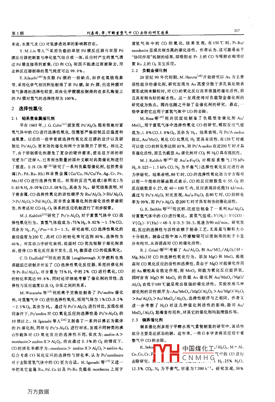第33卷第5期No s003年10月BATTERY BIMONTHLYOet.,2003甲醇重整氣中CO去除的研究進(jìn)展劉舂濤,史鵬飛,張新榮(哈爾濱工業(yè)大學(xué)應(yīng)用化學(xué)親,黑龍江哈爾濱150001)摘要:評逑丁質(zhì)子交換膜燃料電池( PEMFC)甲醇重箜氣中CO去除的現(xiàn)實意義。對CO去除的常用方法鈀膜及選擇性氧化進(jìn)行丁綜逑,重點介鯧了選擇性氧化催化劑關(guān)鍵詞:質(zhì)于交換膜然料電池;甲醇重整氣;CO去除;鈀膜;選擇性氧化中圖分類號:TM91l42文獻(xiàn)標(biāo)識碼:B文章編號:1001-1579(2003)05-0316-03Research progress on Co removal in methanol reformed gasesLIU Chun-tao, SHI Peng-fei, ZHANG Xin-rongDepartment of Applied Chermistry, harbin Institute of Technology, harbin, Heilongjiang 150001, ChinaAbstract: The practical significance of CO removal in methanol reformed gases for proton exchange membrane fuel cell(PEMFC)was introduced. Popular processes of Co removal including Pd-membrane and selective oxidation were reviewed and selectiveoxidation catalysts were especially discussedKey words: PEMFC; methanol reformed gases: CO removal: Pd-membrane: selective oxidation當(dāng)燃料電池電動車以純氫為燃料時,它能達(dá)到真正且操作需在較高的壓差下(約1~2MPa)進(jìn)行。相對而言,選擇排放;而當(dāng)以車載甲醇重整器制氫為燃料時,車的尾氣排放也性氧化去除CO則被認(rèn)為是低成本的更實用的方法能達(dá)到美國加利福尼亞州制定的超低排放標(biāo)準(zhǔn)(山。PEMFC為純氫以純氫為燃料時氫的貯存和輸送有一定1鈀膜分離危險,要建立氫供給設(shè)施,投資巨大。由于直接甲醇燃料電池金屬Pd及其合金膜可以選擇性地讓氫氣分子通過,面阻(DMFC)存在甲醇在電解質(zhì)膜內(nèi)間滲透、容易造成電池性能下斷其它一切氣體因而可以獲得高純度的氫氣。使用鈀膜存在降以及少量甲醇在尾氣中排放等現(xiàn)象2),使其應(yīng)用受到限制。一些缺點,如在低于300℃時隨著滲入氫氣的濃度變化、鈀采用高度集成的車載甲醇重整器制氫-作為 PEMFC電動車發(fā)生aB相轉(zhuǎn)變,引起晶格的膨脹和收縮變化,導(dǎo)致鈀膜變脆的氫源是切實可行的。變裂。現(xiàn)在常用的分離氫氣的鈀膜為Pd24%Ag膜。由于受重整反應(yīng)的動力學(xué)及熱力學(xué)的限制,甲醇重整氣中 B. Emonts等(研究表明,由于CO易于在Pd膜上發(fā)生化學(xué)吸除了含有75%左右H2和25%左右(體積百分比)CO2以外還附而使得氫氣在鈀膜上的滲透性能下降,在CO存在時膜分離含有0.5%~2%的COCO是 PEMFC催化劑的嚴(yán)重毒化劑,的最低溫度為30℃。要提高膜的滲透速率,常用的方法為減即使每升只含有幾毫克,也能對電池性能產(chǎn)生很大影響4。針小膜的厚度,由于薄的Pd膜機械強度差,不能承受較高的壓對此問題已采取了一些處理方法,如對電催化劑進(jìn)行改性提差所以必須把膜負(fù)載在某種載體上。B. Emants等已將傳統(tǒng)的高對CO的抵抗能力雖然取得了一定成果,但仍有必要對重整pd膜(厚度為80~100-m)減小到1-5gm,負(fù)載在陶瓷上。由氣進(jìn)行處理,降低CO濃度于陶瓷載體與Pd膜的熱膨脹系數(shù)不同,Pd膜易于脫落,使得部對甲醇重整氣中CO進(jìn)行去除的常用方法有膜凈化、壓力分CO漏出因此就需要進(jìn)一步凈化。AL等18)考察了水蒸氣變換吸附、選擇性甲烷化以及CO選擇性氧化。國外對CO的及CO對沉積在不銹鋼上Pd膜的氫氣滲透速率的影響結(jié)果表去除多采用鈀膜分離及選擇性氧化。由于鈀膜工藝成本較高,明,水蒸氣在Pd膜上的吸附比CO更強。對于 PEMFC的進(jìn)氣作者簡介1凵中國煤化工劉舂溽(1972-),女,黑龍江省人,哈爾濱工業(yè)大學(xué)應(yīng)用化學(xué)梟博士生CNMHG史鸚飛(1938-)男,遼寧省人,哈爾濱工業(yè)大學(xué)應(yīng)用化學(xué)教授,博士生導(dǎo)師,研究方向:電化學(xué)和化學(xué)電源張新榮(1971-),女,河南省人,哈爾濱工業(yè)大學(xué)應(yīng)用化學(xué)無博士生,研究方向:攜料電池灲春海,等:甲醇重整氣中CO去除的研究進(jìn)展來說,水蒸氣及CO對氫滲透效率的影響都存在富氫氣體中的CO的氧化,結(jié)果發(fā)現(xiàn),在150℃時,PtRtYMin等人采用負(fù)載的單層P膜反應(yīng)器與雙層 Pd mordenite呈現(xiàn)出相當(dāng)高的催化活性。作者認(rèn)為,這可能是由于膜反應(yīng)器把制氫與凈化氫氣結(jié)合成一體,反應(yīng)時產(chǎn)生的氫氣透“協(xié)同作用機制的結(jié)果即吸附在Pt上的CO與吸附在相鄰位過Pd膜直接得到富集,OO和CO2則因不能透過而被除去,用置Ru上的O2發(fā)生反應(yīng)這種反應(yīng)器制得的氫氣純度可達(dá)99.9%。2.2負(fù)載金催化劑E. Kikuchi10為克服Pd膜的一些缺點,如存在氫脆現(xiàn)象20世紀(jì)90年代初期, M. haruta8開始研究以Au為主要等,采用化學(xué)氣相沉積法制得了非Pd膜,如Pt膜,但這種膜對活性組分的催化劑,研究發(fā)現(xiàn)當(dāng)Au高度分散于多孔氧化物表氫氣滲透的選擇性較差,面由化學(xué)鍍膜法制得的在多孔陶瓷上面形成納米顆粒時,對CO的氧化反應(yīng)具有很強的催化活性,而的Pd膜對氫氣的選擇性卻為100%。且具有相當(dāng)好的耐水性。這一發(fā)現(xiàn)使得對負(fù)載型金催化劑的研究成為熱點。囡內(nèi)也隨之開始了金催化劑的研究。最近2選擇性氧化些學(xué)者把它應(yīng)用于富氫氣體中CO的去除。早在1965年, G, Cohn1發(fā)現(xiàn)PAO能有效地對富Mr.Ra等用共沉淀法制備了負(fù)載型金儷化劑Au2.1
