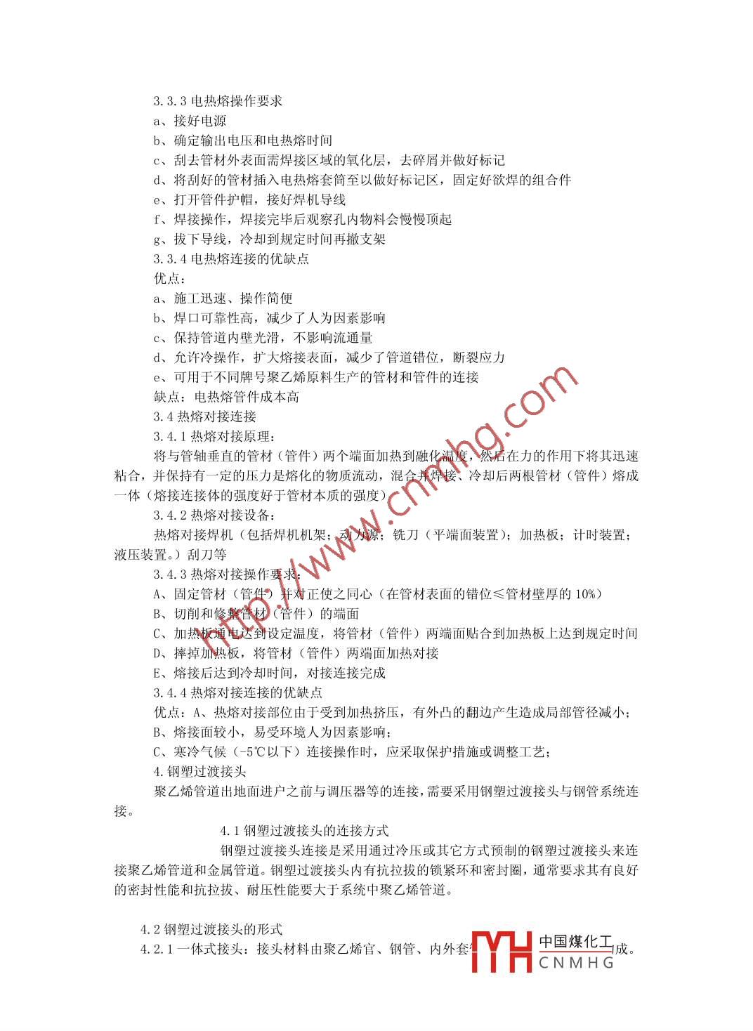 聚乙烯管道在燃?xì)廨斉渖系膽?yīng)用杜曉波齊齊哈爾市港華燃?xì)庥邢薰竞邶埥?齊齊哈爾161000摘要:聚乙烯管道在國(guó)內(nèi)外取得相當(dāng)好的社會(huì)經(jīng)濟(jì)效益,應(yīng)用廣泛。其在燃?xì)廨斉渖系膽?yīng)用技術(shù)以相當(dāng)成熟,本文就聚乙烯管道在燃?xì)廨斉渖系膽?yīng)用問題進(jìn)行了探討。關(guān)鍵詞:聚乙烯管道;燃?xì)廨斉?應(yīng)用Abstract: polyethylene pipes madegood social and economic benefits at homeand abroad, a wide range of applications. In gas transmission and distributiontechnology is quite mature, polyethylene pipeline in gas transmission anddistribution applications.Keywords: polyethylene pipes; gas transmission and distribution; application中圖分類號(hào): TU96. 7文獻(xiàn)標(biāo)識(shí)碼: A文章編號(hào): 2095- -2104 (2012)我國(guó)現(xiàn)行的《燃?xì)庥寐竦鼐垡蚁┕懿摹?GB15558. 1-95)《燃?xì)庥寐竦鼐垡蚁┕芗?(GB15558.2- -95) 國(guó)家標(biāo)準(zhǔn)和《聚乙烯燃?xì)夤艿拦こ碳夹g(shù)規(guī)程》(CJJ63- -95) 行業(yè)標(biāo)準(zhǔn)是針對(duì)目前國(guó)際上較多采用的第二代(PE-80) 聚乙烯燃?xì)夤艿缹S昧现贫ǖ摹D壳耙延袊?guó)家采用了第三代(PE-100) 聚乙烯管專用料。1.聚乙烯燃?xì)夤懿牡奶攸c(diǎn)聚乙烯管道用于燃?xì)廨斉?上始于- -九五六年的美國(guó),在此前后淘汰了醋酸一丁 酸纖維素管道、硬聚乙烯管道、環(huán)氧玻璃鋼管道、滌綸管道和尼龍管道,這是因?yàn)?1.1聚乙烯有很好的柔韌性,加工的管材可以盤管成卷,從而能使管網(wǎng)中的接頭數(shù)量減少。1.2聚乙烯可蛇行銷設(shè),可輕易繞過障礙物進(jìn)一步減少接頭數(shù)量。1. 3聚乙烯屬熱朔性所朔料,可多次加工成型、使熱熔和電熔成為可能。1.4聚乙烯有很好的耐腐蝕性,因此聚乙烯管埋地不需要防腐。1.5聚乙烯抗沖擊性能好,具有較高的斷裂伸長(zhǎng)率。1. 6聚乙烯管具有較好的氣密性環(huán)節(jié)之一。由于燃?xì)夤艿奶厥庥猛?,使用普通的聚乙烯材質(zhì)是不能滿足特殊用途的需要,應(yīng)此必須加路一定的添加劑、抗氧劑、紫外線穩(wěn)定劑是為了增強(qiáng)聚乙烯管道抗老性能,使其在五十年中保持良好的特性;加著色劑是為了便與其它管道區(qū)別。隨著石華工業(yè)的發(fā)展,燃?xì)庖蚓垡蚁┰系陌l(fā)展經(jīng)歷了第一一代、第二代、第三代等,聚乙烯燃?xì)夤艿缹S昧系姆诸愊卤?類型長(zhǎng)期靜液壓強(qiáng)度(Mpa)最低要求強(qiáng)度(MRS )(LTH20C 50年97. 5%)(Mpa)PE 63 (第一 -代)6.30~ 7. 996.3PE 80 (第二代)8.00^ 9.998.0PE 100 (第三代)10.0~11.1910.0PE112 (第四代)≥111.211.22.聚乙烯燃?xì)夤懿牡纳a(chǎn)2.1生產(chǎn)設(shè)備:2.1.1單螺桿擠出機(jī)(長(zhǎng)經(jīng)比L/D=28、自動(dòng)計(jì)量上料、溫度自動(dòng)控制、壁后超聲波監(jiān)測(cè))。2. 1.2真空定經(jīng)裝置。中國(guó)煤化工2.1.3噴淋冷卻。MYHCNMH G2. 1.4牽引裝置。2.1.5打印標(biāo)準(zhǔn)裝置。2.1.6計(jì)量卷取切割裝置。2.2工藝流程2.2.1原料準(zhǔn)備(洪干);2. 2.2投料擠出;2.2.3冷卻定型;2.2.4牽引2. 2.5打印標(biāo)記;2. 2.6計(jì)量切割;2.2. 7檢驗(yàn);2.2.8包裝。2. 3聚乙烯燃?xì)夤艿囊?guī)格尺寸(mm):公稱外經(jīng)Dn壁厚e基本尺寸允許偏差SDR11工作壓力《0. 4MPaSDR11工作壓力<0. 2MPa5(+0. 44. 6+0.62.9+0.465.8+0.73.6+0.576.898.2+1.0125+0.6.11.4 .+1.37.1+0.93.聚乙烯燃?xì)夤芗纳a(chǎn)3.1電熱熔管件電熱熔管件是用某種方法將電熱絲布置與管件內(nèi)表面,施工時(shí)將管材與管件配合后,用專用的加熱溶制電源將管件的電熱絲通電加熱,使管材與管件的接觸表面熔化結(jié)合,冷卻后使管材和管件牢固緊密地結(jié)合在一起。由于施工方便快捷,焊接效果好,電熱熔管件是目前世界上聚乙烯管材連接件中最廣泛的一種。 缺點(diǎn)是成本高。電熱熔管件是由注塑生產(chǎn)工藝制造,各廠家都采用專利技術(shù)將電熱絲布置嵌入管件中,在使用時(shí)選擇與之匹配的焊機(jī)才能達(dá)到最佳焊接效果。3. 2熱熔對(duì)接管件熱熔對(duì)接管件是指用于加熱板對(duì)接焊的管件,對(duì)于小口徑的對(duì)接管件(DN110mm以下)-般為注射生產(chǎn),而對(duì)于大口徑管件不宜注塑生產(chǎn),-一般采用焊接方法制造以降低成本。注射管件的生產(chǎn)工藝流程:(1)原料準(zhǔn)備(2)模具準(zhǔn)備(3) 注射機(jī)準(zhǔn)備..... (4)注射成型(5)檢驗(yàn)(6) 包裝入庫。四、聚乙烯燃?xì)夤艿赖倪B接方式目前聚乙烯燃?xì)夤艿赖倪B接方式主要采用電熱熔連接和熱熔對(duì)接連接。3. 3電熱熔連接3.3.1電熱熔原理電熱熔連接是將所需的連接的管端插入埋有電熱絲的電熱熔管件中,將電阻絲通以電流,電阻絲產(chǎn)生的熱能使管采外表面和管件內(nèi)表面融化成--體,固定直至接口冷卻,從而形成牢固緊密的接頭。3.3.2電熱熔設(shè)備中國(guó)煤化工電熱熔焊機(jī)、刮到和支架等專用工具。MHCNMH G3. 3.3電熱熔操作要求a、接好電源b、確定輸出電壓和電熱熔時(shí)間c、刮去管材外表面需焊接區(qū)域的氧化層,去碎屑并做好標(biāo)記d、將刮好的管材插入電熱熔套筒至以做好標(biāo)記區(qū),固定好欲焊的組合件e、打開管件護(hù)帽,接好焊機(jī)導(dǎo)線f、焊接操作,焊接完畢后觀察孔內(nèi)物料會(huì)慢慢頂起g、拔下導(dǎo)線,冷卻到規(guī)定時(shí)間再撤支架3.3.4電熱熔連接的優(yōu)缺點(diǎn)