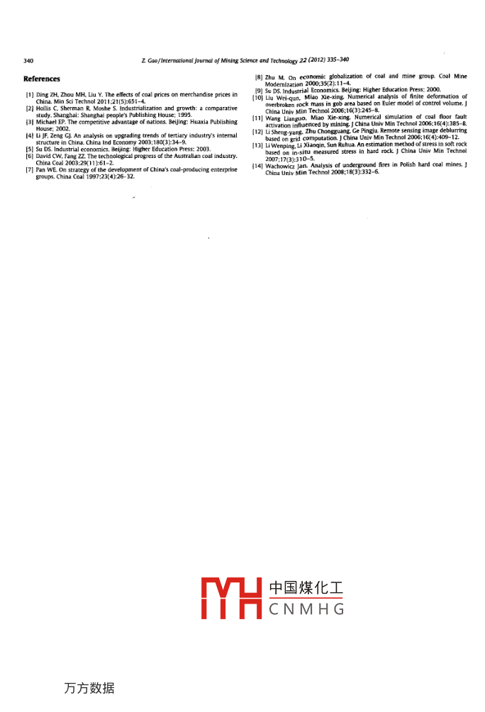 and Technolory 22(20125335-340Contents lists available at SciVerse Science DirectInternational Journal of Mining Science and TechnologyELSEVIERjournalhomepagewww.elsevier.com/locate/ijmstSustainable development and upgrading mode of coal industry in ChinaGao Zhenguohool of Economics. Wuhan Universiry of Technology, Wuhan 430070, ChineZhengzhou Coal lndustry(Group)Co., Ltd, Zhengzhou 450007, ChinaARTICLE INFOArticle historyHe online 22 May 2012Upgrading modeticee 2012 Published by Elsevier B, V, on behalf of China University of Mining Technology1 IntroductionAmong them. the product upgrading referred to the expansionand extension of a range of products, process upgrading referredCoal is an important non-renewable energy, which has a keyther skills and beesign improvement and ability to producing and marketi constanthe presence and impact of the above problems (as very impor-elink tohigher value goods and services, including sup-ly chain forwards and backwards contrment ofetween the departments, that is, from lotpromotingss of coal industry, which [6-8). On the basis of this classification, Humof coal industry have an important practical and theoretical upgrading. through expense managemintroduction of advanced technology for transferring the inputs toIn the late 1990s, foreign scholars introducedthree categories: product, process, and functioniYTH中國煤化工CNMHGting, or giving up the existing lowTel:+8637187783166E-maladdressgaozg56789163.comlast is upgrading within the departments, ie. applying the ability2095-2656s-see front matter o 2012 Published by Elsevier B V on behalf of China University of Mining Technology.anathat gets from a particular part to a new field or a new GvC, alsotry as whole is at low level of technology, smy of industrial upgrading, the upgrading ofprocess lags behind, thproduction enterprises accounted for about 25, 6% of theng conditionsomestic coal in 2006. In sharp contrasthe cogy for coal safety production, extending the coal industry chains.lizing the transformation from low added value to the higminingm如和期間ww, andThe developmental trend of Chinas coal industry in recentyears can be presented in following three aspects:hand it cannot formm very good(1)Acceleration of construction of large base enterprise, Since2003 the state beganof the coal industry is closely relmetallurgy, chemical and building materialsindustries and winter which is relatively a seasonal salelilt up a batch of large coal enterprise groups, industrialIn summary, there are three types of the domestic coal industrial upgrading methods: first, with large coal enterprises as thmain body to promote the upgrading of the coalvalue and low efficiency " coal-based" principlion tons, large coal production base reached 2.24 billion industry upgrading: bringing the large scale state-owned coai(2)The acceleration of transformationngitudinally advantages the coal industriversities of the industry. Only by the way that the coal as a downstream industries, spins coal-based industry chain, adjuscould lead the industry to realize sustain. new product and makes coal resource to maximize its beef(3)The resource concentration is continuously perfecting.In recent years, Hebpeepdhe upgrading coal industy But to certain level it orientatescoal enterprises reduced to 52. Analysis of the mechanism of sustainable development in thecoal industrynterprises since 2004. The coal resource outputhan 90% in t21 Connotation and characteristic of sustainable development in theacity of up to coal indusnSustainable development of the coal industry means realizing中國煤化工 ry througneeds to recognize the following existing problemsCN MH Ghrough perfecting and improving(1)The overall level of technology is low. After years of develop- improving the quality and ability to develop the industro improving, and social sustainable developments, Sustainable development isbut compared with developed countries, China's coal indus. based on protecting nature, and adapting to the bearing capacitycoof the resource and environment It decreasesl22.Eental qualityoutraging thepacity at the same time keeping developmental progress of industry are manifested in four aspects: resource environmenonomy and society (Table 1)nly in the23. Competitive sustry.velopmentent of the living standards of human, improve behavamongst the coal enterprises. Thus, analyzing the competitiohich en-that the people enjoy rigeducateded con, On theIts economic growth mode does not only pay attention to the inindividual competitors turn teThe forming process of coal industry competitiveness is exss of the coal industry assets x compcoordination with giving full play to theof the environment x competitiveness ofThe adjustment of the structure of coal industry must focus onin the environment of the bearing capacity so as to save energy the degree of association and development of coal-related industryand reduce wastage, protect the environment, optimize ecology, chain. The degree of association refers to the relation which ise demand and supply of coal products among condustry and other industriesThe essence of upgrading the coal industrial cluster is thphasizing the needs of parketing goods, aneet the baspeople, to all who provide the opportunity to realize beautiful liv.ustment of industry and product structure. Thusxtroverted degree and brand are three key factors for buildingindustrial duster(1)The development of sustainability. On one hand the interior3. Analysis of the upve innovation: on the other 3. Principles of upgrading of coal indusnhe upgrading of coai industry, the principles ofresources industry and environment should be within the development mode are as follow(2] The ecologization of(1)Insistatus, choosing theinction of finding. It can find the demand of the market,dustry chain extend from low to hightects the environment and at the same timeded value and high profit margin, so as to raiseasts and the consumption of water pump to promote(