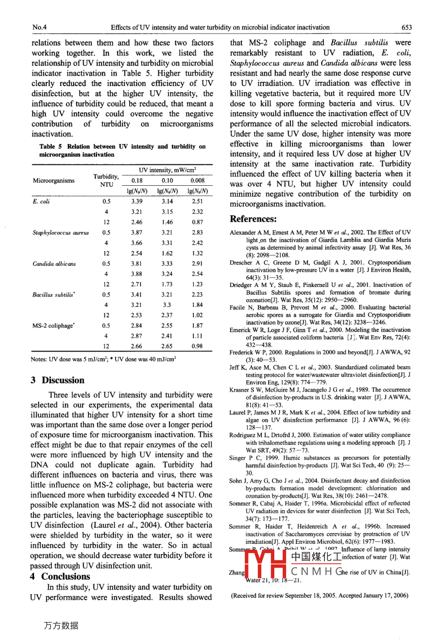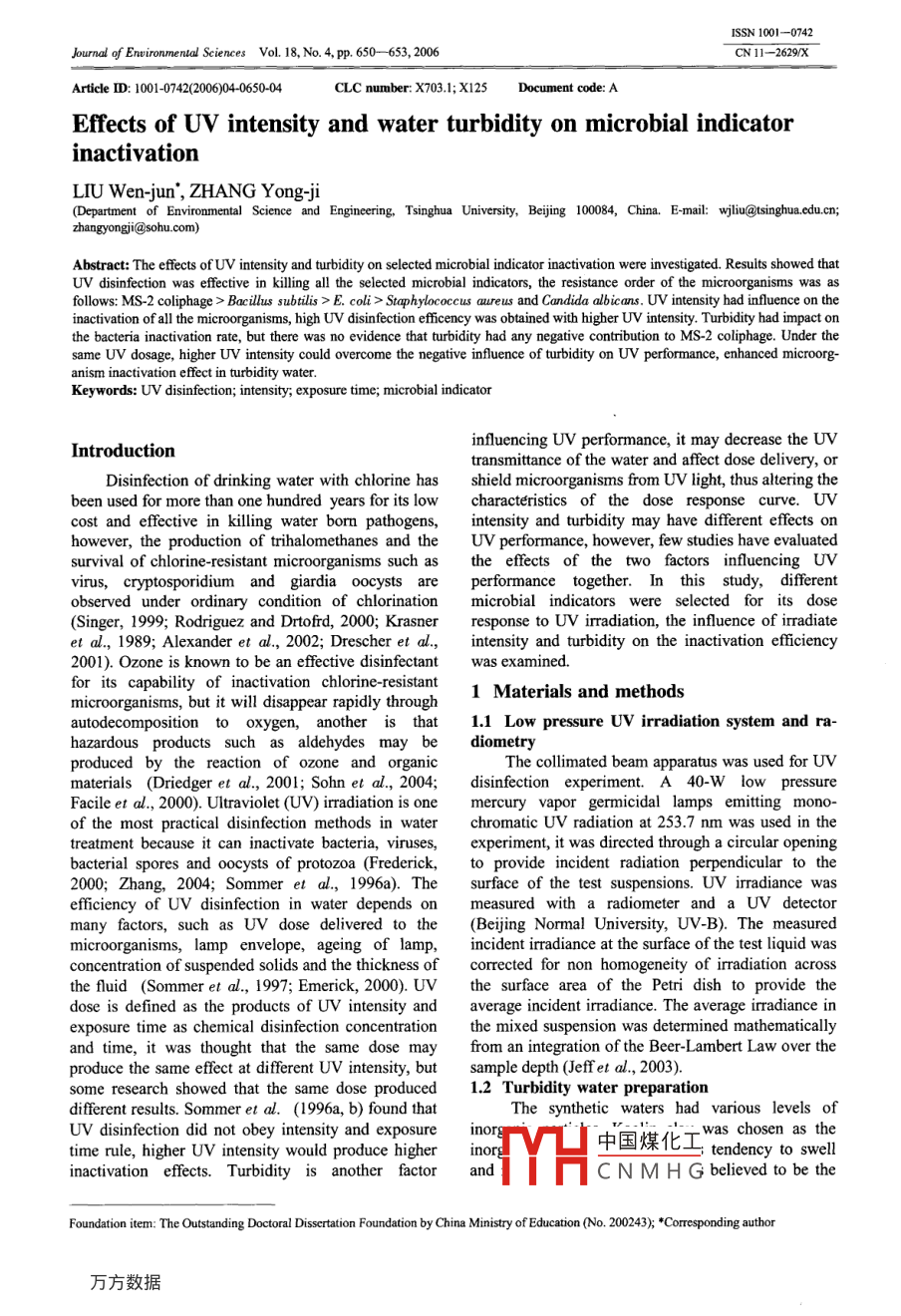 ISSN 1001-0742Journal of Enwironmental Seiences Vol. 18, No. 4, pp.650- 653, 2006CN11- -2629/XArticle D: 101-07420604-0650-04CLC number: X703.1; X125Document code: AEffects of UV intensity and water turbidity on microbial indicatorinactivationLIU Wen-jun", ZHANG Yong-ji(Department of Environmental Science and Engnering, Tsinghua University, Beijing 10084, China. E-mail: wjiliu@tsinghua.edu.cn;zhangyongji@sohu. com)UV disinfection was effective in klling all the selected microbial indicators, the resistance order of the microorganisms was asfllows: MS-2 coliphage > Bacillus subilis > E. coli > Staphylococcus aureus and Candida albicans. UV intensity had influence on theinactivation of all the microorganisms, high UV disinfection eficency was obtained with higher UV intensity. Turbidity had impact onthe bacteria inactivation rate, but there was no evidence that turbidity had any negative contribution to MS-2 coliphage. Under thesame UV dosage, higher UV intensity could overcome the negative influence of turbidity on UV performance, enhanced microorg-anism inactivation effect in turbidity water.Keywords: UV disinfection; intensity; exposure time; microbial indicatorinfluencing UV performance, it may decrease the UVIntroductiontransmitance of the water and afect dose delivery, orDisinfection of drinking water with chlorine hasshield microorganisms from UV light, thus altering thebeen used for more than one hundred years for its lowcharacteristics of the dose response curve. UVcost and effective in killing water born pathogens,intensity and turbidity may have different effects onhowever, the production of trihalomethanes and thUV performance, however, few studies have evaluatedsurvival of chlorine-resistant microorganisms such asthe effects of the two factors influencing UVvirus, cryptosporidium and giardia oocysts areperformance together. In this study, differentobserved under ordinary condition of chlorinationmicrobial indicators were selected for its dose(Singer, 1999; Rodriguez and Drtofrd, 2000; Krasnerresponse to UV irradiation, the influence of irradiateet al., 1989; Alexander et al, 2002; Drescher et al.,intensity and turbidity on the inactivation efficiency2001). Ozone is known to be an effective disinfectantwas examined.for its capability of inactivation chlorine-resistant1 Materials and methodsmicroorganisms, but it will disappear rapidly throughautodecomposition to oxygen, another is that1.1 Low pressure UV irradiation system and ra-hazardous products such as aldehydes may bediometryproduced by the reaction of ozone and organicThe collimated beam apparatus was used for UVmaterials (Driedger et al, 2001; Sohn et al, 2004;disinfection experiment. A 40-W low pressureFacile et al, 2000). Ultraviolet (UV) irradiation is onemercury vapor germicidal lamps emitting mono-of the most practical disinfection methods in waterchromatic UV radiation at 253.7 nm was used in the .treatment because it can inactivate bacteria, viruses,experiment, it was directed through a circular openingbacterial spores and oocysts of protozoa (Frederick,to provide incident radiation perpendicular to the2000; Zhang, 2004; Sommer et al, 1996a). Thesurface of the test suspensions. UV irradiance wasefficiency of UV disinfection in water depends onmeasured with a radiometer and a UV detectormany factors, such as UV dose delivered to the(Beijing Normal University, UV-B). The measuredmicroorganisms, lamp envelope, ageing of lamp,incident irradiance at the surface of the test liquid wasconcentration of suspended solids and the thickness ofcorrected for non homogeneity of irradiation acrossthe fluid (Sommer et al, 1997; Emerick, 2000). UVthe surface area of the Petri dish to provide thedose is defined as the products of UV intensity andaverage incident iradiance. The average iradiance inexposure time as chemical disinfection concentrationthe mixed suspension was determined mathematicallyand time, it was thought that the same dose mayfrom an integration of the Beer-Lambert Law over theproduce the same ffect at different UV intensity, busample depth (effet al., 2003).some research showed that the same dose produced1.2 Turbidity water preparationdifferent results. Sommer et al. (1996a, b) found thatThe synthetic waters had various levels ofUV disinfection did not obey intensity and exposureinor中國(guó)煤化工was chosen as thetime rule, higher UV intensity would produce highertendency to swellinactivation effects. Turbidity is another factorYHCNMHGbelievedtobetheFoundation item: The Outstanding Doctoral Dissertation Foundation by China Ministry of Education (No. 200243); *Coresponding authorNo.4Effects ofUV intensity and water turtbidity on microbial indicator inactivation651representative of many natural water turbidity2.1 UV irradiation on microorganism inactiva-particles and a potential worst particle for shielding.tionDifferent amount of kaolin clay was seeded to steriledThe dose response curve for UV irradiation onwater, turbidity was measured with a HANNAdifferent microorganisms at a UV intensity of 0.10turbidity meter, before each use, the turbidity metermW/cm2 was evaluated (Fig.1). MS-2 coliphage andwas calibrated according to the manufacturer'sBacillus subtilis were more resistant than otherinstructions.microorganisms, only 2.4 and 3.1 lg(NJN) reduction1.3 Test organismswas achieved respectively at a UV dose of 40 mJ/cm2,E. coli 1.3373, Bacillus subtilis (ATCC 9372),and MS-2 was more UV resistant than BacillusStaphylococcus aureus (ATCC 6538), Candidasubtilis. Staphylococcus aureus and Candida albicansalbicans (ATCC 10231) were obtained from Micro-were susceptible to UV irradiation and had nearly thebiology School of Chinese Academy of Sciences,same response to UV irradiation, nearly 4.6 ofMS-2 coliphage 15597-B, and its host strain E. colilg(N/N) reduction was achieved at a UV dose of 10(ATCC 15597) was provided by Canadian GAPmJ/cm?. E. coli was more resistant than the other two,Microorganism Company. The gro