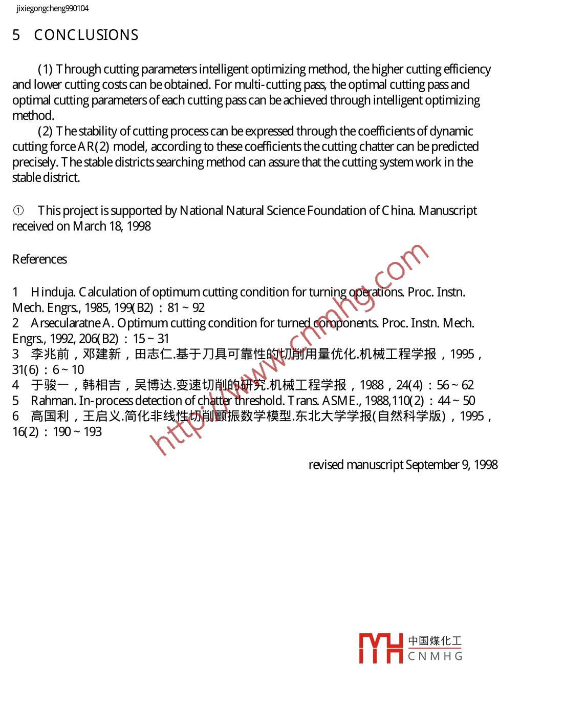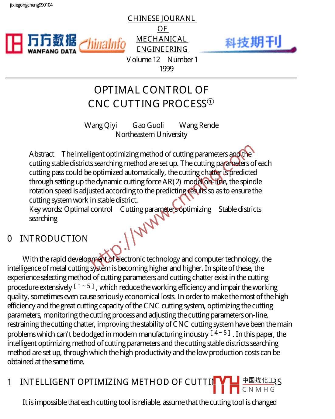 jixiegongcheng990104CHINESE OURANLOF田ChinanfoMECHANICAL科技期刊。ENGINEERINGWANFANG DATAV olume 12 Number 11999OPTIMAL C ONTROL OFCNC CUTTING PROCESS①Wang QiyiGao GuoliW ang RendeNortheastern U niversityAbstract The itelligent optimizing method of cutting parameters and thecutting stable districts searching method are set up. The cutting parameters of eachcutting pass could be optimized automatically, the cutting chatter is predictedthrough setting up the dynamic cutting force AR(2) model on-line, the spindlerotation speed is adjusted according to the predicting results so as to ensurethecutting system work in stable district.Key words: Optimal control Cutting parameters optimizing Stalble districtssearching0 INTRODUCTIONWith the rapid development of electronic technology and computer technology, theintelligence of metal cutting system is becoming higher and higher. In spite of these, theexperience selecting method of cutting parameters and cutting chatter exist in the cuttingprocedure extensively[ 1~5] , which reduce the working efficiency and impair the workingquality, sometimes even cause seriously economical losts. In order to make the most of the highefficiency and the great cutting capacity of the CNC cutting system, optimizing the cuttingparameters, monitoring the cutting process and adjusting the cutting parameters on-line,restraining the cutting chatter, improving the stability of C NC cutting system have been the mainproblems which can't be dodged in modern manufacturing industry[4~5] . In this paper, theintelligent optimizing method of cutting parameters and thecutting stabledistricts searchingmethod are set up, through which the high productivity and the low production costscan beobtained at the same time.1 INTELLIGENT OPTIMIZING METHOD OFCUTTIN中國煤化王RS"MYHCNMH GIt is impossible that each cutting tool is reliable, assume that the cutting tool is changed.fle///E/ Vqkjxgcxb- ejgxg9/jxg991990104.htm (第1/ 7頁) 2010-3-23 1:46.:34jixiegongcheng990104when the cutting time is tr, and thereliability of the cutting tool isr. Each unordinary damageofcutting tool beforetp will resultsin a wasteworkpiece, and the cutting tool should bemust bereplaced at once. It is possible that the cutting tool should be damaged at any time of the cuttingprocess. In order to simplify the analyzing process, suppose that the damage of the cutting tool isfound after the cutting process, and there is only one cutting pass in the cutting process. Thecutting time and cutting costs of each qualified workpiececan be expressed as[3]Cc=C/{t,g+t,) [ 1+(1-r)/P ] +(Crt,a+Ct(2-r)/P+CMU1-r)/P+Ctp[ 1+(1-)/P ](1)t=(to+t,) [ 1+(-)/P ] +t,a(2-)/P+tp[1+(1-)/P]where C- -C osts of aqualified workpiecet一-C utting time of a qualified workpieceC- - -Running costs of unit timeP=t/tp .tp-- -Time of one cutting pass .tp=π DL/( 100v0)(on normal cutting condition,tp tp) .D--Diameter of theworkpieceL一 -Length of the workpieceV--C utting speed-Feeding speedCw-- =C osts of thesemifinished workpieceC一- C osts of the cutting toolt,一-Time of install and remove theworkpiecet,g -Time of feed and quit the cutting toolt a- -Time of change and adjust the cutting toolNeglected the high range infinity small items from Eq.( 1),the optimizing object function ofone cutting pass can be expressed asf(Cc,t)=A0+A1tp/t+tp(2)Where A0=t,q+t,rA1=(,q+t,)(1-n)+t,a(2-r)+K [ C(2-n)+CW(1-r) ]/Cr中國煤化工MHCNMH GIn Eq.(2), when K=0, the optimizing object is cutting eficiency, when K=1, the optimizing.fle///E/ Vqkjxgcxb- ejgxg9/jxg991990104.htm (第2/ 7頁) 2010-3-23 1:46.:34jixiegngcheng9909104object is cutting costs, when 0Z , the optimizing resultsmust be adjusted, and itcan be defined that the optimal cutting passes are N or N-1. The cutting parameters whichneeded to be optimized areap1na2... ,api;V1,V2, .... , V;,fr,f2, .. , f(i=N or N- 1),then thefinal optimizing object of multi-cutting pass can be expressed asf(Cct)=f(Cct)+f2(C+t)+... +f(Cc+t+... +f(Cot)(4)2 PREDICTING METHOD OF CUTTING CHATTERThe AR(2) model of the dynamic cutting forcecan be expressed asφ_xx中,1Xt-1-Y 2Xt-2=ε t(5)where Xt, Xt-1 , Xt2-- -System outputs中中-AR(2) model cofficients of dynamic cutting force-Fitting residualThe general resolution of Eq.(5) can be expressed as中國煤化工r, = A1+ A2λ2+ 2三(型+型”)。)er-sMHCNM HGsm0\ λ1- λ2(6).fle///E/ Vqkjxgcxb- ejgxg9/jxg991990104.htm (第3/ 7頁) 2010-3-23 1:46.:34jixiegngcheng990104whereh1,2=(中+√幅+ 4幢>)/2Because the dynamic force is continues and the damping ratio of the cutting system is farless than 1, so the scopeof中1 and中2 can be expressed as0<ψ2<1 .φ→中x<1(7)The cutting chatter can be predicted according to Eq.(7).3 CUTTING STABLE DISTRICTS SEARCHING METHODThe nonlinear equation of cutting process can be expressed as[6]x(t)+2ai(t)+ w2x(t)=0a=[hw2+ ki bNw2 + 3k1bc2NA2w(p2 - 1+ 2M)/4]/(2wk)(8)w2 = w2[1 + 3β2A2/4+ k;bM/k + 3k[bczA2M(μ2-1 + 2M)/(4k)]where a 一.System decay coefficientw eq--System equivalent vibration frequencyh-- System damping constantW n-- -Systemnatural frequency-C utting stiffness-C utting widthN=μ sinw t_Overlapping coefficientt- Cutting time between two continuecuttingC2一-Nonlinear coefficient of cutting forceA-- -V ibration amplitudeM=1-μ coswt-Systemvibration frequencyk一System stiffnessβ 2- System nonlinear coefficientFig.1 is thevarying curve of the system critical cutting width bc with the spindlespeed, the中國煤化工lowest points of the curve is the absolutelimited cutting width bp. In FiE(ni;NiHCNMHG+1 are the ith and the i+ 1th critical spindlespeed), use O n as the searching scope, the spindlespeed in the stable district can be achieved. O n can be expressed as。fle//E/ Vqkjxgcxb- e/gxg9/jxg9901/990104.htm (第4/ 7頁) 2010-3-23 1:46:34jixiegongcheng99010460wimπi=0,1,2, .On=n:-”"+1F (;2+ i)x2 + (2i + 1FarcsG + rcc(9)G=[(1+3c2A2/2)-/(1+3c2A2/2)- 18(c2A*p)2 ]/(6czA2)where w lim--C ritical vibration frequency↓1.辛1.21.An0.w