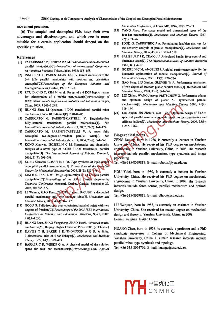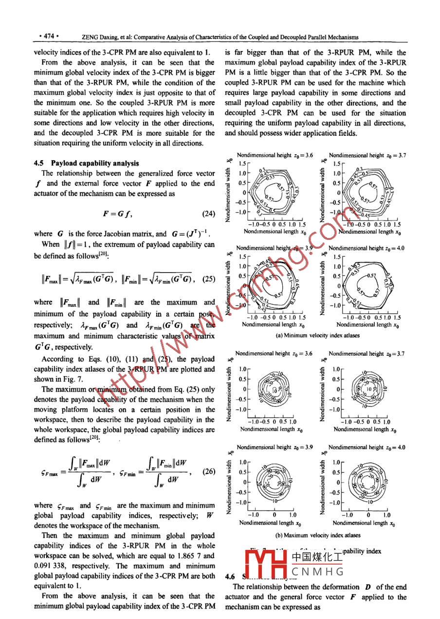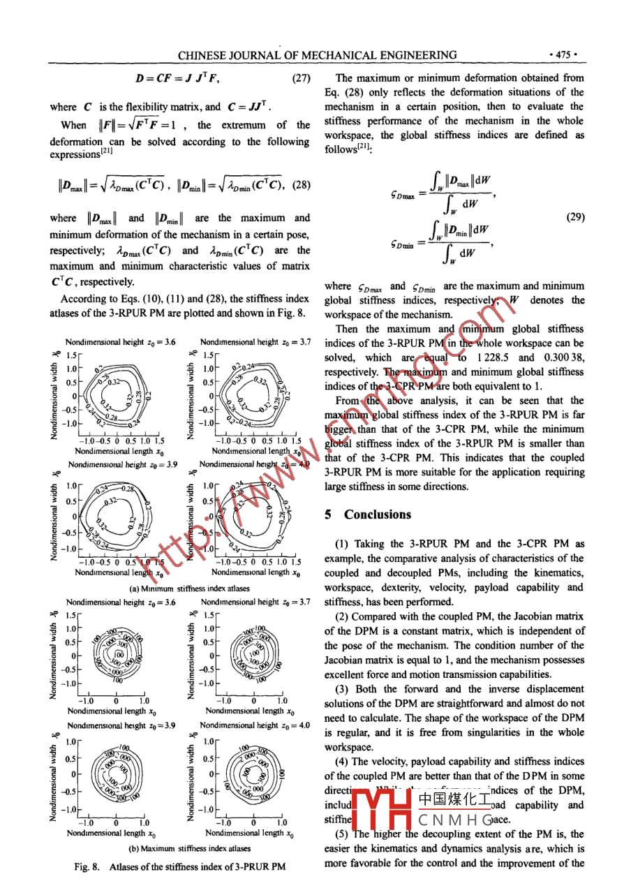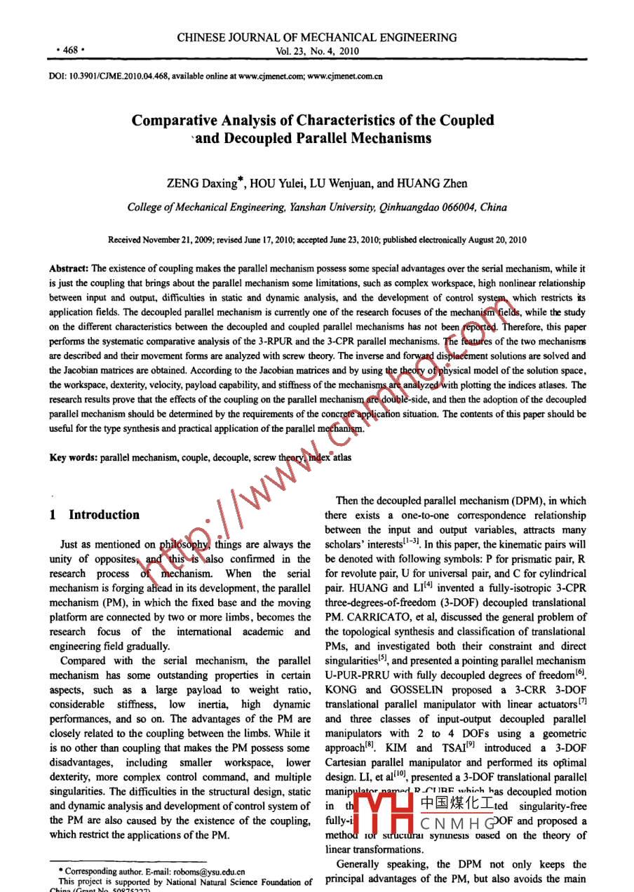 CHINESE JOURNAL OF MECHANICAL ENGINEERING●468●Vol. 23, No. 4, 2010DOI: 10.3901/CJME.2010.04 468, available online at www.cjmcnet.com; www.cjmenet.om.cnComparative Analysis of Characteristics of the Coupledand Decoupled Parallel MechanismsZENG Daxing *, HOU Yulei, LU Wenjuan, and HUANG ZhenCollege ofMechanical Engineering, Yanshan Universiy, Qinhuangdao 066004, ChinaReceived November 21, 2009; revised Jume 17, 2010; accepted June 23, 2010; publisbed lelroicallyy August 20, 2010Abstract: The existence of coupling makes the parallel mechanism possess some special advantages over the serial mechanism, while itis just the coupling that brings about the parallel mechanism some limitations, such as complex workspace, high nonlinear relationshipbetween input and output, difficulties in static and dynamic analysis, and the development of control system, which restricts isapplication fields. The decoupled parallel mechanism is currently one of the research focuses of the mechanism fields, while the studyon the different characteristics between the decoupled and coupled parallel mechanisms has not been reported. Therefore, this paperperforms the systematic comparative analysis of the 3-RPUR and the 3-CPR parallel mechanisms. The features of the two mechanismsare described and their movement formns are analyzed with screw tbeory, The inverse and forward displacement solutions are solved andthe Jacobian matrices are obtained. According to the Jacobian matrices and by using the theory of physical model of the solution space,the workspace, dexterity, velocity, payload capability, and siffness of the mechanisms are analyzed with pltting the indices atlases. Theresearch results prove that the effects of the coupling on the parallel mechanism are double-side, and then the adoption of the decoupledparallel mechanism should be determined by the requirements of the concrete application situation. The contents of this paper should beuseful for the type synthesis and practical application of the parallel mechanism.Key words: prallel mechanism, couple, decouple, screw theory, index atlasThen the decoupled parallel mechanism (DPM), in which1 Introductionthere exists a one-to-one correspondence relationshipbetween the input and output variables, attracts manyJust as mentioned on philosophy, things are always the scholars' interetsh-s. In this paper, the kinematic pairs willunity of opposites, and this is also confirmed in the be denoted with following symbols: P for prismatic pair, Rresearch process of mechanism. When the serial for revolute pair, U for universal pair, and C for cylindricalmechanism is forging ahead in its development, the parallel pair. HUANG and LI4 invented a fully-isotropic 3-CPRmechanism (PM), in which the fixed base and the moving three-degrees-of-freedom (3-DOF) decoupled translationalplatform are connected by two or more limbs, becomes the PM. CARRICATO, et al, discussed the general problem ofresearch focus of the intemational academic and the topological synthesis and classification of translationalengineering field gradually.PMs, and investigated both their constraint and directCompared with the serial mechanism, the parallel singularitiesls, and presented a pointing parallel mechanismmechanism has some outstanding properties in certain U-PUR PRRU with fully decoupled degrees of freedom0.aspects, such as a large payload to weight ratio, KONG and GOSSELIN proposed a 3-CRR 3-DOFconsiderable sifess,, low inertia, high dynamic translational parallel manipulator with linear actuators']performnances, and so on. The advantages of the PM are and three classes of input-output decoupled parallelclosely related to the coupling between the limbs. While it manipulators with 2 to 4 DOFs using a geometricis no other than coupling that makes the PM possess some approach8. KIM and TSAI9I introduced a 3-DOFdisadvantages, including smaller workspace, lower Cartesian parallel manipulator and performed its optimaldexterity, more complex control command, and multiple design. L, et alo], presented a 3-DOF translational parallelsingularities. The difficulties in the structural design, static manipuR rIIRF wurhirh 1decoupled motionand dynamic analysis and development of control systemof in t中國煤化工ted sigulritifreethe PM are also caused by the existence of the coupling, fully-ifYHCN M H GPOF and proposed awhich restrict the applications of the PM.methoa Ior suructural synunesis oased on the theory oflinear transformations.Generally speaking, the DPM not only keeps the電Corresponding author. E mail: roboms@ysu.cdu.cnThis pojet is uppore by Natinal Naturl Scince Foundation of principal advantages of the PM, but also avoids the mainChina (Grant No. 50875227)CHINESE JOURNAL OF MECHANICAL ENGINEERING●469.drawbacks of the general coupled PM. To reveal theThe coordinate system 0rxyz(i=1, 2, 3) is built with itsseparated characteristics of the coupled and decoupled PMs,origin located on the center of the R pair of the ith limbtaking the 3-RPUR PM and the 3-CPR PM as example connected with the fixed base, in which y axis is consistentrespectively, this paper focuses on their comparative with the axis of this R pait, and Z axis is perpendicular toanalysis.the fixed base plane. Selecting the limb ABiC1 as example,The organization of this paper is as follows: Following we can obtain the screw system of the limb in 01-xVZI asthe introduction, the structure composition of the 3~RPUR follows:PM and the 3-CPR PM are described and their modes ofmotion are analyzed in section 2. Displacement analysis,&=(01 0;00 0),including the forward and inverse displacement solution, is$|2=(000;a 0 b),performed in section 3. Section 4 concerns performance$z=(010;c0d),.(1)analysis, including workspace, dexterity, velocity, payload. S4=(t0l;e f g),capability and siffness etc. The paper is concluded in$s=(t0l;hpq),section 5, summarizing the present work.2 Mechanism Features Analysiswhere a, b,c,d, t,l, e,f, g, h, p and q are all f