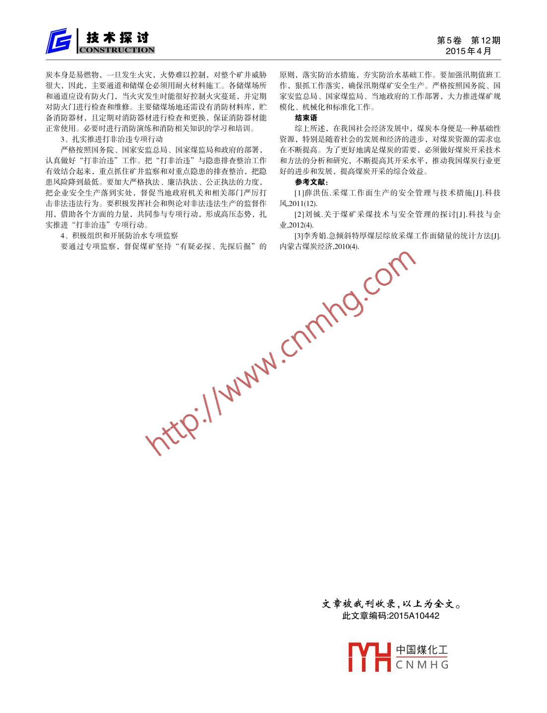 第5卷第12期技術(shù)探討2015年4月CONSTRUCTION煤礦采煤技術(shù)與安全管理郭臣山西蘭花科技創(chuàng)業(yè)有限公司唐安煤礦分公司山西晉城 048000摘要:隨著經(jīng)濟(jì)發(fā)展和社會(huì)不斷進(jìn)步,新型能源被不斷開發(fā)、開采,然而在中國(guó)的能源供應(yīng)中,煤炭依舊扮演著很重要的角色。中國(guó)煤炭產(chǎn)量占全世界煤炭總產(chǎn)量的37%左右,但事故死亡人數(shù)卻占全世界煤礦死亡總?cè)藬?shù)的70%左右。因此,要重視煤炭在開采過程中的安全和技術(shù)管理關(guān)鍵詞:煤礦;采煤技術(shù);安全管理中圖分類號(hào): X752文獻(xiàn)標(biāo)識(shí)碼: A一、煤礦開采的主要方法對(duì)于- -個(gè)企業(yè)而言,紀(jì)律是安全生產(chǎn)的重要保障。但往往在實(shí)1、滑移支架放頂煤開采法際的煤礦企業(yè)中,- -些領(lǐng)導(dǎo)卻忽視對(duì)紀(jì)律管理,從而導(dǎo)致安全生產(chǎn)頂梁以及支柱二者構(gòu)成了滑移頂梁,應(yīng)該將彈簧鋼或者導(dǎo)向上 沒有明確的規(guī)章制度,- 片混亂,有的甚至嚴(yán)重影響了企業(yè)的正槽運(yùn)用進(jìn)去,連接后梁和前梁,并在后梁的尾部位置進(jìn)行尾梁的設(shè)常 生產(chǎn)經(jīng)營(yíng)秩序。其導(dǎo)致的不安全因素有很多,例如,員工在上下置?;浦Ъ芙Y(jié)構(gòu)本身比較的簡(jiǎn)單,制造的時(shí)候成本比較的低,并班以及輪休的過 程中不能按照單位的制度執(zhí)行,隨意性很大,將安且安全性比較的高,能夠在很多環(huán)境中使用。特別是中小型煤礦在全生產(chǎn)紀(jì)律流 于形式,不能發(fā)揮作用,這在很大程度上不僅僅影響進(jìn)行煤炭開采的時(shí)候,這種方法運(yùn)用的更加普遍。一般情況下, 可了 企業(yè)的發(fā)展,而且很容易因?yàn)檫@種散漫的工作態(tài)度而導(dǎo)致安全事以用滑移支架放頂煤開采的辦法來開采煤礦,煤層厚度應(yīng)該在5厘故的發(fā)生, 所以,必須建立嚴(yán)格的考察管理制度,將紀(jì)律責(zé)任落實(shí)米左右,工作面的長(zhǎng)度范圍應(yīng)該是60~ 80米,最長(zhǎng)可以超過區(qū)105到每- -位員 工的心里,制定嚴(yán)格的監(jiān)督管理機(jī)制,發(fā)現(xiàn)問題及時(shí)解米,滑移支架的高度-般應(yīng)該在5 ~ 10米之間。這種方法的缺點(diǎn)在決處理, 絕不能輕縱。于,工作面支架的撐力和工作阻力比較低,其穩(wěn)定性沒有保證。3、員工素質(zhì)普遍偏低。2、二型鋼梁放頂煤開采法大多數(shù)煤礦生產(chǎn)企業(yè),員工素質(zhì)相對(duì)都較低,一般情況下都是在進(jìn)行煤礦開采的時(shí)候?qū) -型鋼梁放頂煤開采法運(yùn)用進(jìn)去,能由底層的工作人 員提拔到管理層的,對(duì)于管理的相關(guān)知識(shí)并不熟悉夠保證采樣和放煤分別進(jìn)行,使用這種方法進(jìn)行煤炭開采的時(shí)候了解,但憑借經(jīng)驗(yàn)進(jìn)行管理,所以說管理水平差,很難在企業(yè)中發(fā)應(yīng)該使用單體液壓支柱以及將二型鋼梁運(yùn)用進(jìn)去,來做好煤棚的支揮應(yīng)有的效用, 這樣就為安全生產(chǎn)留下了極大的隱患。對(duì)于煤礦企護(hù)工作,最高空定距離應(yīng)該在3.4米以下,最低控項(xiàng)距離應(yīng)該在2.4業(yè) 發(fā)展而言,必須提高其員工整體水平以及管理能力的培養(yǎng),讓安米以上。若是使用放炮的方式進(jìn)行落煤,那么必須進(jìn)行雙排眼的設(shè)全意 識(shí)貫穿于整個(gè)行業(yè)的發(fā)展過程中,促進(jìn)行業(yè)的發(fā)展。置。在放炮結(jié)束之后,應(yīng)該及時(shí)地移動(dòng)主梁,將主梁的支護(hù)作用發(fā)4、安全教育培訓(xùn)缺乏。揮出來。這種辦法在那些煤層賦存條件變化比較大的小型煤礦以及一些煤礦生產(chǎn) 企業(yè)為了獲得更多的經(jīng)濟(jì)利潤(rùn),不僅僅忽視員工中型煤礦中運(yùn)用得比較廣泛。整體素質(zhì)的提高,還不斷地進(jìn)行裁員,縮短辦公人員的人數(shù),減少3、偽傾斜柔性掩護(hù)支架采煤法開支,從而使其大多數(shù)的煤礦工人要身兼數(shù)職,很多教育培訓(xùn)的開在煤礦開采的時(shí)候,若是將這種辦法運(yùn)用進(jìn)去,可以利用掩護(hù)展也只是單 獨(dú)停留在形式上,沒有一個(gè)很好的貫徹落實(shí)。不斷的延支架隔離采空區(qū)以及采煤空間,這樣能夠簡(jiǎn)化頂板管理工作,給煤長(zhǎng) 工作時(shí)間,降低工作效率,在企業(yè)發(fā)展中,建立完善的培訓(xùn)機(jī)制礦開采更好地進(jìn)行提供更加安全的條件,- -般情況下,這種辦法在是極其重要的, 缺乏有效的進(jìn)步空間,這將大大降低員工的責(zé)任心厚度為2 ~ 6米的煤層中比較適用,并且還要求煤層厚度變化不大,以及 安全意識(shí),影響企業(yè)長(zhǎng)久發(fā)展。并且埋深穩(wěn)定,其工作面比較長(zhǎng),但是在煤層傾斜的情況下,掘進(jìn)三、保障礦井安全生產(chǎn)的措施建議效率比較低下。1、煤炭企業(yè)要對(duì)下井作業(yè)人員進(jìn)行安全培訓(xùn)4、階段爆破落煤采煤法對(duì)安全培訓(xùn)和教學(xué)不僅要重視機(jī)械設(shè)備使用方法的培訓(xùn),更這種辦法在傾斜角在40°以上,厚度在3.5~ 7.5米的范圍內(nèi)比要 制定具體培訓(xùn)計(jì)劃和目標(biāo),確保安全培訓(xùn)的意義和目的。對(duì)新員較適用,并且其安全性比較好,回采工藝也比較簡(jiǎn)單,并且