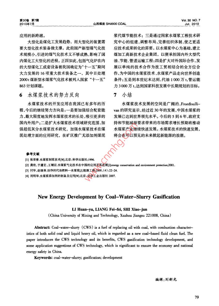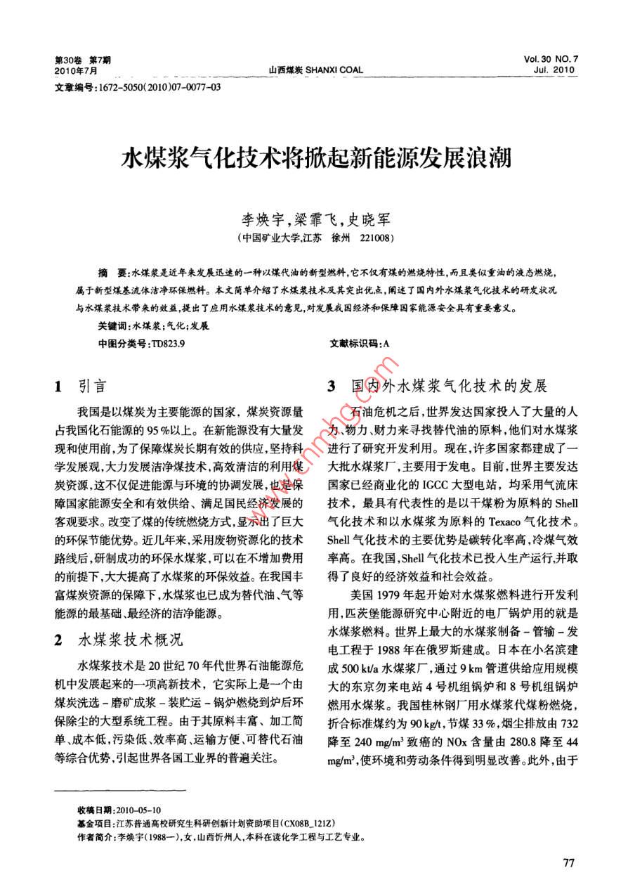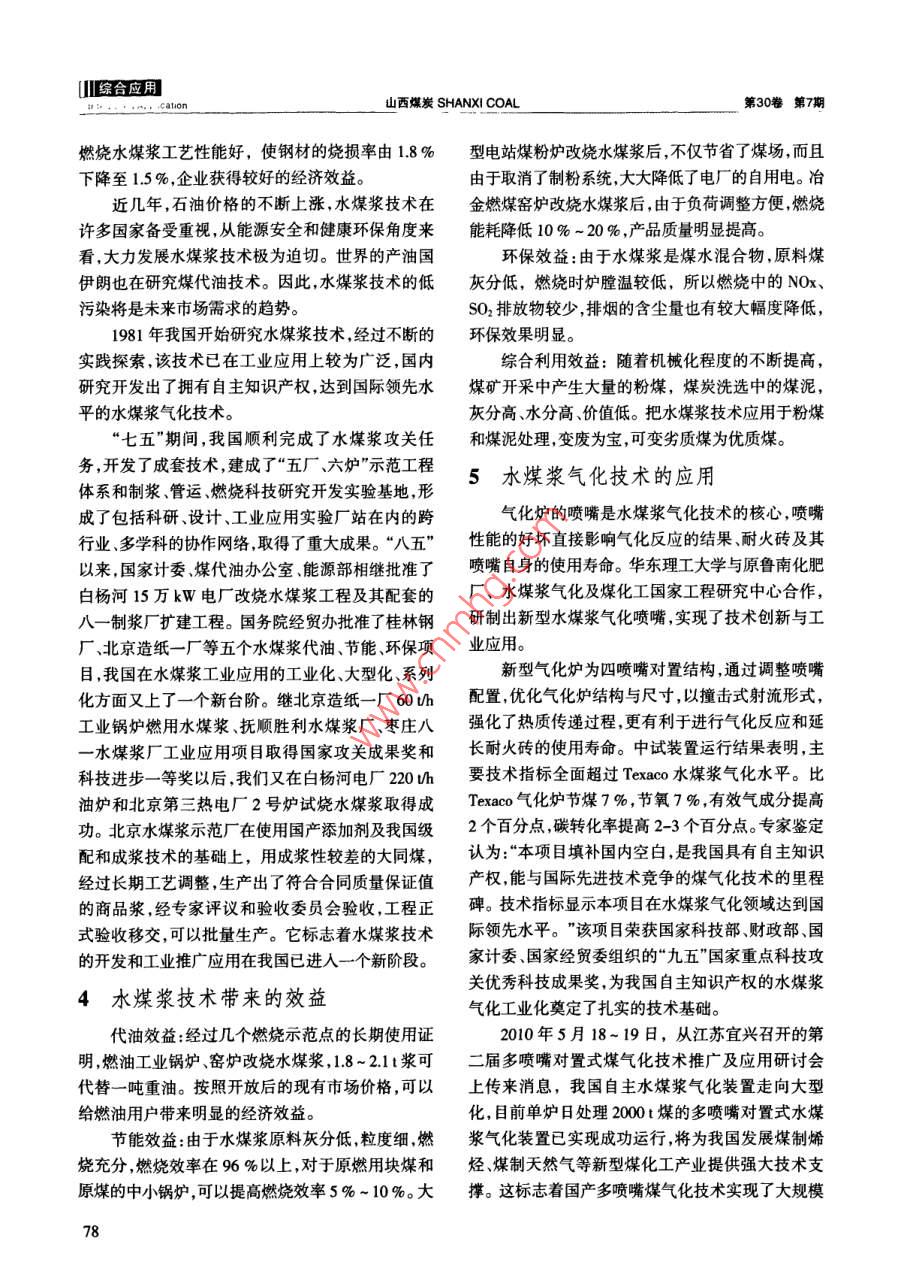 30卷第7期Vol 30 NO. 72010年7月山西煤炭 SHANXI COALJu.2010文章編號:1672-5050(2010)07-0077-03水煤漿氣化技術(shù)將掀起新能源發(fā)展浪潮李煥宇,梁霏飛,史曉軍(中國礦業(yè)大學(xué)江蘇徐州221008)摘要:水煤漿是近年來發(fā)展迅速的一種以煤代油的新型燃料,它不僅有煤的燃燒特性,而且類似重油的液態(tài)燃燒屬于新型煤基流體潔凈環(huán)保燃料。本文簡單介紹了水煤漿技術(shù)及其突岀優(yōu)點(diǎn),闡迷了國內(nèi)外水煤漿氣化技術(shù)的研發(fā)狀況與水煤漿技術(shù)帶來的效益,提出了應(yīng)用水煤漿技術(shù)的意見,對發(fā)展我國經(jīng)濟(jì)和保障國家能源安全具有重要意義關(guān)鍵詞:水煤漿;氣化;發(fā)展中圖分類號:TD8239文獻(xiàn)標(biāo)識碼:A1引言3國內(nèi)外水煤漿氣化技術(shù)的發(fā)展我國是以煤炭為主要能源的國家,煤炭資源量石油危機(jī)之后,世界發(fā)達(dá)國家投人了大量的人占我國化石能源95%以上。在新能源沒有大量發(fā)力物力、財(cái)力來尋找替代油的原料,他們對水煤漿現(xiàn)和使用前,為了保障煤炭長期有效的供應(yīng),堅(jiān)持科進(jìn)行了研究開發(fā)利用?,F(xiàn)在,許多國家都建成了學(xué)發(fā)展觀,大力發(fā)展?jié)崈裘杭夹g(shù),高效清潔的利用煤大批水煤漿廠,主要用于發(fā)電。目前,世界主要發(fā)達(dá)炭資源這不僅促進(jìn)能源與環(huán)境的協(xié)調(diào)發(fā)展,也是保國家已經(jīng)商業(yè)化的IGCC大型電站,均采用氣流床障國家能源安全和有效供給、滿足國民經(jīng)濟(jì)發(fā)展的技術(shù),最具有代表性的是以干煤粉為原料的 Shell客觀要求。改變了煤的傳統(tǒng)燃燒方式,顯示出了巨大氣化技術(shù)和以水煤漿為原料的 Texaco氣化技術(shù)。的環(huán)保節(jié)能優(yōu)勢。近幾年來,采用廢物資源化的技術(shù)She'氣化技術(shù)的主要優(yōu)勢是碳轉(zhuǎn)化率高,冷煤氣效路線后,研制成功的環(huán)保水煤漿,可以在不增加費(fèi)用率高。在我國,Shel氣化技術(shù)已投入生產(chǎn)運(yùn)行并取的前提下,大大提高了水煤漿的環(huán)保效益。在我國豐得了良好的經(jīng)濟(jì)效益和社會效益。富煤炭資源的保障下,水煤漿也已成為替代油、氣等美國1979年起開始對水煤漿燃料進(jìn)行開發(fā)利能源的最基礎(chǔ)、最經(jīng)濟(jì)的潔凈能源。用,匹茨堡能源研究中心附近的電廠鍋爐用的就是水煤漿技術(shù)概況水煤漿燃料。世界上最大的水煤漿制備一管輸一發(fā)電工程于1988年在俄羅斯建成。日本在小名濱建水煤漿技術(shù)是20世紀(jì)η0年代世界石油能源危成500k如a水煤漿廠,通過9km管道供給應(yīng)用規(guī)模機(jī)中發(fā)展起來的一項(xiàng)高新技術(shù),它實(shí)際上是一個由大的東京勿來電站4號機(jī)組鍋爐和8號機(jī)組鍋爐煤炭洗選-磨礦成漿-裝貯運(yùn)鍋爐燃燒到爐后環(huán)燃用水煤漿。我國桂林鋼廠用水煤漿代煤粉燃燒,保除塵的大型系統(tǒng)工程。由于其原料豐富、加工簡折合標(biāo)準(zhǔn)煤約為90kgt,節(jié)煤3%,煙塵排放由732單、成本低,污染低、效率高、運(yùn)輸方便、可替代石油降至240mg/m致癌的NOx含量由2808降至44等綜合優(yōu)勢,引起世界各國工業(yè)界的普遍關(guān)注。mg/m3,使環(huán)境和勞動條件得到明顯改善。此外,由于收稿日期:2010-05-10基金項(xiàng)目:江蘇普通高校研究生科研創(chuàng)新計(jì)劃資助項(xiàng)目(CX08B121Z)作者簡介:李煥字(1988—),女,山西忻州人,本科在讀化學(xué)工程與工藝專業(yè)。Ⅲ綜合應(yīng)用.caton山西煤炭 SHANXI COAL第30卷第7期燃燒水煤漿工藝性能好,使鋼材的燒損率由1.8%型電站煤粉爐改燒水煤漿后,不僅節(jié)省了煤場,而且下降至15%,企業(yè)獲得較好的經(jīng)濟(jì)效益。由于取消了制粉系統(tǒng),大大降低了電廠的自用電。冶近幾年,石油價(jià)格的不斷上漲,水煤漿技術(shù)在金燃煤窯爐改燒水煤漿后,由于負(fù)荷調(diào)整方便燃燒許多國家備受重視,從能源安全和健康環(huán)保角度來能耗降低10%~20%,產(chǎn)品質(zhì)量明顯提高???大力發(fā)展水煤漿技術(shù)極為迫切。世界的產(chǎn)油國環(huán)保效益:由于水煤漿是煤水混合物,原料煤伊朗也在研究煤代油技術(shù)。因此,水煤漿技術(shù)的低灰分低,燃燒時(shí)爐膛溫較低,所以燃燒中的NOx污染將是未來市場需求的趨勢。SO2排放物較少,排煙的含塵量也有較大幅度降低,1981年我國開始研究水煤漿技術(shù),經(jīng)過不斷的環(huán)保效果明顯。實(shí)踐探索,該技術(shù)已在工業(yè)應(yīng)用上較為廣泛,國內(nèi)綜合利用效益:隨著機(jī)械化程度的不斷提高,研究開發(fā)出了擁有自主知識產(chǎn)權(quán),達(dá)到國際領(lǐng)先水煤礦開釆中產(chǎn)生大量的粉煤,煤炭洗選中的煤泥,平的水煤漿氣化技術(shù)?;曳指摺⑺指?、價(jià)值低。把水煤漿技術(shù)應(yīng)用于粉煤“七五”期間,我國順利完成了水煤漿攻關(guān)任和煤泥處理變廢為寶,可變劣質(zhì)煤為優(yōu)質(zhì)煤。務(wù),開發(fā)了成套技術(shù),建成了“五廠六爐”示范工程5水煤漿氣化技術(shù)的應(yīng)用成了包括科研、設(shè)計(jì)、工業(yè)應(yīng)用實(shí)驗(yàn)廠站在內(nèi)的跨氣化爐的噴嘴是水煤漿氣化技術(shù)的核心,噴嘴行業(yè)、多學(xué)科的協(xié)作網(wǎng)絡(luò)