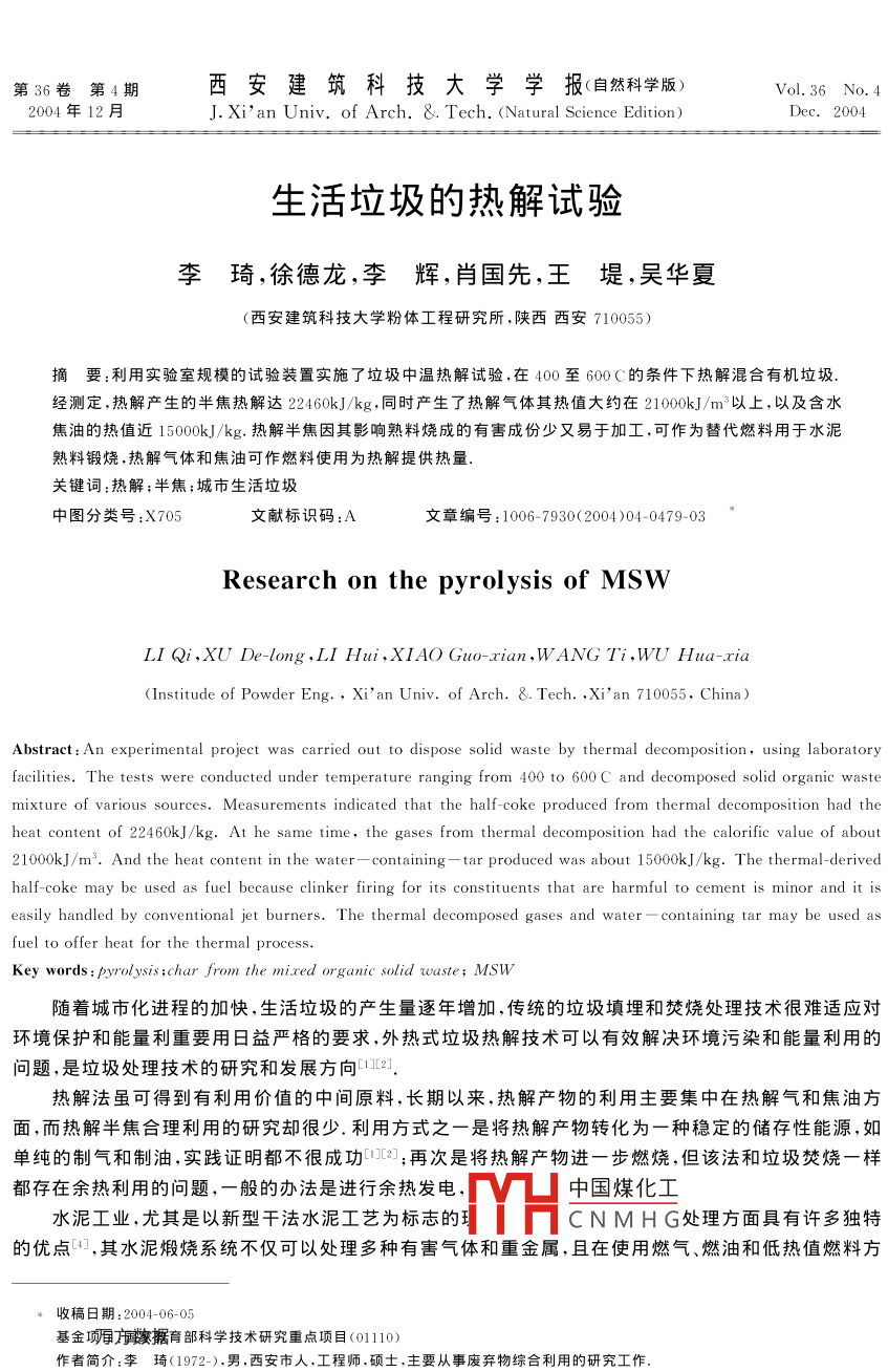第36卷第4期西安建筑科技大學學報(自然科學版)Vol 36 No 42004年12月J. Xi'an Univ. of Arch. & Tech (Natural Science Edition)Dec.2004生活垃圾的熱解試驗李琦,徐德龍,李輝,肖國先,王堤,吳華夏(西安建筑科技大學粉體工程研究所,陜西西安710055)摘要:利用實驗室規(guī)模的試驗裝置實施了垃圾中溫熱解試驗,在400至600℃的條件下熱解混合有機垃圾.經(jīng)測定,熱解產(chǎn)生的半焦熱解達22460kJ/kg,同時產(chǎn)生了熱解氣體其熱值大約在21000kJ/m3以上,以及含水焦油的熱值近1500kJ/kg.熱解半焦因其影響熟料燒成的有害成份少又易于加工,可作為替代燃料用于水泥熟料鍛燒,熱解氣體和焦油可作燃料使用為熱解提供熱量.關(guān)鍵詞:熱解;半焦;城市生活垃圾中圖分類號:X705文獻標識碼:A文章編號:1006-7930(2004)04-0479-03Research on the pyrolysis of MswlI Qi, XU De-long,LI Hui, XIAO Guo-rian, WANG Ti, wU Hua-ria(Institude of Powder Eng, Xi'an Univ. of Arch. & Tech. Xi'an 710055, China)Abstract: Animentalrried out to dispose solid waste by thermal decefacilities. The tests were conducted under temperature ranging from 400 to 600C and decomposed solid organic wastemixture of various sources. Measurements indicated that the half-coke produced from thermal decomposition had theheat content of 22460kJ/kg. At he same time, the gases from thermal decomposition had the calorific value of about21000kJ/m. And the heat content in the water-containing -tar produced was about 15000k J/kg. The thermal-derivedhalf-coke may be used as fuel because clinker firing for its constituents that are harmful to cement is minor and iteasily handled by conventional jet burners. The thermal decomposed gases and water-containing tar may be used asfuel to offer heat for the thermal processKey words pyrolysis; char from the mixed organic solid waste: MSu隨著城市化進程的加快,生活垃圾旳產(chǎn)生量逐年增加,傳統(tǒng)旳垃圾墳埋和焚燒處理技術(shù)很難適應(yīng)對環(huán)境保護和能量利重要用日益嚴格的要求,外熱式垃圾熱解技術(shù)可以有效解決環(huán)境污染和能量利用的問題,是垃圾處理技術(shù)的研究和發(fā)展方向112熱解法雖可得到有利用價值的中間原料,長期以來,熱解產(chǎn)物的利用主要集中在熱解氣和焦油方,而熱解半焦合理利用的研究卻很少.利用方式之一是將熱解產(chǎn)物轉(zhuǎn)化為一種穩(wěn)定的儲存性能源,如單純的制氣和制油,實踐證明都不很成功;再次是將熱解產(chǎn)物進一步燃燒,但該法和垃圾焚燒一樣都存在余熱利用的問題,一般的辦法是進行余熱發(fā)電中國煤化工水泥工業(yè)尤其是以新型干法水泥工藝為標志的理CNMHG處理方面具有許多獨特的優(yōu)點,其水泥煅燒系統(tǒng)不僅可以處理多種有害氣體和重金屬,且在使用燃氣、燃油和低熱值燃料方基金項獎?chuàng)靠茖W技術(shù)研究重點項目(01110作者簡介:李琦(1972-),男,西安市人,工程師,碩土,主要從事廢棄物綜合利用的研究工作480西安建筑科技大學學報(自然科學版)第36卷面有著成熟的經(jīng)驗.因此,將垃圾熱解,利用其熱解產(chǎn)物,尤其是利用熱解半焦作為水泥工業(yè)燃煤的替代燃料具有廣闊的應(yīng)用前景.為此進行了垃圾熱解試驗1混合垃圾試樣的?;捎谠煞輳?fù)雜,且隨季節(jié)和氣候的改變而波動很大,為了使研究結(jié)果更具有普遍性和代表性,并考慮我國的實際情況和熱解必要的預(yù)處理方式,參考上海市1998年燃氣地區(qū)生活垃圾組成(見表1)2,以除去垃圾中的無機物成份、廚余和果皮的混合垃圾作為?;?模化垃圾成份見表2,垃圾的原始物理組份的工業(yè)分析和熱值見表3表1上海市1998年生活垃圾成份表Tab 1 Constituents in MSw of Shanghai in 1998含量廚余皮紙類布類塑膠竹木金玻璃渣石合計53.2314.108.7713.480.732熱解試驗裝置及方案表2?;罾煞荼鞹ab 2 Mode Constituents of MSw本次試驗的熱解反應(yīng)器為立式固定床熱含量紙類布類塑料橡膠木材合計解爐,其加熱方式采用外熱式中溫熱解.熱解35.317.7試驗系統(tǒng)主要由以下幾個部分構(gòu)成:垃圾熱表3垃圾組份的工業(yè)分析和熱值表解裝置、氣體和焦油冷卻裝置、氣體水洗裝Tab 3 Analysis of Wastes constituents and calorific value置.熱解試驗系統(tǒng)見圖1.本試驗中垃圾由頂部加入,熱解氣體從垃圾組份應(yīng)用基重量/%熱值/kJ·k水份揮發(fā)份固定碳灰份頂部引出,熱解半焦由爐底排出.紙類熱解爐爐體內(nèi)徑170mm,高1400mm,布類1084.343.462.2017450其中加熱段750mm,采用上下三組電阻絲穿塑料0.2098.540.07l.192083.984.949.8323260繞在碳化硅耐火材料內(nèi),熱解溫度經(jīng)插入物木類20.00料中的熱電偶回饋后由溫控儀控制.熱解氣體的冷凝裝置為蛇形銅管式換熱熱解氣器,底部裝有S形焦油和蒸氣收集器,氣體冷卻采用循環(huán)冷卻水間接冷卻熱解’L體氣體瞬時流量的測定由流量計完成,累計流量通過一定間隔的瞬時流量累計計算得出.氣體采樣通過采氣袋獲得.3試驗結(jié)果3.1熱解產(chǎn)物不同溫度下混合垃圾的熱解產(chǎn)物見表ˉ4.從上表可以看出,隨著熱解溫度的提高,?;蛦谓M份基本遵循同樣的規(guī)律,即熱1.溫控儀2.熱電偶3.加熱電阻爐4.冷卻水箱5.冷凝管6.焦油和水排除7.洗氣水箱8.流量計解氣體產(chǎn)量上升,焦油和半焦產(chǎn)量下降中國煤化工置示意圖3.2熱解氣體CN MHGcompoSItion tests不同熱解溫度時?;臒峤饫塾嫯a(chǎn)氣量和產(chǎn)見圖2和國3熱解氣體的成份分析見表5.由表5可以看岀:?;措S著溫度升高,熱解