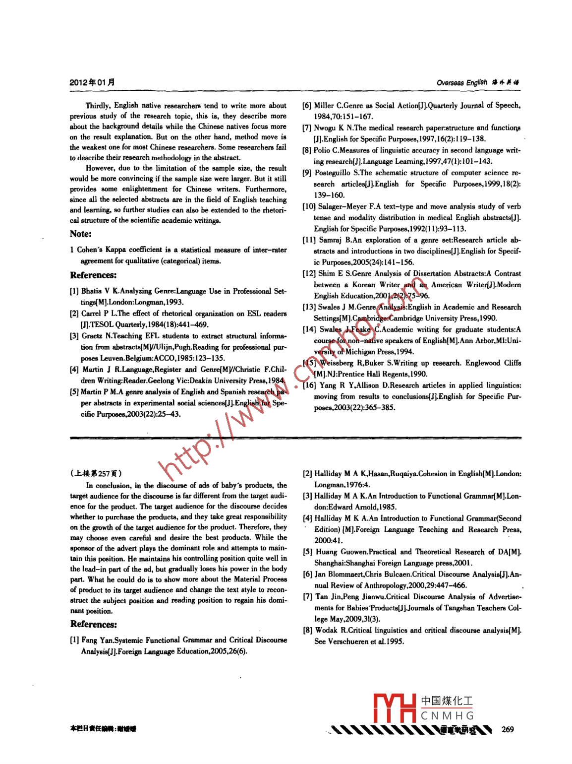 hwsy@overseaen.comIssN 1009- -5039htp://ww. overseaen.comOverseas English 海外英請Tel:+86- -551-5690811 5690812Critical Discourse Analysis of Copywriting in Ads of Infant Products張妮(西安翻譯學院基礎課部,陜西西安710105)Abstract: In this paper, the author mainly applies Fairclough's CDA and Hliday's SFG to analyze the ads of infant products. The authorexplains the concept of CDA and SFG, and then interprets how these concepts are employed in the ads of infant products to better sell thegoods or offer the services.Key words: ads of infant product; discourse analysis; systemic functional grammar中圖分類號:H314文獻標識碼:A 文章編號:1009 -5039(2012)01- -0256- -02The advertisement is an indispensable part in the society.Transitivity includes six processes (Halliday 1985): Material pro-Copywriting conceives rich functional meanings in terns of SFGcess; Mental proce8s; Relational process; Behavioral process; Ver-and purpose of copywriting is to persuade and lead the target audi-bal process; Existential process.ence to buy their products or to accept their services. Commonly,1.1.2 Interpersonal metafunctionthe target audiences of producls and ads readers are the sameThe interpersonal function embodies all uses of language to ex-group, e.g. the cosmetics for women, razors for men. Compared withpress social and personal relations. As Fang (2005) mentioned inthese ads, ads for babies" products have the characteristics of non-her article Systemic Functional Grammar and Critical Discourseidentity of target audience. The guardian (the target audience for Analysis, interpersonal metafunction consists of five main factors:the discourse) assumes more responsibility for the baby (the targetmood, modality, modulation, appraisal system and key.audience for the product) when deciding on the purchase of theHu Zhuanglin (2001) believed, "mood shows what role speakerproduct, which makes him or her more cautious. For most of the cas-selects in the speech situation and what role he assigns to the ad-es, the sponsor of the ads must take the position of the power in or-der to persuade the ads audience to become the consumer of hisIndlcatve{ dedantre (speaker s infomant, boare s tbe informe)product. In the framework of SFG(systemic -functional grammar){ Irrouare (paker as sxatr oinf, btr器spplie ofnio,)and CDA(eritical discourse analysis), it intents to analyze how theMoodsponsor of the ads construct the relationship of the three parties andlmperntve (peaker s the corolla, heur 8 he oldn hndutvteobtain power by language, by means of which his intention of com-munication has been reached.1.1.3 Textual metafunction (not involved in this paper)1 Theoretical Framework1.2 General theory of CDAThis part introduces the theories to be used in the study, in-Critical discourse analysis (CDA) emerged in the late 1980s ascluding SFG; CDA and the relationship in between; and an impor-a programmatic development in European discourse studies spear-tant definition of "copywriting in ads".headed by Norman F airclough. Since then, it has become one of the1.1 Halliday and SFGmost infuential branches of discourse analysis. The purpose ofCDA is totional Grammar holds that "The aim (of SFC) has been to constructships of dominance, discrimination, power and control as manifest-a grammar for purposes of text analysis: one that would make it pos-ed in language." (Wodak 1995) CDA concems itself with relationssible to say sensible and useful things about any lext, spoken orof power and inequality in language.witten, in modem English." SFC has two components: systemic1.3 The relationship between SFG and CDAgrammar and functional grammar. Halliday divided the function ofSFG constructs a grammar for purposes of text analysis, and itanguage into three kinds: ideational metafunction,is more suitable for discourse analysis than any other theories. SFGmetafunction, and textual metafunction.is the approach proposed in the study of discourse analysis. CDA1.1.1 Ideational metafunctiontrends to incorporate social- theoretical insights into discourse anal-The ideational metafunction is to organize the speaker or writ-ysis and advocates social commitment and interventioniser's experience of the real or imaginary world and includes experi-search. CDA was established based on Halliday's SFG. Ideationalential function and logical function.Experiential function is chielly embodied by transitivity. Tran-metafunction and inlerpersonal metafunction provide an efectivesitivity is a semantic system to divide something around people intoway to make explicit the relationship of the three parties.several proccsscs involving participant and circumstantial element.1.4 Copywring中國煤化工收稿日期:2011-10-18修回 日期:2011-11-20.作者簡介:張妮,女,陜西西安人,講師,現(xiàn)為西安翻譯學院基礎課部專職英語教師,主要研究.JYHCNMH G .256纏V11!/s1128.栳睹任偏辨:崩媛嬡2012年01月Overseas English沾外其謅The copywriting mainly consists of two parts: lead-in part andpossible food for your baby. Holding your baby close is 80 importantbody paras they just left outside the room. He will not be long before theyThe lead- -in part helpe establish an image, identity, or positionwill be sleeping much more sociable hours... Johnson's Baby)for a brand or an organization and can make people keep on readingIn this ad, words of high value like "always, most often, theand be fully informned.possible, much more" are employed to ensure that the valid in-Body part tells a more complete story about the product or ser-formation and appropriateided for mothers.w ords of low value like "may, will, just" show the uncertainty of thevice.2 Analysis of the Copywriting in Ads of Infant Productsknowingness of different situations encountered in the first nighthome. The commercial adopts the imperative mood and speaks in aThe listed copywriting in infant product all come from the rele-supervisor's position. The verbs 