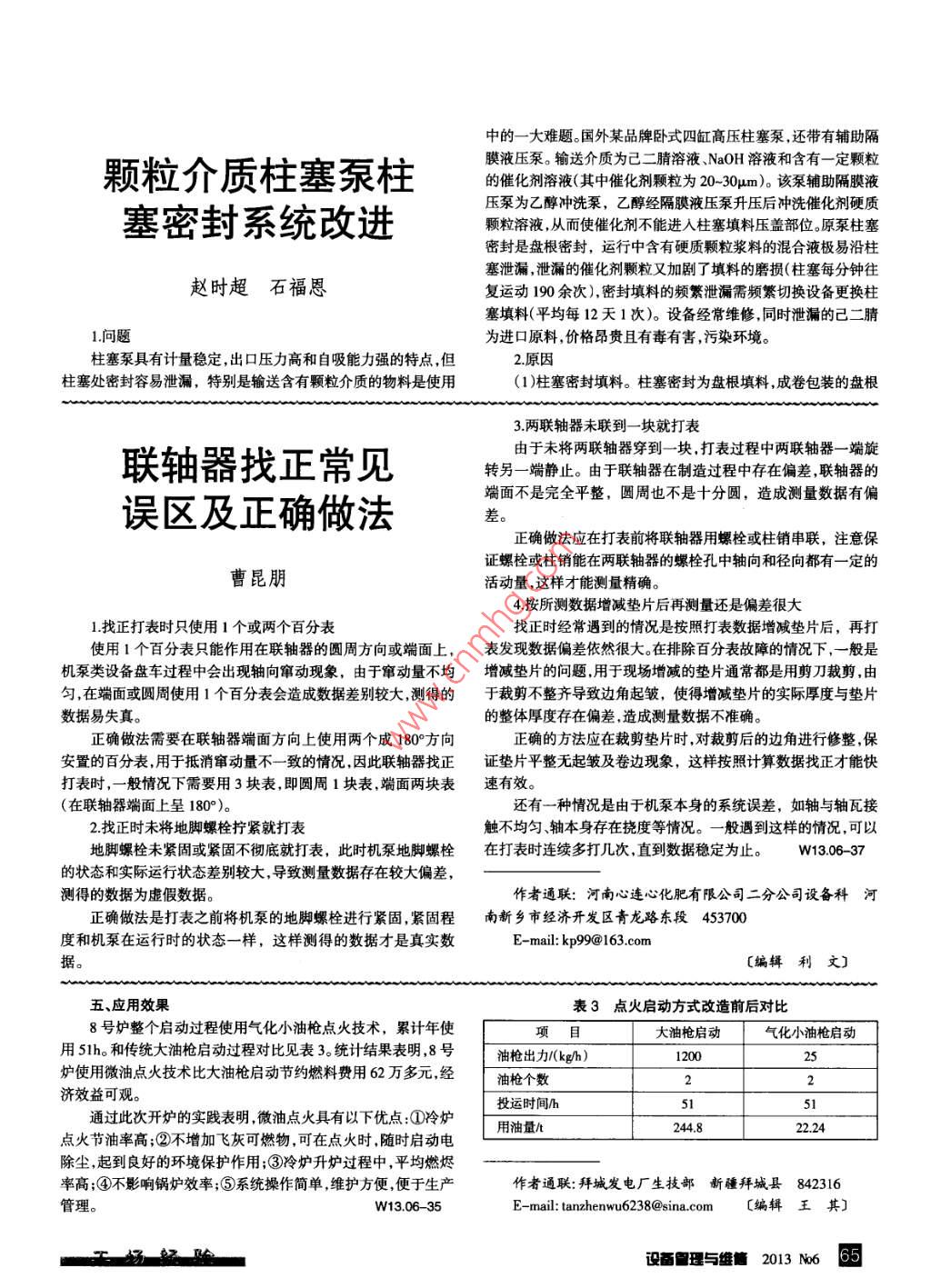 氣化油點(diǎn)火技術(shù)在火電廠的應(yīng)用與節(jié)能效果譚振武摘要介紹發(fā)電廠鍋爐采用氣化小油槍冷爐點(diǎn)火技術(shù)及其節(jié)能效果。改造后可節(jié)約燃油80%以上。關(guān)鍵詞氣化油點(diǎn)火燃燒器節(jié)能中圖分類(lèi)號(hào)TH136 文獻(xiàn)標(biāo)識(shí)碼 B-概述直流燃燒器;鍋爐前部為爐膛,四周布滿水冷璧,水平煙道布置在煤粉鍋爐冷態(tài)啟動(dòng)時(shí),煤粉空氣混合物在冷的燃燒室中有高、低溫過(guò)熱器;后部垂直煙道布置的有雙級(jí)省煤器和雙級(jí)空很難穩(wěn)定點(diǎn)燃,因此在燃燒設(shè)備啟動(dòng)時(shí),在噴煤粉前總是先啟預(yù)器;制粉系統(tǒng)為中儲(chǔ)式鋼球磨煤機(jī),鍋爐制粉系統(tǒng)采用MG-動(dòng)點(diǎn)火油槍,噴燒易于保持火焰穩(wěn)定的燃料油,每小時(shí)的燃油250/320中速磨煤機(jī)正壓直吹式制粉系統(tǒng),每臺(tái)磨煤機(jī)帶8只噴量約為鍋爐額定燃燒熱量的30%,直至把鍋爐各處加熱至高燃器采用兩層布置。共配備有4支油槍,點(diǎn)火油槍和穩(wěn)燃油槍各溫后,才將燒油切換至燒煤粉。燃燒低揮發(fā)分煤種或劣質(zhì)煤的2支,每支出力分別為1500kg/h和800kg/ho燃油壓力2.94MPa.鍋爐,其煤粉氣流的著火性能和煤粉火焰在低負(fù)荷時(shí)的穩(wěn)定8號(hào)鍋爐主要參數(shù)見(jiàn)表1 ,煤質(zhì)特性見(jiàn)表2。性更差。我國(guó)煤炭資源雖然豐富,但分布極不均衡、且煤種多表1 8 號(hào)鍋爐主要參數(shù)變、煤質(zhì)較差,燃燒效果不好。低揮發(fā)分和劣質(zhì)煤種占我國(guó)電最大連續(xù)蒸發(fā)量/(h)130廠動(dòng)力用煤70%,為了提高這些可燃性較差的煤種的著火和額定汽包壓力/MPa4.22低負(fù)荷時(shí)燃燒穩(wěn)定性,常用的辦法就是投人助燃用油。僅僅為額定主蒸汽壓力MPa3.82了用于鍋爐啟動(dòng)和低負(fù)荷下助燃,我國(guó)每年要消耗大量的燃額定蒸汽溫度/C450料油。燃燒方式四角直流噴燃器、切圓燃燒火力發(fā)電廠煤粉鍋爐的啟動(dòng)和低負(fù)荷穩(wěn)燃要耗用大量的燃點(diǎn)火方式四角0號(hào)柴油點(diǎn)火油槍點(diǎn)火油,又由于電網(wǎng)調(diào)峰的要求,鍋爐經(jīng)常處于頻繁啟停和低負(fù)荷工不投油助燃時(shí)最低穩(wěn)燃負(fù)荷/MW況下運(yùn)行,因此以煤代油,節(jié)約廠煤粉鍋爐的啟動(dòng)和低負(fù)荷穩(wěn)燃空氣預(yù)熱器型式管式立式用油是一- 個(gè)亟待解決的問(wèn)題。發(fā)電廠8號(hào)鍋爐為四川鍋爐廠生產(chǎn)的CG-130/3.82-M6型二、氣化油點(diǎn)火技術(shù)原理的單汽包自然循環(huán)爐型呈I型布置,采用煤粉懸浮燃燒.固態(tài)1.氣化小油槍燃燒器燃燒原理排渣的中溫中壓蒸汽鍋爐,燃燒設(shè)備采用四角布置切圓燃燒的利用壓縮空氣采用氣泡霧化方式將燃料柴油霧化成超細(xì)油表1 PLC程序代碼DBD4大于等于DB1.DBD12的上升沿,只要具備系統(tǒng)啟動(dòng)條代碼含義件,4臺(tái)循環(huán)泵即按照過(guò)程1和過(guò)程2交替的控制方式運(yùn)行,防Q8.01級(jí)熱交換1"泵止單臺(tái)水泵啟動(dòng)頻繁引發(fā)電機(jī)繞組過(guò)熱,損壞設(shè)備,總體上使系統(tǒng)水泵各自運(yùn)行時(shí)間盡量相等。Q8.11級(jí)熱交換2"泵Q8.22級(jí)熱交換1"泵3.應(yīng)用效果(1)余熱利用徹底、回收率高。項(xiàng)目完成后,洗浴熱水箱的溫Q8.32級(jí)熱交換2"泵度可加熱到65C,鍋爐年消耗天然氣量約下降3.5%,年節(jié)約天14.52級(jí)熱交換1'泵接觸器常開(kāi)反饋觸點(diǎn)然氣費(fèi)用64萬(wàn)余元。I5.02級(jí)熱交換2"泵接觸器常開(kāi)反饋觸點(diǎn)(2)真空回潮設(shè)備抽真空蒸汽余熱被蒸汽余熱回收利用裝M10.5洗澡熱水箱的水位允許中間位置充分冷凝吸收,壓力迅速降至常壓,高速蒸汽流排空產(chǎn)生的噪14.2、I4.4.I4.6.I5.1 .4臺(tái)水泵的熱繼電器常開(kāi)反饋觸點(diǎn)聲也由改進(jìn)前的115dB降至60dB(均含背景噪聲)以下,有效消DB1.DBX40.0系統(tǒng)自動(dòng)運(yùn)行允許位除了真空回潮設(shè)備對(duì)周邊的噪聲污染。W13.06- -34DB1.DBD0洗澡熱水箱給水溫度DB1.DBD4抽真空蒸汽管道蒸汽溫度作者通聯(lián):河南中煙工業(yè)有限責(zé)任公司漯河卷煙廠動(dòng)力車(chē)DB1.DBD12抽真空蒸汽管道蒸汽溫度設(shè)定上限間河南漯河市人民東路518號(hào)462000DB1.DBD36職工洗浴溫度下限E-mail: lhlyj@126.com[編輯凌瑞]林能與環(huán)鍋設(shè)備管理與維修2013 No663表2 8號(hào)鍋爐煤質(zhì)特性粉穩(wěn)定著火將改善整個(gè)爐膛的著火穩(wěn)定狀態(tài);③點(diǎn)燃小油槍后項(xiàng)目設(shè)計(jì)值校核煤種即可投煤粉,通過(guò)調(diào)節(jié)給粉機(jī)轉(zhuǎn)數(shù)來(lái)滿足鍋爐升溫升壓需求;④收到基碳Car/%o59.2846.46可大量節(jié)約點(diǎn)火及助燃用油。經(jīng)過(guò)詳細(xì)的設(shè)計(jì)計(jì)算,將下層1.3號(hào)兩只煤粉噴燃器改造為25kg/h氣化小油槍點(diǎn)火及穩(wěn)燃燃燒收到基氫Har/%2.2582.78器。改造不改變?cè)?次風(fēng)管走向、假想切圓直徑及支架承點(diǎn)及二收到基氧Oar%3.5963.40次風(fēng)箱;不改變?cè)聦用悍廴紵髋c爐膛的整體相關(guān)設(shè)計(jì)。氣化收到基氮Nar/%0.8471.13小油槍燃燒器迎風(fēng)易損面采用復(fù)合金屬碳化鎢材料,提高易損收到基硫St,ar/%2.0020.8件壽命。收到基水分Mt ar/%8.9810.10(2)氣化小油槍由原燃油管供油