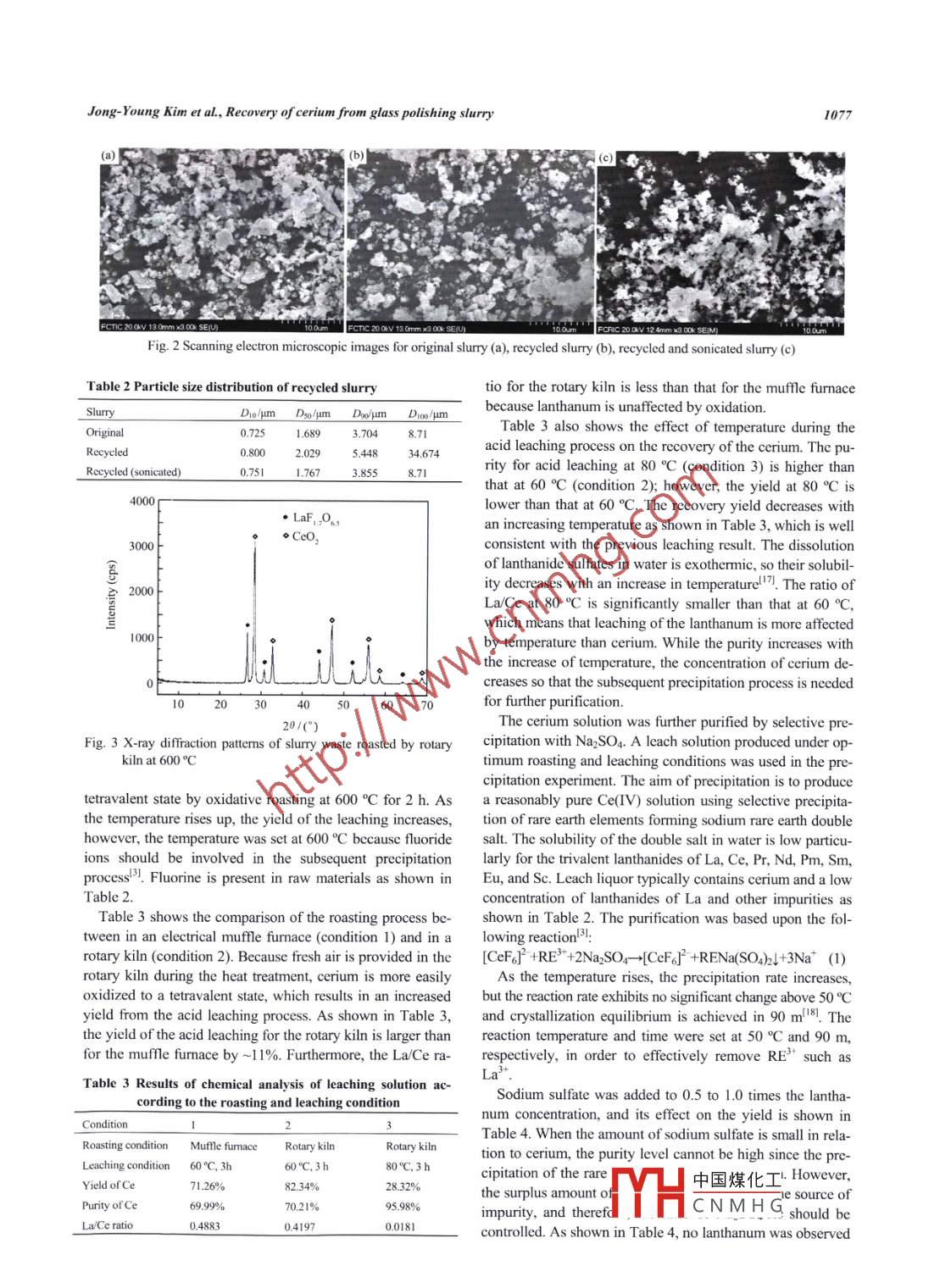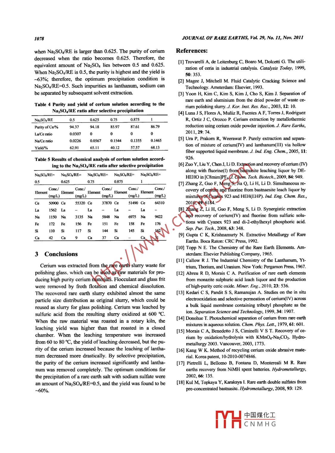 Available online at www.sciencedirect.com, JOUNALOPScienceDirectRARE EARTHSEL SEVIERJOURNAL OF RARE EARTHS, VoL 29, No. 11, Nov. 2011, P. 1075www.re-journal.com/en/Recovery of cerium from glass polishing slurryJong-Young Kim', Ung Soo Kim' , Myeong Seop Byeon', Woo-Kyu Kang', Kwang-Teak Hwang', Woo-Seok Cho'(1. Ilcheon Branch, Korea Instinute of Ceramic Engineering and Technology Gyeongchung Rd, Sindun-Myreon, lcheon-si, Kyeonggi do 467-843, Korea; 2. RINCO,Cheongjus, Chungcheongbuk do, Korea)Roceived 20 February 2011; revisod 20 June 2011Abstract: Cerium was extracted from rare earth slurry waste used for polishing a glass substrate. Iitally, glass frit and flocculant were re-moved by foth flotation and dislution. The recovered rare carth sury exhibited almost the same particle size distribution as original slurry,which could be reused as sluy for glass polishing. From the rare eath sury, the cerium solution was obtained by an oxidaive thermal treatmentand subsequent chemical leaching The cerium solution was further purified up to 94% by selective precipitation of rare cearth specics.Keywords: cerium; separation; waste; polishing slurry; rare earthsDue to its specific functional applications, cerium is the tions, the oxidation of Ce(II) to Ce(TV) may occur bymost important one of the rare earth elements. Rare earth chemical oxidation with strong oxidants, such as persulfate,oxides have been widely investigated as catalytic promoterspermanganate, bismuth, lead oxide or silver oxide, or byto improve the activity and thermal stability of catalysts'"!.electrochemical oxidation or photochemical oxidatin[12-14.Cerium plays an important role in three-way catalysis andThe separation of cerium from the rare earth elements canfluid catalytic cracking, two catalytic processes that are sigbe carried out by selective dissolution of the trivalent rarenificant because of their economic relevance and tonnagekearth hydroxides, keeping the cerium(IV) hydroxide in itsCerium and other rare earth oxides have also been studied asinsoluble form, or through its selective precipitation frompossible heterogeneous catalysts for selective oxidation of acid solution. In either case, the cerium separation is possiblehydrocarbons.due to the solubility difference between the Ce(IV) bydrox-Cerium compounds are also used as abrasive materials foride (Kp~10 54) and the RE(II) bydroxide (Ksp~10 23). How-polishing glass and silicon wafers. However, an enormousever, oxidation through permanganate solution leads to si-amount of abrasive materials is wasted after being used for multaneous precipitation of Ce(OH)4 and MnO2. After pre-polishing glass for display applicationsb. The slurry forcipitation, the solids need to be purified if a high purityglass polishing is a mineral containing a high concentrationproduct is desiredl5s. Based on this work, we showed thatof cerium and other elements such as the lanthanides (La, Nd, rare earth shurry with ~40 wt.% of cerium could be recycledPr), which are mixed with the elements such as Fe, Al, and after froth flotation, which could be used as polishing slurry.Si in the polishing process. The heterogeneous nature ofFurthermore, cerium solution of a high purity could be ob-slurry waste makes it difficult to refine cerium ftom thetained from the recycled slurry by subsequent separationwaste, but after being refined, cerium of a high purity can beprocess such as solvent extraction.obtained at a significantly reduced cost.In this work, we attempted to separate the cerium from theThe separation of a rare earth mixture into individual ele-slury waste for glass polishing by selective precipitation ofments is very difficult to achieve, due to their similar physi-rare earth element, in which tetravalent cerium remains incal and chemical propertiest 8. In an aqueous solution, rareacidic solution. As a first stage, glass frit and flocculant wereearth elements are present as trivalent cations. Cerium isseparated by froth flotation and chemical dissolution. Cemost likely to be oxidized to a tetravalent state and, givenrium was extracted from the resulting rare earth slurry bythis property, its separation is generally the easiest. In the oxidative roasting and a subsequent acid leaching process,tetravalent form, the cerium ion exhibits chemical behaviorand purified further by removing the rare earth elementsmarkedly different from other trivalent rare earth ionsheio. Inthrough selective precipitation.alkaline solutions, the trivalent cerium is readily oxidized tothe tetravalent ceric ion either by bubbling oxygen during1 Experimentalrare earth hydroxide precipitation or afterwards by drying therare earth hydroxide in the presence of air'. In acidic solu-The rare earth slurry waste used in this experiment was中國(guó)煤化工Foundation item: Projet sppored by the Einergy & Resource R&D Progam under the Ministy of Knowlcdge Eco2-P-02-0-000)Corresponding author: Jong- Young Kim (E-mail: jykim@kicet.re.kr; TeLl: +82-31-645-1423)fYHCNMHGDOI: 10.1016/51002-0721(10)60601-11076JOURNAL OF RARE EARTHS, VoL. 29, No.11, Nov. 2011supplied by Ashai glass. The slurry waste was precipitated sides glass frit, flocculants containing aluminum or iron areby flocculant and dried by filter press. Table 1 represents the included because they are used to precipitate the solid. Polychemical composition of the slury waste. The slury wastealuminum chloride or FeCl3*xH2O can be used as a floccu-contains rare earth elements (cerium, lanthanum, praseo-lant to make the sudge cake by lowering the pH. Therefore,dymium), a glass frit component, mainly consisting of SiO2,we attempted to remove the flocculant by chemical dissolutionand flocculant such as poly- aluminium chloride. Initally, 12and then separate the glass frit from the rare earth materials bykg of the waste was mixed with 1 kg of xalic acid (or citricfroth flotation using their difference in density and surfaceacid) and 22 kg of water (pH~l .5) and stirred for 4 h at 