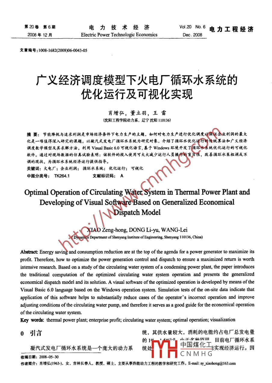 第20卷第6期電力技術(shù)經(jīng)濟Vol.20 No.6電力工程經(jīng)濟2008年12月Eletric Power Technologic EconomicsDec.2008文章編號:1008-1682(2008)06-0043-05廣義經(jīng)濟調(diào)度模型下火電廠循環(huán)水系統(tǒng)的優(yōu)化運行及可視化實現(xiàn)肖增弘,董立羽,王雷(沈陽工程學(xué)院動力系,遼寧沈陽110136)摘要:節(jié)能降耗與追求利潤是市場經(jīng)濟條件下電力生產(chǎn)的主題,如何對電力生產(chǎn)進行優(yōu)化調(diào)度以保證企業(yè)利潤的最大化是一項值得深入研究的課題。以凝汽式發(fā)電廠循環(huán)水系統(tǒng)為研究對象,介紹了循環(huán)水優(yōu)化運行的傳統(tǒng)算法和廣義經(jīng)濟調(diào)度數(shù)學(xué)模型及其求解方法,利用Visual Basic 6.0可視化語言,基于Windows環(huán)境開發(fā)了循環(huán)水系統(tǒng)優(yōu)化運行的可視化軟件。通過對現(xiàn)場數(shù)據(jù)的仿真試驗表明:該軟件的投入使用可大大減少運行人員操作的盲目性,改善循環(huán)水泵粗調(diào)或不調(diào)的現(xiàn)狀,為循環(huán)水系統(tǒng)經(jīng)濟運行提供指導(dǎo)。關(guān)鍵詞:火電廠;企業(yè)利潤;循環(huán)水系統(tǒng);優(yōu)化運行;可視化中圖分類號: TK264.1文獻標(biāo)識碼: AOptimal Operation of Circulating Water System in Thermal Power Plant andDeveloping of Visual Software Based on Generalized EconomicalDispatch ModelXIAO Zeng-hong, DONG Li-yu, WANG-Lei(Dynamics Departmeat of Sbenyang Intitute of Engincering Shenyang 110136, China)Abstact: Energy saving and consumption reduction are at the top of the agenda for a power generator to maximize itsprofit. Therefore, how to optimize the power generation control and dispatch to ensure a maximized retum is worthintensive research. Based on a study of the circulating water system of a condensing power plant, the paper introducesthe traditional computation of the optimized circulating water system operation and presents the generalizedeconomical dispatch model and its solution. A visual software of the optimized operation is developed by means of theVisual Basic 6.0 language based on the Windows operation system. Simulation tests of the on- site data indicate thatapplication of this software helps to substantially reduce cases of the operator' s incorrect operation and improveadjusting conditions of the circulating water pump, and therefore it serves as a good guide for the economical operationof the circulating water system.Key words: thermal power plant; enterprise proft; circulating water system; optimal operation; visualization0引言統(tǒng),其供水量較大,消耗的電能約占電廠總發(fā)電量的小工安種盾田目前電廠循環(huán)水系凝汽式發(fā)電廠循環(huán)水系統(tǒng)是一個龐大的動力 系統(tǒng)處中國煤化工實現(xiàn)經(jīng)濟運行。因收稿日期: 2008-05-30YRCNMHG作者簡介:肖增弘(1963-), 女,吉林長春人,教授,碩士,主要從事熱能動力工程的教學(xué)和研究工作。E-mail: sy. xiaobong@163.com43電力工程經(jīng)濟電力技術(shù)經(jīng)濟第20卷此,研究循環(huán)水系統(tǒng)的優(yōu)化運行方式是提高電廠經(jīng)供電量減少;再者,單位發(fā)電燃料成本恒小于上網(wǎng)濟性的一項重要措施。電價,即機組功率增量與循環(huán)水泵耗功增量兩者是本文以某電廠300 MW機組為例,對循環(huán)水系不等價的,由此引出了省煤和節(jié)電的價值比較問題。統(tǒng)的優(yōu)化運行進行了深人研究,開發(fā)了循環(huán)水系統(tǒng)因此,即使機組功率增量大于循環(huán)水泵耗功增量,優(yōu)化運行的可視化軟件。有時也未必能給企業(yè)帶來效益。2.1廣 義經(jīng)濟調(diào)度的數(shù)學(xué)模型8刀1傳統(tǒng)經(jīng)濟調(diào)度模型下循環(huán)水系統(tǒng)的優(yōu)為了方便討論,這里只計算毛利潤,即只考慮化計算凹售電收人和發(fā)電燃料費用2項,暫不考慮其他費用。可得如下公式:傳統(tǒng)的循環(huán)水系統(tǒng)的優(yōu)化運行問題,實際上是對某一時刻,毛利潤為:尋求機組的最大凈功率。由于循環(huán)水系統(tǒng)較復(fù)雜,R=(N-N)x D-N,xbxDmx 10*(2)其優(yōu)化運行不能孤立地僅針對某-部分,必須建立在另一時刻當(dāng)循環(huán)水泵運行方式發(fā)生變化后,系統(tǒng)的數(shù)學(xué)模型進行優(yōu)化求解4。毛利潤變?yōu)?假設(shè)此時負荷不變):眾所周知,增加循環(huán)水量會使汽輪機的凝汽器r=(N;-N')xD~-Ngxb' x D_x 10*(3)真空提高凹,使機組的發(fā)電量增加,但增加循環(huán)水量式中: R、r分別為某- -時刻毛利潤和某時刻循環(huán)水泵也會使循環(huán)水泵的耗電量增加,因此,兩者之間存運行方式變化后的毛利潤,元/ h; N為機組發(fā)電量,在某個最佳值,使系統(tǒng)的凈功率最大。以兩者的差kW *h;N