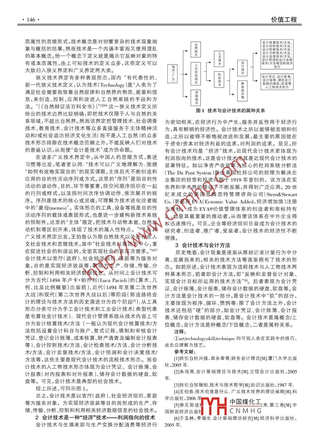 Value Engineering●145●廣義技術(shù)視野中的會計技術(shù)The Accounting Technology from the Horizon of Generalized Technology張現(xiàn)爭ZHANG Xian-zheng(安陽市中等職業(yè)技術(shù)學(xué)校,安陽455000)( Anyang Secondary Vocational and Technical School , Anyang 455000, China )摘要:探討會計性質(zhì)的文獻很多,探討范圍包括自然屬性與社會屬性,技術(shù)性與科學(xué)性,系統(tǒng)性,信息性,行為性等。會計的技術(shù)屬性廣為認可,但尚缺乏會計技術(shù)是否屬于技術(shù),屬于哪類技術(shù)的研究。文章以技術(shù)的概念為研究起點,認為會計技術(shù)不屬于狹義技術(shù),屬于廣義技術(shù)中的社會技術(shù);分析了會計技術(shù)的利潤指向性;對會計技術(shù)與會計方法進行了辨析。Abstract: There are many documents researching the character of accounting, including naturality, sociality, technicality, scienceproperty, system property, information property and behavior property. Yet there isn't the document researching the accounting technologybelongs to which type of technology. The document summarizes the conception of technology, considers the accounting technology doesn'tbelong to narrow sense technology, but belongs to broad sense technology. The document analyses the profit directionality of the accountingtechnology. The document also discriminates between the accounting technology and the accounting approach.關(guān)鍵詞:廣義技術(shù);會計技術(shù);會計方法Key words: Broad Sense Technology; Accounting Technology; Accounting Approach中圖分類號:F231.4文獻標(biāo)識碼:A文章編號:1006- -4311(2013)07-0145 -020引言奇提出)、‘設(shè)計'(工程師們自己提出的、‘效能'(巴文克美國著名會計學(xué)家喬治.O●梅在《財務(wù)會計》中明確和斯考利莫斯提出)、 理性有效行為'(埃盧爾提出)、‘中指出:“會計是一門藝術(shù)(art),而不是一門科學(xué),是一門具有間方法'( 賈斯珀斯提出)‘以經(jīng)濟為目的的方法'(古特廣泛的、多種用途的藝術(shù)(ar)?!苯兄炫嘤⒄J為:“新時代的爾一 奧特林費爾德和其他經(jīng)濟學(xué)家提出)、‘實現(xiàn)社會目的會計概念可以理解為:“會計是商品經(jīng)濟社會里處理財務(wù)的手段'(賈維爾提出)、 ‘適應(yīng)人類需要的環(huán)境控制'(卡本信息和利用財務(wù)信息管理經(jīng)濟的技術(shù)。"2近現(xiàn)代以來,會特提出)、‘ 對能的追求'(芒福德和斯潘格勒提出)、‘實現(xiàn)計的科學(xué)性、信息性、系統(tǒng)性等屬性8益突出,但會計仍然工人格式塔心理的手段'(瓊格 提出)、‘實現(xiàn)任何超自然自具有鮮明的技術(shù)屬性和豐富的技術(shù)內(nèi)容。然而,鮮有論者我概念的方式'(奧特加提出)、 '人的解放'(邁希恩和馬可探討內(nèi)涵豐富的技術(shù)如何包括會計技術(shù),會計技術(shù)的特性費 森提出)、‘自發(fā)救助'(布里克曼提出)、‘超驗形式的發(fā)及其與會計方法的區(qū)別。本文對此進行探討,有助于明晰明和具 體的實現(xiàn)'(德塞爾提出)、迫使自然暴露本質(zhì)的手技術(shù)與會計技術(shù)的邏輯關(guān)系。段'(黑德格提出)等等,這些解釋在字面上都明顯不同。但1從廣義技術(shù)到會計技術(shù)即使把這些都考慮進去,也還有很多其他的定義,其中每.美國技術(shù)哲學(xué)家卡爾.米切姆總結(jié)西方學(xué)術(shù)界對技術(shù)一 種定義一這樣假設(shè)是合理的一一 都在 技術(shù)的普遍含概念的理解時指出:“技術(shù)的現(xiàn)有解釋多種多樣,如把技術(shù)義上揭示了某些真實方面,但卻又都是暗中運用有限的幾說成是‘感覺運動技巧'(費布里曼提出)、“應(yīng)用科學(xué)'(本個中心點。 因此,關(guān)于這些解釋的真假常常要看這個狹窄觀點的排他性而定。"1BP47米切姆的這一略顯累贅的綜述也作者簡介:張現(xiàn)爭( 175-),男,河南鄭州人,北京理工大學(xué)碩士研很不全面 ,至少沒有涵蓋東方學(xué)者對技術(shù)的不同見解,以究生安陽市中等職業(yè)技術(shù)學(xué)校講師,研究方向為會計及近幾+ 年來新出現(xiàn)的不同技術(shù)定義,也未包括此后米切理論、注冊會計師審計。姆本人所給出的技術(shù)定義。概念是反映對象特有屬性或本的標(biāo)準(zhǔn)差存在向下偏倚,這種偏倚經(jīng)過調(diào)整后會相應(yīng)的減資,政府應(yīng)提高服務(wù)貿(mào)易開放程度,加大服務(wù)業(yè)利用外資少,但是由此使二步系統(tǒng)GMM的估計結(jié)果不可靠,如的力 度;調(diào)整外資在服務(wù)行業(yè)的配置方式,提升外資的配InFDl-- 的系數(shù)為-0.0066,這與FDI的實際經(jīng)濟意義相矛置效率等 方面考慮。盾。另外,我們采用面板數(shù)據(jù)的時段比較小,這樣也導(dǎo)致二參考文獻:步系統(tǒng)GMM估計結(jié)果的偏差程度增大。[1]劉艷.我國服務(wù)貿(mào)易進口、服務(wù)業(yè)FDI 與技術(shù)進步的關(guān)系4結(jié)論與建議研究一基于協(xié)整方法和VEC模型的實證分析[J].國際商務(wù)研究,本文構(gòu)建我國服務(wù)業(yè)FDI與服務(wù)貿(mào)易出0結(jié)構(gòu)的行2011,(1):9-15.業(yè)動態(tài)面板數(shù)據(jù)模型,利用系統(tǒng)GMM的方法探究我國服[2]周學(xué)仁.FDI技術(shù)水平與東道國出口貿(mào)易結(jié)構(gòu)一基于中國務(wù)業(yè)FDI與服務(wù)貿(mào)易出口間的關(guān)系。實證表明,服務(wù)業(yè)數(shù)據(jù)的指標(biāo)衡量與關(guān)系檢驗[].財貿