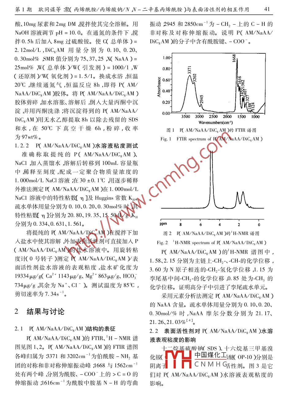 第18卷第1期化學(xué)研究與應(yīng)用Vol 18 No. 12006年1月Chemical Research and ApplicationJan.2006文章編號(hào)】005-1656(2006)01-0040-04聚(丙烯酰胺/丙烯酸鈉/№-二辛基丙烯酰胺)與表面活性劑的相互作用耿同謀2,吳文輝21.重慶師范大學(xué)化學(xué)學(xué)院,重慶4000472.北京理工大學(xué)材料科學(xué)與工程學(xué)院北京100081)摘要浰用粘度法研究了孿尾疏水締合水溶性聚(丙烯酰胺/丙烯酸鈉/N,N-二辛基丙烯酰胺P(AMNaAA/ DiCe aM)]與表面活性劑十二烷基硫酸SDs)十六烷基三甲基溴化銨(CTABλ壬基酚聚氧乙烯醚〔oP-10)舶相互作用。研究表明SυS、CTAB的加入能顯著地降低(AM/NaAA/Di3AM)水溶液的臨界締濃度。表明P(AM/NaAA/ DICs AM)與SDS、CTAB的疏水締合作用較強(qiáng),而與OP-10的疏水締合作用關(guān)鍵詞孿尾疏水締合冰溶性聚合物;面活性劑粘度行為中圖分類號(hào)⑩647.2文獻(xiàn)標(biāo)識(shí)碼:A疏水締合水溶性聚合物( Hydrophobically As-1.1主要試劑與儀器sociating Water- Soluble polymers)是指聚合物親丙烯酰胺(AM);過硫酸銨;尿素;氧化鈉水性大分子鏈上帶有少量疏水基團(tuán)的水溶性聚合(AP)丙烯酸(AA,AP)N,N-二甲基胺基乙基物。這類聚合物與表面活性劑在溶液中發(fā)生較強(qiáng)2-甲基丙烯酸(DM99%, Acros Organics公的相互作用致使很少量的表面活性劑對(duì)其混合司)NN-二辛基丙烯酰胺(DC3AM,實(shí)驗(yàn)室自溶液的性能造成很大的影響。而在疏水締合水溶制)十二烷基硫酸鈉(SDS99%, Acros Organics性聚合物的應(yīng)用領(lǐng)域,如涂料、醫(yī)藥、化妝品、三次公司)汁六烷基三甲基溴化銨 CTAB AP京化采油等幾乎都要遇到與表面活性劑相互作用問學(xué)試劑公司)汪基酚聚氧乙烯(OP-10,AP天題因此研究疏水締合水溶性聚合物與表面活性津天泰精細(xì)化學(xué)品有限公司)劑相互作用有極其重要的意義1Nicolet-560型傅立葉變換紅外光譜儀(美國人們?cè)美鋬鐾干潆婄R、熒光光譜、核磁共 Nicolet公司);ARX-400型核磁共振儀(瑞士振、ⅹ線衍射中子衍射等研究了疏水締合水溶性 Brucker公司); Vario eL元素分析儀(德國Ele-聚合物/表面活性劑在溶液中的相互作用性溶液 mentar公司);D-4-0.51mm型 Ubbelohde粘度微觀結(jié)構(gòu)與流變的關(guān)系2粘度法是研究聚合物計(jì)VDV型 Brookfield旋轉(zhuǎn)粘度計(jì)(0號(hào)轉(zhuǎn)子,美與表面活性劑在溶液中相互作用的傳統(tǒng)方法3。國 BROOKFIELD公司本文在合成了孿尾疏水締合水溶性鄹丙烯酰胺/1.2R(AM/NaAA/ DiCe aM)制備及性能的測試丙烯酸鈉/NN-二辛基丙烯酰胺工簡稱PAM1.2.1P(AM/NaAA/DC3AM)的合成稱取NaAA/DiC8AM)]的基礎(chǔ)上,利用粘度法研究其與0.083~0.246gDiC8AM和6.016gSDS加入蒸餾表面活性劑在水溶液中的相互作用。水50mL于250mL小燒杯中攪拌0.5~1h至溶液透明轉(zhuǎn)移到500mL三口瓶中。冰浴條件下在裝1實(shí)驗(yàn)部分有通氮和攪拌裝置的三口瓶中加入蒸餾水50mL,并加TYH中國煤化工037~5.005g丙烯CNMHG收稿日期2005-01-10修回日期2005-04-08基金項(xiàng)目中國石油化工集團(tuán)公司十五重大科技攻關(guān)項(xiàng)目(P100043)聯(lián)系人簡介耿同諫(1962-)男高級(jí)工程師主要從事功能高分子材料研究。Emaiεengtongmou@sina.com第Ⅰ期耿同謀等聚(丙烯酰胺/丙烯酸鈉/NN-二辛基丙烯酰胺)與表面活性劑的相互作用41酸、10mg尿素和2mgDM攪拌使其完全溶解。用振動(dòng)2945和2850cm為-CH2-上的C-H的NaOH溶液調(diào)節(jié)pH=10.0。在通氮的條件下攪非對(duì)稱及對(duì)稱伸縮振動(dòng)。說明P( AM/NaAAa′拌0.5h后加入8mg過硫酸銨。使(總單體)=DiC3AM)的分子中含有酰胺鍵、-COO2.12mol/L, DICAM用量分別為0.100.20、0.30mol%SMR值分別為75、37、25X(NaAA)25mol%W(總單體)W(引發(fā)劑)=1000/1,W(還原劑)W(氧化劑)=1.5/1。換成水浴恒溫20℃繼續(xù)通氮?dú)?恒溫反應(yīng)8h,即得P(AMNaAA/DiC3AM〕膠體。將PAM/NaAA/ DICoM)0.40膠體剪碎加水溶脹、溶解后倒入大量丙酮中沉淀并用丙酮洗滌;將沉淀得到的 PC AM/NaAADiC3AM)用無水乙醇提取8h以除去殘留的SDs3500300250020010010和水,在50℃下真空干燥6h,粉碎,收率圖1R(AM/NaAA/DC3AM)的FTIR譜圖為97wt%。Fig 1 FTIR spectrum of R AM/NaAA/DiC AM)1.2.2PAM/NaAA/ DiCoAM)水溶液粘度測試準(zhǔn)確稱取提純的P(AM/NaAA/DiC3AM)NaCⅠ加入蒸餾水溶解后轉(zhuǎn)移到100mL容量瓶中稀釋至刻度,配成一定聚合物質(zhì)量濃度的1.000mol/LNaC溶液在30±0.1℃用逐步稀釋外推法測定rAM/NaA/DC3AM)在1.000mo/LNaCl溶液中的特性粘數(shù)η]及 Huggins常數(shù)K疏水單體用量分別為0.10、0.20、0.30mol%時(shí)其特性粘數(shù)η]分別為20.80、19.35、15.50dL/gK分別為0.334、0.631、1.561。將提純的AM/ NaAa/dic3AM)在攪拌下加圖2(AM/NaAA/DCAM)的HNMR譜入鹽水中使其溶解外加表面活性劑可直接加入PFig 2 H-NMR spectrum of R( AM/NaAADiCAM(AM/NaAA/DiC8AM)的鹽水溶液中。用旋轉(zhuǎn)粘P(AM/ NaAA/DiC3AM)的HNMR譜圖中度計(jì)0號(hào)轉(zhuǎn)子)測定PAM/ NaAA/dic34M)表1.58、2.15分別為主鏈上CH2、CH的化學(xué)位移面活性劑鹽水溶液的表觀粘度,鹽水礦化度為3.60為N原子相連的CH2氫化學(xué)位移,.15為19334g/g(Ca21143μg/g、Mg863μg/g、HCO孿尾基中間-CH2-的化學(xué)位移.85處為CH3的34g/g其余為Na、C1)測試溫度為85℃,化學(xué)位移。證明高分子中引進(jìn)了孿尾疏水單元。剪切速率為7.34s采用元素分析法測定rAM/NaAA/DC3AM)的NaAA含量。疏水單體用量分別為0.10、0.20、2結(jié)果與討論0.30mol/%時(shí),NaAA摩爾分?jǐn)?shù)分別為21.17、21.26、2