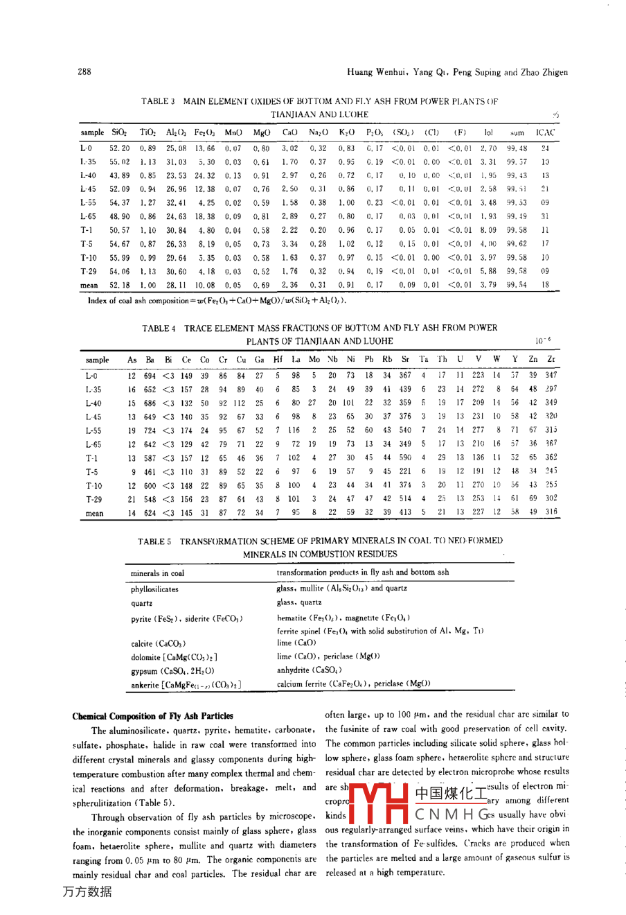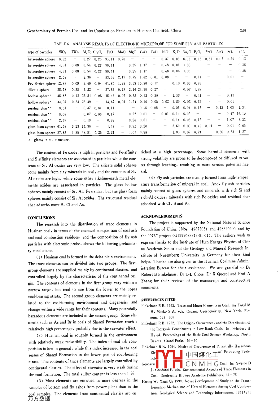 Printed in Chniversity of Geosciences, Vol. 12, No. 4, p 283-290, December 2001ISSN002-0705Geochemistry of Permian Coal and Its CombustionResidues in Huainan Coalfield, ChinaP5Department of Energy Resources and Geology, China University of Geosciences, Beijing 100083Peng SupinDepartment of Geology and Engineering, China University of Mining and Technology, Beijing 100083Department of Resources and Environment, Huainan Institute of Technology, Huainan 232001INAA (instrumental neutron activation analysis)was used to determine the contents of trace ele-ts in coal samples from Il workable Permian coal seams in Huainan coalfield. with XRFS(X-rayPower Plant and Luohe Power Plant was analyzed. In addition, the electron microprobe was employedto study the chemical composition of some ny ashes and bottom ashes, Compared with those of the coalstrace elements of the Huainan coalLike most coals worldwide. the elements Se, S, As, Sb, Br, U and Cl are enriched in Huainan coal according to Clarks value, while the other elements tend to be diluted, The large fluctuation in the con-tents of trace elements in this kind of coaltrates great differences in coal seams. On the othercontents of these elements are very similar in diferent bottom and fy ash samples. The ele-organic altinity tend to concentrate in ny and bottom ash than in coal, especialelements associated with Fe, However. the elements with strong organic affinity tend to be volatile dur-ing the combustion. Moreover, the abundance of the elements in fly ash and bottom ash changes withdifferent densities and with different particle sizes. The bottom and ny ashes consist of glass, limmullite,coal residues and ferrite minerals. Some residual chars contain higher contents of volatile ele-ments. such as S, P, Cl and As, indicating that the ash containing more residual chars has a strong ad-sorption of some hazardous elements, suggesting a possible utilization of power plant ash in the field ofwater cleaning.KEY WORDS coal, trace element, combustion resides, geochemistry, INAA, China.INTRODUCTIONovic, 1983). For example, when coal wastes are used for landMany environmental problems may arise during coal min- reclamation, the harmful elements in them may pollute watering and utilization. Among these problems, much attention has soil and crops. The solid combustion residues may pollute wabeen paid to SO and NO, emission during coal combustion. ter and soil during their storage and utilization, The harmfulBut the environmental effects produced by hazardous elements materials thus produced during coal combustion and coal theduring coal mining and utilization are also important and de- mal decomposition may also affect the atmosphere and waterserve to be studied(Goodazi, 1995: Finkelman, 1993; Valk- But, little research has been developed on this topic in ChinaThe combustion residues reach nearly 0. 1 billion tons while thes This paper is supported by the National Natural Science Foundation Chinacoal production reaches approximate 1. 3 billion tons in 1998 in-· land reclamationand by the 973"中國煤化工roject(G199902220101)ruction. addiforCNMHGwater source areaManuscriThus, drinKing wnd crops may be dete-Manuscript accepted October 20, 2001riorated by hazardous materials. It is necessary to determineHuang Wenhui, Yang Qi. Peng Suping and Zhao Zhigenhazardous elements in coal and its combustion residues in order raw coal. the sulfur contents of coal seams in Shanxi Formaevaluate its negative effects on the environment during coal tion are higher due to the seawater effect during coal formautilization,to guide the utilization of both coal mining wastes tion. The content of phosphorus is very low, often 0. 006and combustion residues and to predict potential environmental 0.035 %(Zhao, 1991)effects(Goodarzi, 1995). In this paper, INAA(instrumentalneutron activation analysis)and XRF(X- ray fluorescence spec- EXPERIMENTStrometry)are used to deThe coal samples are collected from 10 workable coalin different coal samples from workable Permian coal seams in seams of Shanxi Formation, Xiashihezi Formation and ShangHuainan coalfield and in different combustion samples from shihezi Formation, as shown in Table 1. Afler being channellTianjiaan Power Plant and Luohe Power Plant whose major fu- ed from all coal seams, the samples are ground and mixed inel is Huainan coal. The electron microprobe is used to deter- the laboratory. The contents of trace elements in coal samplesmine the chemical composition of fly ash particles, and the ex. are determined with INAA. HK is determined with cold vaporperimental data are employed to study the distribution and seg- atomic absorption spectrometry. The combustion residues ofregation of trace elements, This study will further our under- coal are systematically collected from the power plants residue-standing of the distribution of trace elements. the transforma. storage pool. The XRF at the Geology and Mineral Researchtion mechanism of minerals in coal, and the geochemistry of Institute of Nuremberg University in Germany was used to decombustion residues. In this sense. the present research offers termine the geochemical composition of combustion residueus the basic information on different kinds of benefits including The electron microprobe at China University of Geosciencesthe rational use of coal, the proper disposition of solid combus- was employed to study the chemical composition of fly ashestion residues, and the utilization of combustion residues as a The experimental condition and precision are the same as thoseresource and environmental protection.in the published paper(Huang et al., 2000: Huang and Yang1999)GENERAL INFORMATION ON STUDY AREA AND COALSEAMSRESULTS AND DISCUSSIONHuainan coalfield, located in southeast margin of North Composition of Coal AshChina platform, is one of the main coal mines in the center of The composition of coal ash is often used as a geochemicalAnhui Province. The coal seams are mainly devel