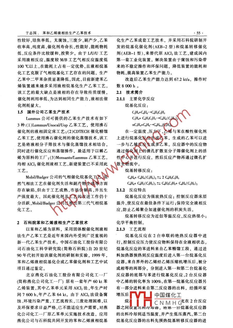 石化技術(shù),2005, 12(1): 54綜述PETROCHEMICAL INDUSTRY TECHNOLOGY苯和乙烯液相法生產(chǎn)乙苯技術(shù)于志國(中國石化北京燕化石油化工股份有限公司化工一廠,北京,102500)摘要:介紹了苯和乙烯液相循環(huán)烷基化工藝在苯乙烯裝置上的工業(yè)應(yīng)用情況.該工藝流程設(shè)計(jì)合理,裝置運(yùn)行平穩(wěn),操作方便,無需三廢處理,是環(huán)境友好工藝。烷基化反應(yīng)的乙烯轉(zhuǎn)化率達(dá)100%,乙苯選擇性平均在86.5%以上;烷基轉(zhuǎn)移反應(yīng)二乙苯轉(zhuǎn)化率平均在80%以上,多乙苯轉(zhuǎn)化率平均在80%以上;乙萃產(chǎn)品純度在99.6%以上。烷基化催化劑具有良好的活性和穩(wěn)定性,可在同類裝置新建或擴(kuò)能改造中推廣應(yīng)用。關(guān)鍵詞:苯乙烯液相乙苯烷基化催化劑苯乙烯是重要的基本有機(jī)原料,主要用于制統(tǒng)中。此方法的優(yōu)點(diǎn)是烷基化收率高,副產(chǎn)焦油比造聚苯乙烯樹脂、丙烯腈-丁二烯-苯乙烯共聚物傳統(tǒng)少2/3,AlCl,用量少,是傳統(tǒng)AlCl,液相法的.(ABS)、苯乙烯-丁二烯-苯乙烯嵌段共聚物25% ,不循環(huán)使用。但仍存在AlCl3的腐蝕及廢水(SBS)、丁苯橡膠彈性體(SBR)、合成樹脂涂料及處理問題,設(shè)備投資較高,目前該工藝已逐步被其絕緣體等材料,它們?cè)谄囍圃?、家用電器、紡織、他工藝所取代。建材、輕工和玩具等工業(yè)部門都有重要的用途。目1.3 分子篩氣相法前,世界苯乙烯的生產(chǎn)能力已達(dá)20Mta,我國苯Mobil和Badger 公司于70年代開發(fā)了分子乙烯的生產(chǎn)能力為0.90Mt/a,世界苯乙烯市場(chǎng)目篩氣相法乙苯工藝,又稱M/B工藝,采用新型分前正趨于飽和,而亞太市場(chǎng)仍需大于求,中國近幾子篩催化劑,完全避免了AlCl催化劑帶來的一年在建的苯乙烯裝置約為1.60 Mu/a。目前新建成系列問題。此工藝使用ZSM-5分子篩催化劑,催的大慶、廣州、吉林、揚(yáng)巴4套引進(jìn)和合資裝置都化性能好。烷基化反應(yīng)器由6段催化劑床層串聯(lián)采用了較先進(jìn)的分子篩氣相法或分子篩液相法乙組成,苯在高溫和中壓下以氣相與乙烯進(jìn)人床層苯工藝和催化脫氫苯乙烯工藝。反應(yīng),反應(yīng)溫度為370~420C。此法的催化劑用量少,壽命長(zhǎng),無腐蝕,不需處理催化劑廢液,無污1乙苯生產(chǎn) 技術(shù)簡(jiǎn)介染,乙苯收率高,物耗能耗低,還可以副產(chǎn)蒸汽。1.1傳統(tǒng) AICls液相法1980年,第一套氣相烷基化裝置投產(chǎn)。目前全世界傳統(tǒng)AlCl,液相法使用AlCl, 催化劑,AlCl;溶已有37套裝置應(yīng)用該工藝,年產(chǎn)量10Mt以上。解于苯、乙苯和多乙苯的混合物中生成絡(luò)合物,催1.4 分子篩液相法化劑、苯及多乙苯循環(huán)使用,此方法的反應(yīng)介質(zhì)腐Y型分子篩液相法于80年代初由Lumnus/蝕性強(qiáng),設(shè)備要求高,原料的雜質(zhì)含量要求嚴(yán)格,Unocal/Uop聯(lián)合開發(fā)成功,又稱LUU工藝。該工AlCl3用量大,污染嚴(yán)重,物耗能耗很高,副產(chǎn)焦油藝采用Y型分子篩催化劑,催化劑活性高,選擇量大,該工藝不再有新建裝置,老裝置逐步淘汰。1.2均相 AICI,液相法中國煤化工Monsanto公司于1974年開發(fā)了均相AlCl, 液CN M H G畢業(yè)于華南工學(xué)院化相法,又稱改良的AlCl3液相法。此法使用AlCl3工系,長(zhǎng)期從事石油化工生產(chǎn)技術(shù)的開發(fā)及管理,現(xiàn)為苯催化劑溶解于苯混合物中,反應(yīng)器內(nèi)為干燥苯,反乙烯車間主任。聯(lián)系電話:010 -69345137 ,E-mail: ys2004應(yīng)過程發(fā)生在一個(gè)均勻的液相烷基化烷基轉(zhuǎn)移系0622@sohu.com。于志國,苯和乙烯液相法生產(chǎn)乙苯技術(shù). 55性較好,結(jié)焦率低。無腐蝕,三廢少,副產(chǎn)少,乙苯化生產(chǎn)乙苯成套工藝技術(shù),并采用石科院研制開收率高,純度高,催化劑壽命長(zhǎng),性能好,能耗物耗發(fā)的烷基化催化劑(AEB-2型)和烷基轉(zhuǎn)移催化低,反應(yīng)條件比較緩和,投資少。由于L/U/U工藝劑(AEB-1型),來替代原AlCl,法工藝,建成國內(nèi)采用液相反應(yīng),溫度較M/B工藝氣相反應(yīng)溫度低第一套工業(yè)化裝置。解決裝置由于腐蝕和污染帶100 C以上,在能耗.上占有一定優(yōu)勢(shì),且液相烷基來的不穩(wěn)定操作和環(huán)保問題,降低裝置的能耗和化工藝克服了氣相烷基化工藝存在的問題,生產(chǎn)物耗,提高裝置乙苯生產(chǎn)能力。乙苯中二甲苯雜質(zhì)顯著降低。因此,目前新建苯乙改造后乙苯生產(chǎn)能力達(dá)到67.2 kt/a,操作時(shí)烯裝置越來越多采用液相烷基化生產(chǎn)乙苯工藝。數(shù)8 000h。該工藝的最大缺點(diǎn)是液相的存在導(dǎo)致傳質(zhì)緩慢,2.1技術(shù)簡(jiǎn)介催化劑利用率低,為達(dá)到相同生產(chǎn)能力,液相法催2.1.1主要化學(xué) 反應(yīng).化劑耗量大。烷基化反應(yīng):1.5 國外公司乙苯生產(chǎn)技術(shù)CH+CjH→CJHCHsLummus公司可提供的乙苯生產(chǎn)技術(shù)有如下CH4+ CHLCHs→+CH4(CHs)23種:( 1)Lummu/Unocal/Uop乙苯工藝,使用沸石nCH,+CH-→C&Ho (C2H)h催化劑的液相固定床工藝;(2)CDTECH催化精餾在一定溫度、壓力下,乙烯與苯在酸性催化劑乙苯工藝,使用沸石催化劑的催化蒸餾技術(shù),該工上進(jìn)行烷基化反應(yīng)生成乙苯,生成的乙苯可以進(jìn)藝是將液相分子篩技術(shù)與催化蒸餾技術(shù)相結(jié)合,-步與乙烯反應(yīng)生成多乙苯。反