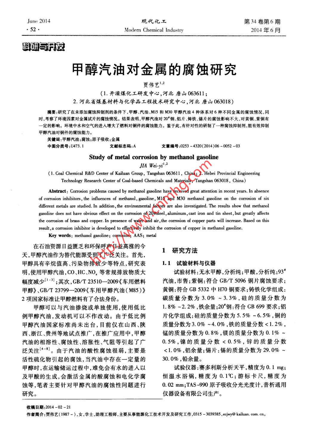 June 2014現(xiàn)代化工第34卷第6期52●Modern Chemical Industry2014年6月御研與開潑甲醇汽油對金屬的腐蝕研究賈偉藝12(1.開灤煤化工研發(fā)中心,河北唐山063611;2.河北省煤基材料與化學(xué)品工程技術(shù)研究中心,河北唐山063018)摘要:研究了在未添加腐蝕抑制劑的條件下,甲醇、汽油、M15和M30甲醇汽油4種體系對6種不同金屬的腐蝕情況,同時,考察了環(huán)境因素對金屬試片的腐蝕情況。結(jié)果表明,甲醇汽油對20*鋼、鋁片、鑄鐵、錫片的腐蝕影響不大,對黃銅、紫銅有一定的影響。 環(huán)境中水和空氣的進(jìn)入增大了燃料對銅件的腐蝕能力。鑒于此,有針對性的研制了- -種腐蝕抑制劑,能有效抑制甲醇汽油對銅件的腐蝕能力。關(guān)鍵詞:甲醇汽油;腐蝕;原子吸收;金屬中圖分類號:U473.1文獻(xiàn)標(biāo)志碼:A文章編號:0253 -4320(2014)06 -0052 -03Study of metal corrosion by methanol gasolineJIA Wei-yi.2(1. Coal Chemical R&D Center of Kailuan Group, Tangshan 063611, China; 2. Hebei Provincial EngineeringTechnology Research Center of Coal-based Chemicals and Materials, Tangshan 063018, China)Abstract : Corrosion problems caused by methanol gasoline have received great attention in recent years. In absenceof corrosion inhibitors , the infuences of methanol, gasoline, M15 and M30 methanol gasoline on the corrosion of sixdifferent metals are studied. In addition, the environmental factors are also investigated. The results show that methanolgasoline does not have obvious efect on the corrosion of 20#steel , aluminum, cast iron and tin sheet, but greatly afectsthe corrosion of brass and copper. In presence of water and air , the corrosion of copper parts will increase. Based on thisresult,a corrosion inhibitor is developed to efectively inhibit the corrosion of copper in methanol gasoline.Key words: methanol gasoline; corrosion; AAS; metal在石油資源日益匱乏和環(huán)保呼聲日益高漲的今1研究方法天,甲醇汽油作為替代能源受到了廣泛關(guān)注。首先,甲醇具有辛烷值高、污染物排放少等特點,研究表1.1試驗材料與儀器明,使用甲醇汽油,CO、HC、NO,等常規(guī)排放物質(zhì)大試驗材料:無水甲醇,分析純;甲酸,分析純;93*幅度減少[1-3] ;其次, GB/T 23510- -2009《車 用燃料汽油,市售;紫銅:符合GB/T 5096銅片腐蝕要求;甲醇》、GB/T 23799- -2009《 車用甲醇汽油( M85)》黃銅:符合GB 5332中H70銅要求;鑄鐵化學(xué)組成:2項國家標(biāo)準(zhǔn)讓甲醇燃料有了合法身份。碳質(zhì)量分?jǐn)?shù)為3.0% ~ 3.3%,硅的質(zhì)量分?jǐn)?shù)為甲醇可以與汽油摻燒或單獨使用,使用低比1.8% ~2.2% ,鐵余量;20*鋼:符合GB 699要求;鋁例甲醇汽油,發(fā)動機(jī)可以不作改動。由于低比例片化學(xué)組成:硅的質(zhì)量分?jǐn)?shù)為5.5% ~6. 5% ,銅的甲醇汽油國家標(biāo)準(zhǔn)尚未出臺,目前僅在山西、陜質(zhì)量分?jǐn)?shù)為3.0% ~4. 0% ,鐵的質(zhì)量分?jǐn)?shù)<1.2%,西、浙江、貴州等地試點推廣,在推廣應(yīng)用中,甲醇錳的質(zhì)量分?jǐn)?shù)為0. 8% ,鎂的質(zhì)量分?jǐn)?shù)為0.1% ~汽油的相溶性.腐蝕性、溶脹性、氣阻等引起了廣0.5%,鎳的質(zhì)量分?jǐn)?shù)< 0.5%,鋅的質(zhì)量分?jǐn)?shù)泛關(guān)注(4-8]。由于汽油的酸性腐蝕很弱,主要是<1. 0% ,鋁余量;錫片:錫的質(zhì)量分?jǐn)?shù)為29. 0%活性硫化物引起的腐蝕,當(dāng)汽油中存在- -定量的30. 0%,鉛余量。甲醇時,在運輸儲運過程中,難免會有水的進(jìn)人以試驗儀器:賽多利斯分析天平,精度為0.1 mg;及甲酸的生成,會激活金屬的酸腐蝕和電化學(xué)腐恒溫水浴鍋,精度為0.1C;游標(biāo)卡尺,精度為蝕等,筆者主要針對甲醇汽油的腐蝕性問題進(jìn)行0.02mm;TAS-990原子吸收分光光度計,普析通用研究。儀器設(shè)備有限公司生產(chǎn)。收稿日期:2014 -02 -21作者簡介:賈偉藝(1987 -),女,學(xué)士,助理工程師,主要從事能源化工技術(shù)開發(fā)及研究工作,0315 - 3039385 ,cjwy@ kailuan. com. cn。.2014年6月賈偉藝:甲醇汽油對金屬的腐蝕研究●531.2 試驗方法表1金屬試片在 4種溶劑中的單位面積質(zhì)量變化值1.2.1腐蝕試片的處理及腐蝕級別的判斷單位面積質(zhì)量變化值93*汽油甲醇M30試片先用65 μm(240粒度)的碳化硅或氧化鋁W/( mg.cm -2 )砂紙?zhí)幚?除去以前用其他等級砂紙留下的打磨痕紫銅0.0169 0.0272 0.0423 0. 0460跡后,將銅片浸沒在洗滌溶劑中,銅片在使用前要進(jìn)黃銅0.0160 0.0240 0.0470 0. 0491行最后磨光。最后磨光時,將試片取出,用無灰濾紙錫片0.00980. 0240 0. 03350.0353保護(hù)手指來拿取銅片,用105 μm( 150目)的碳化硅20*鋼0.0122 0.0183 0.0355 0. 0384或氧化鋁砂紙做精細(xì)磨光處理,將夾在夾鉗上的銅鑄鐵0.0139 0.0194 0.0276 0. 0287片表面磨光,直至用--塊新的脫脂棉擦拭時不再留鋁片0.0058 0.0088 0.0115 0. 0124下污斑為止。當(dāng)試片擦凈后,馬上浸人(或稱重后浸人)已準(zhǔn)備好的試樣中。試片腐蝕級別參照微的加深。其他4種試片并無明顯變化,可見甲醇GB/T5096- -1985193 。汽油體系對銅件的影響最為明顯。另外,由于試驗1.2.2金 屬試片的表面積用的甲醇試劑為分析純,純度高,所含游離酸性離子金屬試片的表面積S(cm2 )為: .少,腐蝕性也較弱,從而導(dǎo)致其他幾種金屬的腐蝕情S= (LxB+BxH+LxH) x2 + 100式中:L為金屬片的長,mm;B為金屬片的寬,mm;況變化不明顯。銅的腐蝕是一個非常復(fù)雜的過程(01 ,為進(jìn)-步H為金屬片的高,mm。研究甲醇汽油體系中銅片腐蝕的原因,向密封和敞1.2.3金屬試片的單位面積質(zhì)量變化值金屬試