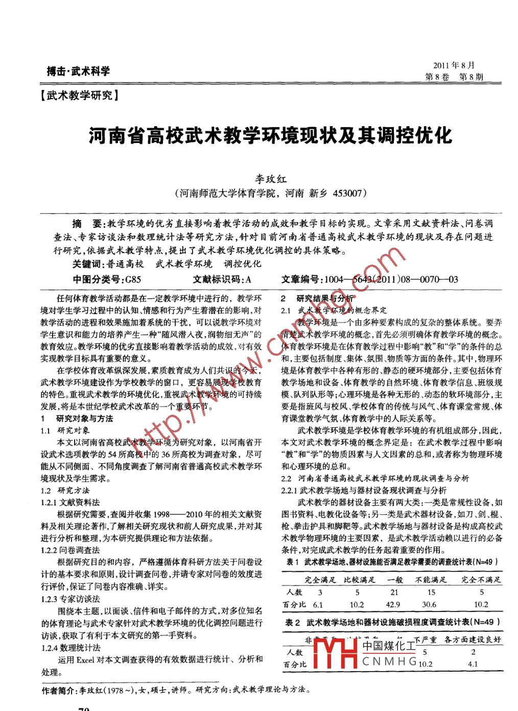 2011年8月.搏擊.武術科學第8卷第8期[武術教學研究]河南省高校武術教學環(huán)境現(xiàn)狀及其調控優(yōu)化李玫紅(河南師范大學體育學院,河南新鄉(xiāng)453007)摘要:教學環(huán)境的優(yōu)劣 直接影響著教學活動的成效和教學目標的實現(xiàn)。文章采用文獻資料法、問卷調查法、專家訪談法和數(shù)理統(tǒng)計法等研究方法,針對目前河南省普通高校武術教學環(huán)境的現(xiàn)狀及存在問題進行研究,依據武術教學特點,提出了武術教學環(huán)境優(yōu)化調控的具體策略。關鍵詞:普通高校武術教學環(huán)境 調控優(yōu)化中圖分類號:G85文獻標識碼:A文章編號:1004- -5643(2011)08- -0070- -03任何體育教學活動都是在一-定教學環(huán)境中進行的,教學環(huán)2研究結果與分析境對學生學習過程中的認知、情感和行為產生著潛在的影響,對.1 武術教學環(huán)境的概念界定教學活動的進程和效果施加著系統(tǒng)的干擾,可以說教學環(huán)境對教學環(huán)境是一個由多種要素構成的復雜的整體系統(tǒng)。要弄學生意識和能力的培養(yǎng)產生-種“隨風潛人夜,潤物細無聲”的清楚武術教學環(huán)境的概念,首先必須明確體育教學環(huán)境的概念。教育效應。教學環(huán)境的優(yōu)劣直接影響著教學活動的成效,對有效體育教學環(huán)境是在體育教學過程中影響“教”和“學”的條件的總實現(xiàn)教學目標具有重要的意義。和,主要包括制度集體、氛圍、物質等方面的條件。其中,物理環(huán)在學校體育改革縱深發(fā)展,素質教育成為人們共識的今天,境是體育教學中各種有形的、靜態(tài)的硬環(huán)境部分,主要包括體育武術教學環(huán)境建設作為學校教學的窗口,更容易展現(xiàn)學校教育教學場地和設備、體育教學的自然環(huán)境、體育教學信息、班級規(guī)的特色。重視武術教學的環(huán)境優(yōu)化,重視武術教學環(huán)境的可持續(xù)模、隊列隊形等;心理環(huán)境是各種無形的.動態(tài)的軟環(huán)境部分,主發(fā)展,將是本世紀學校武術改革的-一個重要環(huán)節(jié)。要是指班風與校風學校體育的傳統(tǒng)與風氣、體育課堂常規(guī)、體1研究對象與方法育課堂教學氣氛、體育教學中的人際關系等。1.1研究對象武術教學環(huán)境是學校體育教學環(huán)境的有機組成部分,因此,本文以河南省高校武術教學環(huán)境為研究對象,以河南省開本文對武術教學環(huán)境的概念界定是:在武術教學過程中影響設武術選項教學的54所高校中的36所高校為調查對象,盡可“教”和“學”的物質因素與人文因素的總和,或者稱為物理環(huán)境能從不同側面、不同角度調查了解河南省普通高校武術教學環(huán)和心理環(huán)境的總和。境現(xiàn)狀及學生需求。2.2 河南省普通高校武術教學環(huán)境的現(xiàn)狀調查與分析1.2研究方法2.2.1武術教學場地與器材設備現(xiàn)狀調查與分析1.2.1文獻資料法武術教學的器材設備主要有兩大類:-類是常規(guī)性設備,如根據研究需要,查閱并收集1998-- 2010 年的相關文獻資圖書資料、電教化設備等;另-類是武術器材設備,如刀、劍、棍、料及相關理論著作,了解相關研究現(xiàn)狀和前人研究成果,并對其槍、拳擊護具和腳靶等。武術教學場地與器材設備是構成高校武進行分析和整理,為本研究提供理論和方法依據。術教學物理環(huán)境的主要因素,是武術教學活動賴以進行的必備1.2.2問卷調查法條件,對完成武術教學的任務起著重要的作用。根據研究目的和內容,嚴格遵循體育科研方法關于問卷設表1武術教學場地、器材設施能否滿足教學需要的調查統(tǒng)計表(N=49 )計的基本要求和原則,設計調查問卷,并請專家對問卷的效度進完全滿足比較滿足一般不能滿足 完全不 滿足行評價,保證了問卷內容準確、詳實。人數(shù)321.2.3專家訪談法圍繞本主題,以面談信件和電子郵件的方式,對多位知名百分比6.110.242.930.6的體育理論與武術專家針對武術教學環(huán)境的優(yōu)化調控問題進行表2武術教學場地和器材設施破損程度調查統(tǒng)計表(N=49 )訪談,獲取了有利于本文研究的第一手資料。1.2.4數(shù)理統(tǒng)計法人數(shù)中國煤化二下不嚴重各方面建設良好運用Excel對本文調查獲得的有效數(shù)據進行統(tǒng)計、分析和百分比TYHCNMHG10.2處理。作者簡介:李玫紅(1978~),女,碩士,講師。研究方向:武術教學理論與方法。“器材應擺放合理,場館的建設和美化- -定要符 合學生身心發(fā)展己與別的同學-樣具有才能; 鼓勵和支持學生在一-種平等 和諧的特點和教學基本規(guī)律。武術館的墻面和有些體育場地的地面的氣氛中交流自己的觀點意見,讓每一位學生都能在這樣- -種顏色一般采用比較溫暖的顏色,諸如柔和的黃色、珊湖色和桃紅真正的教學民主氣氛中、平等互動活動的過程中,展示自己的才色等,因為暖色調可使人在視覺上和情感上的興趣趨向外界,可華,發(fā)揮自己的潛能。再次,教師把微笑帶進課堂,融于學生的活提高中樞神經的興奮性,有利于激起學生的興趣和調動他們的動之中,與學生“打成- -片”",讓學生感到可親可敬,學生才能親其積極性。師而信其道,使師生關系向和諧融洽的方向發(fā)展,使學生在歡樂2.3.3優(yōu)化校園武術文化氛圍愉快融洽、輕松的課堂氣氛中,全身心地投入到學習中去,使學要培