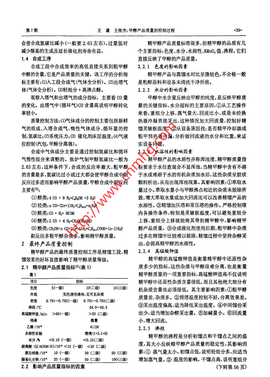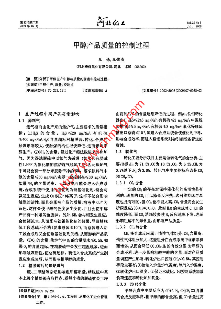第32卷第7期Vol. 32 Na72009年07月河北化工Jul. 2009甲醇產(chǎn)品質(zhì)量的控制過程王謙,王俊杰(河北峰煤焦化有限公司,河北邯鄲056202)[摘要]分析了 甲醇生產(chǎn)中影響質(zhì)量的因素和控制過程。[關(guān)鍵詞]甲醇生產(chǎn):質(zhì)量:控制點(diǎn)[中圖分類號(hào)] TQ 223. 12*1[文獻(xiàn)標(biāo)識(shí)碼] A[文章編號(hào)] 1003-5095 (2009)07-0038-031生產(chǎn)過程中間產(chǎn)品質(zhì)量影響由前到后S的含量逐漸降低的過程。例如:鐵鉬轉(zhuǎn)化1.1 原料氣器出口HS≤245 mg/Nm2, 有機(jī)硫≤3 mg/Nm;中溫脫進(jìn)氣柜前由化產(chǎn)來的焦?fàn)t氣,主要要求的質(zhì)量指硫槽HS≤5 mg/Nm', 有機(jī)硫≤3 mg/Nm': 氧化鋅脫硫標(biāo): (1)H2S的含量。HS≤20 mg/Nam',有 機(jī)硫槽出口總硫≤107,硫進(jìn)入合成系統(tǒng)會(huì)使催化劑中毒,≤4000 mg/Nm, HS含量超標(biāo)對(duì)精脫硫、轉(zhuǎn)化、合成的影響合成效率, 而進(jìn)入精餾系統(tǒng)則會(huì)引起設(shè)備管道的觸煤影響較大,使觸煤的活性很快降低,進(jìn)而影響甲腐蝕。醇生產(chǎn)。(2)NH, 的含量。經(jīng)過化產(chǎn)濕法脫硫來的焦?fàn)t1.3轉(zhuǎn)化氣氣,因?yàn)闈穹摿蛑幸园睔鉃閴A源(氨水具有弱堿轉(zhuǎn)化工段分析項(xiàng)目主要是做轉(zhuǎn)化氣的全分析,主性),HPF為催化劑的焦?fàn)t煤氣脫硫工藝因此焦?fàn)t氣要指標(biāo):H2為71. 5%、C0為18. 5%、CO2為6. 3%、CH4為中可能會(huì)有一部分未脫除干凈的 NH,要求原料氣中0.7%以下、N2為3.0%,轉(zhuǎn)化氣中主要指標(biāo)應(yīng)該是CO2 .氨的含量≤50 mg/Nm*,實(shí)際- -般控制在 ≤30 mg/Nm,和CH,CO。,如果NH3的含量過高,一部分氨可能會(huì)進(jìn)入合成系1.3.1 CO2含量 .統(tǒng),合成系統(tǒng)中使用的催化劑為銅基催化劑,銅會(huì)與一定的CO2的存在對(duì)保持催化劑的高活性是有氨發(fā)生反應(yīng),生成Cu(NH)*絡(luò)離子,這樣不僅會(huì)影響利的,適量的CO2可以降低反應(yīng)熱,這對(duì)維持床層溫觸媒的活性,而且會(huì)影響產(chǎn)品的質(zhì)量,溶液中Cu2*為度也是有利的,但CO2也不能太高,CO2含量高會(huì)發(fā)生藍(lán)色,這樣會(huì)使甲醇的色度發(fā)生變化,并且會(huì)使甲醇析碳反應(yīng):CO.+H_=C+H2O, 此時(shí)H20的生成使CH20H的產(chǎn)品有一種難聞魚腥味。另外,NH3 會(huì)與鉬發(fā)生反應(yīng),純度降低, 而CO2消耗較多使H2反應(yīng)速率下降,進(jìn)而會(huì)使鉬流失,從而影響鐵鉬催化劑的效果,導(dǎo)致精脫影響粗醇中的醇含 量,而影響產(chǎn)品質(zhì)量。硫工段總硫不合格(要求總硫≤107,而總硫進(jìn)入后1.3.2 CH的含量工段合成后又會(huì)使銅基催化劑失活,從而影響產(chǎn)品質(zhì)CH4在合成反應(yīng)屬于惰性氣體組分,CH4含量高,量。(3)02 的含量,焦?fàn)t氣中02的含量要求≤0.5%,如惰性氣體組分加大,這些組分在合成系統(tǒng)中逐漸累積果02的含量超標(biāo),在精脫硫中會(huì)發(fā)生超溫現(xiàn)象,進(jìn)而而增多,從而會(huì)降低CO、CO2、H2的有效分壓,對(duì)甲醇的影響觸媒活性,使總硫超標(biāo)。硫進(jìn)入合成系統(tǒng)產(chǎn)生副合成不利,進(jìn)步影響粗醇中醇的含量,而對(duì)產(chǎn)品質(zhì)反應(yīng)生成硫醇,從而影響粗甲醇的質(zhì)量。量調(diào)整產(chǎn)生影響,轉(zhuǎn)化爐出口控制CH4 <0.6%。其控制1.2 精脫硫后的焦?fàn)t煤氣手段主要有:()控制入爐焦?fàn)t氣溫度,氧氣入爐溫度。硫、二甲醚等雜質(zhì)影響粗甲醇質(zhì)量,精脫硫中基(2)轉(zhuǎn)化爐出口溫度。(3)保證水碳比。(4)控制系統(tǒng)加減本上每個(gè)槽處都有取樣點(diǎn),看每個(gè)槽的脫硫效果工序負(fù)荷速度和轉(zhuǎn)化爐加氧量。1.3.3 CO的含量[收稿日期]2009-02- 20甲醇合成中主要反應(yīng)為C0+2 H=CH20H, CO含量[作者簡(jiǎn)介]王謙(1969-), 女工程師,從事化工企業(yè)管理高合成反應(yīng)率高,粗甲醇的醇含量高,但CO含量過高工作。第7期王謙王俊杰: 甲醇產(chǎn)品質(zhì)量的控制過程+39*會(huì)使合成氫碳比減小(-般要2. 63左右),過量氫對(duì)精甲醇產(chǎn)品質(zhì)量標(biāo)準(zhǔn)很多,但精甲醇的品質(zhì)有幾減少羰基的生成及延長催化劑壽命有益。個(gè)主要指標(biāo):色度、水分、水溶性、KMn0,值、沸程。它們1.4合成工序直接反映了甲醇的產(chǎn)品質(zhì)量。合成工段中合成效率的高低直接關(guān)系到粗甲醇2.2.1色度 的影響因素中醇的含量,它是產(chǎn)品質(zhì)量的關(guān)鍵。該工序的分析指精甲醇產(chǎn)品與蒸餾水對(duì)比呈微鈷色,不合格- -般標(biāo)主要有:(1)入工段合成氣(氣體全分析)。(2)出塔氣是粗醇 原料和設(shè)備未清洗干凈所致。體(氣體全分析)。(3)輕組分 +高沸點(diǎn)醇。2.2.2水分的影響因素觀察入塔氣和出塔氣的成分指標(biāo),主要看CO量甲醇中水含量反映出甲醇的純度,是反映甲醇質(zhì)的變化。出塔氣中(循環(huán)氣)CO含量高說明甲醇轉(zhuǎn)化量的關(guān)鍵指標(biāo),水分超標(biāo)的主要原因:①從工藝操作率較小。來看,重組分上移,蒸氣量大,回流比小,或是未經(jīng)換質(zhì)量控制方法:(1)氣體成分的控制主要包括新鮮熱器冷凝直接采出,這種情況加大回流量,控制好精氣的組成、入塔合成氣、惰性氣體成分、循環(huán)量的控餾靈敏板溫度。②從設(shè)備原因找:是否精甲冷卻器或制、氫碳比;(2)系統(tǒng)壓力;(3)催化劑
