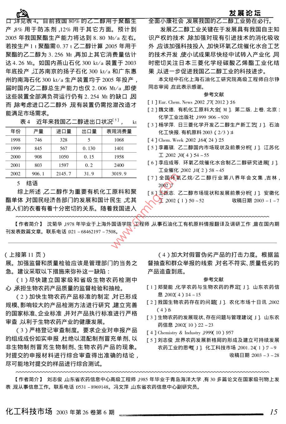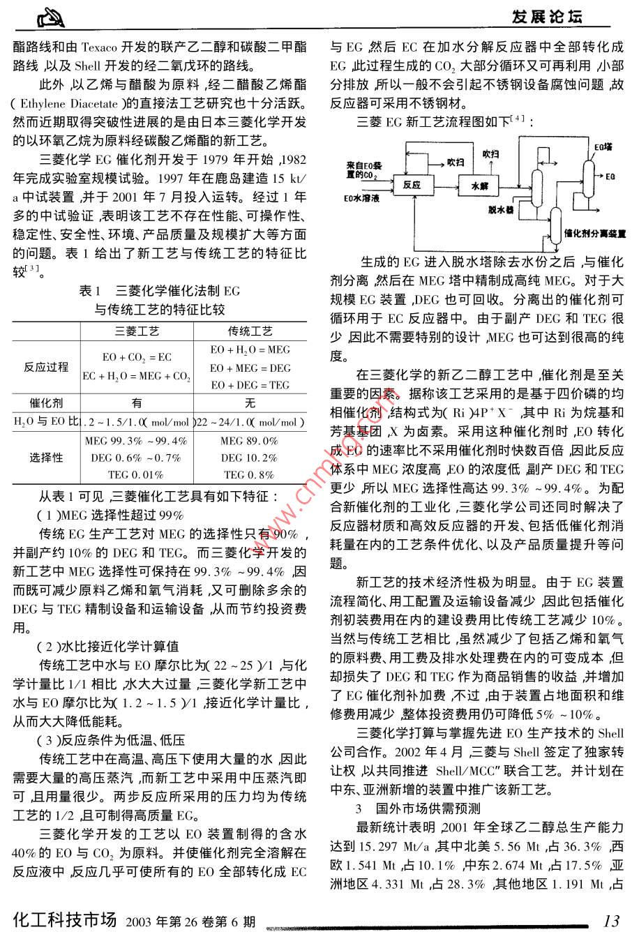 發(fā)展論壇國內(nèi)外乙二醇生產(chǎn)發(fā)展概況沈菊華(中石化上海石油化工研究院上海201208)摘要本文對國內(nèi)外乙二醇生產(chǎn)技術(shù)現(xiàn)狀、發(fā)展動(dòng)向、以及市場供需狀況作了概要敘述。關(guān)鍵詞乙二醇環(huán)氧乙烷水合技術(shù)進(jìn)展市場中圖分類號(hào)TQ223.162文獻(xiàn)標(biāo)識(shí)碼A文章編號(hào)1009-4725(2003)06-0012-04 Production Technology and Development Trend of Ethylene Glycol Shen Juhua Shanghai Research Institute of Petrochemical Technology, SINOPEC, Shanghai 201208 Abstract The current production technology of ethylene glycol ,as well as its development trend and supply/demand situation at home and abroad were briefly introduced. Keywords ethylene glycol hydration of ethylene oxide technology advance market1概述業(yè)生產(chǎn)方法的主要缺點(diǎn)。工業(yè)上通常采用3~6效乙二醇EG)是最簡單和最重要的脂肪族二元蒸發(fā)之后再進(jìn)入精餾系統(tǒng)在乙二醇塔塔頂?shù)玫郊兇家彩侵匾袡C(jī)化工原料。主要用途是生產(chǎn)聚酯產(chǎn)品。塔釜為副產(chǎn)的二乙二醇、三乙二醇以及高分單體和汽車抗凍劑前者用于制造纖維薄膜和聚對子量的聚乙二醇送入后續(xù)各塔逐個(gè)回收處理2苯二甲酸乙醇酯PET)樹脂其中用于聚酯纖維的2.2技術(shù)發(fā)展動(dòng)向乙二醇消費(fèi)量約占全球乙二醇產(chǎn)量的54%。其他用現(xiàn)行乙二醇生產(chǎn)采用環(huán)氧乙烷水合路線其水途則包括解凍液、表面涂層、照像顯影液、水力制動(dòng)的用量超過理論值20倍而且約有9%生成二甘醇,用液體以及油墨等行業(yè)。高純乙二醇可用作過硼酸1%生成三甘醇和更高分子量的聚乙二醇,從而降低銨的溶劑和介質(zhì)乙二醇還可用于生產(chǎn)特種溶劑乙了單乙二醇選擇性。因而降低水比的催化工藝已成二醇醚美國是乙二醇的主要生產(chǎn)和消費(fèi)國家,為乙二醇新工藝的開發(fā)焦點(diǎn)。另外基于乙烯路線經(jīng)2001年消費(fèi)乙二醇2.598Mt其中抗凍劑占28.0%,環(huán)氧乙烷的乙二醇生產(chǎn),由于石油資源的短缺和天PET占55.1%其他產(chǎn)品占16.9%然氣資源相對豐富因而開發(fā)以合成氣為基礎(chǔ)的各2001年全球乙二醇產(chǎn)量和消費(fèi)量均為12.514種新乙二醇生產(chǎn)工藝也十分引人關(guān)注?,F(xiàn)將近年來Mt預(yù)計(jì)2001年~2006年和2006年~2011全球國外有關(guān)乙二醇新工藝開發(fā)的動(dòng)向整理如下。乙二醇需求年均增長率分別為5.2%和3.8%(1)基于合成氣工藝2.生產(chǎn)技術(shù)現(xiàn)狀和發(fā)展動(dòng)向其中主要是甲醛和甲醇為原料的 DuPont甲醛羰2.1生產(chǎn)技術(shù)現(xiàn)狀化法以一氧化碳和氫氣為原料的UCC直接合成法,1859年 Wurtz首次將乙二醇二乙酸酯與氫氧化以一氧化碳和低碳醇為原料的日本宇部和UCC共同鉀作用制得乙二醇。次年又由環(huán)氧乙烷直接水合制開發(fā)的氧化偶聯(lián)法,以甲醇和甲醛為原料的由 Redox得。至今該法仍是世界上生產(chǎn)乙二醇的唯一方法。和 Celanese共同開發(fā)的Rdox法以及甲醛縮合法水合法通常是將環(huán)氧乙烷與水以1:10(m)混合然等。后與離開水解反應(yīng)器的乙二醇和水的化合物換熱,(2)環(huán)氧乙烷催化水合工藝預(yù)熱到120~160℃后進(jìn)入水解反應(yīng)器,在190~其中主要是由UCC開發(fā)的以接于離子交換樹脂200℃水解,停留時(shí)間約30min,操作壓力約2.23的負(fù)離子催化劑如鉬酸鹽、鎢酸鹽、釩酸鹽)和三苯MPa過程為放熱反應(yīng)在反應(yīng)30min后乙二醇水基膦絡(luò)合物為催化劑的水合工 Shell藝開發(fā)的以季溶液在與進(jìn)料換熱后離開水解反應(yīng)器經(jīng)降溫和降銨型酸式碳酸鹽陰離子交換樹脂為催化劑的水合工壓后進(jìn)入蒸發(fā)系統(tǒng)。由于反應(yīng)后的乙二醇水溶液中藝。乙二醇的濃度較低因此為了提純出產(chǎn)品需蒸發(fā)除(3)通過中間體合成乙二醇工藝去大量的水分過程能耗較大這也是現(xiàn)行乙二醇工其中主要是由日本三菱化學(xué)開發(fā)的經(jīng)碳酸乙烯122003年第26卷第6期化工科技市場發(fā)展論壇酯路線和由 Texaco開發(fā)的聯(lián)產(chǎn)乙二醇和碳酸二甲酯與EG然后EC在加水分解反應(yīng)器中全部轉(zhuǎn)化成路線以及 Shell開發(fā)的經(jīng)二氧戊環(huán)的路線。EG此過程生成的CO2大部分循環(huán)又可再利用小部此外以乙烯與醋酸為原料經(jīng)二醋酸乙烯酯分排放所以一般不會(huì)引起不銹鋼設(shè)備腐蝕問題故( Ethylene Diacetate)的直接法工藝研究也十分活躍反應(yīng)器可采用不銹鋼材然而近期取得突破性進(jìn)展的是由日本三菱化學(xué)開發(fā)三菱EG新工藝流程圖如下41:的以環(huán)氧乙烷為原料經(jīng)碳酸乙烯酯的新工藝。E塔a中試裝置并于2001年7月投入運(yùn)轉(zhuǎn)。經(jīng)過1年E水溶液掃吹掃三菱化學(xué)EG催化劑開發(fā)于1979年開始,1982來自E0裝口年完成實(shí)驗(yàn)室規(guī)模試驗(yàn)。1997年在鹿島建造15kt/的02→Ea水解多的中試驗(yàn)證,表明該工藝不存在性能、可操作性、脫水穩(wěn)定性、安全性、環(huán)境、產(chǎn)品質(zhì)量及規(guī)模擴(kuò)大等方面化劑分離裝置的問題。表1給出了新工藝與傳統(tǒng)工藝的特征比生成的EG進(jìn)入脫水塔除去水份之后與催化較3。劑分離然后在MEG塔中精制成高純MEG。對于大表1三菱化學(xué)催
