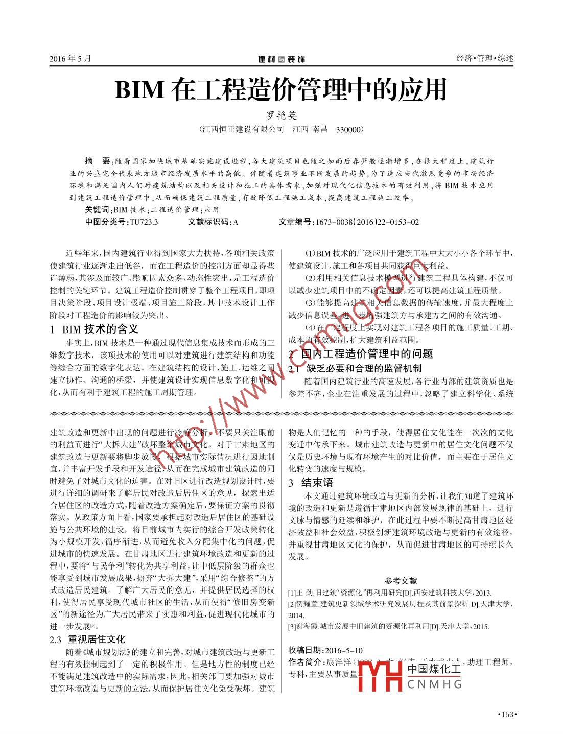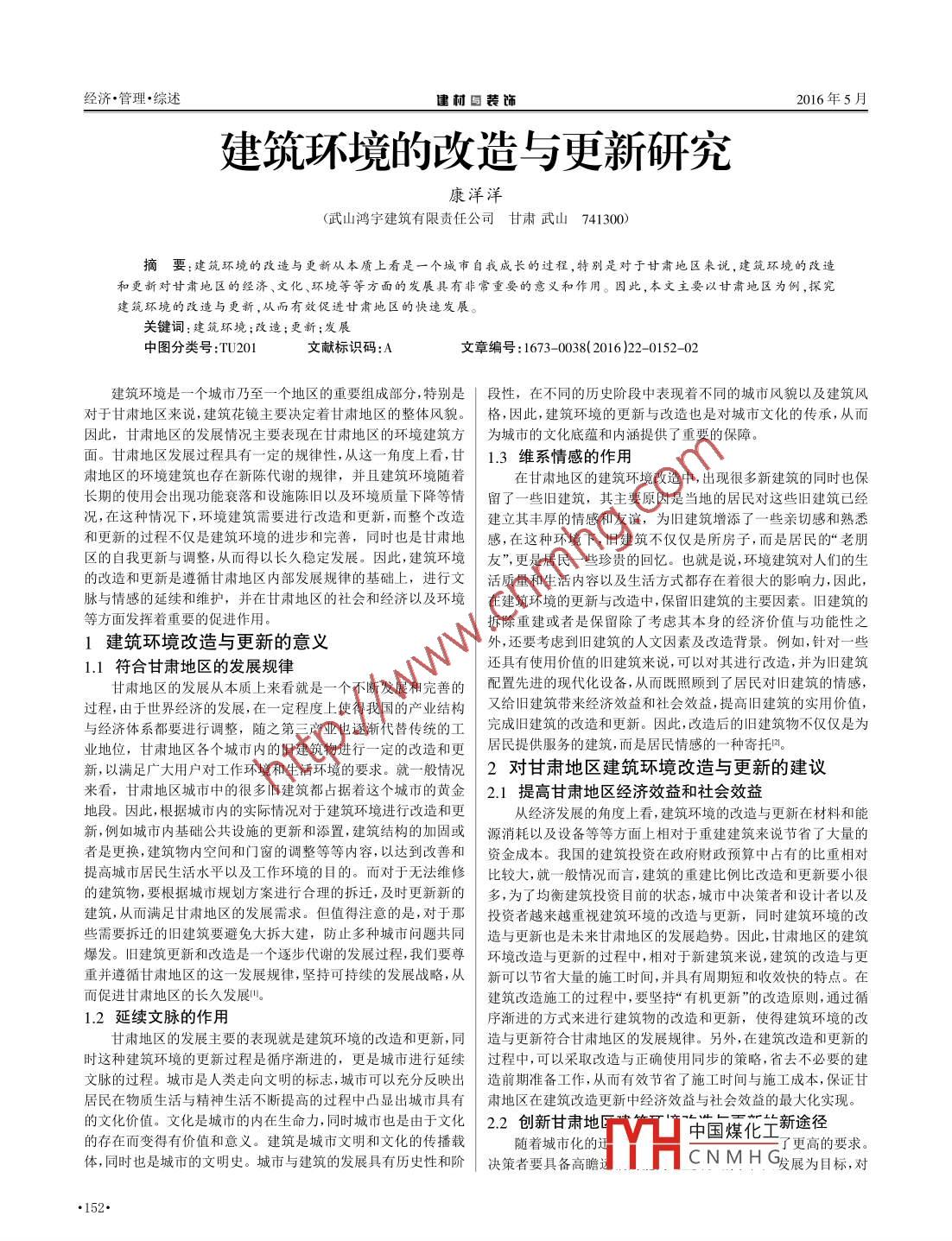 經(jīng)濟(jì)→管理·綜述建前裝飾2016年5月建筑環(huán)境的改造與更新研究康洋洋(武山鴻宇建筑有限責(zé)任公司甘肅武山741300摘要:建筑環(huán)境的改造與更新從本質(zhì)上看是一個(gè)城市自我成長(zhǎng)的過程,特別是對(duì)于甘肅地區(qū)來說,建筑環(huán)境的改造和更新對(duì)甘肅地區(qū)的經(jīng)濟(jì)、文化、環(huán)境等等方面的發(fā)展具有非常重要的意義和作用。因此,本文主要以甘肅地區(qū)為例,探究建筑環(huán)境的改造與更新,從而有效促進(jìn)甘肅地區(qū)的快速發(fā)展。關(guān)鍵詞:建筑環(huán)境;改造;更新;發(fā)展中圖分類號(hào):TU201文獻(xiàn)標(biāo)識(shí)碼:A文章編號(hào):1673-0038(2016)220152-02建筑環(huán)境是一個(gè)城市乃至一個(gè)地區(qū)的重要組成部分,特別是丨段性,在不同的歷史階段中表現(xiàn)著不同的城市風(fēng)貌以及建筑風(fēng)對(duì)于甘肅地區(qū)來說,建筑花鏡主要決定著甘肅地區(qū)的整體風(fēng)貌。格,因此,建筑環(huán)境的更新與改造也是對(duì)城市文化的傳承,從而因此,甘肅地區(qū)的發(fā)展情況主要表現(xiàn)在甘肅地區(qū)的環(huán)境建筑方為城市的文化底蘊(yùn)和內(nèi)涵提供了重要的保障。面。甘肅地區(qū)發(fā)展過程具有一定的規(guī)律性,從這一角度上看,甘1.3維系情感的作用肅地區(qū)的環(huán)境建筑也存在新陳代謝的規(guī)律,并且建筑環(huán)境隨著在甘肅地區(qū)的建筑環(huán)境改造中,出現(xiàn)很多新建筑的同時(shí)也保長(zhǎng)期的使用會(huì)出現(xiàn)功能衰落和設(shè)施陳舊以及環(huán)境質(zhì)量下降等情留了一些舊建筑,其主要原因是當(dāng)?shù)氐木用駥?duì)這些舊建筑已經(jīng)況,在這種情況下,環(huán)境建筑需要進(jìn)行改造和更新,而整個(gè)改造建立其豐厚的情感和友誼,為舊建筑增添了一些親切感和熟悉和更新的過程不僅是建筑環(huán)境的進(jìn)步和完善,同時(shí)也是甘肅地感,在這種環(huán)境下,舊建筑不僅僅是所房子,而是居民的“老朋區(qū)的自我更新與調(diào)整,從而得以長(zhǎng)久穩(wěn)定發(fā)展。因此,建筑環(huán)境友”,更是居民一些珍貴的回憶。也就是說,環(huán)境建筑對(duì)人們的生的改造和更新是遵循甘肅地區(qū)內(nèi)部發(fā)展規(guī)律的基礎(chǔ)上,進(jìn)行文活質(zhì)量和生活內(nèi)容以及生活方式都存在著很大的影響力,因此脈與情感的延續(xù)和維護(hù),并在甘肅地區(qū)的社會(huì)和經(jīng)濟(jì)以及環(huán)境在建筑環(huán)境的更新與改造中,保留舊建筑的主要因素。舊建筑的等方面發(fā)揮著重要的促進(jìn)作用。拆除重建或者是保留除了考慮其本身的經(jīng)濟(jì)價(jià)值與功能性之1建筑環(huán)境改造與更新的意義外,還要考慮到舊建筑的人文因素及改造背景。例如,針對(duì)一些1符合甘肅地區(qū)的發(fā)展規(guī)律還具有使用價(jià)值的舊建筑來說,可以對(duì)其進(jìn)行改造,并為舊建筑甘肅地區(qū)的發(fā)展從本質(zhì)上來看就是一個(gè)不斷發(fā)展和完善的配置先進(jìn)的現(xiàn)代化設(shè)備,從而既照顧到了居民對(duì)舊建筑的情感,過程由于世界經(jīng)濟(jì)的發(fā)展,在一定程度上使得我國(guó)的產(chǎn)業(yè)結(jié)構(gòu)又給舊建筑帶來經(jīng)濟(jì)效益和社會(huì)效益,提高舊建筑的實(shí)用價(jià)值與經(jīng)濟(jì)體系都要進(jìn)行調(diào)整,隨之第三產(chǎn)業(yè)也逐漸代替?zhèn)鹘y(tǒng)的工完成舊建筑的改造和更新。因此,改造后的舊建筑物不僅僅是為業(yè)地位,甘肅地區(qū)各個(gè)城市內(nèi)的舊建筑物進(jìn)行一定的改造和更居民提供服務(wù)的建筑而是居民情感的一種寄托叫新,以滿足廣大用戶對(duì)工作環(huán)境和生活環(huán)境的要求。就一般情況2對(duì)甘肅地區(qū)建筑環(huán)境改造與更新的建議來看,甘肅地區(qū)城市中的很多舊建筑都占據(jù)著這個(gè)城市的黃金2提高甘肅地區(qū)經(jīng)濟(jì)效益和社會(huì)效益地段。因此,根據(jù)城市內(nèi)的實(shí)際情況對(duì)于建筑環(huán)境進(jìn)行改造和更齊發(fā)展的角度上看,建筑環(huán)境的改造與更新在材料和能新,例如城市內(nèi)基礎(chǔ)的更新和添置建筑結(jié)構(gòu)的加固或源消耗以及設(shè)備等等方面上相對(duì)于重建筑來說節(jié)省了大量的者是更換,建筑物內(nèi)空間和門窗的調(diào)整等等內(nèi)容,以達(dá)到改善和資金成本。我國(guó)的建筑投資在政府財(cái)政預(yù)算中占有的比重相對(duì)提高城市居民生活水平以及工作環(huán)境的目的。而對(duì)于無法維修比較大,就一般情況而言,建筑的重建比例比改造和更新要小很的建筑物,要根據(jù)城市規(guī)劃方案進(jìn)行合理的拆遷,及時(shí)更新新的多,為了均衡建筑投資目前的狀態(tài),城市中決策者和設(shè)計(jì)者以及建筑,從而滿足甘肅地區(qū)的發(fā)展需求。但值得注意的是,對(duì)于那投資者越來越重視建筑環(huán)境的改造與更新,同時(shí)建筑環(huán)境的改些需要拆遷的舊建筑要避免大拆大建,防止多種城市問題共同造與更新也是未來甘肅地區(qū)的發(fā)展趨勢(shì)。因此,甘肅地區(qū)的建筑爆發(fā)。舊建筑更新和改造是一個(gè)逐步代謝的發(fā)展過程,我們要尊環(huán)境改造與更新的過