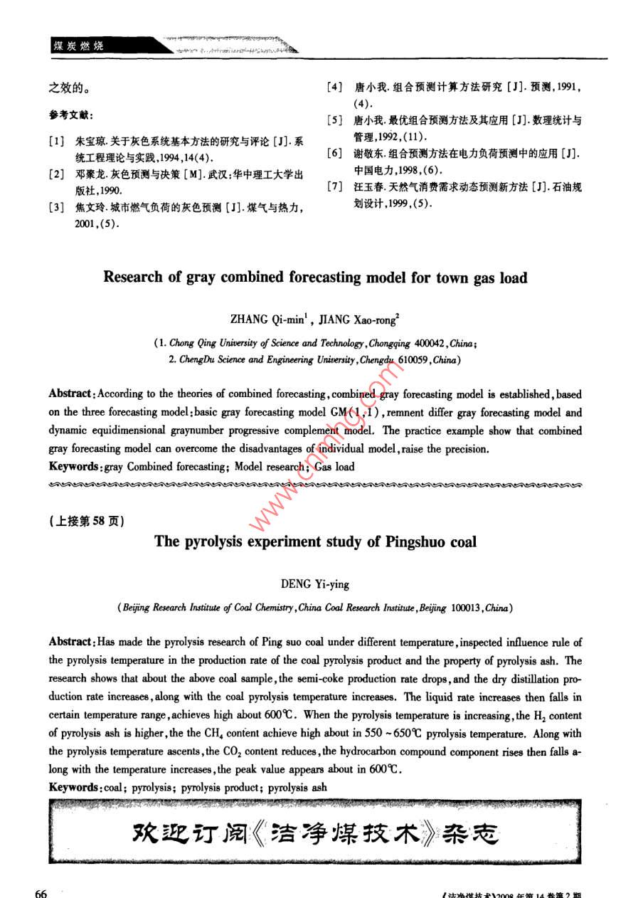 是化學(xué)鍵的斷裂。隨著溫度的升高煤中有機(jī)物逐漸分解,生成氣態(tài)的熱解氣、液態(tài)的煤焦油和固態(tài)的半焦。熱解是氣化和燃燒的前期階段,對(duì)煤的氣化和燃燒有著重要的影響,因此,研究煤的熱解反應(yīng)直是煤化學(xué)研究的熱點(diǎn)問(wèn)題之一。北京煤化工研究平朔煤的熱解試驗(yàn)研究分院工程所氣化室對(duì)平朔煤進(jìn)行了熱解試驗(yàn)研究,鄧煤炭科學(xué)研究總院北京煤化工研究分院北京取得了平朔煤的熱解基礎(chǔ)特性數(shù)據(jù)。1平朔煤的煤質(zhì)基本特性平朔煤的煤質(zhì)基礎(chǔ)特性數(shù)據(jù)見(jiàn)表1。表1平朔煤的煤質(zhì)基礎(chǔ)特性數(shù)據(jù)英元素分析%工業(yè)分析61.323.7610.710.670.475.4017.6830.064686從平朔煤煤質(zhì)的基礎(chǔ)特性數(shù)據(jù)可以看出,平朔煤具有低中灰分、中高揮發(fā)份、低固定碳、特低硫份,屬較年輕的煤種。由于煤較年輕,該煤熱解相對(duì)易進(jìn)行2熱解試驗(yàn)結(jié)果2.1試驗(yàn)流程平朔煤的熱解試驗(yàn)是在外熱式熱解臺(tái)架裝置上摘要:對(duì)平朔煤在不同溫度下進(jìn)行了熱解研究,進(jìn)行的試驗(yàn)流程如圖1所示。一定量的平朔煤裝考察了熱解溫度對(duì)煤熱解產(chǎn)物產(chǎn)率和熱解氣性質(zhì)的入特制不銹鋼熱解反應(yīng)管內(nèi),然后將其置入高溫管影響規(guī)律。研究表明對(duì)上述煤樣隨煤的熱解溫度式爐中,通過(guò)溫控器設(shè)定熱解溫度,煤熱解釋放出的升高,半焦產(chǎn)奉下降,干餾氣產(chǎn)率增加;液體率在一高溫?zé)峤鈿怏w經(jīng)不銹鋼管導(dǎo)出,依次進(jìn)入盤管式冷定溫度范圍內(nèi)先增后降,在600℃左右達(dá)到最高。卻器和氣液分離器。在冰水浴中熱解氣體得到冷熱解溫度升高,熱解氣中玨2的含量就越高,熱解氣卻。氣液兩相分離后的干餾氣經(jīng)濕式流量計(jì)計(jì)量中CH4的含量在熱解溫度550~650左右達(dá)到最后送入儲(chǔ)氣袋。將氣體樣品進(jìn)入氣相色譜儀進(jìn)行高。隨熱解溫度的升高,CO2的含量顯著降低,烴類組成分析化驗(yàn)。熱解過(guò)程結(jié)束以后,開啟熱解爐,取組分隨溫度升高是先升后降,峰值出現(xiàn)在600℃左出半焦,計(jì)量并取樣進(jìn)行分析化驗(yàn)。氣液分離器中右。殘留的液體物質(zhì)(包括冷卻水,油品及石蠟等)經(jīng)計(jì)關(guān)鍵詞:煤;熱解;熱解產(chǎn)物;熱解氣量并取樣進(jìn)行分析化驗(yàn)。2.2試驗(yàn)結(jié)果中圖分類號(hào):TQ530.2文獻(xiàn)標(biāo)識(shí)碼:A熱解試驗(yàn)溫度在300350、400、500、600、700文章編號(hào):10066772(2008)020056-03800、900℃的條件下進(jìn)行,各個(gè)溫度下的熱解產(chǎn)物結(jié)果見(jiàn)表2。不同熱解終溫時(shí)的熱解煤氣組成見(jiàn)表3煤的熱解是將煤置于隔絕空氣的密閉反應(yīng)器熱解煤氣組成隨溫度變化曲線圖為簡(jiǎn)化起見(jiàn)將內(nèi)在無(wú)催化作用的條件下持續(xù)加熱升溫,而發(fā)生一O2、N2這些與熱解無(wú)關(guān)的氣體省略將C3H3、C3H6系列化學(xué)和物理變化的過(guò)程。這一過(guò)程的基本行為C2H4、C2H合并為CH。收稿日期:2007-11-28作者簡(jiǎn)介:鄧一英(955-),女北京人,工程師現(xiàn)工作于煤s科學(xué)研究總院。煤炭燃燒全國(guó)中文核心期刊礦業(yè)類核心期刊 (CAHCD規(guī)范)執(zhí)行優(yōu)秀期刊ⅤENT圖1熱解實(shí)驗(yàn)裝置流程一高壓氣瓶;2—穩(wěn)壓減壓閥;3—?dú)怏w流量計(jì);4—熱解反應(yīng)管;5—加熱電爐;6控溫儀;7—冷凝冷卻器;8—冰浴;9—濕式氣體流量計(jì);10—儲(chǔ)氣袋;1l—?dú)庀嗌V儀高,650℃以上會(huì)發(fā)生二次分解隨著溫度的升高焦表2平朔煤不同溫度熱解產(chǎn)物結(jié)果油產(chǎn)率會(huì)逐漸下降,熱解水的產(chǎn)率也會(huì)隨著溫度的升高而下降。3000.00492.210.o060.870.111.2585922.8350078.395.67液體產(chǎn)率半焦產(chǎn)率0.08216.2476.17759煤氣產(chǎn)率17.1272.6615.174502.3平朔煤熱解基本特性分析圖2平朔煤不同溫度熱解產(chǎn)物2.3.1熱解溫度對(duì)煤熱解產(chǎn)物的影響→CO,·CH?!鶴溫度是影響煤熱解特性的最重要的外在因素之A-+H+CO。平朔煤不同熱解溫度熱解產(chǎn)物產(chǎn)率變化曲線和熱解氣組成變化曲線分別如圖2和圖3所示。從圖斷細(xì)爾2中曲線可以看出,隨熱解溫度升高,半焦產(chǎn)率下降熱解氣產(chǎn)率增加液體產(chǎn)率在700℃之前隨溫度020-406508501050升高而增加,在700℃之后,溫度升高,液體產(chǎn)率隨之下降。研究發(fā)現(xiàn)熱解過(guò)程中產(chǎn)生的液體主要是焦圖3平朔煤熱解煤氣組成隨溫度變化曲線油和熱解水,一般焦油會(huì)在600~700℃左右達(dá)到最表3平朔煤不同溫度熱解氣結(jié)果低位熱值1270.717.51810.833015.223.715217.219.82221.90.830.3731.721.625.81.224.63290.613.521.48026900530.30.50.34.321.5.16.4燃燒2.3.2熱解溫度對(duì)熱解氣組成的影響變化曲線均在600℃左右達(dá)到最高值,即600℃前隨熱解氣組成隨溫度變化也呈現(xiàn)出一定的規(guī)律溫度升高而增加,600℃后溫度升高而降低由圖4性。隨熱解溫度升高熱解氣組成中H2組分含量還可看到,烴類組分含碳越高熱解氣中含量越少,上升,CH4組分含量在550~60℃之間達(dá)到最高,這與烴類的熱穩(wěn)定性強(qiáng)弱和二次熱解直接相關(guān)CO組分含量略有下降烴類組分CnHn隨溫度升高是先升后降,