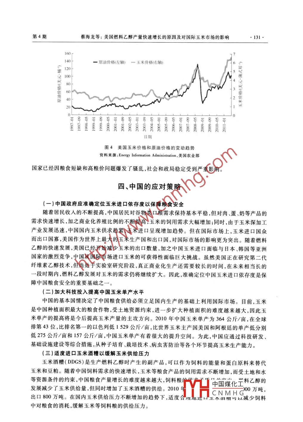 第30卷第4期中國農業(yè)大學學報(社會科學版)2013年12月China Agricultural University Journal of Social Sciences EditionDec. 2013美國燃料乙醇產量快速增長的原因及對國際玉米市場的影響蔡海龍王秀清[摘要]2000年以來,隨著能源需求不斷增長和原油價格上漲,以及產業(yè)政策的大力扶持,美國燃料乙醇出現(xiàn)井噴式增長,目前產量約占全球燃料乙醇產量的一半以上。面對美國燃料乙醇產業(yè)的快速發(fā)展是政策驅動還是市場驅動的爭論,文章通過比較分析認為補貼政策是美國燃料乙醇發(fā)展的核心驅動力,而原油和玉米價格則是直接驅動力。作為全球最大的玉米生產國和貿易國,美國燃料乙醇的快速發(fā)展已成為影響全球玉米供求平衡、推高玉米市場價格的重要因素。在這樣的背景下,中國玉米進口量逐年增加,為此中國必須準確定位自己的玉米進口依存度,提高玉米生產能力,積極保障國內糧食安全。[關鑣詞]燃料乙醇;玉米;貿易;糧食安全進人21世紀以來,在政策、市場和環(huán)境保護等多種因素的推動下,美國燃料乙醇發(fā)展速度明顯加快,乙醇產量在過去十年中翻了三番。玉米是美國生產燃料乙醇的主要原料,2011年用于生產燃料乙醇的玉米消費量已達到1.3億噸,占當年美國玉米產量的40%,占世界玉米產量的15%,是全球玉米貿易量的1.4倍。作為全球最大的玉米生產國和出口國,美國燃料乙醇快速發(fā)展已成為影響全球玉米供求平衡、推高玉米市場價格的重要因素,對部分糧食凈進口國的糧食安全產生了進步威脅。近幾年,隨著中國玉米飼用需求和深加工需求的快速增長,中國國內玉米供求趨緊,逐步從玉米凈出口國轉變?yōu)閮暨M口國。但在全球燃料乙醇產量快速增長以及玉米價格持續(xù)上漲的背景下,從國際市場進口玉米的可獲得性將受到嚴峻挑戰(zhàn)。對此,中國需要及時研究并采取相應對策,以保障糧食安全。、美國燃料乙醇生產現(xiàn)狀及趨勢燃料乙醇產量呈現(xiàn)井噴式增長。進入21世紀后,隨著能源需求不斷增長和原油價格上漲,以及產業(yè)政策的大力扶持,美國燃料乙醇產量增長非常迅速。2000-2011年,燃料乙醇產量從16.3億加侖增加到139億加侖,增加了7.5倍,年均增長21.5%。2008—2010年美國燃料乙醇產量增長量分別占世界燃料乙醇增長量的59%、73%和76%,成為世界上最大的燃料乙醇生產國,產量約占全球燃料乙醇產量的一半以上。燃料乙醇九成以上用玉米為原料生產。目前,以纖維素等非糧原料生產第二代燃料乙醇在技術上尚不成熟,大規(guī)模生產在經濟上缺乏可行性,因此,玉米仍然是美國燃料乙醇最主要的生產原料。2011年,美國先進生物燃料(生物柴油和用非糧原料生產的燃料乙醇)產量約為10億加侖,僅占2011年美國生物燃料產量的77%。混合比例提高將擴大燃料乙醇的市場容量。目前,混合了燃料乙醇的汽油幾乎全部作為交通工具的燃料來消費。美國環(huán)境保護局允許所有車輛使用添加10%乙醇的汽油(E10);靈活燃料汽中國煤化工[收稿日期]2013-07-10[作者簡介]蔡海龍,中國農業(yè)大學經濟管理學院講師CNMHG王秀清,中國農業(yè)大學經濟管理學院教授,郵編:100083。128中國農業(yè)大學學報(社會科學版)2013年圣至室室至至至至登國到后需年份圖11980—2011年美國燃料乙醇產量資料來源: Renewable Fuel Association車(fex- fuel vehicles)可使用乙醇混合比例最高達85%的燃料(E85),但這種車輛所占比例非常小。2011年,美國成品汽油產量為1390億加侖,其中添加了乙醇的汽油產量為1227億加侖,占88%,已趨于飽和。10%的乙醇混合比例(E10)已成為燃料乙醇消費繼續(xù)增長的瓶頸,為了在2022年能夠實現(xiàn)360億加侖乙醇消費量的新能源法案目標,美國能源保護局(EPA)正在研究提高燃料乙醇在汽油中的混合比例。截至2011年1月,美國能源保護局已允許2001年及以后生產的汽車使用混合比例為15%的乙醇汽油(E15),這意味著目前62%的汽車可以使用E15汽油。未來隨著汽車發(fā)動機技術的改進和提高,燃料乙醇作為汽車燃料的比例將大幅提高。二、美國燃料乙醇產量快速增長的主要原因美國燃料乙醇產業(yè)的快速發(fā)展是政策驅動還是市場驅動,一直存在著分歧。政策驅動論者認為,政府的補貼政策是燃料乙醇發(fā)展的主要驅動力,離開了政府的補貼美國燃料乙醇產業(yè)難以為繼;而市場驅動論者認為,政府補貼只起到引導作用,能源價格走高是促進燃料乙醇發(fā)展的真正動力。其實二者在燃料乙醇產業(yè)的發(fā)展中都起到了重要作用,只是角色不同而已,政府補貼穩(wěn)定了燃料乙醇的生產預期,高能源價格則是燃料乙醇產量和產能快速擴張的直接拉動力。高額政府補貼是燃料乙醇發(fā)展的核心驅動力全方位、多層次的政策措施支持燃料乙醇發(fā)展。為了減少對化石燃料進口的依賴、提高農民收人和減少溫室氣體排放,美國聯(lián)邦政府通過一系列的法案和政策優(yōu)惠來支持和保護燃料乙醇生產山。主要包括:(1)強制混合政策,通過制定可再生能源標準(RFS)強制提高燃料乙醇產量;(2)稅收優(yōu)惠政策,與汽油混合的乙醇給予每加侖45美分的稅收返還(2008年農業(yè)法案把退稅標準由原來的51美分/加侖調低到45美分/加侖);(3)進口關稅政策,為了防止進口燃料乙醇對國內市場的沖擊,美國對進口燃料乙醇征收54美分/加侖的進口關稅;(4)其他政策,主要包括對小規(guī)模乙