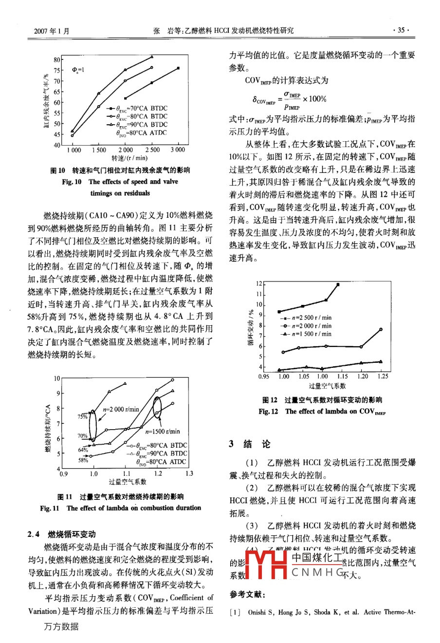 第25卷(2007)第1期內(nèi)燃機學(xué)報Transactions of CSICEVol.25(2007)No.1文章編號:1000-0909(2007)01-0030-0725005乙醇燃料HCCI發(fā)動機燃燒特性研究張巖,何邦全,謝輝,趙華(天津大學(xué)內(nèi)燃機燃燒學(xué)國家重點實驗室,天津300072)摘要:應(yīng)用調(diào)整進排氣門相位控制缸內(nèi)殘余廢氣率策略,在 Ricardo Hydra四沖程進氣道噴射單缸試驗機上實現(xiàn)了無水乙醇燃料的均質(zhì)壓燃,獲得了運行工況范圍,并分析研究了空燃比、轉(zhuǎn)速和氣門相位對乙醇燃料均質(zhì)壓燃的燃燒特性。結(jié)果表明:乙醇燃料的均質(zhì)壓燃的可運行范圍仍然受到爆震、換氣過程及失火的限制,但在高速及稀燃區(qū)域得到拓展;其著火時刻及燃燒持續(xù)期依賴于氣門定時、空燃比及轉(zhuǎn)速。關(guān)鍵詞:均質(zhì)壓燃;乙醇;燃燒;汽油機中圖分類號:TK411.29文獻標志碼:AThe Combustion Characteristics of an HCCI Engine Fuelled with EthanolZHANG Yan, HE Bang-quan, XIE Hui, ZHAO HuaState Key Laboratory of Engines, Tianjin University, Tianjin 300072, ChinAbstract: With the utilization of valve timing strategy in inlet and exhaust valve control, the Homogene-ous Charge Compression Ignition( HCCI)combustion was achieved by adjusting the amount of trapped residuals with the negative valve overlap in a Ricardo Hydra four-stroke port fuel injection engine fueled withhanol The effect of ethanol on HCCI combustion characteristics at different air-fuel ratios, enginespeeds and valve timings was investigated. The results indicate that HCCI ethanol combustion can be a-chieved by varying the inlet and exhaust valve timings. The operation range of an HCCI engine fuelled withethanol can be extended to the high speed and lean burn conditions. Meanwhile, ignition timing and com-bustion duration are dependent on valve timing, lambda and speedsKeywords: HCCI; Ethanol; Combustion; Gasoline engine問題引言從上世紀20年代開始,代用燃料的概念就被提均質(zhì)充量壓縮著火(HCC)燃燒模式是一種新型出,到70年代得到廣泛接受。由于石油資源的有的燃燒方式,有著不同于傳統(tǒng)汽油機及柴油機的燃燒限性并隨著人們的開采和利用而日益減少,如今代用過程。工作于HCCI燃燒模式的發(fā)動機(HCCI發(fā)動燃料(特別是可再生燃料)已受到國內(nèi)外內(nèi)燃機界的機)在進氣和壓縮行程中形成均質(zhì)混合氣,當活塞到關(guān)注。乙醇作為可再生含氧燃料,具有辛烷值高、抗爆達上止點附近時均質(zhì)混合氣被壓縮產(chǎn)生自燃著火。性好等特點。研究表明乙醇是實現(xiàn)HCCI燃燒的理想HCI燃然燒模式可大大提高汽油機部分負荷時的燃油燃料之一,但是基于內(nèi)部廢氣再循環(huán)策略下的乙醇經(jīng)濟性,同時在無催化器的條件下顯著降低發(fā)動機的HCl發(fā)動機的燃燒研究開展得還比較少。為此,本文NO,排放2。HCI發(fā)動機集成了傳統(tǒng)火花點燃式在 Ricardo Hydra四沖程進氣道噴射發(fā)動機上通過內(nèi)發(fā)動機及壓燃式發(fā)動機的優(yōu)點,被認為是新一代內(nèi)燃部廢氣再循環(huán)的方法研究空燃比、轉(zhuǎn)速和氣門定時對機的代表。乙醇恬沽丑的響,進一步了解乙醇燃雖然HCCI發(fā)動機有著誘人的前景但HCl發(fā)動料對中國煤化工燃燒特性的影響,更機還存在著火時刻控制困難、運行工況范圍小等好CNMHG收稿日期:2006-03-17;修回日期:2006-07-12基金項目:國家重點基礎(chǔ)研究發(fā)展規(guī)劃資助項目(2001CB209204);國家自然科學(xué)基金資助項目(50476064)。作者簡介:張巖博土研究生,E-mal: zhangyan@ tju. edu007年1月張巖等:乙醇燃料HCCI發(fā)動機燃燒特性研究試驗裝置和試驗過程空燃比的精確控制。在每個試驗點,用奇石樂6125B壓電晶體傳感器配合5011B電荷放大器連續(xù)采集100試驗用發(fā)動機為 Ricardo Hydra四沖程進氣道噴個循環(huán)的缸內(nèi)壓力,并求出其平均值,用于分析。同射單缸試驗機,其具體參數(shù)及試驗條件見表1。時,用精度為±1%的渦街流量計測量進氣流量。為了消除冷卻水和潤滑油溫度的差異對敏感的表1發(fā)動機參數(shù)及試驗條件HCCI燃燒造成的影響,試驗過程中冷卻水溫和油溫被Tab. 1 Engine specifications and test conditions嚴格控制在(80±1)℃和(55±1)℃。參數(shù)的值試驗時節(jié)氣門始終保持全開,這大大減小了一直缸徑/mm抑制傳統(tǒng)汽油機熱效率的泵吸損失。開始試驗時,發(fā)行程/mm動機首先由交流電力測功機倒拖至一穩(wěn)定轉(zhuǎn)速,并以非量t/mL火花點燃模式使發(fā)動機著火,用于在氣缸內(nèi)產(chǎn)生足夠壓縮比量的高溫殘余廢氣。幾個循環(huán)后,關(guān)閉火花塞點火系氣門數(shù)統(tǒng),發(fā)動機即可在HCCⅠ模式下穩(wěn)定運行。通過調(diào)節(jié)轉(zhuǎn)速/(r/min)<6500測功機和噴油脈寬,HCCI發(fā)動機就可在不同的轉(zhuǎn)速及吸氣方式自然吸氣空燃比下運行。為了得到更好的霧化效果,在氣道上進氣溫度℃安裝了 Delphi公司生產(chǎn)的4噴孔噴油器。使用的燃料為無水乙醇,其純度在99%以上。為了在發(fā)動機上能夠?qū)崿F(xiàn)HCI燃燒原機的凸2試驗結(jié)果及分析輪軸被替換成重新設(shè)計的小升程和短持續(xù)期凸輪軸,氣門升程曲線及主要參數(shù)見圖1和表2。凸輪軸直接2.1乙醇燃料的HCCI運行工況范圍驅(qū)動氣門運動。通過手動調(diào)節(jié)正時齒輪帶與凸輪軸之對于傳統(tǒng)的汽油和柴油燃料,由于均質(zhì)壓燃多點間的相對位置,達到所需的