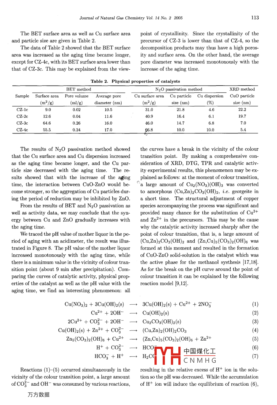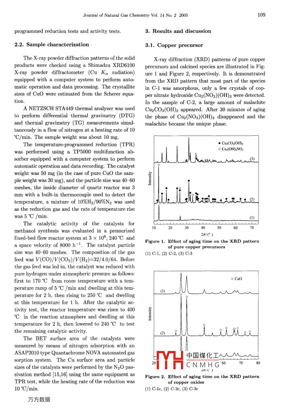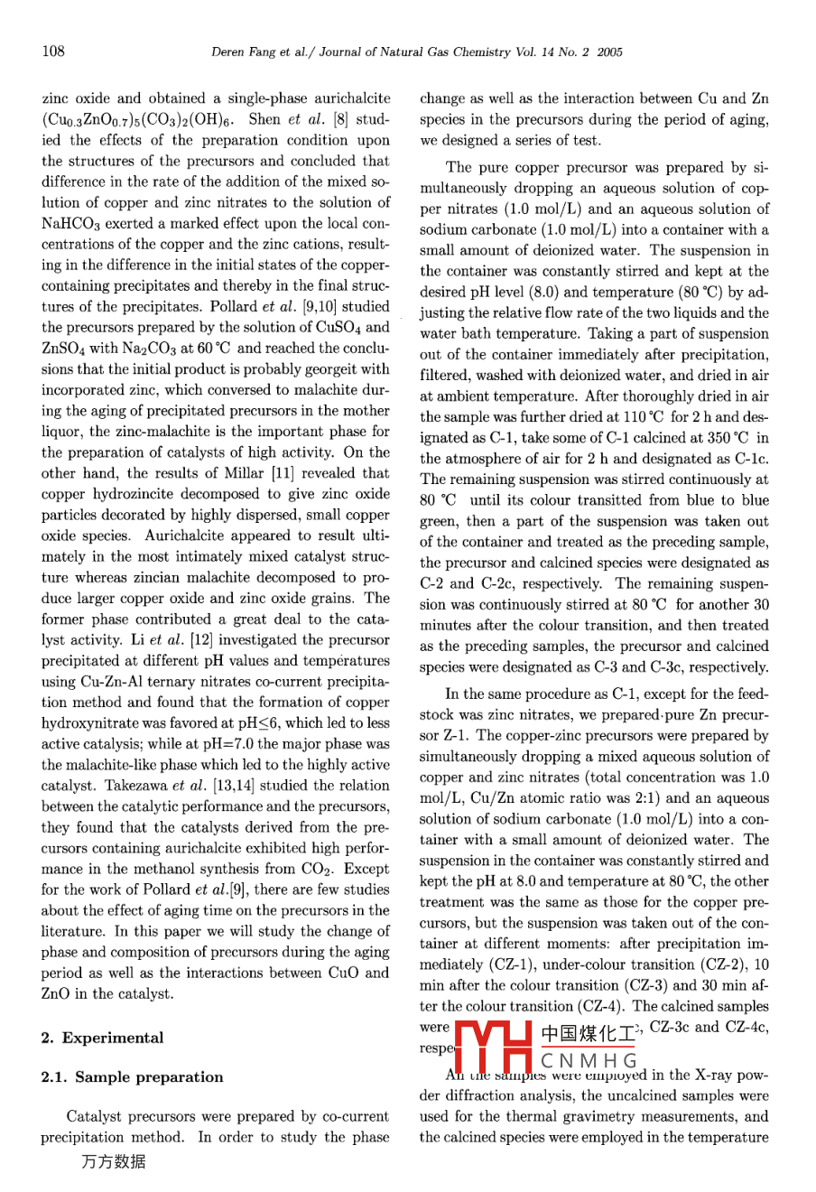 Journal of Natural Gas Chemistry 14(2005)107- 114SCIENCE PRESSInfluence of Aging Time on the Properties of Precursorsof CuO/ZnO Catalysts for Methanol SynthesisDeren Fang-;2,Zhongmin Liul*,Shuanghe Meng',Ligang Wang',Lei Xu',Hua Wang'1. Dalian Institute of Chermical Physics, Chinese Academy of Sciences, Dalian 116023, China;2. Institute of Applied Catalysis, Yantai University, Yantai 264005, China[Manuscript reeived May 08, 2005; revised May 16, 2005]Abstract: The aging process of pure copper precursors and copper. zinc binary precursors were studiedby XRD, TG-DTG and TPR techniques. The catalytic activity and stability of CuO/ZnO were testedusing fixed-bed flow reactor, and the physical properties of the catalysts and Cu species were charac-terized with N2 adsorption and N2O passivation method, respectively. For the Cu-Zn binary systemprepared at the precipitating condition of pH=8.0 and temperature= =80 °C, the initial phase was a mixtureof copper nitrate hydroxide Cu2(NO3)(OH)3, georgeite and bhydrozincite Zns(CO3)2(OH)6. By increas-ing the duration of its aging time, the phase of Cu2(NO3)(OH)2 first transited to georgeite, and theninterdiffused into Zns(CO3)2(OH)6 and resulted in two new phases: rosasite (Cu,Zn)2CO3(OH)2 and au-richalcite (Zn,Cu)s(CO3)2(OH)6. The former phase was much easier to be formed than the latter one,while the latter phase was more responsible for the activity of methanol synthesis than the former one. Itis found that the composition and structure of the precursors altered obviously alfter the colour transitionpoint. The experimental results showed that methanol synthesis is a structure-sensitive catalytic reaction.Key words: Cu/Zn oxide, methanol synthesis, precursor, aging time, colour transition, structure-sensitivereaction1. IntroductionThe phase and composition of the precursor caused asignificant effect on the performance of the catalyst,The copper/zinc/ aluminum oxides catalysts werewhile the preparation method and condition was thewidely used in many industrial process includ-vital factor to the precursors. Many researchers haveing the low-pressure methanol synthesis, CO low-investigated the precursors based on different viewstemperature shift reaction and dehydrogenation ofand so far achieved controversial conclusions [4- 14].alcohols, etc [1], and moreover, it will be the ma-Okamoto et al. [4] have studied the precursorjor catalyst in the fuel cell for the production of hy-and calcined CuO-ZnO catalysts prepared by copre-drogen from oxidative steam reforming of methanolcipitation method using X-ray photoelectron spec-[2,3]. The commercial catalyst was prepared by co-troscopy and X-ray diffraction analysis, they foundprecipitation technique using the nitrate salts of cop-中國(guó)煤化工nds in the precursorsper, zinc and aluminum reacting with basic material,forfeedstock. Whilesuch as sodium carbonate to form the precursor ofHimeMYHC N M H Gi the coprecipitatedthis catalyst- mixture of CuZnAl hydroxycarbonates,hydroxycarbonate precursor of the CuO-ZnO cat-then calcining the precursor to give CuZnAl-oxides.alyst based on at. 30% copper and at. 70%* Corresponding author. Tel: +86-411-84685510; Fax: +86-411-84379289. E mail address: zml@dicp.ac.cn.108Deren Fang et al./ Journal of Natural Gas Chemistry Vol. 14 No.2 2005zine oxide and obtained a single-pbase aurichalitechange as well as the interaction between Cu and Zn(Cuo. zn0:.7)(CO3)2(OH)6. Shenet al. [8] stud-species in the precursors during the period of aging,ied the efects of the preparation condition uponwe designed a series of test.the structures of the precursors and concluded thatThe pure copper precursor was prepared by si-difference in the rate of the addition of the mixed 80-multanously dropping an aqueous solution of cop-lution of copper and zinc nitrates to the solution ofper nitrates (1.0 mol/L) and an aqueous solution ofNaHCO3 exerted a marked effect upon the local con-sodium carbonate (1.0 mol/L) into a container with acentrations of the copper and the zinc cations, result-small amount of deionized water. The suspension ining in the difference in the initial states of the copper-the container was constantly stirred and kept at thecontaining precipitates and thereby in the final struc-desired pH level (8.0) and temperature (80°C) by ad-tures of the precipitates. Pollard et al. [9,10] studiedjusting the relative flow rate of the two liquids and thethe precursors prepared by the solution of CuSO4 andwater bath temperature. Taking a part of suspensionZnSO4 with Na2CO3 at 60 °C and reached the conclu-out of the container immediately after precipitation,sions that the initial product is probably georgeit withfiltered, washed with deionized water, and dried in airincorporated zinc, which conversed to malachite dur-at ambient temperature. After thoroughly dried in airing the aging of precipitated precursors in the motherthe sample was further dried at 110C for 2 h and des-liquor, the zinc-malachite is the inportant phase forignated as C-1, take some of C-1 calcined at 350°C inthe preparation of catalysts of high activity. On thethe atmosphere of air for 2 h and designated as C-1c.other hand, the results of Millar [11] revealed thatThe remaining suspension was stirred continuously atcopper hydrozincite decomposed to give zinc oxide80 °C until its colour transitted from blue to blueparticles decorated by highly dispersed, small coppergreen, then a part of the suspension was taken outoxide species. Aurichalcite appeared to result ulti-of the container and treated as the preceding sample,mately in the most intimately mixed catalyst struc-the precursor and calcined specices were designated asture whereas zincian malachite decomposed to pro-C-2 and C-2c, respectively. The remaining suspen-duce larger copper oxide and zinc oxide grains. Thesion was continuously strred at 80°C for another 30former phase contributed a great deal to the cata-minutes after the colour transition, and then treate
