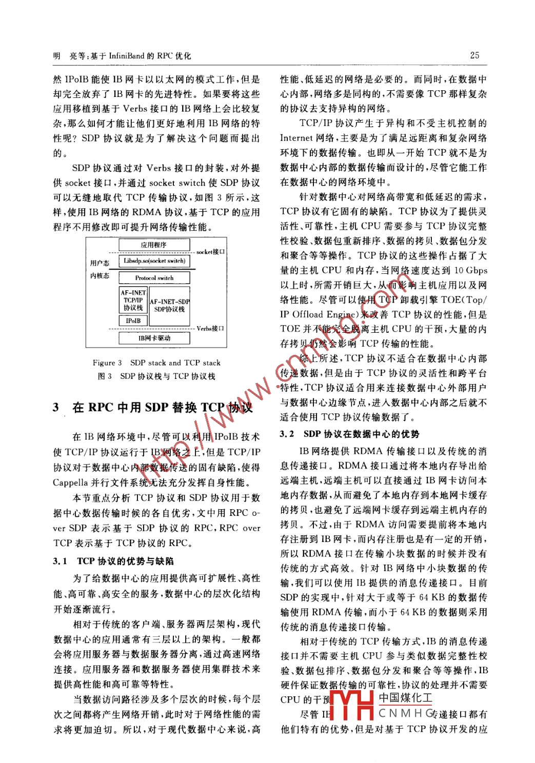 CN 43-1258/TP計算機工程與科學第35卷第7期2013年7月ISSN 1007- 130XComputer Engineering & ScienceVol. 35, No.7,Jul. 2013文章編號:1007-130X(2013)07-023-08基于InfiniBand的RPC優(yōu)化明亮,馮 丹,王芳,陳碧硯(華中科技大學計算機學院.湖北武漢430074)摘要:隨著無限帶寬(IB)網(wǎng)絡技術(shù)的發(fā)展,IB 網(wǎng)絡以其高性能、低延遲以及低功耗和低成本的優(yōu)勢逐漸在數(shù)據(jù)中心占據(jù)重要的地位。而作為重要的網(wǎng)絡通信模型,遠程過程調(diào)用(RPC)協(xié)議如何利用IB網(wǎng)絡的遠程內(nèi)存直接訪問RDMA特性是一個重要議題。NFSover RDMA解決了內(nèi)核態(tài)下網(wǎng)絡文件系統(tǒng)(NFS)利用RDMA協(xié)議傳輸數(shù)據(jù)的問題。然而,面向跨越內(nèi)核態(tài)和用戶態(tài)的RPC應用,目前仍然沒有基于IB的RPC相關(guān)優(yōu)化。通過將IB協(xié)議族中的套接字直接協(xié)議(SDP)集成到現(xiàn)有RPC協(xié)議中,使內(nèi)核態(tài)以及用戶態(tài)RPC程序都能使用IB網(wǎng)絡的RDMA協(xié)議,從而提升網(wǎng)絡傳輸性能。經(jīng)測試,此方案與傳統(tǒng)的基于TCP/IP協(xié)議的RPC實現(xiàn)相比,用戶態(tài)RPC與內(nèi)核態(tài)RPC可分別獲得10%和35%的性能提升。關(guān)鍵詞:無限帶寬技術(shù);遠程過程調(diào)用;套接字直接協(xié)議;分布式文件系統(tǒng)中圖分類號:TP336文獻標志碼:Adoi: 10. 3969/j. issn.1007-130X. 2013. 07.005Optimization of RPC based on InfiniBandMING Liang, FENG Dan, WANG Fang,CHEN Bi-yan(School of Computer Science , Huazhong University of Science and Technology, Wuhan 430074 ,China)Abstract: Along with the development of InfiniBand (IB) network, IB is becoming an importantcomponent in the data center due to its characteristics such as high performance, low latency, low powerconsumption and low price. As an important communication protocol, it is a significant problem thathow the Remote Procedure Call ( RPC) utilizes the RDMA feature of IB. NFS over RDMA solves theproblem that the NFS transfers data by RDMA protocol in the kernel-space. However, there is no RPCoptimization on InifiniBand in the user space communication and the communication between user-spaceand kernel-space. In this paper, we integrate the Socket Direct Protocol into the RPC so as to achievethe RDMA feature of IB in both user-space and kernel-space. Through the experiments, we can obtain10% and 35 % peak performance improvement in user- space and kernel-space communication respectively.Key words: InfiniBand ; remote procedure call; socket direct protocol; distributed file system成本等需求也受到廣泛關(guān)注。無限帶寬技術(shù)IB1引言(InfiniBand)]作為兼容總線與網(wǎng)絡的互連技術(shù),逐步在存儲網(wǎng)絡中發(fā)揮重要作用。隨著航天事業(yè)、人類基因工程、地震預測、資源本文的主要研究內(nèi)容包括兩個方面:(1)遠程勘查、社交網(wǎng)絡和搜索引擎等應用的發(fā)展,以及當過程調(diào)用RPC( Remote Procedure Call);(2) In-今云計算時代的來臨,人們對于高性能、低成本的finiBand網(wǎng)絡中的套接字直接協(xié)議SDP (Socket數(shù)據(jù)中心的需求也愈發(fā)迫切。作為數(shù)據(jù)中心最重Direct Protocol)。RPC協(xié)議出現(xiàn)于20世紀80年要的基礎(chǔ)設(shè)施,存儲系統(tǒng)的高性能、高可靠以及低代,Sun公司的SunRPC最終成為事實上的標中國煤化工基金項目:國家973計劃資助項目(201 1CB302301)通訊地址:430074湖北省武漢市華中科技大學武漢光電國家實驗室F301MHCNMHGAddress : W uhan National Laboratory for Optoelctronics, Huazhong University of Science and Technology●W uhan 430074. HubeiP.R. China24Computer Engineering & Science計算機工程 與科學2013,35(7)準[2]。目前SunRPC已經(jīng)發(fā)展到第二個版本,其過直接調(diào)用用戶態(tài)的IB Verbs接口調(diào)用網(wǎng)絡服包括內(nèi)核態(tài)的SunRPC模塊和用戶態(tài)的SunRPC務,從而可以繞過內(nèi)核,進而實現(xiàn)用戶態(tài)的RDMA,程序庫,分別支持內(nèi)核態(tài)程序之間的通信,以及用訪問。戶態(tài)程序之間的通信。用戶態(tài)與內(nèi)核態(tài)的SunR-IP Based Socket basedBlock Storage| File System應用程序APTMPAPP Access| AccessAccessPC之間也能通過TCP/IP協(xié)議互通。DAPLRPC協(xié)議因其能夠屏蔽底層網(wǎng)絡的復雜性以及對外提供友好的接口,而廣泛應用在分布式文件用戶態(tài)APILOpenFabric Ueer Level VehelAPTSDP 1iB系統(tǒng)中,包括NFS ( pNFS)[3]、Lustre[1]、Panasas用戶態(tài)內(nèi)核態(tài)File System[5] ,Google File System[60] 等。上層協(xié)議B SDP| SRP iSEl2相關(guān)技術(shù)OpenFsbrie Kemel Lavel Verbl/APIIniniBand驅(qū)動2.1 IB 技術(shù)InfiniBand主機 道適配器(HCA)IB是一個獨立于平臺的網(wǎng)絡互連技術(shù),相對Figure 1 IB protocol stack于其他的網(wǎng)絡互連技術(shù)(如以太網(wǎng)),具有以下特圖1 IB 協(xié)議棧點:(1)它將數(shù)據(jù)傳輸、協(xié)議處理、流量控制等工作IB內(nèi)核提供的IPoIB(IPoverIB)協(xié)議可以實直接交由IB網(wǎng)卡完成,而不需要主機CPU的干現(xiàn)IB與以太網(wǎng)的兼容;SDP協(xié)議能夠提供Socket預。應用程序可以通過IB的接口直接調(diào)用IB驅(qū)接口供應用程序調(diào)用;SRP(SCSIRDMAProto-動,從而可以繞過操作系統(tǒng),以此提高系統(tǒng)性能。col)以及iSER (iSCSI Extend RDMA)均是通過(2)IB網(wǎng)絡支持RDMA ( Remote Direct MemoryRDMA協(xié)議傳輸塊存儲命令(SCSI命令);而NF-Access)IT技術(shù),使得遠程的節(jié)點之間能夠直接進SoRDMA(NFS over RDMA)能