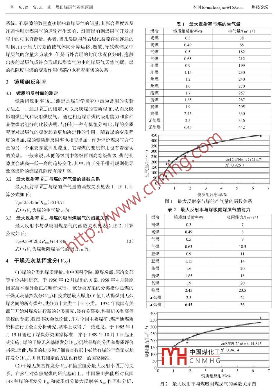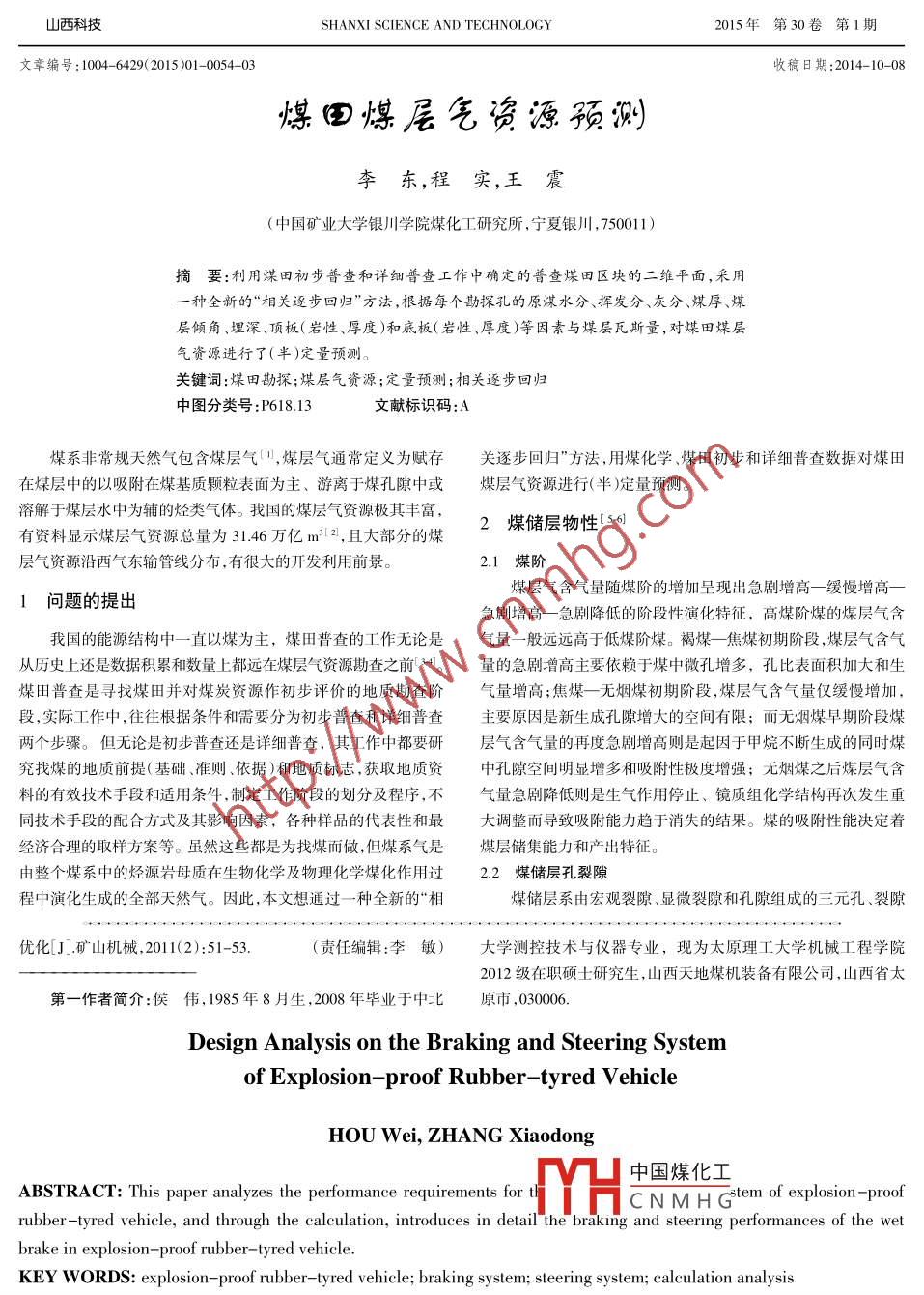山西科技SHANXI SCIENCE AND TECHNOL0GY2015年第30卷第1期文章編號:1004-6429(2015)01-0054-03收稿日期:2014-10-08煤田煤層氣資源預測李東,程實,王震(中國礦業(yè)大學銀川學院煤化工研究所,寧夏銀川,750011)摘要:利用煤田初步 普查和詳細普查工作中確定的普查煤田區(qū)塊的二維平面,采用一種全新的“相關逐步回歸”方法,根據每個勘探孔的原煤水分揮發(fā)分、灰分、煤厚、煤層傾角、埋深、頂板(巖性、厚度)和底板(巖性、厚度)等因素與煤層瓦斯量,對煤田煤層氣資源進行了(半)定量預測。關鍵詞:煤田勘探;煤層氣資源;定量預測;相關逐步回歸中圖分類號:P618.13文獻標識碼:A煤系非常規(guī)天然氣包含煤層氣川,煤層氣通常定義為賦存關逐步回歸”方法,用煤化學、煤田初步和詳細普查數據對煤田在煤層中的以吸附在煤基質顆粒表面為主、游離于煤孔隙中或煤層氣資源進行(半)定量預測。溶解于煤層水中為輔的烴類氣體。我國的煤層氣資源極其豐富,2煤儲層物性[S61有資料顯示煤層氣資源總量為31.46萬億m3[2,且大部分的煤層氣資源沿西氣東輸管線分布,有很大的開發(fā)利用前景。2.1煤階煤層氣含氣量隨煤階的增加呈現出急劇增高一-緩 慢增高一問題的提出急劇增高一急劇降 低的階段性演化特征,高煤階煤的煤層氣含我國的能源結構中- - 直以煤為主,煤田普查的工作無論是氣量一般遠遠高于低煤階煤。褐煤-焦煤初期階段 ,煤層氣含氣從歷史上還是數據積累和數量上都遠在煤層氣資源勘查之前[ 34。量的急劇增高主要依賴于煤中微孔增多,孔比表面積加大和生煤田普查是尋找煤田并對煤炭資源作初步評價的地質勘查階氣量增高;焦煤一無煙煤 初期階段,煤層氣含氣量僅緩慢增加,段,實際工作中,往往根據條件和需要分為初步普查和詳細普查主要原因是新生成孔隙增大的空間有限;而無煙煤早期階段煤兩個步驟。但無論是初步普查還是詳細普查,其工作中都要研層氣含氣量的再度急劇增高則是起因于甲烷不斷生成的同時煤究找煤的地質前提(基礎、準則、依據)和地質標志,獲取地質資中孔隙空間明顯增多和吸附性極度增強;無煙煤之后煤層氣含料的有效技術手段和適用條件,制定工作階段的劃分及程序,不氣量急劇降低則是生氣作用停止、鏡質組化學結構再次發(fā)生重同技術手段的配合方式及其影響因素,各種樣品的代表性和最大調整而導致吸附能力趨于消失的結果。煤的吸附性能決定著經濟合理的取樣方案等。雖然這些都是為找煤而做,但煤系氣是煤層儲集能力和產出特征。由整個煤系中的烴源巖母質在生物化學及物理化學煤化作用過2.2煤儲層孔裂隙程中演化生成的全部天然氣。因此,本文想通過一- 種全新的“相煤儲層系由宏觀裂隙、顯微裂隙和孔隙組成的三元孔、裂隙優(yōu)化[J].礦山機械, 2011(2):51-53.(責任編輯:李敏)大學測控技術與儀器專業(yè),現為太原理工大學機械工程學院2012級在職碩士研究生,山西天地煤機裝備有限公司,山西省太第一作者簡介:侯偉,1985 年8月生,2008年畢業(yè)于中北原市,030006.Design Analysis on the Braking and Steering Systemof Explosion-proof Rubber- -tyred VehicleHOU Wei, ZHANG Xiaodong中國煤化工ABSTRACT: This paper analyzes the performance requirements for.THCNMHG°stem of explosion -proofrubber -tyred vehicle, and through the calculation, introduces in detail' the braking and steering performances of the wetbrake in explosion-proof rubber- -tyred vehicle.KEY WORDS: explosion-proof rubber-tyred vehicle; braking system; steering system; calculation analysis64李東,程實,王震煤田煤層氣資源預測本刊E-mailsxkjzzs@163.com科技論壇.系統(tǒng)。孔裂隙的數量直接影響著煤層氣的儲量,其張合程度以及表1最大反射率 與煤的生氣量連通性則對煤層氣的運輸產生影響,繼而影響到煤層氣開發(fā)過煤階鏡質組反射率/%生氣量(m2.HI)程中的可采資源量。再者,當孔裂隙與外巖層孔裂隙存在連通的褐煤).338時候,由于壓力的差值使氣體向外界運移、逸散,導致煤儲層中0.4958氣煤0.582煤層氣的含量大為減少,但是當外巖層的封閉狀況良好時,逸散0.65212出去的煤層氣或許會形成以煤型氣為主的煤層氣天然氣藏。煤肥煤.999的孔隙度與煤的變質作用(煤階)也有著密切的關系。1.15230焦煤.22403鏡質組反射率1.62703.1鏡質組反射率的測定瘦煤.7257鏡質組反射率(Rm)測定是煤巖學研究中最為常用的實驗瘦煤.1.85287方法之一。通過R的測定,可以反映煤的變質程度,從而反映貧煤1.92952.45330影響煤生氣和吸附煤層氣。通過相近煤階煤的吸附能力和多種無煙煤2.5346顯微煤巖組分的比較表明,與任何一-種有機組分相比,煤的變質6.45442程度對煤層氣的吸附起著更加決定性的作用。隨著煤的變質程450度的增加,煤的鏡質組反射率也相應增加。作為評價煤層氣含氣400量的另一個重要參數即孔隙度,它與煤的變質作用也有著密切350、300的關系。一般來說,從低等級到中等級再到高等級煤級,煤的孔”2:y=12.45/n(x)+214.71隙度會成高一低-高的趨勢變化,其中,由于分子排列規(guī)則化導E 200R*=0.926 7目150致高煤階的煙煤孔隙度有所升高。山1003.2 最大反射率Roms與煤的產氣量的函數關系.最大反射率Rm與煤的產氣量的函數關系見表1、圖1,計6算公式如下:V=125.451n(R )+214.71(1)圖1最大反射率與煤的產氣量的函數關系式中:V。為煤的生氣量,m/t。表2最大反射率 與煤吸附煤層氣的能力3.3 最大反射率R與煤的吸