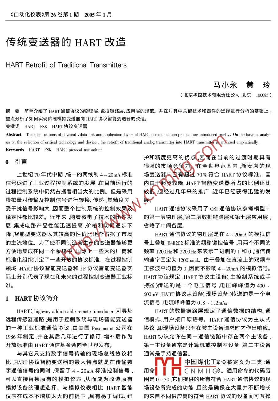 《自動化儀表》第26卷第1期2005年1月傳統(tǒng)變送器的HART改造HART Retrofit of Traditional Transmitters馬小永黃玲北京華控技術(shù)有限責(zé)任公司北京100085)摘要簡單介紹了HART通信協(xié)議的物理層、數(shù)據(jù)鏈路層、應(yīng)用層的規(guī)范。并在對其中關(guān)鍵技術(shù)和器件的選擇進(jìn)行分析的基礎(chǔ)上重點(diǎn)分析了如何實(shí)現(xiàn)傳統(tǒng)模擬變送器向HART協(xié)議智能變送器的改造。關(guān)鍵詞 HART FSK HART協(xié)議變送器Abstract The specifications of physical data link and applayers of HART communication protocol are introduced briefly. On the basis of analysis on the selection of critical technology and device the retrofit of traditional analog transmitter into HART transmitter is analyzed emphaticallyKeywords HART FSK HART protocol transmitter引言護(hù)和精度更高的優(yōu)點(diǎn)因而在當(dāng)前的過渡時(shí)期具有很強(qiáng)的市場競爭力。在全世界范圍內(nèi)新安裝的現(xiàn)上世紀(jì)70年代中期統(tǒng)一的兩線制4~20mA標(biāo)準(zhǔn)場變送器中已有超過70%符合HART協(xié)議標(biāo)準(zhǔn)。國信號促進(jìn)了工業(yè)過程控制系統(tǒng)的發(fā)展在目前運(yùn)行的內(nèi)由于起步較晚HART智能變送器所占的比例還比過程控制系統(tǒng)中仍然占據(jù)著相當(dāng)大的比例。但是采用較低但經(jīng)過幾年來的推廣近年巳經(jīng)獲得迅猛的發(fā)模擬量對傳輸及控制信號進(jìn)行轉(zhuǎn)換、傳遞其精度差,展。受干擾信號影響大因而整個(gè)控制系統(tǒng)的控制效果及HART通信協(xié)議采用了OSI通信協(xié)議參考模型中穩(wěn)定性都比較差。近年來隨著微電子技術(shù)的迅速發(fā)的第一層物理層、第二層數(shù)據(jù)鏈路層和第七層應(yīng)用層,展集成電路產(chǎn)品性能迅速提高,價(jià)格和功耗逐步下省略了中間各層降智能型變送器以其較高的性價(jià)比逐漸占據(jù)了市場HART通信協(xié)議的物理層是在4~20mA的模擬信的主流地位。為了使不同制造商生產(chǎn)的變送器能夠更號上疊加Bl202標(biāo)準(zhǔn)的頻移鍵控信號用兩個(gè)不同的方便地集成在同一個(gè)系統(tǒng)中國際上一些大的廠商和頻率1200Hz和2200Hz來表示二進(jìn)制的1和0通信傳標(biāo)準(zhǔn)化組織制定了一些開放的協(xié)議標(biāo)準(zhǔn)。在過程控制輸速率固定為1200band。由于疊加在直流上的雙頻率領(lǐng)域HART協(xié)議智能變送器和F協(xié)議智能變送器實(shí)正弦波平均值為0因而不影響4~20mA的模擬信號。際上分別代表了現(xiàn)在和未來的過程控制變送器工業(yè)標(biāo)HART協(xié)議規(guī)定HAHT協(xié)議主設(shè)備(主控制系統(tǒng)或手準(zhǔn)持器)傳送的是一個(gè)電壓信號電壓峰峰值為400~1HART協(xié)議簡介600 my HART協(xié)議從設(shè)備現(xiàn)場設(shè)備)傳送的是一個(gè)電流信號電流峰峰值為0.8~1.2mA。HART( highway addressable remote transducer可尋址HART的數(shù)據(jù)鏈路層規(guī)定了通信數(shù)據(jù)的結(jié)構(gòu)、通遠(yuǎn)程傳感器通路湜用于控制系統(tǒng)與現(xiàn)場智能變送器信模式、用戶接口原語等。HAT通信協(xié)議為主從式的一種工業(yè)標(biāo)準(zhǔn)通信協(xié)議由美國 Rosemount公司在協(xié)議即現(xiàn)場設(shè)備只有在被主設(shè)備請求時(shí)才作出響應(yīng)。1986年制定并在其后幾年進(jìn)行了修訂、增補(bǔ)后作為HART協(xié)議允許在同一通信鏈路中存在兩個(gè)主設(shè)備開放標(biāo)準(zhǔn)由HART通信基金會向全世界發(fā)布第一主設(shè)備通常是計(jì)算機(jī)或控制室設(shè)備第二主設(shè)備與其它只支持?jǐn)?shù)字信號傳輸?shù)默F(xiàn)場總線協(xié)議相通常是手持通信器。比HART協(xié)議智能變送器的最大特點(diǎn)就是在傳輸數(shù)凵中國煤化工令被定義為三類通字通信信號的同時(shí)保留了4~20mA標(biāo)準(zhǔn)控制信號,用命CNMH令令。通用命令的代碼范可以直接替換原有的模擬儀表,從而成為改造原有圍是0~30它們提供的所有符合HART通信協(xié)議的現(xiàn)模擬設(shè)備的理想選擇。與模擬儀表相比,HART智能場設(shè)備所完成的功能目的是確保在大量并不斷增長儀表在成本不增加太大的前提下具有易于調(diào)試、維的來自不同供應(yīng)商的符合HART協(xié)議的設(shè)備間可互操22PROCESS AUTOMATION INSTRUMENTATION Vol 26, No I January 2005傳統(tǒng)變送器的HART改造馬小永等作并在日常工廠操作中訪問數(shù)據(jù)。常用命令的代碼電阻。范圍是32~126,它們提供大部分符合HART通信協(xié)議③電纜分布電容在實(shí)際運(yùn)行中曾有過模擬輸〔但不是全部舶的現(xiàn)場設(shè)備完成的功能。設(shè)備專用命令出信號正常但不能通信的現(xiàn)象。經(jīng)分析是由于電纜的代碼范圍是128~253,它們提供由基本上唯一的特太長、分布電容太大致使網(wǎng)絡(luò)時(shí)間常數(shù)過大、通信波殊現(xiàn)場設(shè)備所完成的功能。形嚴(yán)重失真而無法通信此時(shí)可以通過更換合適的電在一個(gè)大的系統(tǒng)中往往集成了多個(gè)廠商的變纜來解決送器。從用戶角度出發(fā),希望用一個(gè)手持器就可以對所有的變送器進(jìn)行一些常用的操作,這就涉及到3傳統(tǒng)變送器的HART改造了互操作性。為了保證HAR協(xié)議產(chǎn)品符合互操作典型HART智能儀表的電路組