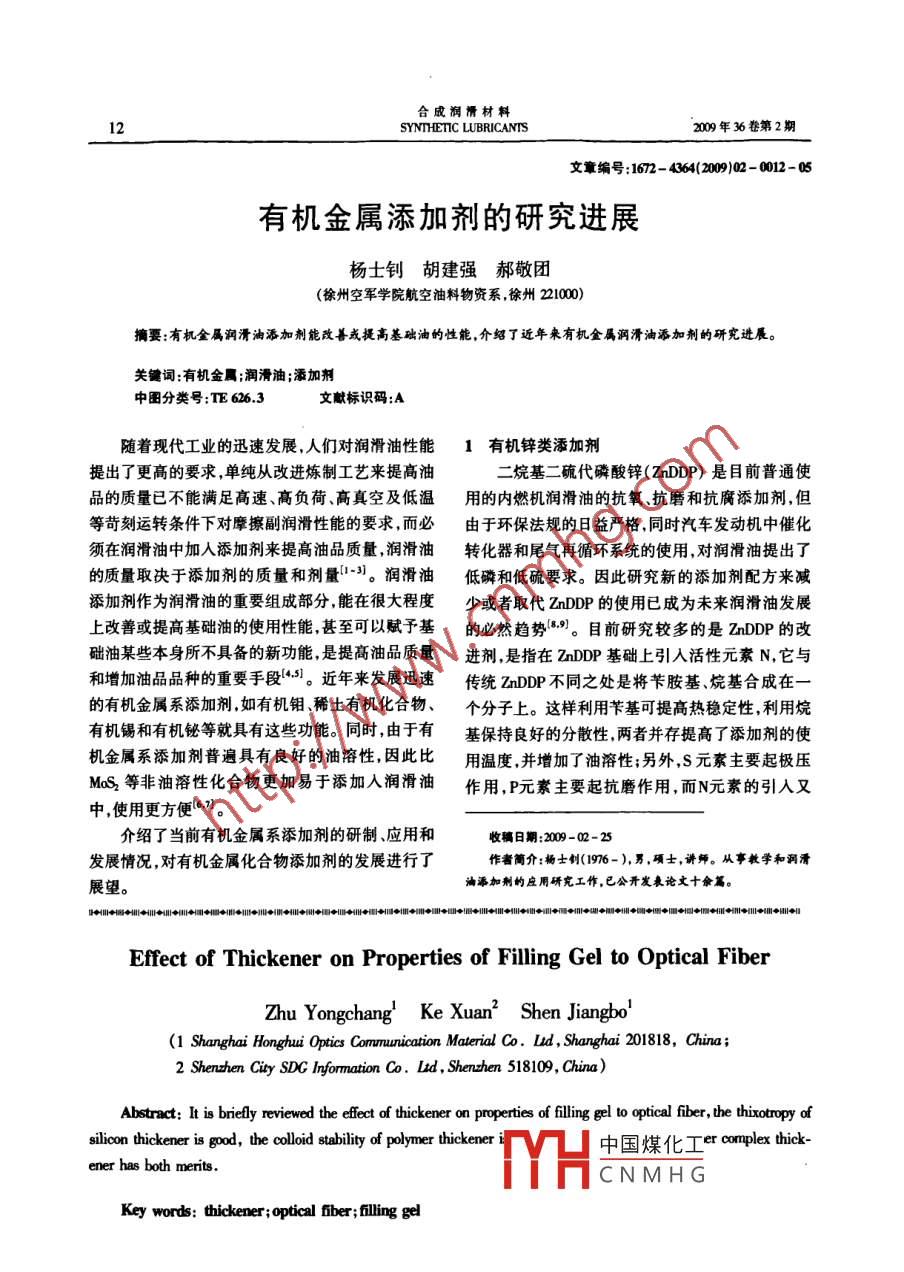 合成潤滑材料12SYNHETIC LUBRICANTS2009年36卷第2期文章編號:1672- 4364(2009)02- 0012-05有機金屬添加劑的研究進(jìn)展楊士釗胡建強郝敬團(tuán)(徐州空軍學(xué)院航空油料物資系,徐州21000)摘要:有機金屬潤滑油添加劑能改善或提高基礎(chǔ)油的性能,介紹了近年來有機金屬潤滑油添加劑的研究進(jìn)展。關(guān)鍵詞:有機金屬;潤滑油;添加劑中團(tuán)分類號:TE 626.3文獻(xiàn)標(biāo)識碼:A隨著現(xiàn)代工業(yè)的迅速發(fā)展,人們對潤滑油性能1有機鋅類添加劑提出了更高的要求,單純從改進(jìn)煉制工藝來提高油二烷基二硫代磷酸鋅(ZnDDP)是目前普通使品的質(zhì)量已不能滿足高速、高負(fù)荷、高真空及低溫用的內(nèi)燃機潤滑油的抗氧抗磨和抗腐添加劑,但等苛刻運轉(zhuǎn)條件下對摩擦副潤滑性能的要求,而必由于環(huán)保法規(guī)的日益嚴(yán)格,同時汽車發(fā)動機中催化須在潤滑油中加人添加劑來提高油品質(zhì)量,潤滑油轉(zhuǎn)化器和尾氣再循環(huán)系統(tǒng)的使用,對潤滑油提出了的質(zhì)量取決于添加劑的質(zhì)量和劑量11-3)。潤滑油低磷和低硫要求。因此研究新的添加劑配方來減添加劑作為潤滑油的重要組成部分,能在很大程度少或者取代ZnDDP的使用已成為未來潤滑油發(fā)展上改善或提高基礎(chǔ)油的使用性能,甚至可以賦予基的必然趨勢8.9]。目前研究較多的是ZnDDP的改礎(chǔ)油某些本身所不具備的新功能,是提高油品質(zhì)量進(jìn)劑,是指在ZnDDP基礎(chǔ)上引人活性元素N,它與和增加油品品種的重要手段(4.s)。近年來發(fā)展迅速傳統(tǒng)ZnDDP不同之處是將芐胺基.烷基合成在一的有機金屬系添加劑,如有機鉬、稀土有機化合物、個分子上。這樣利用芐基可提高熱穩(wěn)定性,利用烷有機錫和有機鉍等就具有這些功能。同時,由于有基保持良好的分散性,兩者并存提高了添加劑的使機金屬系添加劑普遍具有良好的油溶性,因此比用溫度,并增加了油溶性;另外,S元素主要起極壓MoS,等非油溶性化合物更加易于添加入潤滑油作用,P阮素主要起抗磨作用,而N元素的引入又中,使用更方便l6.7]。介紹了當(dāng)前有機金屬系添加劑的研制應(yīng)用和收稿日期:2009-02-25發(fā)展情況,對有機金屬化合物添加劑的發(fā)展進(jìn)行了作者簡介:楊士倒(1976-),男,碩士,講師。從事教學(xué)和潤滑展望。油添加制的應(yīng)用研究工作,已公開發(fā)表論文十余篇。Effect of Thickener on Properties of Filling Gel to Optical FiberZhu Yongchang' Ke Xuan2Shen Jiangbo' .(1 Shanghai Honghui Optics Communication Material Co. Ld , Shanghai 201818, China;2 Shenzhen Ciry SDC Ingormation Co. Ld , Shenzhen 518109, China)Abstract: It is briely reviewed the efect of thickener on properties of fling gel to optical fiber, the thixotropy ofsilicon thickener is good, the ollid stability of polymer thickener中國煤化工er complex thick-ener has both merits.YHCNMHGKey words: thickener;optical fber; flig gel2009年36卷第2期楊士釗等.有機金屬添加劑的研究進(jìn)展13提高了抗腐蝕能力。根據(jù)分子設(shè)計原理,將N、P、油溶性有機鉬添加劑2-乙基己基-二硫代磷酸S、Zn和芳香環(huán)同時引人一個分子中,所得添加劑氧鉬(MoDDP)和硫化-二異丙基-二硫代磷酸鉬二烷基二芐胺基磷酸鋅具有優(yōu)異的摩擦學(xué)性能。(MoDTP)的摩擦學(xué)性能及其復(fù)配體系的抗磨減摩唐順學(xué)和肖翠玲等對二烷基二芐胺基磷酸鋅性能,對磨斑表面形貌和表面膜元素組成進(jìn)行了分進(jìn)行了合成工作,并考察了它的性能。實驗結(jié)果表析,探討了有機鉬添加劑的摩擦化學(xué)作用機制。結(jié)明,所得產(chǎn)物能大幅提高潤滑油的承載負(fù)荷,并且果表明,有機鉬添加劑MoDDP和MoDTP均具有優(yōu)有較高的熱穩(wěn)定性。袁光成等["0]通過紅外、紫外,異的摩擦學(xué)性能其復(fù)配體系呈現(xiàn)協(xié)同抗磨減摩效并結(jié)合化學(xué)實驗對二烷基二芐胺基磷酸鋅的結(jié)構(gòu)應(yīng),這是由于有機鉬添加劑在摩擦副表面形成由進(jìn)行了分析,并證實了它的結(jié)構(gòu)式的正確性。FeS、MaS,及MoO2組成的化學(xué)反應(yīng)膜和由含磷化2有機鉬類添加劑合物組成的沉積膜所致。有機鉬作為潤滑油添加劑,添加于汽輪機油、聶芊等合成了有機鉬并與堿性石油磺酸鈣按齒輪油和發(fā)動機油中,具有顯著的減摩、抗磨、抗極一定的配比,制備了復(fù)合添加劑加人到基礎(chǔ)油中,壓作用,這在國內(nèi)外已做了大量的研究["1-15)。在四球摩擦試驗機上測試了其摩擦磨損性能。結(jié)謝鳳等采用四球機考察了二烷基二硫代氨基果表明,這種復(fù)合添加劑可使基礎(chǔ)油的摩擦因數(shù)顯甲酸鉬( MoDTC)的極壓抗磨性能及MoDTC與二烷著降低,可較大地提高基礎(chǔ)油的承載能力和抗磨基二硫代磷酸鋅(ZnDDP)、亞甲基雙二丁基二硫代.損性能,并有效地抑制升溫。氨基甲酸酯( DDTC)添加劑的抗磨協(xié)同效應(yīng),并對3有機稀土類添加劑MoDTC抗磨作用機制進(jìn)行了分析研究。結(jié)果表明,稀土材料由于其特殊的物理和化學(xué)性能而受MoDTC在基礎(chǔ)油具有良好的極壓抗磨性能,與到廣泛重視!'6,1 ,稀土化合物的摩擦學(xué)性能研究也ZnDDP .DDTC表現(xiàn)出了良好的抗磨協(xié)同效應(yīng),特別引起了人們的極大興趣(1-1]。聶芊等合成了二烷是與ZnDDP表現(xiàn)出了非常好的抗磨協(xié)同效應(yīng)?;虼姿徼|/銪混