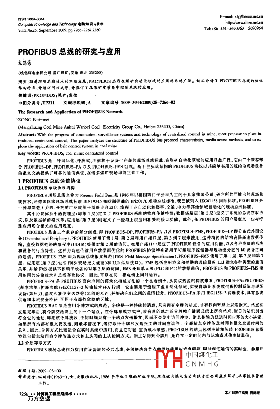 ssN10093044Computer Knowledge and Technology電腦知識與技術Vo.5,No.25, September200,p7266-7267,7280Tel:+86-551-56909635690964PROF|BUS總線的研究與應用縱瑞梅(皖北煤電集團公司孟莊煤礦,安徽淮北235200)摘要:隨著現場總線技術的不斷發(fā)展, PROFIBUS總線在煤礦自動化領域的應用越來越廣泛。該文分析了 PROFIBUS總線的協議結構特點、介質訪問方式等,并探討了在煤礦皮帶集中控制系統(tǒng)的應用。關鍵詞: PROFIBUS;煤礦;集控中圖分類號:TP311文獻標識碼:A文章編號:1009-304402009)25-726602The Research and Application of PROFIBUS Network'ZONG Rui-me1(Meng]huang Coal Mine Anhui Wanbei Coal-Electricity Group Co, Huibei 235200, China)Abstract: With the progress of automation, surveillance systems and technology of centralized control in mine, most preparation plant introduced centralized control, This paper analyzes the structure of PROFIBUS bus protocol characteristics, media access methods, and to explore the application of belt control system in coal mine.Key words: PROFIBUS; coal mine; centralized controlPROFIBUS是一種國際化、開放式、不依賴于設備生產商的現場總線標準在煤礦自動化領域的應用日益廣泛。它由三個兼容部分 PROFIBUS-DP, PROFIBUS-PA以及 PROFIBUS-FMS組成?;谥鲝氖浇Y構的 PROFIBUS協議以其簡單實用的規(guī)約為現場設備的報文交換提供了可靠的通信保證,在諸多煤礦現場均能正常工作。1 PROFIBUS總線通信協議1 1 PROFIBUS總線協議結構PROFIBUS現場總線全稱為 Process Field Bus,是1986年以德國西門子公司為主的十幾家德國公司、研究所共同推出的現場總線技術,是德國國家現場總線標準DN9245和歐洲標準的EN0170現場總線標準現已被列入IEC61158國際標準。 PROFIBUS是種與制造無關的、開放的廣泛應用于制造業(yè)自動化、流程工業(yè)自動化和樓宇、交通、電力等其他領域自動化的現場總線標準。其中協議體系中的物理層(即第1層)定義了 PROFIBUS系統(tǒng)的物理傳輸特性;數據鏈路層(第2層)定義了系統(tǒng)的總線存取協議,以及數據幀的格式等;應用層(第7層〕則定義了一些與上層應用相關的接口功能。此外,在 PROFTBUS的用戶層定義一些與特殊應用場合相關的應用規(guī)范。PROFTBUS是由三個兼容的部分組成,即 PROFTBUS-DP, PROFIBUS-PA以及 PROFIBUS-FMS。 PROFIBUS-DP即分布式外圍設備( Decentralized Periphery), PROFIBUS使用了第l層、第2層和用戶接口層第3到7層未使用,這種精簡的結構確保高速數據傳輸。直接數據鏈路映象程序(UDM提供對第2層的訪問。在用戶接口中規(guī)定了 PROFIBUS設備的應用功能,以及各種類型的系統(tǒng)和設備的行為特性。這種為高速傳輸用戶數據而優(yōu)化的 PROFIBUS協議特別適用于可編程序控制器與現場級分散的I0設備之間的通信。 PROFIBUS-FMS即為現場總線報文規(guī)范(FMs- Field Message Specification), PROFIBUS-FMS使用了第1層第2層和第7層。應用層(第7層)包括FMS(現場報文規(guī)范)和L(低層接口)。FMS包括應用協議和提供的通信服務,L建立各種類型的通信關系,并給FMS提供不依賴于設備的對第2層的訪問。FMS處理單元級(PLC和PC)的數據通信。 PROFTBUS和 PROFIBUS-FMS使用相同的傳輸技術和總線存取協議。因此,可以在同一根電纜上同時運行。PROFIBUS-PA是 PROFIBUS面向應用的模塊化構成方法的一個顯著例子。從協議規(guī)范的構成來看, PROFIBUS-PA= PROFIBUS基本功能+擴展功能)+EC1158-2傳輸技術+PA行規(guī)。它主要用于流程工業(yè)自動化領域,實現自動化系統(tǒng)或過程控制系統(tǒng)與現場設備(如壓力溫度和液位變送器等)之間的互連并解決它們之間的通訊任務。 PROFIBUS-PA采用ECl158-2傳輸技術具有總線供電和本質安全特征,可用于有爆炸危險的區(qū)域PROFIBUS MAC層是應用令牌方式的典范。令牌是一種特殊的消息,只有擁有令牌的站點,才有權向環(huán)路上發(fā)送報文。站點在發(fā)送完畢后,將令牌交給網上的下一個站點。在令牌總線方式中,帶有目的地址的令牌幀廣播到總線上所有站點,當目的站識別出符合它的地址,即把該令牌接收任何時刻只有一個站點發(fā)送報文因而不會發(fā)生訪問沖突。消息傳輸的延遲時間由環(huán)的大小決定。如果所有站都有報文要發(fā)送,則最壞情況下,等待取得令牌和發(fā)送報文的時間應該等于全部站點令牌傳送時間和報文發(fā)送時間的總和。因此,令牌方式比較適合在實時系統(tǒng)中應用,而且它對輕重負載不敏感。 PROFIBUS的站點包括主站和從站 PROFTBUS總線協議包括主站間的令牌傳遞方式和主從間的主從輪詢方式。當主站得到令牌后,允許在一定時間內與從站或其他主站通信。12介質存取方式PROFTBUS現場總線作為應用在設備層的公共總線,必須解決各節(jié)點的網終他用權音備回顆同時保證通信的實時性。參照開中國煤化工CNMHG日期:2009-05-09作者簡介:縱瑞梅(1963-),女,安撒淮北人,1986年畢業(yè)于淮南礦業(yè)學院現在皖北煤電集團有限責任公司玉莊煤礦,從事技術管理工作。7266方數酸用術∵本欄目任編輯:獅第5卷第25期(200年9月)Computer Knowledge and Technology電腦知識與技術放系統(tǒng)互聯協議(OSI),在 PROFIBUS協議中第二層的現場總線數據鏈路層(FDL)協議定義了總線存取控制協議(MAC)。通信網絡的效率、利用率可靠性、實時性很大程度上取決于協議的MAC協議方式PROFIBUS系統(tǒng)采用由混合介質存取方式實現的控制介質存取:對應于令牌傳遞原理的分散方式是以對應于主-從原理的集中