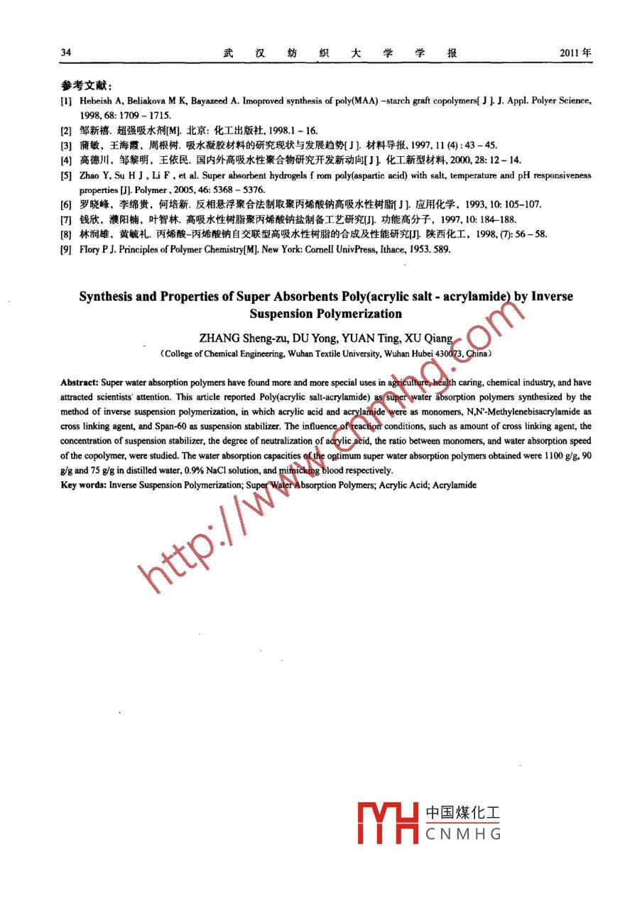 第24卷第3期武漢紡織大學(xué)學(xué)報Vol.24 No.32011年06月JOURNAL OF WUHAN TEXTILE UNIVERSITYJun.2011反相懸浮法合成聚(丙烯酸鈉-丙烯酰胺)高吸水樹脂及性能研究張圣祖,杜勇,袁庭,徐強(qiáng)(武漢紡織大學(xué)化學(xué)工程學(xué)院,湖北武漢430073)滴要:高吸水性樹脂由于在農(nóng)業(yè)、生理衛(wèi)生和化學(xué)工業(yè)等領(lǐng)域的廣泛用途近來得到廣泛的觀注。本文以丙烯酸和丙烯酰胺為共聚單體,N,N'-亞甲基雙丙烯酰胺為交聯(lián)劑,Span-60 為懸浮穩(wěn)定劑,采用反相懸浮聚合法合成了聚(丙烯酸鈉-丙烯酰胺)高吸水樹脂。探討了交聯(lián)劑濃度、懸浮穩(wěn)定劑濃度、中和度和不同單體配比等對樹脂吸液率的影響,以及樹脂的吸液速率。結(jié)果表明,合成得到的高吸水樹脂對去離子水、0.9%生理鹽水和人工血液的吸收率分別達(dá)到100g/g、90 gg和75 ggo關(guān)鍵詞:反相懸浮聚合;高吸水樹脂;丙烯酸;丙烯酰胺中圖分類號: 0631.1文獻(xiàn)標(biāo)識碼: A文章編號: 1009 - 5160(201 1)03 - 0031 - 041 引言高吸水性樹脂( Super Absorption Polymers, SAP )是一~類具有親水基團(tuán)并輕度交聯(lián)的三維網(wǎng)絡(luò)聚合物。因其吸水能力超過自身重量數(shù)百倍,具有良好的保水性能,對水分子具有緩釋作用的優(yōu)點,因而被廣泛應(yīng)用于農(nóng)業(yè)、醫(yī)療衛(wèi)生、園林、工業(yè)水處理等領(lǐng)域"-%。聚丙烯酸類高吸水性樹脂作為一類全合成高吸水性樹脂,由于具有成本低、工藝簡單、環(huán)境污染小、吸水性能好以及產(chǎn)品保質(zhì)期長等- - 系列優(yōu)點,因而得到了研究人員的廣泛重視。羅曉峰等”以十八烷基磷酸單脂為分散劑,制備的丙烯酸鈉與丙烯酰胺共聚物高吸水樹脂,聚合體系穩(wěn)定,聚合物呈顆粒狀,產(chǎn)物吸水率達(dá)680mg/g。錢欣等以丙烯酸為聚合單體,采用溶液聚合法,制得了聚丙烯酸鈉高吸水性樹脂。林潤雄等”利用丙烯酸一-丙烯酸鈉的 自交聯(lián),也研制出吸水倍數(shù)在1000倍以上的高吸水樹脂。本研究以丙烯酸和丙烯酰胺為功能單體,Span- 60為分散劑,N, N-亞甲基雙丙烯酰胺為交聯(lián)劑,采用反相懸浮法合成了聚(丙烯酸鈉-丙烯酰胺)(P (AA- -AM ))高吸水樹脂,并對其性能進(jìn)行了研究。2實驗部分.2.1 實驗原料丙烯酸(AC),工業(yè)級,北京東方化工廠。丙烯酰胺(AM), 工業(yè)級,河南焦作多生多化工公司。以上原料使用前經(jīng)過純化處理。N, N, -亞甲基雙丙烯酰胺(NMBA),化學(xué)純。過硫酸鉀,分析純。Span -60,化學(xué)純。以上溶劑均購自國醫(yī)集團(tuán)上?;瘜W(xué)試劑有限公司。200#溶劑油,工業(yè)級,杭州煉油廠。2.2 SAP 的合成及性能測試將用一定量NaOH中和的丙烯酸、丙烯酰胺、交聯(lián)劑N, N - 亞甲基雙丙烯酰胺和引發(fā)劑KS2O%溶于蒸餾水中,然后加入到由200#溶劑油、Span-60 所組成的油相中,攪拌約30 min后,在氮氣保護(hù)下加熱到70 C。維持-定的攪拌速度,聚合3h,將反應(yīng)產(chǎn)物趁熱過濾,并用甲醇洗滌3次,真空干燥,即得到白色顆粒狀樹脂P ( AA-AM )。樹脂吸液率的測定采用稱取0.5 g吸水樹脂置于1000 mL中國煤化工靜置1h后,用100目尼龍布袋過濾,稱量吸水樹脂重量。吸液速率的測定按.MHC NM H G彌量,得到不同作者簡介:張圣相(1968-).男.副教授.研究方向:功能高分子材料.金項目:湖北省教育廳科學(xué)技術(shù)研究項目( B20101602 ) .32武漢紡練大學(xué)報2011年時間的吸液量。3結(jié)果與討論3.1 交聯(lián)劑用量的影響圖1 A為交聯(lián)劑NMBA濃度對P ( AA-AM )吸收去離子水的效果圖。從圖中可以看出,隨著交聯(lián)劑用量的增加,樹脂的吸液率逐漸降低。高吸水樹脂的吸水是由于樹脂中親水基團(tuán)與水分子間氫鍵的強(qiáng)相互作用導(dǎo)致水分子進(jìn)人樹脂內(nèi)部,并將樹脂溶脹并保留在樹脂中。樹脂的溶脹程度與聚合物網(wǎng)絡(luò)的交聯(lián)密度成反比。交聯(lián)劑用量小,聚合形成的三維網(wǎng)絡(luò)較大,因此吸水能力強(qiáng)。但是過低的交聯(lián)密度也會導(dǎo)致聚合物中可溶的線型大分子增多,吸水率反而低。若交聯(lián)劑用量過大,則交聯(lián)密度太大,聚合物的網(wǎng)絡(luò)空間變小,溶脹性不好,因而所能容納的液體量減少。根據(jù)FLory理論",吸水率可用式(1)表示:Qm3=[(i/2VsS'7)*+(1/2- x I)/V1]/(VJVo)(1)式中,Q.代表膨脹比,(VJVo) 表示聚合物的交聯(lián)密度。顯然,交聯(lián)密度小時,吸水率應(yīng)變大。我們的實驗結(jié)果是與該式相符合的。進(jìn)人聚合物內(nèi)部的水分子將聚合物鏈中可解離的基團(tuán)水解離子化,產(chǎn)生可移動的反離子使樹脂內(nèi)部離子濃度增加。內(nèi)外離子濃度的差別所產(chǎn)生的滲透壓促使更多的水分子通過界面進(jìn)人樹脂內(nèi)部。顯然,聚合物內(nèi)外離子濃度的差別越大,聚合物吸水能力越強(qiáng)。比較圖1A和1B,吸水樹脂吸去離子水的量遠(yuǎn)大于人工血液B(1)和0.9%生理鹽水B (2)。這顯然是由于生理鹽水和人工血液中離子濃度較去離子水高,從而降低了聚合物內(nèi)外的滲透壓差所致。從式(1)也可以看出,隨著外界離子濃度s的增加,則分子第一-項減小,Qm降低。140090A8029B1200區(qū)1000601(理800樓56004040030、00. 050.1 0. 150.20.1交聯(lián)劑濃度(wt%)圈1交聯(lián)劑濃度對吸液率的影響A:去離子水; B: 1人工血液; 2 0.9%生理鹽水3.2懸浮穩(wěn)定劑用量