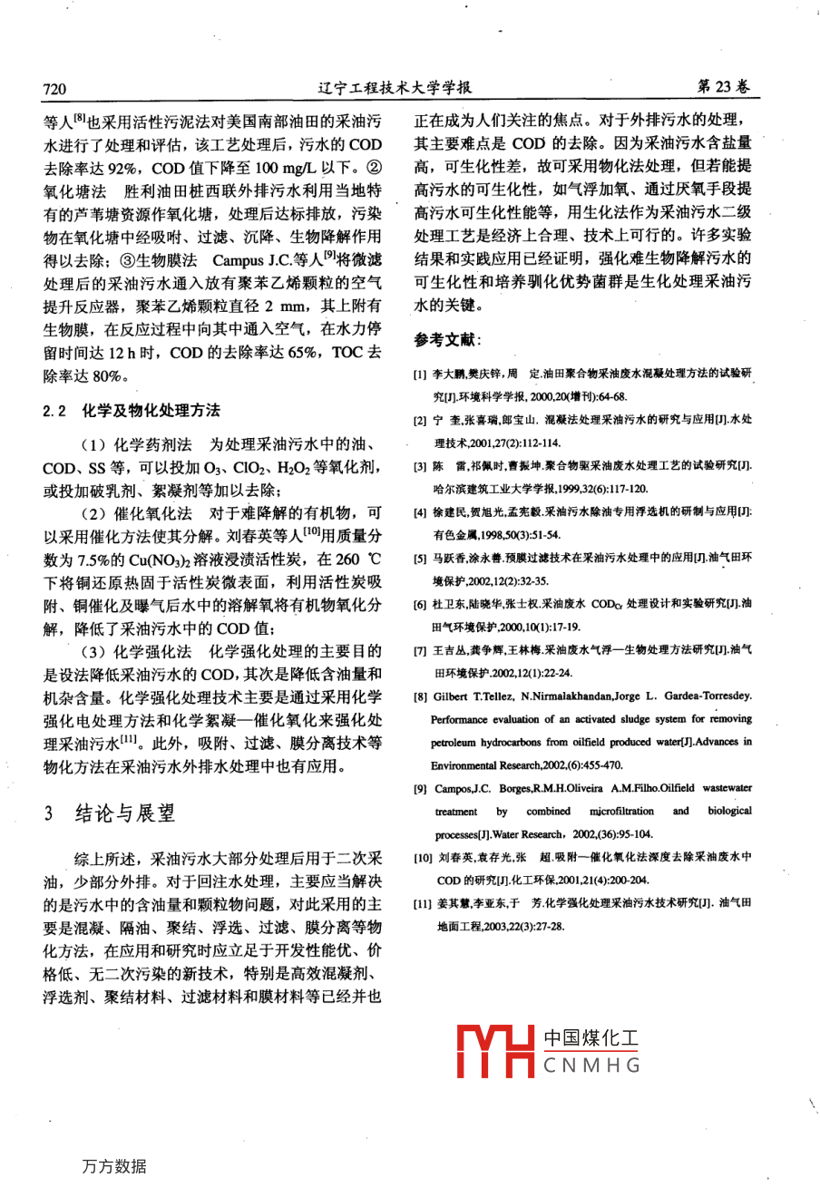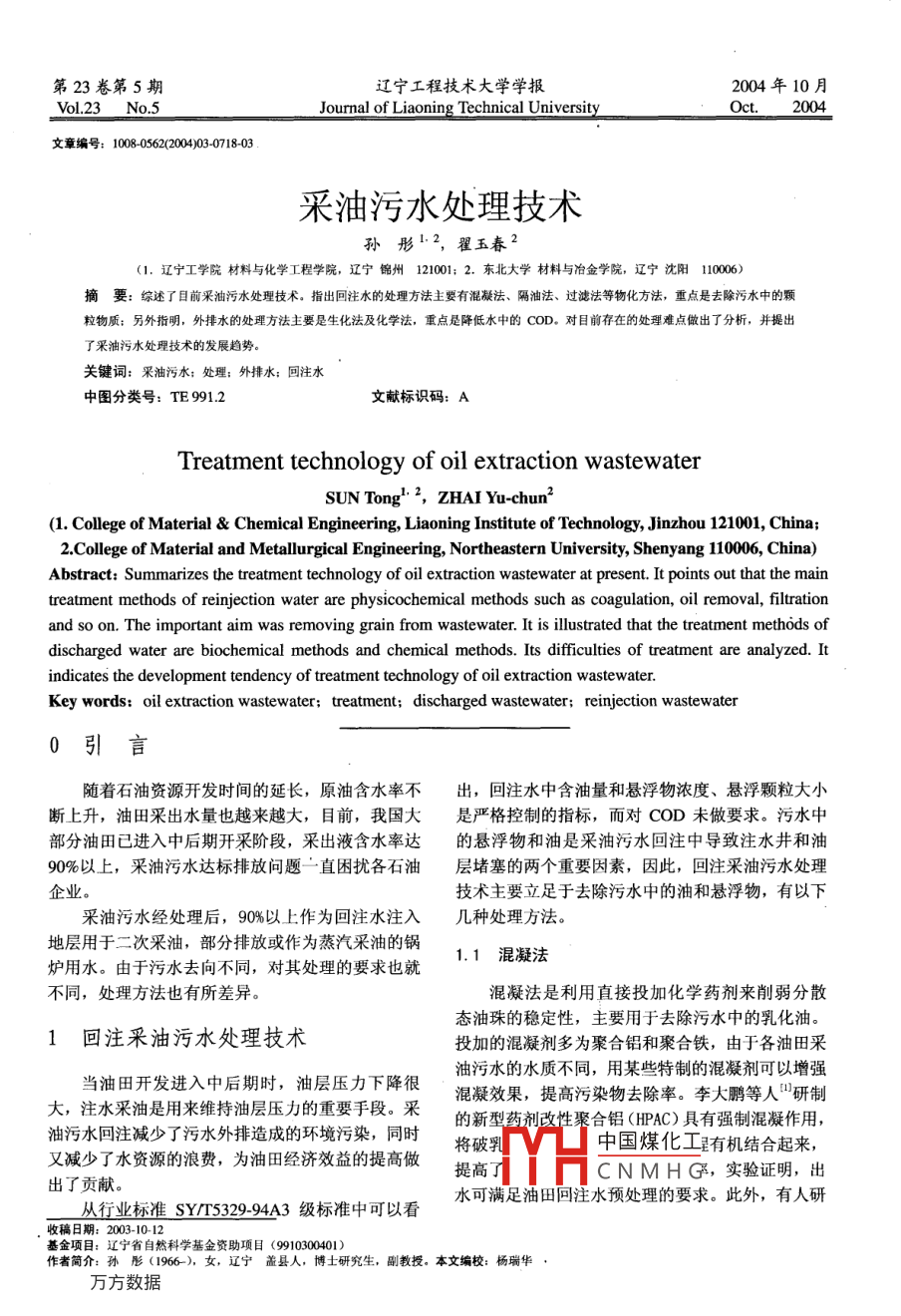 第23卷第5期遼寧工程技術(shù)大學(xué)學(xué)報(bào)2004年10月Vo1.23 No.5Jourmal of Liaoning Technical UniversityOct.2004文章編號(hào): 1008-0562(2004)03-0718-03.采油污水處理技術(shù)孫彤上2,翟玉春2(1.遼寧工學(xué)院材料與化學(xué)工程學(xué)院,遼寧錦州121001; 2.東北大學(xué)材料與冶金學(xué)院,遼寧沈陽100060摘要: 綜述了目前采油污水處理技術(shù)。指出回注水的處理方法主要有混凝法、隔油法、過濾法等物化方法,重點(diǎn)是去除污水中的顆粒物質(zhì):另外指明,外排水的處理方法主要是生化法及化學(xué)法,重點(diǎn)是降低水中的COD.對(duì)目前存在的處理難點(diǎn)做出了分析,并提出了采油污水處理技術(shù)的發(fā)展趨勢。關(guān)鍵詞:采油污水: 處理:外排水;回注水中圖分類號(hào): TE991.2文獻(xiàn)標(biāo)識(shí)碼: A .Treatment technology of oil extraction wastewaterSUN Tong'2, ZHAI Yu-chun2(1. College of Material & Chemical Enginering, Liaoning Institute of Technology, Jinzhou 121001, China;2.College of Material and Metallurgical Engineering, Northeastern University, Shenyang 110006, China)Abstract: Summarizes the treatment technology of oil extraction wastewater at present. It points out that the maintreatment methods of reinjection water are physicochemical methods such as coagulation, oil removal, filtrationand so on. The important aim was removing grain from wastewater. It is ilustrated that the treatment methods ofdischarged water are biochemical methods and chemical methods. Its difficulties of treatment are analyzed. Itindicates the development tendency of treatment technology of oil extraction wastewater.Key words: oil extraction wastewater; treatment; discharged wastewater; reinjection wastewater0引言隨著石油資源開發(fā)時(shí)間的延長,原油含水率不出,回注水中含油量和懸浮物濃度、懸浮顆粒大小斷上升,油田采出水量也越來越大,目前,我國大是嚴(yán)格控制的指標(biāo),而對(duì)COD未做要求。污水中部分油田已進(jìn)入中后期開采階段,采出液含水率達(dá)的懸浮物和油是采油污水回注中導(dǎo)致注水井和油90%以上,采油污水達(dá)標(biāo)排放問題一直困擾各石油層堵塞的兩個(gè)重要因素,因此,回注采油污水處理企業(yè)。技術(shù)主要立足于去除污水中的油和懸浮物,有以下采油污水經(jīng)處理后,90%以 上作為回注水注入幾種處理方法。地層用于二次采油,部分排放或作為蒸汽采油的鍋1. 1混凝法爐用水。由于污水去向不同,對(duì)其處理的要求也就不同,處理方法也有所差異?;炷ㄊ抢弥苯油都踊瘜W(xué)藥劑來削弱分散態(tài)油珠的穩(wěn)定性,主要用于去除污水中的乳化油。1回注采油污水處理技術(shù)投加的混凝劑多為聚合鋁和聚合鐵,由于各油田采當(dāng)油田開發(fā)進(jìn)入中后期時(shí),油層壓力下降很油污水的水質(zhì)不同,用某些特制的混凝劑可以增強(qiáng)大,注水采油是用來維持油層壓力的重要手段。采混凝效果,提高污染物去除率。李大鵬等人”研制油污水回注減少了污水外排造成的環(huán)境污染,同時(shí)的新型藥劑改性聚合鋁(HPAC)具有強(qiáng)制混凝作用,又減少了水資源的浪費(fèi),為油田經(jīng)濟(jì)效益的提高做將破乳中國煤化工有機(jī)結(jié)合起來,提高了|YHCN MH G,實(shí)驗(yàn)證明,出出了貢獻(xiàn)。從行業(yè)標(biāo)準(zhǔn)SY/T5329-94A3 級(jí)標(biāo)準(zhǔn)中可以看水可滿足油田回注水預(yù)處理的要求。此外,有人研收稿日期: 2003-10-12基金項(xiàng)目:遼寧省自然科學(xué)基金資助項(xiàng)目(9910300401)作者簡介:孫彤(1966-). 女遼寧蓋縣人, 博士研究生,副教授。本文編校:楊瑞華第5期孫彤等:采油污水處理技術(shù)719究了用助凝劑和絮凝劑聯(lián)合使用,及聚合的復(fù)配技資少、污染小的特點(diǎn)。術(shù)制成新的高效混凝劑處理采油污水,效果良好”。1.7 離子調(diào)整法. 1.2 隔油法隔油法采用平流式隔油池、平行斜板式隔油池離子調(diào)整法是指針對(duì)采油污水中的弱酸性緩或波紋斜板式隔油池,靠重力作用進(jìn)行油水分離,沖體系,通過調(diào)整水中有關(guān)離子的含量,破壞該緩沖體系,去除腐蝕、結(jié)垢離子,優(yōu)化水質(zhì)。主要去除游離態(tài)和機(jī)械分散態(tài)油。1.3聚結(jié)法2外排采油污水處理技術(shù)聚結(jié)法是在聚結(jié)反應(yīng)器中,采用某些聚結(jié)材隨著油田綜合含水率的提高,采油污水的產(chǎn)生料,依靠污水中油粒的聚結(jié)作用,原水中的油粒相量不斷增加,已不能全部用于油田回注或回灌,部互聚結(jié)成直徑較大的顆粒,改變?cè)性偷念w粒分采油污水要排放到環(huán)境中,在對(duì)這些外排采油污分布情況,使之易于重力分離。水處理時(shí)要充分考慮COD、油等各項(xiàng)指標(biāo)。目前,聚結(jié)材料可分為以潤濕聚結(jié)為主的親油性材外排采油污水的處理技術(shù)主要有以下幾種。料和以碰撞聚結(jié)為主的親水性材料,聚結(jié)材料對(duì)除2.1 生化處理方法油性能有影響,應(yīng)根據(jù)污水的具體情況選擇使用聚結(jié)材料。采油污水經(jīng)隔油、氣浮等物化方法處理后,出對(duì)于穩(wěn)定性較好的聚合物驅(qū)采油污水,波紋板水水質(zhì)不能滿足GB8978- 1996《污水綜合排放標(biāo)準(zhǔn)》狀聚結(jié)材料的聚結(jié)除油效果好于粒狀材料,親油性.二類水質(zhì)標(biāo)準(zhǔn)要求,不能直接排放。此時(shí)污水的特填料