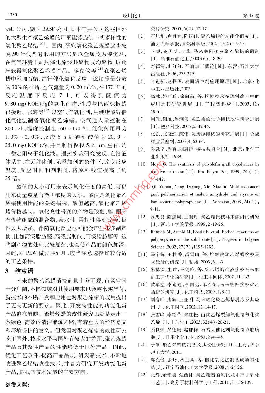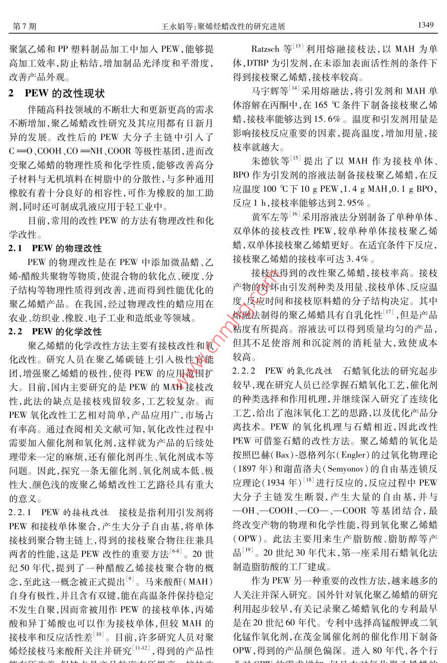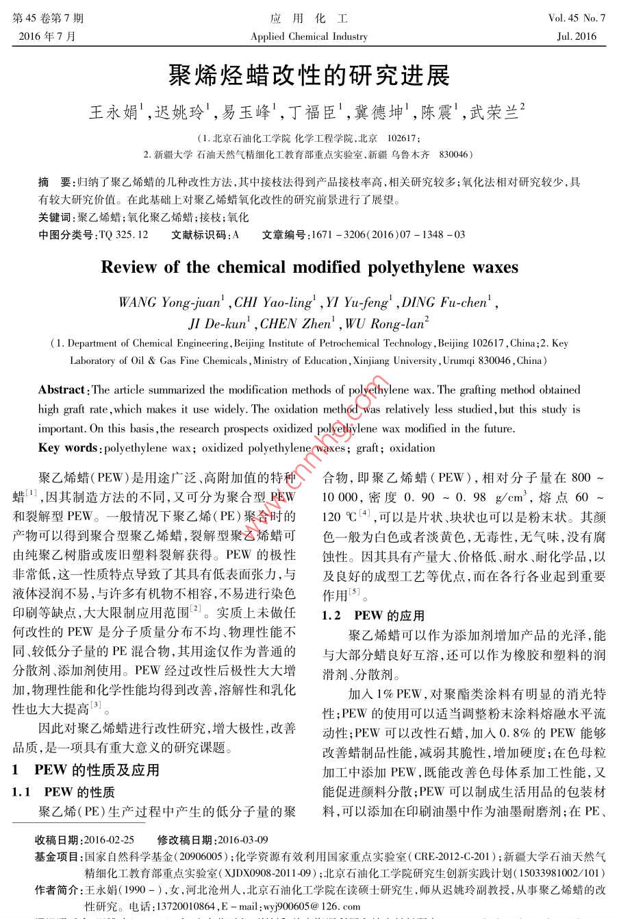 第45卷第7期應(yīng)用化工Vol. 45 No. 72016年7月Applied Chemical IndustryJul. 2016聚烯烴蠟改性的研究進(jìn)展王永娟',遲姚玲',易玉峰',丁福臣',冀德坤',陳震',武榮蘭”(1.北京石油化工學(xué)院化學(xué)工程學(xué)院,北京102617;2.新疆大學(xué)石油天然氣精細(xì)化工教育部重點(diǎn)實(shí)驗(yàn)室,新疆烏魯木齊830046)摘要:歸納了聚乙烯蠟的幾種改性方法,其中接枝法得到產(chǎn)品接枝率高,相關(guān)研究較多;氧化法相對研究較少,具有較大研究價值。在此基礎(chǔ)上對聚乙烯蠟氧化改性的研究前景進(jìn)行了展望。關(guān)鍵詞:聚乙烯蠟;氧化聚乙烯蠟;接枝;氧化中圖分類號:TQ 325. 12文獻(xiàn)標(biāo)識碼:A文章編號:1671 -3206(2016)07 - 1348 -03Review of the chemical modified polyethylene waxesWANG Yong-juan' ,CHI Yao-ling',YI Yu-feng' ,DING Fu-chen'JI De-kun',CHEN Zhen',WU Rong-lan2( 1. Department of Chemical Engineering, Beiing Institute of Petrochemical Technology , Beijing 102617,China;2. KeyLaboratory of Oil & Gas Fine Chemicals , Ministry of Education , Xinjiang University , Urumqi 830046 , China)Abstract :The article summarized the modification methods of polyethylene wax. The grafting method obtainedhigh graft rate , which makes it use widely. The oxidation method was relatively less studied, but this study isimportant. On this basis , the research prospects oxidized polyethylene wax modified in the future.Key words : polyethylene wax; oxidized polyethylene waxes; graft; oxidation聚乙烯蠟(PEW)是用途廣泛、高附加值的特種合物,即聚乙烯蠟(PEW),相對分子量在800 ~蠟',因其制造方法的不同,又可分為聚合型PEW10000,密度0.90~0.98gcm',熔點(diǎn)60~和裂解型PEW。- -般情況下聚乙烯(PE)聚合時的120 9C[4] ,可以是片狀、塊狀也可以是粉末狀。其顏產(chǎn)物可以得到聚合型聚乙烯蠟,裂解型聚乙烯蠟可色- - 般為白色或者淡黃色,無毒性,無氣味,沒有腐由純聚乙樹脂或廢舊塑料裂解獲得。PEW的極性.蝕性。因其具有產(chǎn)量大、價格低、耐水、耐化學(xué)品,以非常低,這一性質(zhì)特點(diǎn)導(dǎo)致了其具有低表面張力,與及良好的成型工藝等優(yōu)點(diǎn),而在各行各業(yè)起到重要液體浸潤不易,與許多有機(jī)物不相容,不易進(jìn)行染色作用[5]印刷等缺點(diǎn),大大限制應(yīng)用范圍(2]。實(shí)質(zhì)上未做任1.2 PEW的應(yīng)用何改性的PEW是分子質(zhì)量分布不均、物理性能不聚乙烯蠟可以作為添加劑增加產(chǎn)品的光澤,能同、較低分子量的PE混合物,其用途僅作為普通的與大部分蠟良好互溶,還可以作為橡膠和塑料的潤分散劑、添加劑使用。PEW經(jīng)過改性后極性大大增滑劑、分散劑。加,物理性能和化學(xué)性能均得到改善,溶解性和乳化加入1%PEW,對聚酯類涂料有明顯的消光特性也大大提高3性;PEW的使用可以適當(dāng)調(diào)整粉末涂料熔融水平流因此對聚乙烯蠟進(jìn)行改性研究,增大極性,改善動性;PEW可以改性石蠟,加入0.8%的PEW能夠品質(zhì),是一項(xiàng)具有重大意義的研究課題。改善蠟制品性能,減弱其脆性,增加硬度;在色母粒PEW的性質(zhì)及應(yīng)用加工中添加PEW,既能改善色母體系加工性能,又1.1 PEW的性質(zhì)能促進(jìn)顏料分散;PEW可以制成生活用品的包裝材聚乙烯(PE)生產(chǎn)過程中產(chǎn)生的低分子量的聚.料,可以添加在印刷油墨中作為油墨耐磨劑;在PE、收稿日期:2016-02-25修改稿日期:2016-03-09基金項(xiàng)目:國家自然科學(xué)基金( 20906005 ) ;化學(xué)資源有效利用國家重點(diǎn)實(shí)驗(yàn)室( CRE-2012-C-201);新疆大學(xué)石油天然氣精細(xì)化工教育部重點(diǎn)實(shí)驗(yàn)室( XJDX0908 201 1-09) ;北京石油化工學(xué)院研究生創(chuàng)新實(shí)踐計(jì)劃( 15033981002/101)作者簡介:王永娟(1990-),女,河北滄州人,北京石油化工學(xué)院在讀碩士研究生,師從遲姚玲副教授,從事聚乙烯蠟的改性研究。電話: 13720010864 , E - mail:wyj900605@ 126. com通訊聯(lián)系人:遲姚玲( 1976 -),女,山東萊西人,副教授,從事資源利用和納米材料研究。E - mail :chiyaoling@ bipt. edu. cn;丁福臣(1964 - ),男,山東鄆城人,教授,從事清潔能源化工研究。E - mail :dingfuchen@ bipt. edu. cn第7期王永娟等:聚烯烴蠟改性的研究進(jìn)展1349聚氯乙烯和PP塑料制品加工中加入PEW,能夠提Ratzsch等[13] 利用熔融接枝法,以MAH為單高加工效率,防止粘結(jié),增加制品光澤度和平滑度,體,DTBP為引發(fā)劑,在未添加表面活性劑的條件下改善產(chǎn)品外觀。得到接枝聚乙烯蠟,接枝率較高。2 PEW 的改性現(xiàn)狀馬宇輝等[141采用熔融法,將引發(fā)劑和MAH單伴隨高科技領(lǐng)域的不斷壯大和更新更高的需求體溶解在丙酮中,在165C條件下制備接枝聚乙烯不斷增加,聚乙烯蠟改性研究及其應(yīng)用都有日新月蠟,接枝率能夠達(dá)到15.6%。溫度和引發(fā)劑用量是異的發(fā)展。改性后的PEW大分子主鏈中引入了影響接枝反應(yīng)重要的因素,提高溫度,增加用量,接.C=0、COOH、C0=NH、COOR等極性基團(tuán),進(jìn)而改枝率就越大。變聚乙烯蠟的物理性質(zhì)和化學(xué)性質(zhì),能夠改善高分朱德欽等I'5提出了以MAH作為接枝單體、子材料與無機(jī)填料在樹脂中的分散性,與多種通用BP0作為引發(fā)劑的溶液法制備接枝聚乙烯蠟,在反橡膠有著十分良好的相容性,可作為橡膠的加工助應(yīng)溫度100 C下10g PEW,1.4 g MAH,0.1 g BPO,反應(yīng)1h,接枝率能夠達(dá)到2.95%。劑,同時還可制成乳液應(yīng)用于輕工