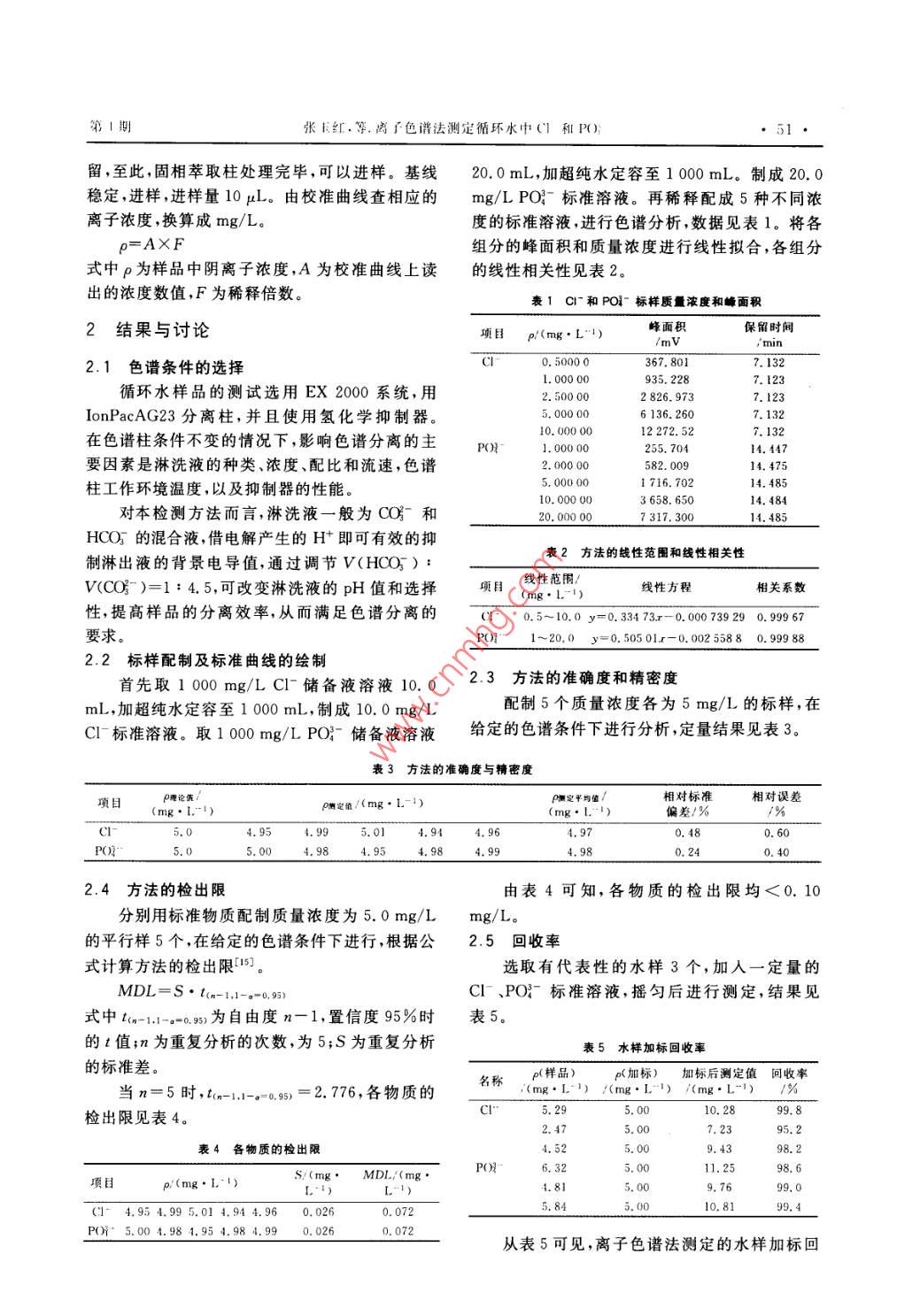 化工科技,2015,23(4):50~52分析測試science & TECHNOLOGY IN CHEMICAL INDUSTRY離子色譜法測定循環(huán)水中C|和PO8張玉紅1,王潤禮,王淑華,李寶城,王宏偉2,金鑫(1.中國石油吉林石化公司煉油廠,吉林吉林132022;2.中國石油吉林石化公司研究院,吉林吉林132021)摘要:建立了離子色譜法測定循環(huán)水中C和PO的方法。采用AG23陰離子交換色譜柱,使用過濾頭和“固相萃取柱”組成的聯(lián)合裝置除去國體雜質(zhì)和有機雜質(zhì)。以1mmol/ L NaHcO3和4,5mmol/LNa2CO3為淋洗液,流速為1.2mL/min,柱溫為35℃。各組分的相關(guān)性好(r>0.999),組分的檢出限均<0.10mg/L,各物質(zhì)的加標回收率為95.2%~99.8%,該方法快速、靈敏、準確,可用于循環(huán)水中Cl和PO的分析。關(guān)鍵詞:離子色譜;循環(huán)永;氯離子;磷酸根離子中圖分類號:TQ085.4文獻標識碼:A文章編號:1008-0511(2015)040050-03循環(huán)水在運行過程中不可避免地會引入各種體電導(dǎo)池抑制器、電導(dǎo)檢測器、自動進樣器、恒溫腐蝕性離子,從而引起管線特別是換熱器發(fā)生嚴重柱溫箱溶劑托盤、智能色譜工作站, Ion PacAG分離腐蝕。循環(huán)水中C含量大,對不銹鋼的腐蝕起到柱:D234mm×250mm,美國進口, Ion PacAS保護柱加速作用有機磷酸鹽緩蝕劑對高濃度C溶液中D234mm×50mm,均為北京歷元電子儀器有限公碳鋼的腐蝕有抑制作用,準確測定循環(huán)水中司;超聲波振蕩器:中科儀儀器有限公司p(C)和p(PO),對防止設(shè)備腐蝕和產(chǎn)品質(zhì)量的1.2實驗方法監(jiān)控有著重要的意義。Cl測定方法2有滴定法淋洗液1mmol/ L Nahco3和4.5mmol/L電位滴定法離子色譜法、分光光度法、原子吸收法N2CO3,流速1.2mL/mn,色譜柱溫度35℃,檢測和流動注射法。PO的測定法有分光光度法、池溫度40℃,檢測器為化學(xué)抑制型電導(dǎo)檢測器色譜法電化學(xué)法和比色管法。離子色譜法作為一樣品前處理包括采樣,凈化樣品,基體消除,稀釋4種公認有效的微量離子分析技術(shù),已有報道應(yīng)用于個步驟1。所有水樣均應(yīng)經(jīng)0.45m濾膜過濾飲用水7、地下水、天然水中的陰離子分析取得了良好的效果由于離子色譜不能進入大量的有機雜質(zhì),也不可以進入固體雜質(zhì),上述2種雜質(zhì)均對色譜柱造成危作者采用1mmol/ L NaHCO3和4.5mmol/L害,所以使用“過濾頭”和“固相萃取柱”組成的聯(lián)合Na2CO3為淋洗液,AG23陰離子交換色譜柱測定循環(huán)水中Cl和PO。此法具有樣品用量少、簡裝置除去固體雜質(zhì)和有機雜質(zhì)1。便、快速、準確的特點。首先打開“固相萃取柱”上下接頭,將“過濾頭”插入“固相萃取柱”上方口中,使用20mL注1實驗部分射器吸取20mL超純水,注入聯(lián)合裝置,此步驟為活化萃取柱。使用20mL注射器吸取20mL1.1試劑與儀器NahCO3、Na2CO3:優(yōu)級純,市售;配制淋洗液樣品,緩慢注入聯(lián)合裝置,在下方接口接取后面的15mL樣品,舍棄前5mL樣品。接取的15mL和其它試劑用水,全部要使用優(yōu)質(zhì)超純水。水的電阻率應(yīng)大于18Mn·cm(電導(dǎo)值小于0.056gS/樣品即為除去固體和有機雜質(zhì)的干凈樣品,可以cm),并要求水中所含顆粒粒度應(yīng)小于0.2pm10直接在色譜裝置上使用。使用g(乙醇)=50%EP2000型離子色譜儀:配有全塑高壓恒流泵的混合溶液,使用注射器緩慢將100mL混合溶液注入上述聯(lián)合裝置,除去固相萃取柱中的有作者簡介:張玉紅(1967-),女,吉林市人,中國石油吉林機雜質(zhì),使得固相萃取柱可以重復(fù)使用。因為固在化公司練迪廠分析車間任檢驗工程師,從事環(huán)保、分析相萃取柱中有乙醇殘留,所以用100m純水同收稿日期:2015-06-13樣步驟通過聯(lián)合裝置除去固相萃取柱中的乙醇殘第1期張卡紅,等,離子色譜法測定循環(huán)水中C1和PO留,至此固相萃取柱處理完畢,可以進樣?;€20.0mL,加超純水定容至1000mnL。制成20.0穩(wěn)定,進樣,進樣量10μL。由校準曲線查相應(yīng)的mg/LPO標準溶液。再稀釋配成5種不同濃離子濃度,換算成mg/L。度的標準溶液,進行色譜分析,數(shù)據(jù)見表1。將各P=AX組分的峰面積和質(zhì)量濃度進行線性擬合,各組分式中p為樣品中陰離子濃度,A為校準曲線上讀的線性相關(guān)性見表2。出的濃度數(shù)值,F為稀釋倍數(shù)。表1c-和PO標樣質(zhì)量濃度和峰面積2結(jié)果與討論項目p/(mg·L“1)峰面積保留時間min2.1色譜條件的選擇0.50000367.80100000933.2287.123循環(huán)水樣品的測試選用EX2000系統(tǒng),用2.500002826.973Ion PacAS23分離柱,并且使用氫化學(xué)抑制器。5.6136.2607.132在色譜柱條件不變的情況下,影響色譜分離的主0.0000012272.527.132POt.00000255.7041.117要因素是淋洗液的種類、濃度、配比和流速,色譜14.475柱工作環(huán)境溫度,以及抑制器的性能。5,000001716.70214.48510.000003658.650對本檢測方法而言,淋洗液一般為CO和14.48420.000007317.30014.48HCO3的混合液,借電解產(chǎn)生的H即可有效的抑制淋出液的背景電導(dǎo)值,通過調(diào)節(jié)v(HOO):表2方法的線性范圍和線性相關(guān)性V(CO-)=1:4.5,可改變淋洗液的pH值和選擇項目線性范圍線性方程相關(guān)系數(shù)性,提高樣品的分離效率從而滿足色譜分離的10.5-10.0y=0.3173-0.003230.9967要求。PO)I1-20.0y=0.50501x-0.00255880.999882.2標樣配制及標準曲線的繪制首先取1000mg/LCl-儲備液溶液10.02.3方法的準確度和精密度mL,加超純水定容至1000mL,制成10.0mg/L配制5個質(zhì)量濃度各為5mg/L的標樣,在Cl標準溶液。取