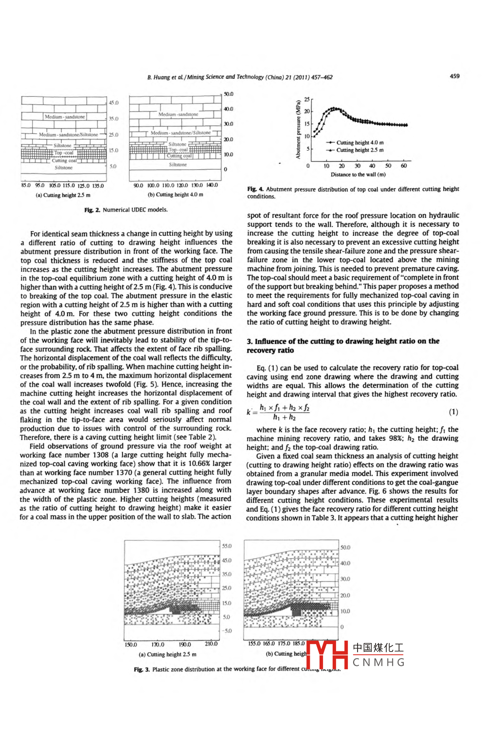 Mining Science and Technology( China)21(2011)457-462Contents lists available at Science DirectMining Science and Technology( china)ELSEVIERjournalhomepagewww.elsevier.com/locate/mstcRational cutting height for large cutting height fully mechanized top-coal cavingHuang Bingxiang Li Hongtao, Liu Changyou Xing Shijun Xue Weichao aSchool of mines, China University of Mining 6 Technology, Xuzhou 221116, chinaCollege of Safery Engineering, North China Universiry of Science and Technology, Beijing 101601. ChinaXinglongzhuang Coal Mine, Yankuang Coal Group, Zoucheng 273500, ChinaARTICLE INFOABSTRACTLarge cutting height fully mechanized top-coal caving is a new mining method that improves recoveryReceived 30 August 2010atio and single-pass production. It also allows safe and efficient mining. a rational cutting height isReceived in revised form 12 october 2010Accepted 27 December 2010one key parameter of this technique. Numerical simulation and a granular-media model experiment wereAvailable online 15 June 2011used to analyze the effect of cutting height on the rock pressure of a fully mechanized top-coal cavingwork face. The recovery ratio was also studied. As the cutting height increases the top-coal thicknessis reduced. Changing the ratio of cutting to drawing height intensifies the face pressure and the top-coaLarge cutting height fully mechanizedshattering. a maximum cutting height exists under a given set of conditions due to issues with surround-ing rock-mass control. An increase in cutting height makes the top-coal cave better and the recovery ratiowhen drawing top-coal is then improved. a method of adjusting the face rock pressure is presentedhe ratio of cutting height to drawing heightChanging the cutting to drawing height ratio is the technique used to control face rock pressure. TheGround pressurerecovery ratio when cutting coal exceeds that when caving top-coal so the face recovery ratio may be:covery ratIoimproved by over sizing the cutting height and increasing the top-coal drawing ratio. An optimum ratioof cutting to drawing height exists that maximizes the face recovery ratio. a rational cutting height isdetermined by comprehensively considering the surrounding rock -mass control and the recovery ratioAt the same time increasing the cutting height can improve single pass mining during fully mechanizedtop-coal caving.e 2011 Published by Elsevier B V. on behalf of China University of Mining Technology(6)Improved recovery ratios and productivity. therefore this isa new path for fully mechanized top-coal caving that willUsing a cutting height greater than 3. 5 m during top- coal fullyimprove the recovery ratio and productivity and will achievemechanized caving creates conditions for safely and efficientlysafe and efficient mining.mining thick and extra thick seams. the advantages of large cuttingheight, fully mechanized top-coal caving( Fig. 1)are:Stability control at the tip-to-face area and support equipmentfor large cutting height fully mechanized caving have been much(1)Improved caving characteristicsimproved after extensive theoretical and practical research [ 1-6](2)The use of high-powered coal cutters and front and rear This technique has now made very important breakthroughs inconveyors.cutting height, cutting angle, and hardness of the coal seam, etc.(3)An increase in the number of drawing ports and a shorter For example. in December 2009, a fully mechanized working facenumber 22303 of the Bulianta Coal Mine, Shendong, china, the(4)Increased ventilation sectional area and reduced air resis- Worlds first 7 m cutting height, fully mechanized working faceprocess time for drawing.tance, which helps dilute coal gas in the drawing port and is about 25 for this device. Given an extremely soft and thick seam(5)Shorter cycle time at the working face and improved this working face achieved a 5 m cutting height by using steppedadvance ratescutting technology [7). These techniques were tested in theXinglongzhuang Coal Mine in 2006 and since then studies havebeen done related to rock pressure and the flow of coal gangue[8, 9 Today it is being promoted in a number of mines and hasbeen applied to soft and thick seams successfully [10].4 Corresponding author Tel +86 516 83885662The heightessar for this technique causes theE-mail address: huangbingxiangecumt educn(B, Huang).stability of the wal中國(guó)煤化工 e grade relative to1674-5264/S-see front matter o 2011 Published by Elsevier B V on behalf of China University of Mining TeCNMHGdai:101016/ j. mstc.201105.020B. Huang et aL/ Mining Science and Technology(China)21(2011)457-462Shortens drawinghigh-powerconveyorIncreases the numberof drawing portmproves the recovery raFig 1. Important aspects of large cutting height fully mechanized mining with sublevel caving.a general cutting height fully mechanized top-coal caving methodOn both sides the model has coal rocks. These are simplified as a[11-17]. In a given seam the drawing height decreases in propor- displacement boundary that allows movement in the y directiontion to the increase in cutting height. The cutting recovery ratio while the x direction acts as a fixed hinge bearing, that is to sayis larger than the top-coal drawing ratio, which makes the recoveryratio of a large cutting height working face larger than normal. But u=0is the larger cutting height better from the standpoint of increasingthe recovery ratio at the face?The effect of cutting to drawing height ratio on stope pressureAt the same time, stability control requirements of the rock model(Fig. 2).for the same thickness coal seam was analyzed by two kinds ofsurrounding the working face limits the maximum cutting height.Therefore, it is necessary to determine a rational cutting height forfully mechanized top-coal caving.Model 1: The machine cutting height is 2.5 m, the top-coalthickness is 6.0 mModel 2: The machine cutting height is 4.0 m, the top-coal2. Ratio of cutting height to drawing height: the impactthickness is 4
