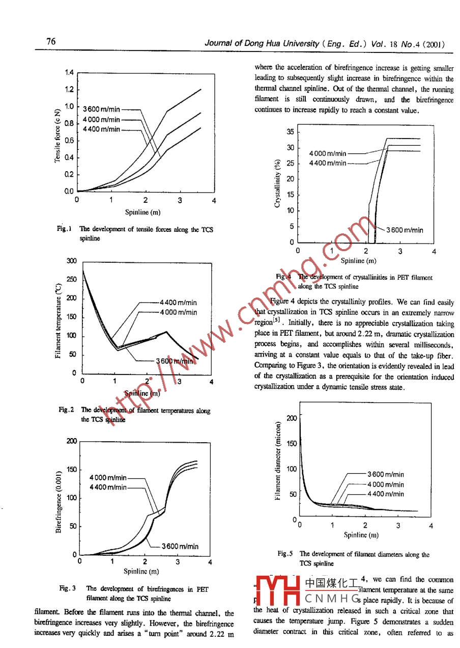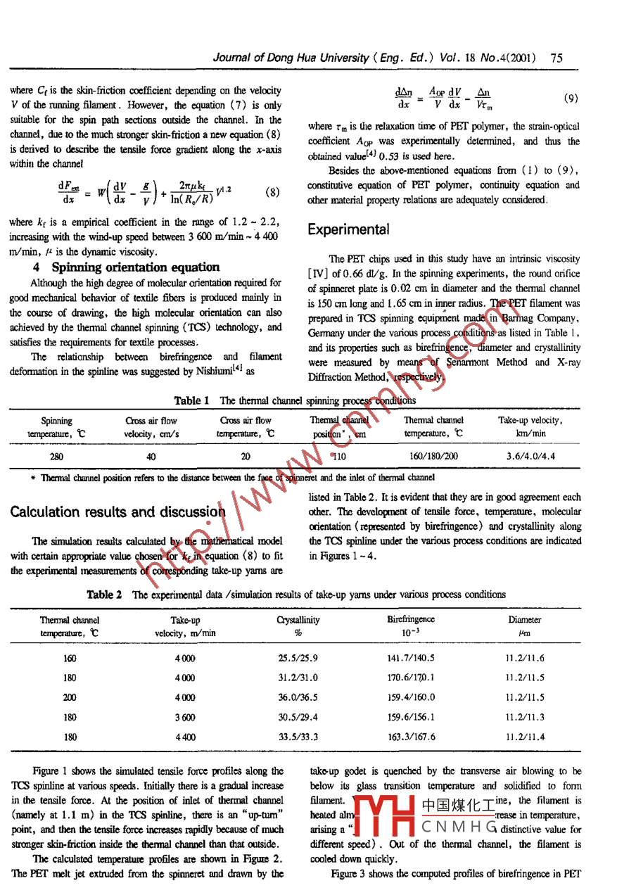 74Journal of Dong Hua University ( Eng. Ed.) Vol. 18 No .4 (2001)Theoretical Analysis of TCS with a Comparison to HGS inCharacteristicsHou Peimin(侯培民)Sinope Shanghai Petrochemical Limited, Shconghai , 200540A theoretical analysis of TCS is provided to explain thegnadient along the x axis can be described asstructure evolution along the flament during processing.This amalysis based on the spinning process kinematics業(yè)。_ 2πRh(r- ro)+ AH d1)dx=- WC,Cp dxincorporates the constitutive equation of PET polymer, aconvection and radiation combining procedure in thewhere h is convective heat transfer coefficient correlated with thethermal channel, and taking into account thefilament running velocity V and coss-fIow cooling air speed V,nonisothermal crystallization kinetics. The characteristicsdeveloped by Kase and Matsuo2 asof the fiber so-produced are compared with thoseproduced by HGS.h = 0.473 x 10~4(VA).34[1 + (8VJ/V)2]0.167 (2)Keywords: Themal Channel Spinning; Hot Godet Spinning;In the themmal chanel, the nadiant heat transfer between filamentHigh speed spinningand themal channel will also play an important role as theNotwithstanding that the so-called super-high-speed spinningconvective heat transfer between flament surface and heated airat the take up speed above 6000 m/min and up to 10 000 m/minflow while the nning filament moves rapidly within the theralcan produce fully oriented yarm (FOY) by the spinline reactingchannel, thereby, the nning filament temperature T satisfies thesolely with air friction and inertia, it is still necessary for procsesfollowing diferential reltionship:running at about 4 000 m/min to draw the spun yam, which isdT_ 2πReC;2xRaOH業(yè)parially oriented (POY), in a later stage to obtain desinabledx=~ WCp(TW- %) -WC(T-To)+Tdxtensile properties.3)Alemaively, the process of melt spinning PET flament atmedium high speeds can be modifed through the inclusion of awhere the radiation energy fllows Stefan-Bolumann's law.thermal channel enclosing the spinline wih air stream initally atn the spin path scction between the outlet of themnal channelroom temperature sucked into the channel by the high speedand the winding point, the heat transfer equation is identical l0 thatflament as a medium to create a contact-free recheating. Theof equation (1), but with a dfferent cofficient h{2] for spinningheated channel rdiates toward the filament, while the air streanwithout transverse air flows.exchanges the heat between them convcively. The commercialh= 6.85 x 10~*( V2/W)0.259(4)PET yams produced by the themal channel spinning (TCS)technology possess a high tenacity, high molecular orientation and2 Crystallization kinetic equationmid-level crsailiniy (about 30% ~ 40%) . Obviously, TCSThe generalized Avrami equation in previous papers-3J reads:offers a single step integated process with minimum machinemodification and cost.g=1-0p{- (*"(0nd)'}(5)Basic principlewith its diferenial fom as fllows:The basic principle to describe the TCS process in PET high-speed melt spinning is built upon the regular goverming equationstal想∞0氣(。合山)“c(-(告0) (6)of the thin-theory and heat transfer equations with specific3 Force balance equationconsideratioms related to the themnal channel as well s theIt is well known that the differential relationship of tensilerheological and consitutive relations.force gradient distribution along the regular high-speed melt1 Heat transfer equations中國煤化工:The whole TCS spinline can be divided into three parts withdistinctive heat transfer mechanism. In the section betwen theTHCNMHG) + πRVpoCq(7)face of spinneret and the inlet of thermal channel, the temperaturedx\dx VReceivred Sep.20,2000Jourmal of Dong Hua University (Eng. Ed.) Vol. 18 No.4(200) 75where Cr is the skin- friction coffcient depending on the velocitydn = Aopd_ An(9)V of the running filament . However, the cequation (7) is onlydsuitable for the spin path sections outside the channel. In thechannel, due to the much stronger sin-rction a new equation (8)where τm is he relaxation time of PET polymer, the strain-opticalceffcient Aop was experimentally determined, and thus theis derived to describte the tensile force gradient along the x-axisobtained valuel4) 0.53 is used here.within the channelBesides the above-mentioned equations from (1) to (9),2ryk v.2(8)constiutive equation of PET polymer, continuity equaion andlxln( R./R)other material property relations are adequately considered.where kt is a empirical coefficient in the range of 1.2~ 2.2,Experimentalincreasing with the wind-up speed between 3 600 m/min ~ 4 400m/min, μ is the dynamic viscosity.The PET chips used in this study have an intinsic viscositySpinning orientation equation[IV] of 0.66 dl/g. In the spinning experiments, the round orifceAlthough the high degree of molecular orientation required forof spinneret plate is 0.02 cm in diameter and the thermal channe!good mechanical behavior of textile fibers is produced mainly inis 150 cm long and 1.65 cm in inner nadius. The PET flamnent wasthe course of drawing, the high molecular orientation can alsoprepared in TCS spining eaquiprnent made in Barmag Company,achieved by the themal channel spinning (TCS) technology, ancGermany under the various process conditions as listed in Table I,satisfies the requirements for textile processes.and its properties such as birefringence, diameter and crytallinityThe relationship between birefringence and flamentwere measured by means of Senammont Method and X-raydeformation in the spinline was suggested by Nishiuniltl asDifraction Method, respectively.Table 1 The themal channel spinning process conditionsSpinningCross air flowThemal channelTake-up velocity,1emperaturt,velocity, cm/stenperature, Cposition" . cntemperalure, 它km/min2804020110160/180/2003.6/4.0/4.4Themal channel position refters如the distance between he face of spinneret and the inle of themal channedlisted in Table 2. It is evident that they are in good agr