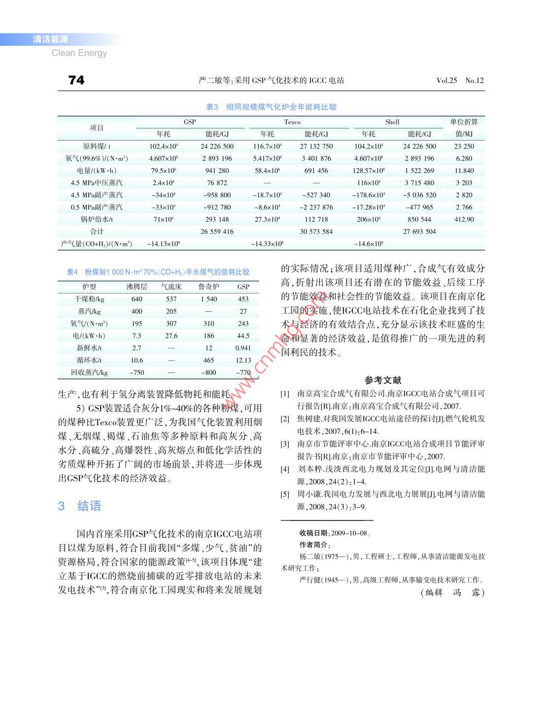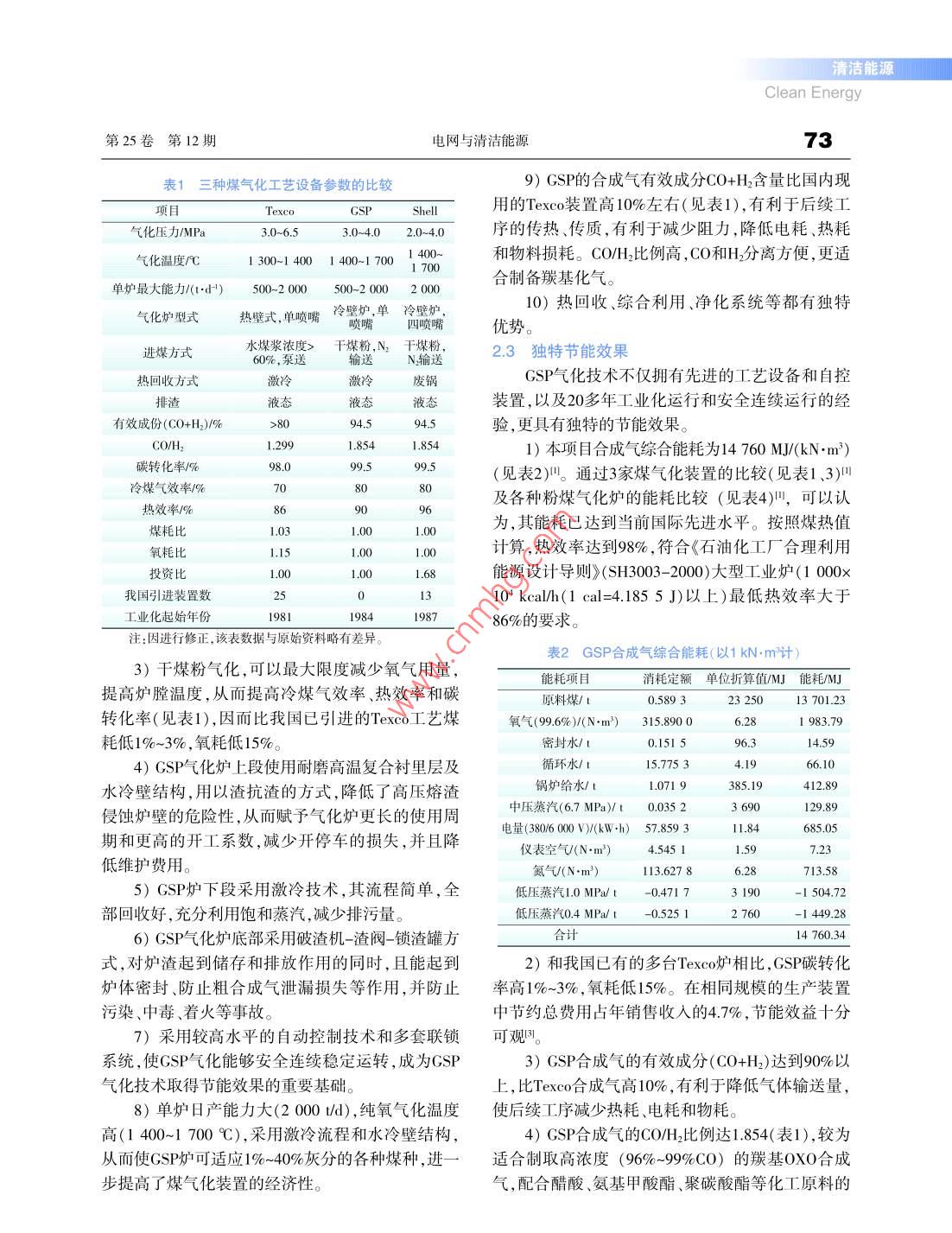 清潔能源Clean Energy第25卷第12期電網(wǎng)與清潔能源Vol.25 No.122009年12月Power System and Clean EnergyDec, 2009文章編號(hào): 1674- -3814( 2009 )12-0070-05中圖分類號(hào):TM611文獻(xiàn)標(biāo)志碼:A采用GSP氣化技術(shù)的IGCC電站嚴(yán)二敏',嚴(yán)行健2(1.東亞電力管理咨詢(南京)有限公司,南京 210008; 2.江蘇省電機(jī)工程學(xué)會(huì),南京210024)IGCC Power Plant Using GSP Gasification TechnologyYAN Er-min', YAN Xing-jian?(1.East Asia IPower Management Consulting (Nanjing) Co.,Ltd., Nanjing 210008, Jiangsu Province, China;2.Jiangsu Society of Electrical Enginering, Nanjing 210024, Jiangsu Province, China)ABSTRACT: Coal gasification technology, equipment and tech-1 900 944 kN.m/a。該合成氣為南京IGCC電站和該化工園醋酸、精細(xì)化工染料等產(chǎn)業(yè)提供生產(chǎn)燃料和IGCC power plants were analyed comprehensively for wet and dry原料,順應(yīng)了南京化工園區(qū)經(jīng)濟(jì)發(fā)展的需求。coal gasification technology by research and study, with the NanjingChemical Industry Park petrochemical enterprises, it is suitable to1國外IGCC電站的煤氣化工藝主要choose GSPdry gas tchnology in Nanjing Chemical Industry Park.KEY WORDS: IGCC power station; coal gasification techno-特點(diǎn)logy; GSP gasification technology摘要:通過調(diào)研、考察,綜合分析了濕法和干法兩種煤氣化工.1 國外IGCC電站發(fā)展概況藝、設(shè)備技術(shù)特點(diǎn)和經(jīng)濟(jì)效益及在IGCC電站的應(yīng)用情況,結(jié)IGCC潔凈煤發(fā)電技術(shù)自20世紀(jì)70年代初期研合南京化工園的石化企業(yè)實(shí)際,認(rèn)為選擇采用CSP干法煤氣發(fā)開始,至今已有30多年歷史。由于技術(shù)復(fù)雜,特別化技術(shù)在南京化工園內(nèi)IGCC電站應(yīng)用是合適的。是建廠投資居高不下,致使至今正式投人商業(yè)運(yùn)營的純發(fā)電的煤基IGCC電站為數(shù)不多?!罢酵度松剃P(guān)鍵詞: IGCC電站;煤氣化技術(shù);GSP氣化技術(shù)業(yè)性示范運(yùn)行的純發(fā)電的煤基ICCC電站只有4座,它們是:Wabash River IGCC電站( 美國),Tampa) 引言IGCC電站(美國), Buggemun IGCC電站(荷蘭)和Puertollano IGCC電站(西班牙)”121。國內(nèi)首座采用GSP干法煤氣化技術(shù)的IGCC電站與此同時(shí),IGCC發(fā)電技術(shù)卻在石化企業(yè)中找到擬于2010年在南京開工建設(shè),將由南京蘭天燃?xì)鉄崃思夹g(shù)與經(jīng)濟(jì)的有效結(jié)合點(diǎn),這就是在20世紀(jì)90年代電有限公司在南京化學(xué)工業(yè)園投資建成。工程為熱興起的以煤氣化技術(shù)為核心的多聯(lián)產(chǎn)能源系統(tǒng)的建電聯(lián)供,“本期建設(shè)1套200~230 MW(1x150 ~170 MW立。因?yàn)槭髽I(yè)中本來就必須設(shè)置以氧氣為氣化劑等級(jí)燃機(jī)+1x50-60 MW蒸汽輪機(jī))燃?xì)庹羝?lián)合循的煤(或渣油及石油焦)氣化裝置和煤氣凈化系統(tǒng),及環(huán)機(jī)組,規(guī)劃按2套200-~230 MW(2x150 MW~170 MW合成氣后續(xù)產(chǎn)品,如一氧化碳、氫氣等可作為某些石等級(jí)燃機(jī)+2臺(tái)余熱鍋爐+2x50~60 MW蒸汽輪機(jī))化產(chǎn)品(醋酸、甲醇等)的主要原料;高硫渣油瀝青或機(jī)組考慮”。南京IGCC電廠以煤炭作為制備合成石油焦是廉價(jià)燃料。企業(yè)本身需要耗用大量的電能和氣的原料,采用GSP干法氣化技術(shù),年產(chǎn)合成氣能力蒸汽,因而煤基IGCC發(fā)電技術(shù)在石化企業(yè)中的應(yīng)用必然會(huì)帶來規(guī)模經(jīng)濟(jì)的效應(yīng),使整個(gè)企業(yè)的經(jīng)濟(jì)效益基金項(xiàng)目:清潔能源產(chǎn)業(yè)發(fā)展基金(HB02501)。得到提高,同時(shí)能改善環(huán)保質(zhì)量?!白?995年以來這種清潔能源Clean Energy第25卷第12期電網(wǎng)與清潔能源71以煤氣化為核心的多聯(lián)產(chǎn)能源系統(tǒng)已經(jīng)投運(yùn)了近20H2、CO2、H2O .CH4、H2S和N2 , 此外,還有少量的NH3、套,其中以意大利的ISAB、Salux/Enron和API Energia COS 、HCN和飛灰。由于采用水煤漿進(jìn)料,煤氣中的項(xiàng)目最具威名,它們的IGCC的發(fā)電功率分別為.水蒸汽含量較高。512 MW、550 MW與280 MW,發(fā)電容量比前述4座純氣化爐內(nèi)設(shè)耐火磚(一般為4層),內(nèi)徑約4.0 m,粹以發(fā)電為目標(biāo)的煤基IGCC電站還要大”四。又如高約30 m。氣化反應(yīng)的速度很快,粗煤氣在氣化爐“1997年投運(yùn)的美國Eastman Chemical Co.項(xiàng)目在生內(nèi)的停留時(shí)間一般為2~3 s。熱煤氣離開氣化爐進(jìn)入產(chǎn)甲醇的同時(shí),還兼發(fā)350 MW的電,在備用1臺(tái)氣化特殊設(shè)計(jì)的輻射式冷卻器,使熱煤氣的溫度降低至爐的前提下,使全廠的運(yùn)行可用率高達(dá)98%”,更證明700 C,同時(shí)使熱煤氣中的溶融態(tài)渣凝固。冷卻后的了在石化企業(yè)中IGCC多聯(lián)產(chǎn)系統(tǒng)的高度可靠性和商粗煤氣進(jìn)入對(duì)流式冷卻器中被進(jìn)一步冷卻到業(yè)化前景。480 C。煤氣中的顯熱在冷卻器中得到回收,產(chǎn)生1.2 國外煤氣化工藝特點(diǎn)10.4 MPa的高壓飽和蒸汽。氣化爐與輻射式冷卻器當(dāng)前,國內(nèi)外的IGCC電站采用兩大類煤氣化工故成-體,外徑約5 m,高約39 m,總重約900t,氣化藝:一類是以Texa Co(本文簡稱Te)和IDestec(本文簡爐安裝標(biāo)高約106.75 m。稱De)為代表的濕法煤氣化工藝;另一類是以Shellt :3)排渣和黑水處理系統(tǒng)。主要設(shè)備:壓力鎖斗(本文簡稱Sh)和GSP為代表的干法煤氣化工