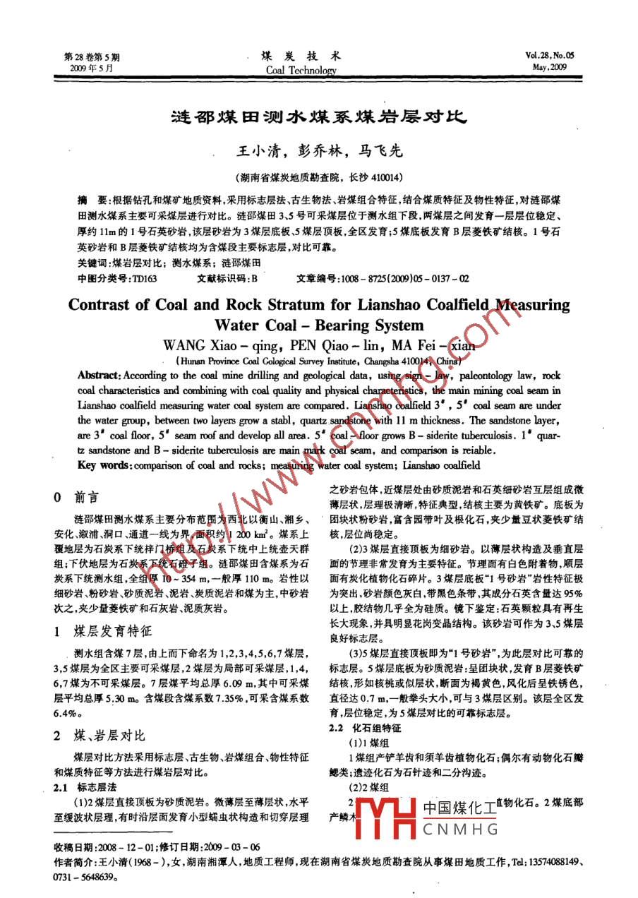 第28卷第5期煤炭技術(shù)Vol.28,No.052009年5月Coal TechnologyMay,2009漣邵煤田測水煤系煤巖層對比王小清,彭喬林,馬飛先(湖南省煤炭地質(zhì)勘查院,長沙410014)滴要:根據(jù)鉆孔和煤礦地質(zhì)資料,采用標(biāo)志層法古生物法、巖煤組合特征,結(jié)合煤質(zhì)特征及物性特征,對漣邵煤田測水煤系主要可采煤層進(jìn)行對比。漣邵煤田3、5號可采煤層位于測水組下段,兩煤層之間發(fā)育一層層位穩(wěn)定、厚約11m的1號石英砂巖,該層砂巖為3煤層底板.5煤層頂板,全區(qū)發(fā)育;5煤底板發(fā)育B層菱鐵礦結(jié)核。1號石英砂巖和B層菱鐵礦結(jié)核均為含煤段主要標(biāo)志層,對比可靠。關(guān)鍵詞:煤巖層對比;測水煤系;漣邵煤田中圍分類號:TD163文獻(xiàn)標(biāo)識碼:B文章編號:1008 - 87252009)05 - 0137- 02Contrast of Coal and Rock Stratum for Lianshao Coalfield MeasuringWater Coal - Bearing SystemWANG Xiao- qing, PEN Qiao- lin, MA Fei - xian(Hunen Province Coal Gological Survey Instirute, Changpha 410014, China)Abstract: According to the coal mine dilling and geological data, using sign - law, paleontology law, rockcoal characteristics and combining with coal quality and physical characteristics, the main mining coal seam inLianshao coalfield measuring water coal system are compared. Lianshao coalfield 3* , 5' coal seam are underthe water group, between two layers grow a stabl, quartz sandstone with 11 m thickness. The sandstone layer,are3" coal floor, 5' seam roof and develop all area. 5* coal - floor grows B - siderite tuberculosis. 1' quar-z sandstone and B - siderite tuberculosis are main mark coal seam, and comparison is reiable.Key words: comparison of coal and rocks; measuring water coal system; Lianshao calfield之砂巖包體.近煤層處由砂質(zhì)泥巖和石英細(xì)砂巖互層組成微0前言薄層狀,層理極清晰,特征典型,結(jié)核主要為黃鐵礦。底板為漣邵煤田測水煤系主要分布范圍為西北以衡山、湘鄉(xiāng)、” 團(tuán)塊狀粉砂巖,富含園帶葉及根化石,夾少量豆?fàn)盍忤F礦結(jié)安化、溆浦洞口、通道一線為界,面積約 1 200 kn'。煤系上核,層位尚穩(wěn)定。覆地層為石炭系下統(tǒng)梓門橋組及石炭系下統(tǒng)中上統(tǒng)壺天群(2)3煤層直接頂板為細(xì)砂巖。以薄層狀構(gòu)造及垂直層組;下伏地層為石炭系“下統(tǒng)石磴子組。漣邵煤田含煤系為石面的節(jié) 理非常發(fā)育為主要特征。節(jié)理面有白色附著物,順層炭系下統(tǒng)測水組,全組厚10~ 354 m,一般厚110 m。巖性以面有炭化植物化石碎片。3煤層底板“1號砂巖”巖性特征極細(xì)砂巖、粉砂巖砂質(zhì)泥巖、泥巖、炭質(zhì)泥巖和煤為主,中砂巖為突 出,砂巖顏色灰白帶黑色條帶,其成分石英含量達(dá)95%次之,夾少量菱鐵礦和石灰?guī)r、泥質(zhì)灰?guī)r。以上,膠結(jié)物幾乎全為硅質(zhì)。鏡下鑒定:石英顆粒具有再生長大現(xiàn)象,并具明顯花崗變晶結(jié)構(gòu)。該砂巖可作為3.5煤層1煤層發(fā)育特征良好標(biāo)志層。測水組含煤7層,由上而下命名為1,2,3,4,5,6,7煤層,(3)5煤層直接頂板即為“1號砂巖”,為此層對比可靠的3,5煤層為全區(qū)主要可采煤層,2煤層為局部可采煤層,1,4,標(biāo)志層。 5煤層底板為砂質(zhì)泥巖:呈團(tuán)塊狀,發(fā)育B層菱鐵礦6,7煤為不可采煤層。7層煤平均總厚6.09 m,其中可采煤結(jié)核,形如核桃或似層狀,斷面為褐黃色,鳳化后呈鐵銹色,層平均總厚5.30 m。含煤段含煤系數(shù)7.35% ,可采含煤系數(shù)直徑達(dá)0.7 m,一般拳頭大小,可與3煤層區(qū)別。該層全區(qū)發(fā)6.4%。育,層位穩(wěn)定,為5煤層對比的可靠標(biāo)志層。2.2化石組特征2煤、巖層對比(1)1煤組煤層對比方法采用標(biāo)志層、古生物、巖煤組合、物性特征1煤組產(chǎn)鏟羊齒和須羊齒植物化石;偶爾有動物化石瓣和煤質(zhì)特征等方法進(jìn)行煤巖層對比。鰓類;遺跡化石為石針跡和二二分溝跡。2.1 標(biāo)志層法(2)2煤組(1)2煤層直接頂板為砂質(zhì)泥巖。微薄層至薄層狀,水平中國煤化工直物化石。2煤底部至緩波狀層理,有時(shí)沿層面發(fā)育小型蠕蟲狀構(gòu)造和切穿層理產(chǎn)鱗:MHCNMHG收稿日期:008- 12-01;倍訂日期:2009-03-06作者簡介:王小清( 1968 - ),女,湖南湘潭人,地質(zhì)工程師,現(xiàn)在湖南省煤炭地質(zhì)勘查院從事煤田地質(zhì)工作, Tel: 135740881490731 - 5648639。●138.煤炭技術(shù)第27卷(3)3煤組2煤層:HCC幅值-般在20~ 25 r/me,HG幅值- -般在33媒頂部產(chǎn)鱗木、亞鱗木、古蘆木、鏟羊齒須羊齒和楔羊~4 r/me。在HGG曲線上為高尖峰異常,在HG曲線上為尖齒等植物化石。峰低值異常。(4)5 煤組3煤層:HC幅值-般在30~ 40 r/me, HG幅值- -般在35煤頂部產(chǎn)鱗木、亞鱗木、古蘆木等植物化石。5煤底部-4 r/mc。在HGG曲線上為高寬起伏不規(guī)則異常,在HG曲遺跡化石為漫移跡和二分溝跡。線上則為低寬異常。2.3巖煤組合法5煤層:HGG幅值- -般在35 ~ 45 r/me,在所有煤層中一2.3.1各巖堞組特征般為最高. HG幅值-般在2~3 r/me,在所有煤層中一般為最(1)1媒組以砂質(zhì)泥巖、泥巖為主,泥質(zhì)結(jié)構(gòu),塊狀構(gòu)造;2低,在HCG曲線上為高寬帶齒曲線,煤層下部曲線幅值相對煤組以其煤層上部砂質(zhì)泥巖發(fā)育清晰的微薄~薄層狀水平上部逐漸降低。層理為主顯著特征;3煤組以石英砂巖或雜砂巖比較發(fā)育;4(3)煤質(zhì)對比煤組巖性比較簡單,一般在砂巖下直接發(fā)育4煤層;5煤組合2煤層為低中灰低中硫