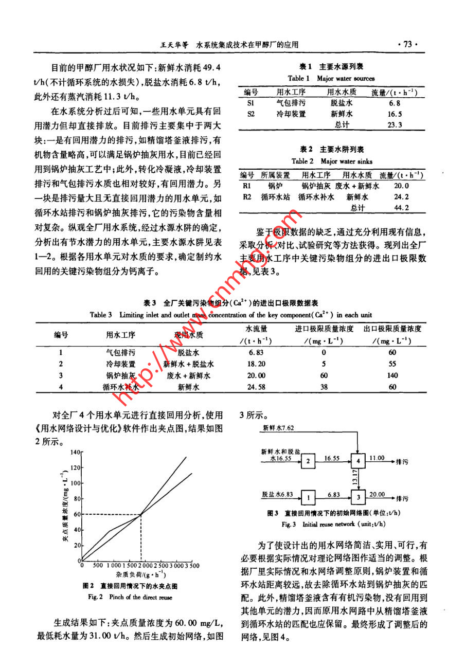 第36卷第4期化學工程Vol. 36 No.42008年4月CHEMICAL ENGINEERING( CHINA)Apr.2008水系統(tǒng)集成技術在甲醇廠的應用王天華,馮霄(西安交通大學化學工程系,陜西西安710049)摘要:水系統(tǒng)集成技術是把整個工業(yè)用水系統(tǒng)作為-一個整體來看待,并考慮水質(zhì)、水量的分配,從而使系統(tǒng)用水的重復利用率達到最大,同時廢水排放量最小。甲醇企業(yè)是用水和廢水排放的大戶,將水系統(tǒng)集成技術應用于甲醇工業(yè),具有重要意義。文中結合水系統(tǒng)集成技術的工業(yè)應用現(xiàn)狀,總結了水系統(tǒng)集成技術在工業(yè)企業(yè)中應用的-般步驟,具體分為以下幾步:選定目標系統(tǒng),明確水源水阱,確定關鍵污染物組分和極限進出口依度,生成初始網(wǎng)絡和用水網(wǎng)絡調(diào)優(yōu)。并以某甲醇廠簡化的用水系統(tǒng)為實例.采用文中所提出的一般應用步驟,對用水網(wǎng)絡進行了優(yōu)化,獲得了新鮮水節(jié)水率達34. 5%的節(jié)水效果。關鍵詞:水系統(tǒng)集成;甲醇廠;夾點技術中圖分類號:TQ 021.8文獻標識碼:A文章編號:1005-9954(2008 )040071-04Application of water system integration technique in a methanol plantWANG Tian-hua, FenG Xiao(Department of Chemical Engineering, Xi' an Jiaotong University , Xi' an 710049 , Shaanxi Province, China)Abstract: W ater system integration considers how to alcatle water in a water system with the water utilizationprocesses in a plant treated as an organic whole, and thus increasing water reuse and decreasing wastewalerdischarge. Methanol industries consume a large amount of freshwaler and discharge a large amount of wastewater.So the application of water system integration in methanol plants is very important. Combined with the present statusof application of water system integration, the general steps about the aplication of water system integration irindustries were summarized. The major steps are as follows: selecting the system, speifying water source8 andwater sinks, determining the key contaminants and the limiting inlet and outlet concentrations of contaminants,generating the initial network , and adjusting the water network. The application of water system integration in amethanol plant was discussed by using the steps proposed. At last, the optimal design of water utilization networkswas achieved by combination of water pinch analysis and mathematical programming, and a good result of saving34. 5% freshwater was obtained.Key words :water system integration; methanol plant; pinch technology隨著工業(yè)生產(chǎn)的發(fā)展,水資源匱乏及污染加劇水夾點技術)與數(shù)學規(guī)劃法。已嚴重制約著經(jīng)濟的發(fā)展。與此同時,國內(nèi)許多工水夾點技術于20世紀90年代中期提出,主業(yè)企業(yè)的新鮮水單耗廢水單排均比工業(yè)發(fā)達國家要適用于單雜質(zhì)用水系統(tǒng),是水系統(tǒng)集成技術中使大,節(jié)水減排已成為企業(yè)發(fā)展過程中不能回避的重用最為廣泛的方法之一。它是將用水單元操作簡化要問題之一。為一個從富雜質(zhì)過程流股到水流股之間的質(zhì)量傳遞水系統(tǒng)集成技術就是把整個用水網(wǎng)絡作為一個過程。水夾點可以給出用水系統(tǒng)的瓶頸。.整體來對待,考慮如何分配各用水單元的水量和水數(shù)學規(guī)劃法( -1] 主要用于多雜質(zhì)復雜系統(tǒng)中,質(zhì),使系統(tǒng)的重復利用率達到最大,同時廢水排放量能有效地優(yōu)化用水網(wǎng)絡,并且可以同時得到系統(tǒng)的達到最小。最優(yōu)目標值和達到該目標值的相應的水網(wǎng)絡。水系統(tǒng)集成方法可分為兩大類,即圖示法(如水系統(tǒng)集成技術已經(jīng)成功地應用于煉油廠[5、基金項目:國家自然科學基金資助項目(20436040)作者簡介:王天華(1984-) ,男,碩士研究生,研究方向為水系統(tǒng)集成,電話:(029 )82668980;馮霄通訊聯(lián)系人,E mail:xfeng@ mil. xjtu.edu. cn?;瘜W工程2008 年第36卷第4期氯堿廠、熱電廠中,節(jié)水率達20%- 30%。 英國通過分析.對比、簡化、假設等手段"來完善。Monsonto 公司1995年對7套生產(chǎn)裝置進行了水夾1.5 生成初始網(wǎng)絡點分析與應用,取得了節(jié)水30% ,減少污水處理量實際上,企業(yè)的水供應及廢水排放管網(wǎng)要復雜75% ,減少投資費用1 150萬美元的效果(6]。得多,且系統(tǒng)-般為多雜質(zhì)的情況。為了生成水系甲醇是重要的大宗的化工原料,甲醇企業(yè)是用統(tǒng)的初始網(wǎng)絡,需要專門的水系統(tǒng)集成建模與集成水和廢水排放的大戶,但水系統(tǒng)集成技術在甲醇工工具軟件來完成這項工作,如美國Aspen Tech開發(fā)業(yè)的應用研究,至今還未見報道。的Aspen Water8] 和Linnhoff March 公司開發(fā)的本文首先總結了水系統(tǒng)集成技術在工業(yè)企業(yè)中Water Target[9)就是這樣的工具軟件。應用的一-般步驟,然后,采用水系統(tǒng)集成技術對某甲將用水單元的極限數(shù)據(jù)代人到水系統(tǒng)集成建模醇廠的水系統(tǒng)進行了優(yōu)化集成。與集成工具軟件中,生成用水網(wǎng)絡,即為初始網(wǎng)絡,初始網(wǎng)絡通常需要調(diào)優(yōu)。1水系統(tǒng)集成工業(yè)應用的一般步驟1.6用水網(wǎng)絡 調(diào)優(yōu)水系統(tǒng)集成在工業(yè)中的應用大致分為如下6步為了使網(wǎng)絡簡潔、實用、可行,對初始網(wǎng)絡作適進行。當?shù)恼{(diào)整很有必要。1.1 選定目標系統(tǒng)調(diào)整原則通常如:①優(yōu)先考慮同一車間或裝置水系統(tǒn