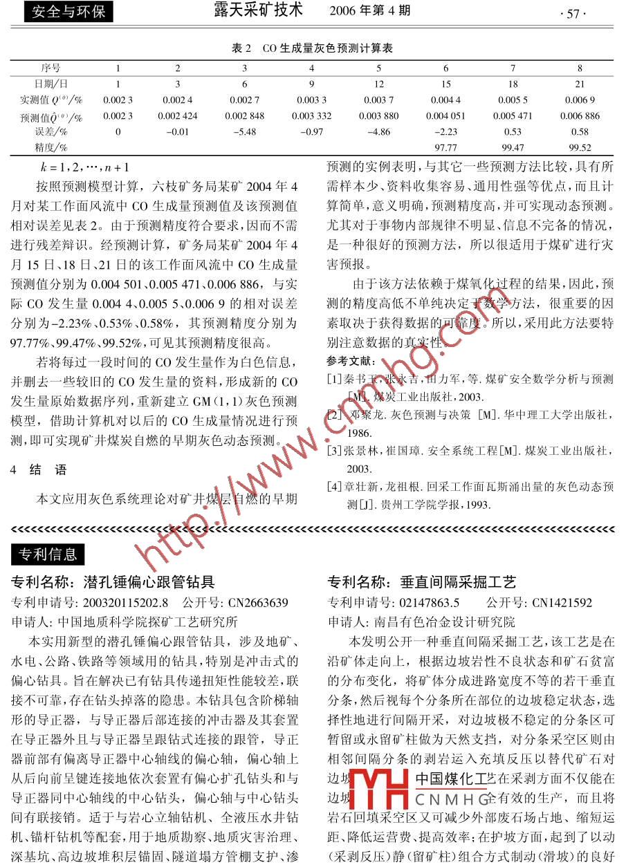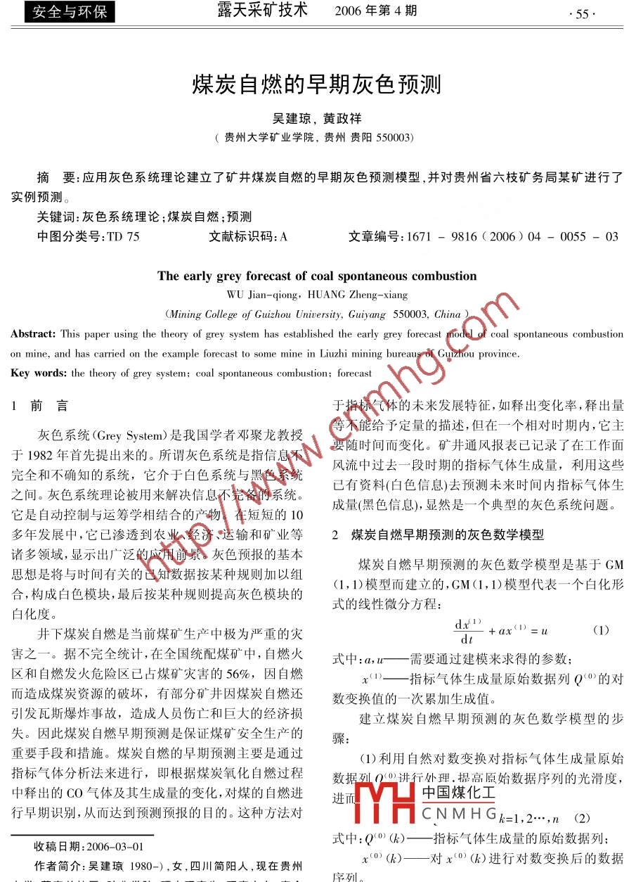 安全與環(huán)保露天采礦技術(shù)2006年第4期.55●煤炭自燃的早期灰色預(yù)測(cè)吳建瓊,黃政祥(貴州大學(xué)礦業(yè)學(xué)院,貴州貴陽(yáng)550003)摘要:應(yīng)用灰色系 統(tǒng)理論建立了礦井煤炭自燃的早期灰色預(yù)測(cè)模型,并對(duì)貴州省六枝礦 務(wù)局某礦進(jìn)行了實(shí)例預(yù)測(cè)。關(guān)鍵詞:灰色系統(tǒng)理論;煤炭自燃;預(yù)測(cè)中圖分類(lèi)號(hào):TD 75文獻(xiàn)標(biāo)識(shí)碼:A文章編號(hào):1671 - 9816 (2006)04 - 0055 - 03The early grey forecast of coal spontaneous combustionWU Jian-qiong,HUANG Zheng-xiang(Mining College of Guizhou University, Guiyang 550003, China )Abstract: This paper using the theory of grey system has established the early grey forecast model of coal spontaneous combustionon mine, and has carried on the example forecast to some mine in Liuzhi mining bureaus of Guizhou province.Key words: the theory of grey system; coal spontaneous combustion; forecast1前言于指標(biāo)氣體的未來(lái)發(fā)展特征,如釋出變化率,釋出量灰色系統(tǒng)(GreySystem)是我國(guó)學(xué)者鄧聚龍教授等不能給予定量的描述,但在-一個(gè)相對(duì)時(shí)期內(nèi),它主于1982年首先提出來(lái)的。所謂灰色系統(tǒng)是指信息不要隨時(shí)間而變化。礦井通風(fēng)報(bào)表已記錄了在工作面完全和不確知的系統(tǒng),它介于白色系統(tǒng)與黑色系統(tǒng)風(fēng)流中過(guò)去一段時(shí)期的指標(biāo)氣體生成量,利用這些之間?;疑到y(tǒng)理論被用來(lái)解決信息不完備的系統(tǒng)。已有資料(白色信息)去預(yù)測(cè)未來(lái)時(shí)間內(nèi)指標(biāo)氣體生它是自動(dòng)控制與運(yùn)籌學(xué)相結(jié)合的產(chǎn)物。在短短的10成量(黑色信息),顯然是--個(gè)典型的灰色系統(tǒng)問(wèn)題。多年發(fā)展中,它已滲透到農(nóng)業(yè)、經(jīng)濟(jì)、運(yùn)輸和礦業(yè)等2煤炭自燃早期預(yù)測(cè)的灰色數(shù)學(xué)模型諸多領(lǐng)域,顯示出廣泛的應(yīng)用前景?;疑A(yù)報(bào)的基本煤炭自燃早期預(yù)測(cè)的灰色數(shù)學(xué)模型是基于GM思想是將與時(shí)間有關(guān)的已知數(shù)據(jù)按某種規(guī)則加以組(1,1)模型而建立的,GM(1,1)模型代表一個(gè)白化形合,構(gòu)成白色模塊,最后按某種規(guī)則提高灰色模塊的式的線性微分方程:白化度。井下煤炭自燃是當(dāng)前煤礦生產(chǎn)中極為嚴(yán)重的災(zāi)dxt+ax(I=u(1)du害之一。據(jù)不完全統(tǒng)計(jì),在全國(guó)統(tǒng)配煤礦中,自燃火式中:a,ur-需要通過(guò)建模來(lái)求得的參數(shù);區(qū)和自燃發(fā)火危險(xiǎn)區(qū)已占煤礦災(zāi)害的56%,因自燃x1)一指標(biāo)氣體生成量原始數(shù)據(jù)列Q'0)的對(duì)而造成煤炭資源的破壞,有部分礦井因煤炭自燃還數(shù)變換值的一次累加生成值。引發(fā)瓦斯爆炸事故,造成人員傷亡和巨大的經(jīng)濟(jì)損建立煤炭自燃早期預(yù)測(cè)的灰色數(shù)學(xué)模型的步失。因此煤炭自燃早期預(yù)測(cè)是保證煤礦安全生產(chǎn)的重要手段和措施。煤炭自燃的早期預(yù)測(cè)主要是通過(guò)(1)利用自然對(duì)數(shù)變換對(duì)指標(biāo)氣體生成量原始指標(biāo)氣體分析法來(lái)進(jìn)行,即根據(jù)煤炭氧化自燃過(guò)程數(shù)據(jù)列0(0)講行外理.提高原始數(shù)據(jù)序列的光滑度,中釋出的CO氣體及其生成量的變化,對(duì)煤的自燃進(jìn)進(jìn)而中國(guó)煤化工行早期識(shí)別,從而達(dá)到預(yù)測(cè)預(yù)報(bào)的目的。這種方法對(duì)YHCNMHG-1.,2..n (2)式中:Q20) (h)一指標(biāo)氣體生 成量的原始數(shù)據(jù)列;收稿日期:2006 -03-01x(0) (:)-對(duì)x(0)(k)進(jìn)行對(duì)數(shù)變換后的數(shù)據(jù)作者簡(jiǎn)介:吳建瓊1980-),女 ,四川簡(jiǎn)陽(yáng)人,現(xiàn)在貴州大學(xué)蔡家養(yǎng)勢(shì)感猴業(yè)學(xué)院,碩士研究生,研究方向:安全序列。(2)對(duì)變換后的數(shù)據(jù)序列x(0)作AGO(累加)生管理與信息系統(tǒng)。.56.露天采礦技術(shù)2006年第4期安全與環(huán)保成,將其隨機(jī)性弱化,使之變?yōu)檩^有規(guī)律的數(shù)據(jù)序GM(1,1)模型,再將殘差GM(1,1)模型預(yù)測(cè)值疊加列,并適合于建立線性微分方程預(yù)測(cè)模型。大量的實(shí)到原來(lái)的預(yù)測(cè)值上,以提高預(yù)測(cè)的精度。例計(jì)算表明,xD具有較好的線性微分方程特性,可使預(yù)測(cè)模型達(dá)到較高的精度。3應(yīng)用實(shí)例xD(k)= Ex<0() k-2,2..n(3)以貴州省六枝礦務(wù)局某礦為例。該礦煤層自燃.傾向性為一類(lèi),屬于容易自燃,發(fā)火期僅為一個(gè)月左式中:x(0)(i)--對(duì)Q(0)(k)進(jìn)行對(duì)數(shù)變換后的數(shù)據(jù)右。井下發(fā)生自燃災(zāi)害的主要征兆是風(fēng)流中出現(xiàn)的序列;CO,其發(fā)生量呈明顯上升趨勢(shì)。所以選擇指標(biāo)氣體x(h)一對(duì)x(0) (i)進(jìn)行累加生成的數(shù)據(jù)列。C0生成量時(shí)間序列作為這一灰色系統(tǒng)的原始數(shù)據(jù)(3)構(gòu)造數(shù)據(jù)矩陣B及矩陣向量Y:序列。該礦2004年4月對(duì)某工作面風(fēng)流中CO發(fā)生(x(1)(1)+x(1(2)) 1量的實(shí)測(cè)數(shù)據(jù)序列見(jiàn)表1,利用該資料進(jìn)行礦井煤炭自燃的早期動(dòng)態(tài)預(yù)測(cè)。. (x(1>(2)+x((3)) 1表1某礦某工作面回風(fēng)流CO發(fā)生量B=(4)序號(hào)123456、日期-一(x9(n-1)+