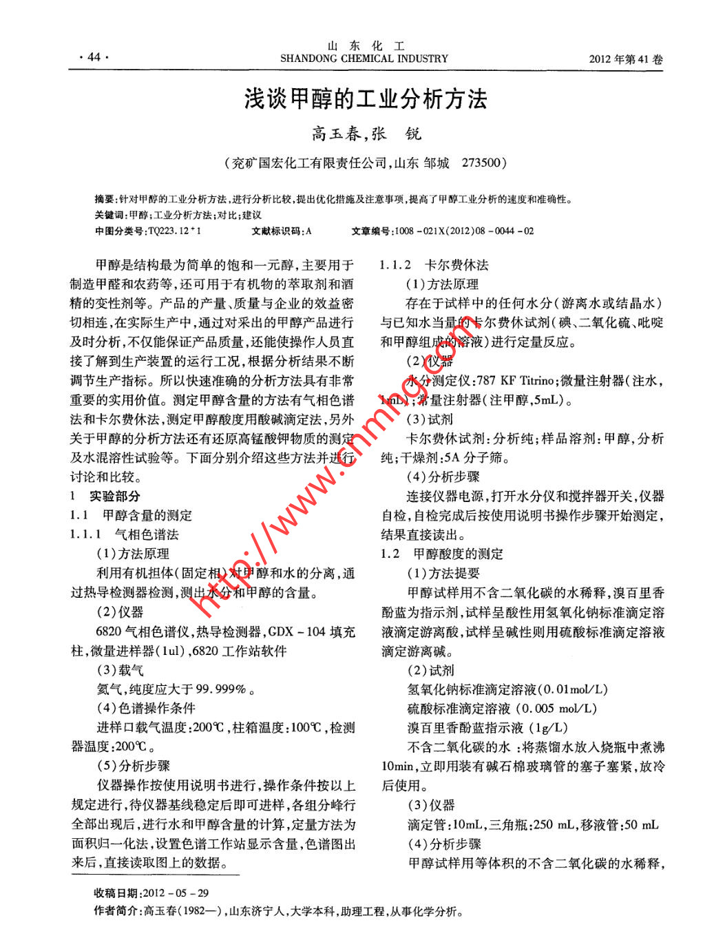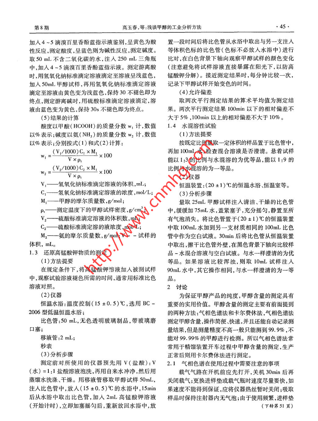 ●44●SHANDONG CHEMICAL INDUSTRY2012年第41卷淺談甲醇的工業(yè)分析方法高玉春,張銳(兗礦國(guó)宏化工有限責(zé)任公司,山東鄒城273500)摘要:針對(duì)甲醇的工業(yè)分析方法,進(jìn)行分析比較,提出優(yōu)化揩施及注意事項(xiàng),提高了甲醇工業(yè)分析的速度和準(zhǔn)確性。關(guān)鍵詞:甲醇;工業(yè)分析方法;對(duì)比;建議中圖分類號(hào):TQ223.12+1文獻(xiàn)標(biāo)識(shí)碼:A文章編號(hào):1008 -021X(2012)08 -0044 -02甲醇是結(jié)構(gòu)最為簡(jiǎn)單的飽和一元醇, 主要用于1.1.2卡 爾費(fèi)休法制造甲醛和農(nóng)藥等,還可用于有機(jī)物的萃取劑和酒(1)方法原理.精的變性劑等。產(chǎn)品的產(chǎn)量、質(zhì)量與企業(yè)的效益密存在于試樣中的任何水分(游離水或結(jié)晶水)切相連,在實(shí)際生產(chǎn)中,通過(guò)對(duì)采出的甲醇產(chǎn)品進(jìn)行與已知水當(dāng)量的卡爾費(fèi)休試劑(碘、二氧化硫、吡啶及時(shí)分析,不僅能保證產(chǎn)品質(zhì)量,還能使操作人員直和甲醇組成的溶液)進(jìn)行定量反應(yīng)。接了解到生產(chǎn)裝置的運(yùn)行工況,根據(jù)分析結(jié)果不斷(2)儀器調(diào)節(jié)生產(chǎn)指標(biāo)。所以快速準(zhǔn)確的分析方法具有非常水分測(cè)定儀:787 KF Titrino ;微量注射器(注水,重要的實(shí)用價(jià)值。測(cè)定甲醇含量的方法有氣相色譜1mL) ;常量注射器(注甲醇,5mL)。法和卡爾費(fèi)休法,測(cè)定甲醇酸度用酸堿滴定法,另外(3)試劑關(guān)于甲醇的分析方法還有還原高錳酸鉀物質(zhì)的測(cè)定卡爾費(fèi)休試劑:分析純;樣品溶劑:甲醇,分析及水混溶性試驗(yàn)等。下面分別介紹這些方法并進(jìn)行純;干燥劑:5A分子篩。討論和比較。(4)分析步驟1實(shí)驗(yàn)部分連接儀器電源,打開(kāi)水分儀和攪拌器開(kāi)關(guān),儀器1.1 甲醇含量的測(cè)定自檢,自檢完成后按使用說(shuō)明書(shū)操作步驟開(kāi)始測(cè)定,1.1.1 氣相色譜法結(jié)果直接讀出。(1)方法原理1.2 甲醇酸度的測(cè)定利用有機(jī)擔(dān)體(固定相)對(duì)甲醇和水的分離,通(1)方法提要.過(guò)熱導(dǎo)檢測(cè)器檢測(cè),測(cè)出水分和甲醇的含量。甲醇試樣用不含二氧化碳的水稀釋,溴百里香酚藍(lán)為指示劑,試樣呈酸性用氫氧化鈉標(biāo)準(zhǔn)滴定溶6820氣相色譜儀,熱導(dǎo)檢測(cè)器,GDX - 104填充液滴定游離酸,試樣呈堿性則用硫酸標(biāo)準(zhǔn)滴定溶液柱,微量進(jìn)樣器( 1ul) ,6820工作站軟件滴定游離堿。(3)載氣(2)試劑氦氣,純度應(yīng)大于99. 999%。氫氧化鈉標(biāo)準(zhǔn)滴定溶液(0.01mol/L)(4)色譜操作條件硫酸標(biāo)準(zhǔn)滴定溶液(0. 005 molVL)進(jìn)樣口載氣溫度:2009 ,柱箱溫度:100C ,檢測(cè)溴百里香酚藍(lán)指示液(1g/L)器溫度:200%。不含二氧化碳的水:將蒸餾水放入燒瓶中煮沸(5)分析步驟10min ,立即用裝有堿石棉玻璃管的塞子塞緊,放冷儀器操作按使用說(shuō)明書(shū)進(jìn)行,操作條件按以上后使用。規(guī)定進(jìn)行,待儀器基線穩(wěn)定后即可進(jìn)樣,各組分峰行(3)儀器全部出現(xiàn)后,進(jìn)行水和甲醇含量的計(jì)算,定量方法為滴定管:10mL,三角瓶:250 mL,移液管:50 mL面積歸一化法,設(shè)置色譜工作站顯示含量,色譜圖出來(lái)后,直接讀取圖上的數(shù)據(jù)。甲醇試樣用等體積的不含二氧化碳的水稀釋,收稿日期:2012-05 -29作者簡(jiǎn)介:高玉春( 1982- -) ,山東濟(jì)寧人,大學(xué)本科,助理工程,從事化學(xué)分析。第8期高玉春,等:淺談甲醇的工業(yè)分析方法加入4 ~5滴溴百里香酚藍(lán)指示液鑒別,呈黃色為酸置一段時(shí)間后將比色管從水浴中取出與另一支注人性反應(yīng),測(cè)定酸度,呈藍(lán)色則為堿性反應(yīng),測(cè)定堿度。等體積色標(biāo)的 比色管<色標(biāo)不必放人水浴中)進(jìn)行取50 mL不含二氧化碳的水,注人250 mL三角瓶比對(duì),在白色背景下軸向觀察甲醇試樣的顏色變化中,加入4 ~5滴溴百里香酚藍(lán)指示液。測(cè)定游離酸(注意避免將試樣溶液直接暴露在陽(yáng)光下,以防高時(shí),用氫氧化鈉標(biāo)準(zhǔn)滴定溶液滴定至溶液呈淺藍(lán)色,錳酸鉀分解)。 接近測(cè)定結(jié)果時(shí),每分鐘比較一次,加人50mL甲醇試樣,再用氫氧化鈉標(biāo)準(zhǔn)滴定溶液記錄下甲醇試樣開(kāi)始變色的時(shí)間。滴定至溶液由黃色變?yōu)闇\藍(lán)色,保持30不褪色即為(4)允許偏差終點(diǎn),測(cè)定游離堿時(shí),用硫酸標(biāo)準(zhǔn)滴定溶液滴定,溶取兩次平行測(cè)定結(jié)果的算術(shù)平均值為測(cè)定結(jié)液由藍(lán)色變?yōu)辄S色,保持30s不褪色即為終點(diǎn)。果。兩次平行測(cè)定結(jié)果100min 以下的相對(duì)偏差不(5)結(jié)果的計(jì)算大于5% ,100min以上的相對(duì)偏差不大于10%。酸度以甲酸( HCOOH)的質(zhì)量分?jǐn)?shù)w,計(jì),數(shù)值1.4水混溶性試驗(yàn)以%表示;堿度以氨(NH3)的質(zhì)量分?jǐn)?shù)w2計(jì),數(shù)值(1)方法提要.以%表示;分別按式( 1)和式(2)計(jì)算:按既定比例量取一定體積的樣品置于比色管中,(V,/1000)C, xM;再加100mL水,檢查混合溶液是否澄清。懸著試樣w,=tx 100Vxρ能以1:3的比例與水混溶的為優(yōu)等品,能以1:9的: (V/1000)C2 xM x 100比例與水混溶的為- - 等品。V xp:(2)儀器-氫氧化鈉標(biāo)準(zhǔn)滴定溶液的體積,mL;恒溫裝置:(20 +1)C的恒溫水浴、恒溫室等。-氫氧