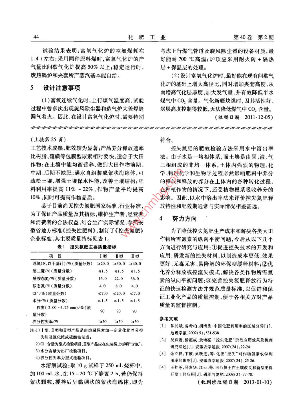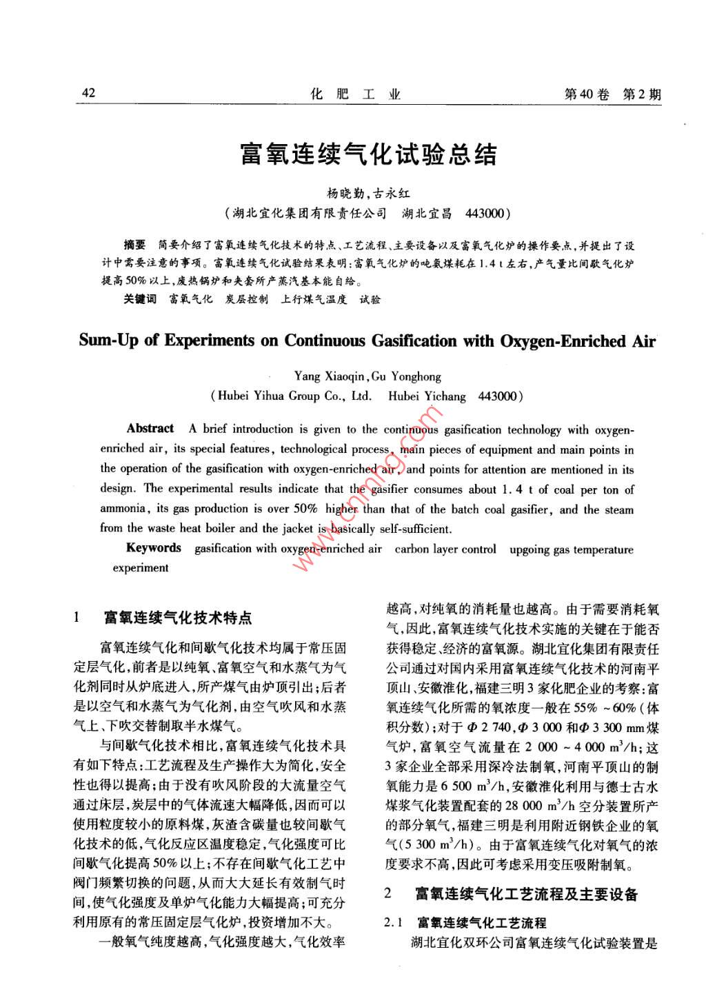 42化肥工業(yè)第40卷第2期富氧連續(xù)氣化試驗總結(jié)楊曉勤,古永紅(湖北宜化集團(tuán)有限責(zé)任公司湖北宜昌 443000)摘要簡要介紹了富氧連續(xù)氣化技術(shù)的特點、 工藝流程、主要設(shè)備以及富氧氣化爐的操作要點,并提出了設(shè)計中需要注意的事項。富氧連續(xù)氣化試驗結(jié)果表明:富氧氣化爐的噸氨煤耗在1.41左右,產(chǎn)氣量比間歇氣化爐提高50%以上,廢熱鍋爐和夾套所產(chǎn)蒸汽基本能自給。關(guān)鍵詞富氧氣化 炭層控制上行煤氣溫度 試驗Sum-Up of Experiments on Continuous Gasification with Oxygen-Enriched AirYang Xiaoqin, Gu Yonghong(Hubei Yihua Group Co., Ltd.Hubei Yichang 44000)Abstract A brief introduction is given to the continuous gasification technology with oxygen-enriched air, its special features,technological process,main pieces of equipment and main points inthe operation of the gasification with oxygen- enriched air, and points for attention are mentioned in itsdesign. The experimental results indicate that the gasifier consurmes about 1.4 t of coal per ton ofammonia, its gas production is over 50% higher than that of the batch coal gasifier, and the steamfrom the waste heat boiler and the jacket is basically self-suffcient.Keywords gasification with oxygen-enriched air carbon layer control upgoing gas temperatureexperiment越高,對純氧的消耗量也越高。由于需要消耗氧1富氧連續(xù)氣化技術(shù)特點氣,因此,富氧連續(xù)氣化技術(shù)實施的關(guān)鍵在于能否富氧連續(xù)氣化和間歇氣化技術(shù)均屬于常壓固獲得穩(wěn)定、經(jīng)濟(jì)的富氧源。湖北宜化集團(tuán)有限責(zé)任定層氣化,前者是以純氧、富氧空氣和水蒸氣為氣公司通過對國內(nèi)采用富氧連續(xù)氣化技術(shù)的河南平化劑同時從爐底進(jìn)人,所產(chǎn)煤氣由爐頂引出;后者頂山、安徽準(zhǔn)化,福建三明3家化肥企業(yè)的考察:富是以空氣和水蒸氣為氣化劑,由空氣吹風(fēng)和水蒸氧連續(xù)氣化所需的氧濃度一般在 55% ~60% (體氣上、下吹交替制取半水煤氣。積分?jǐn)?shù));對于φ2 740,φ 3000和φ 3300 mm煤與間歇氣化技術(shù)相比,富氧連續(xù)氣化技術(shù)具氣爐,富氧空氣流量在2 000 ~4 000 m'/h;這有如下特點:工藝流程及生產(chǎn)操作大為簡化,安全3家企業(yè)全部采用深冷法制氧,河南平頂山的制性也得以提高;由于沒有吹風(fēng)階段的大流量空氣氧能力是6500 m'/h,安徽淮化利用與德士古水通過床層,炭層中的氣體流速大幅降低,因而可以煤漿氣化裝置配套的28 000 m'/h空分裝置所產(chǎn)使用粒度較小的原料煤,灰渣含碳量也較間歇氣的部分氧氣,福建三明是利用附近鋼鐵企業(yè)的氧化技術(shù)的低,氣化反應(yīng)區(qū)溫度穩(wěn)定,氣化強度可比氣(5 300 m'/h)。由于富氧連續(xù)氣化對氧氣的濃間歇氣化提高50%以上;不存在間歇氣化工藝中度要求不高,因此可考慮采用變壓吸附制氧。閥門頻繁切換的問題,從而大大延長有效制氣時2富 氧連續(xù)氣化工藝流程及主要設(shè)備間,使氣化強度及單爐氣化能力大幅提高;可充分利用原有的常壓固定層氣化爐,投資增加不大。2.1富氧連續(xù)氣化工藝流程一般氧氣純度越高,氣化強度越大,氣化效率湖北宜化雙環(huán)公司富氧連續(xù)氣化試驗裝置是2013年4月楊曉勤等:富氧連續(xù)氣化試驗總結(jié)43在原間歇氣化爐的基礎(chǔ)上改造而成。氣溫度將迅速升高。汽氧比失調(diào)時,也易引起上來自空分裝置的4.0MPa純氧減壓至25kPa行溫度波動,此時應(yīng)根據(jù)煤氣成分分析結(jié)果進(jìn)行后進(jìn)人純氧緩沖罐,然后進(jìn)人富氧緩沖罐,與來自調(diào)節(jié)。上行煤氣溫度超標(biāo)時,若煤氣中有效氣含羅茨風(fēng)機的25kPa空氣混合,富氧空氣中含氧體量高、二氧化碳含量低,說明氧過量,需要增加蒸積分?jǐn)?shù)控制在55% ~60%。富氧空氣經(jīng)管道進(jìn)汽用量;若有效氣含量低、二氧化碳含量高,說明人氣化劑混合罐,與來自蒸汽緩沖罐的蒸汽混合蒸汽過量,需減少蒸汽用量或增加氧用量。在實后由爐底進(jìn)人氣化爐,所產(chǎn)半水煤氣由爐頂引出,際操作過程中,也可以通過調(diào)節(jié)加煤量來控制上然后依次經(jīng)過旋風(fēng)除塵器廢熱鍋爐后進(jìn)人煤氣行煤氣溫度,但必須優(yōu)先保證炭層高度??偣?。此后在進(jìn)行以新疆塊煤為原料的富氧連續(xù)(3)經(jīng)多次試驗,富氧連續(xù)氣化所產(chǎn)煤氣中氣化試驗時,在廢熱鍋爐后增設(shè)了噴淋式單爐洗的有效氣體積分?jǐn)?shù)最佳范圍為62% ~68%。當(dāng)氣塔。有效氣體積分?jǐn)?shù)低于62%時,說明爐內(nèi)氣化層溫2.2富氧連續(xù)氣化試驗裝置主要設(shè)備度較低,蒸汽用量也會偏高,經(jīng)濟(jì)性較差;當(dāng)有效(1)富氧氣化爐是由常壓間歇氣化爐改造而氣體積分?jǐn)?shù)超過68%時,爐內(nèi)溫度過高,極易引成,富氧空氣與蒸汽混合后并人爐底三叉管,經(jīng)鼓起結(jié)疤,炭層高時也容易引起掛壁。風(fēng)箱進(jìn)入爐內(nèi)。因上行煤氣溫度高,- -旦有紅炭落入灰倉,接觸富氧空氣后極易劇烈燃燒,能快速4富氧連續(xù)氣化試驗結(jié)果將灰倉燒紅,因此氣化爐爐頂、上行管道、爐底灰湖北宜化雙環(huán)公司分別對貴州煤煤棒、山西倉、鼓風(fēng)箱均要求涂抹耐高溫澆注料。煤煤棒、寧夏煤煤棒、內(nèi)蒙古機焦塊、內(nèi)蒙古焦粉(2)湖北宜化雙環(huán)公司富氧連續(xù)氣化試驗