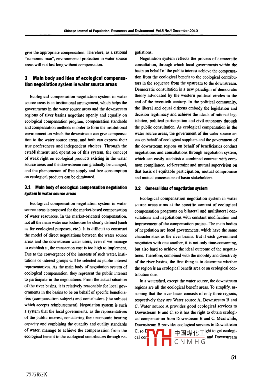 Chinese Jourmal of Populatin, Resources and Environment Vol.8 No.4 December 2010Negotiation System of Ecological Compensation ofWater Source AreasGe Yanxiang', Liu Shuyan2, Wu Feifei', Liang Ljuan'1. School of Economics and Management, Shandong Agricultural University, Tai"an Shandong 271018, China;2. Shandong Communication Media College, Jinan Shandong 250200, ChinaAbstract: In view of no generally acepted ecological compen- between water source areas and the downstream regions ofsation standards and metbods at present, this paper discusses the river basins, the standards and methods of compensationintroduction of the negotiation system to the process of ecologi- can be fixed. In this way, the stakeholders are motivated tocal compensation for water source areas. Tbat is, tbe govenneat extensively participate so that the compensation mechanismin water source areas and the downstream regions of river basins could run more efficiently, democratically and transpar-should confirm their respective rights and obligations and then es- ently.tablish their compensation standards through negotiations accord-ing t0 he dferet purposes of waler use. The amoun ofcompep 2 Extenalities of ecological benefts and eco-sation should be determined in the comprehensive considerationlogical compensation in water source areasof the quality, quantity and compensation price of water. Throughopen and fair negotiations, an institutional arangement will be setThe development, usage and protection of the ecologicalup, which can make the waler soure areas and the downsteam resources in water source areas will produce exteralitie.regions of river basins fully express their true preferences and theirThe existence of externality easily causes market failure.independent choices on the ecological environmentIn accordance with the views of economist Pigou (1952),Key words: water resource, cological compensation,n negoiation the government should pay compensation with financialsystem, extemalityrevenue for the positive extermalities, and impose a fine forthe negative extemalties, so that the private cost of the ex-1 Introductiontermnality producer is equal to social cost, in such a case thesocial welfare is enhanced.Ecological compensation, an economic measure to pro-tect the ecological environment of the downstream regions2.1 Extermality of ecologlcal compensation In waterof river basins, is the syntbesis of interest-driven, incentivesource areasand coordination mechanism that can promote ecologicalWater source areas will produce positive externality toprotection of the upstream areas. In the existing researchsoil and water conservation, watershed protection and waterand practice of ecological compenstion for water soure quality improvement when it protects and constructs theareas, the focuses and difculties are the determination ofecological environment resources. The positive extemnalitycompensation standards. Both the goverment compensa- makes the downstream gain profts more than the upstream,tion and the market compensation are the most controversialand the difference would constitute the positive external-issues in the eco-compensation. Ecological compensation ity of the ecological management (Ge, 2009). Accordinginvolves multiple main bodies, and there are no generally to extemnality theory, either the positive extermality or theaccepted standards and methods of compensation at pres- negative externality needs to achieve internalization. Theent. The implementation of current ecological or contingentimplementation of ecological compensation system, an ef-valuation method for water resources is dificult, and the act fective measure to achieve intermalization of economic ex-bodies are difficult to reach an agreement.ternalities, can correct the market failure which is caused byIn order to reduce transaction costs, a negotiation system economic extermalities in the field of ecological protectioncan be introduced into the process of ecological compensa- (Li, 2006), and achieve the optimal alcaion of ecologicaltion in the water source areas. Through the consultations resour中國煤化工Received 26 April 2010; acepted 17 July 2010TYHCNMHGCorresponding autbo: Ge Yanrxiang (geyarxiang@126.com)l9Chinese Joumal of Population, Resources and Emironment Vol.8 No.4 December 2010For the act body of the ecological construction, if the ex- areas and the downstream regions can be seen as“smalltermal cost cannot get compensation, they will certainly pro- pig”" and“big pig" in the process of the game. The optionsduce enough amount in accordance with their own needs (at for two sides are as fllows: option one, the downstream in-the intersection of the marginal private cost curve and the vests two units solely, the water source areas do not invest.marginal individual beneft curve) instead of social needs, At a result, the water source areas can obtain four units'thus causing supply shortage.benefits, while downstream gets four units' (10-4-4=4);For those who obtain external benefts without bearing option two, the water source areas invest two units solely,the extermal cost, they would further expand the invisiblethe downstream does not invest. The downstream can obtaindemand. At this time, there is a certain gap between the nine units' benefts, while the water source gets -1 unit (10quantity that the main body of the ecological construction-9-2=-1); option three, both the upstream and the down-is willing to produce and the quantities of the social needs, stream invest the same units to protect the basin ecologicaland this gap is just the shortage of the ecological construc-environment, the downstream gets six units' profits, andtion products. In this case, market mechanism has lost its only two units' profits are left to the water source areas; op-function, and inadequate supply of ecological construction tion four, neither the upstream nor the downstream invests,will result in the loss of social benefts.in this case, both sides get