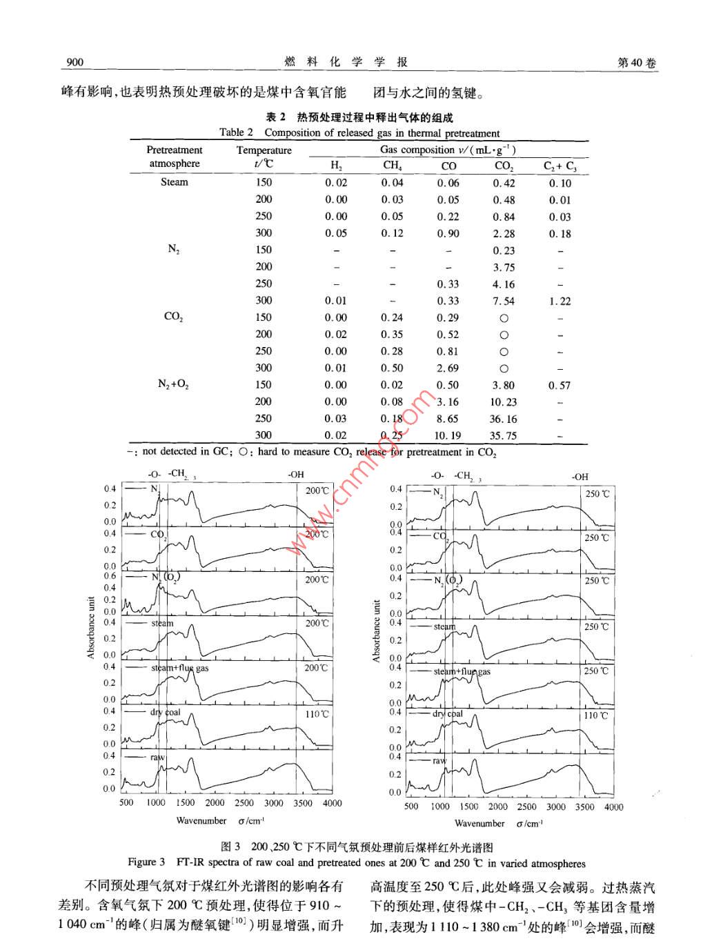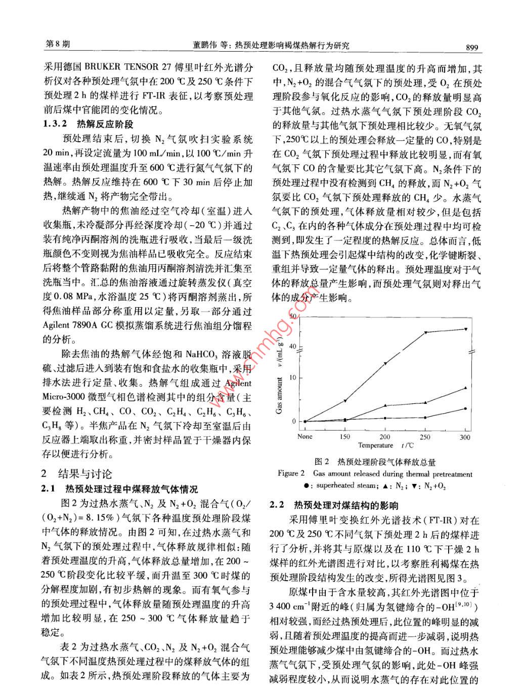 _898燃料化學(xué)學(xué)報(bào)第40卷提高2% ~5%。而Zeng等[6)在He氣氛下對Loy研究者對 于熱預(yù)處理對煤熱解產(chǎn)物的影響還沒有統(tǒng)Yang褐煤進(jìn)行熱預(yù)處理,發(fā)現(xiàn)250C以上的熱預(yù)處-的認(rèn)識(shí)(5,0I ,對于其中的機(jī)理尚不明確。理會(huì)導(dǎo)致半焦收率的增加而焦油收率的減少,通過本研究針對中國儲(chǔ)量較豐富的褐煤,采用煙道與文獻(xiàn)數(shù)據(jù)比較,認(rèn)為熱預(yù)處理的效果會(huì)受煤中含氣及過熱蒸汽進(jìn)行 熱預(yù)處理,分別考察煙道氣中各水量的影響。還有研究者采用四氫化蔡[”1、吡咯蒸組分和混合氣氛在預(yù)處理過程中對煤結(jié)構(gòu)及官能團(tuán)氣或溶劑[8等對煤進(jìn)行溶脹處理,熱解揮發(fā)分及焦造成的改變,及其對后續(xù)熱解產(chǎn)物的收率及油氣品油收率會(huì)提高20%左右,但是所用試劑本身代價(jià)較質(zhì)的影響,為開發(fā)適宜工業(yè)應(yīng)用的預(yù)處理工藝提供高,工業(yè)應(yīng)用尚存在成本問題。基礎(chǔ)數(shù)據(jù)。雖然目前從預(yù)處理角度研究煤結(jié)構(gòu)對熱解行為1實(shí)驗(yàn)部分影響的報(bào)道較多,但是這些手段或者預(yù)處理?xiàng)l件苛1.1實(shí)驗(yàn)原料刻,或者在成本上受限,在實(shí)際工業(yè)過程中應(yīng)用困煤樣采自內(nèi)蒙古錫林浩特勝利煤田(下文簡稱難,因此,選擇一種低成本且能有效運(yùn)行的預(yù)處理手為SL) ,屬于中國儲(chǔ)量較高并具有代表性的褐煤,其段具有重要的工業(yè)應(yīng)用價(jià)值。低階煤- 般含水量較工業(yè)分析和元素分析結(jié)果見表1。實(shí)驗(yàn)中使用原煤高,給運(yùn)輸及利用帶來困難,因此使用前--般需要對粒徑為0.5~1 mm,收到基進(jìn)樣,每次進(jìn)料約20 g低階煤進(jìn)行干燥以脫除一定的水 分,而作為干燥過(精確至0.001g)。本文中,預(yù)處理過程和熱解過程程的延續(xù),熱預(yù)處理具有易于實(shí)現(xiàn)的特點(diǎn),而且能充氣體釋放量以及熱解產(chǎn)物收率均以干燥基煤為基準(zhǔn)分利用煙道廢氣及過熱水蒸氣等工業(yè)常見熱源,投計(jì)算。資成本上可行且能提高能源的利用效率。而國內(nèi)外表1勝利褐煤的工 業(yè)分析和元素分析Table 1 Proximate and ultimate analyses of Shengi ligniteProximate analysis w。:/%Utimate analysis wg/%MFCACHNS24. 133. 431. 3811.1241. 222.3710.670. 621.2實(shí)驗(yàn)裝置Al2O3小球(外徑3 mm)的氣體預(yù)熱器組成,實(shí)現(xiàn)氣預(yù)處理及熱解實(shí)驗(yàn)裝置見圖1。體的混合、預(yù)熱及水蒸氣的生成。反應(yīng)系統(tǒng)采用石英材質(zhì)的固定床反應(yīng)器(內(nèi)徑30mm,長度350mm,中部放有用80目石英砂制成的燒結(jié)板),加熱電爐采用日本石川產(chǎn)業(yè)株式會(huì)社生產(chǎn)的透明電爐(型號TF-0410301000 ,功率1.43 kW)。預(yù)熱器與反應(yīng)器18廣ImicroGC之間的管路纏繞加熱帶以避免水蒸氣冷凝。產(chǎn)物收8集系統(tǒng)由焦油捕集裝置及氣體凈化及收集定量裝置組成。焦油經(jīng)多級冷卻和溶劑吸收兩種方式共同捕N2 CO, O2 H2O12集,而氣體則經(jīng)過除硫裝置、過濾裝置之后進(jìn)入到10 L的廣口瓶,采用排水法進(jìn)行收集、定量。圖1實(shí)驗(yàn)裝置示意圖Figure 1 A schematic diagram of the experimental apparatus1.3實(shí)驗(yàn)方法1: gas ecylinder; 2: peristalic pump; 3: mass flow meter1.3.1預(yù)處理 階段controller; 4: preheater; 5: fixed bed reactor;將稱量好的煤樣加入到固定床反應(yīng)器中,按照6: fumace; 7: tar collector; 8: condenser; 9: acetone trap;圖1所示連接反應(yīng)裝置,并檢查氣密性。反應(yīng)開始10: saturated sodium carbonate trap; 11: valve;前先通人預(yù)處理氣體對整個(gè)系統(tǒng)吹掃20min,以排12: saturated NaCl solution container; 13: measuring cylinder盡系統(tǒng)內(nèi)空氣,然后切換氣體流量為100 m[/min,本裝置包含三個(gè)部分:供氣系統(tǒng)、反應(yīng)系統(tǒng)及產(chǎn)以40C/min的升溫速率從室溫升至預(yù)處理溫度,物收集系統(tǒng)。供氣系統(tǒng)由高純N.( 99.99%9 )鋼瓶、并保持2 h。預(yù)處理階段生成的氣體由載氣帶出,并CO2(99.9%)鋼瓶、高純02(99.99%)鋼瓶、質(zhì)量由氣袋捕集送往氣相色譜進(jìn)行分析。流量計(jì)、蠕動(dòng)泵、裝有金屬絲網(wǎng)的混合器及填充有經(jīng)預(yù)處理后制備的煤樣,密封保存在干燥器中。第8期董鵬偉等:熱預(yù)處理影響褐煤熱解行為研究899采用德國BRUKER TENSOR 27傅里葉紅外光譜分CO2,且釋放量均隨預(yù)處理溫度的升高而增加,其析儀對各種預(yù)處理氣氛中在200 C及250 C條件下中,N2+O2的混合氣氣氛下的預(yù)處理,受02在預(yù)處預(yù)處理2h的煤樣進(jìn)行FT-IR表征,以考察預(yù)處理理階段參與氧化反應(yīng)的影響,CO2的釋放量明顯高前后煤中官能團(tuán)的變化情況。于其他氣氛。過熱水蒸氣氣氛下預(yù)處理階段CO,1.3.2熱解反應(yīng)階段的釋放量與其他氣氛下預(yù)處理相比較少。無氧氣氛預(yù)處理結(jié)束后,切換N2氣氛吹掃實(shí)驗(yàn)系統(tǒng)下,250C以上的預(yù)處理會(huì)釋放-定量的CO,特別是20 min,再設(shè)定流量為100 mL/min,以100 C/min升在CO2氣氛下預(yù)處理過程中釋放比較明顯,而有氧溫速率由預(yù)處理溫度升至600C進(jìn)行氮?dú)鈿夥障碌臍夥障翪O的含量要比其它氣氛下高。N,條件下的熱解。熱解反應(yīng)維持在600 