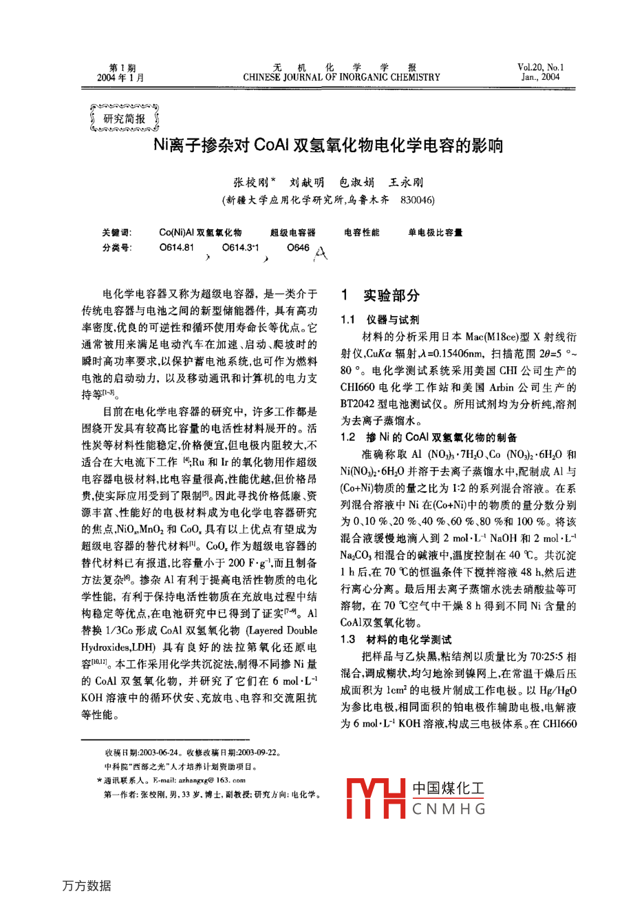 Ni離子摻雜對CoAl雙氫氧化物電化學(xué)電容的影響