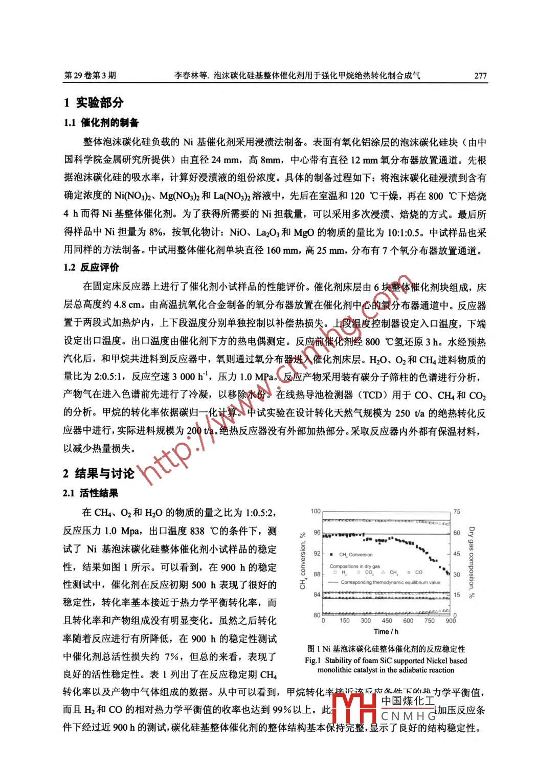 第29卷第3期化學(xué)反應(yīng)工程與工藝Vol 29. No 32013年6月Chemical Reaction Engineering and TechnologyJune 2013文章編號:1001—7631(2013)030276-05泡沫碳化硅基整體催化劑用于強(qiáng)化甲烷絕熱轉(zhuǎn)化制合成氣李春林,徐恒泳,侯守福,孫劍,盂繁瓊,懂恩寧,馬駿國,鮑峰(中國科學(xué)院大連化物所,遼寧大連116023)籀要:為實現(xiàn)強(qiáng)化耦合甲烷部分氧化和水蒸汽重整的絕熱轉(zhuǎn)化反應(yīng),采用了整體泡沫碳化硅為載體制備鎳基整體催化劑,進(jìn)行了整體結(jié)構(gòu)催化劑床層優(yōu)化設(shè)計,在由6塊整體催化劑組成的48cm床層高度的固定床反應(yīng)器上進(jìn)行了催化劑小試樣品的性能評價,并完成了中試驗證。通過采用多層催化劑床層結(jié)構(gòu)設(shè)計,避免了整體催化劑反應(yīng)物流旁路,同時還實現(xiàn)氧二次分散。首次開展進(jìn)料規(guī)模為200ta天然氣絕熱轉(zhuǎn)化中試實驗驗證了天然氣絕熱轉(zhuǎn)化技術(shù)的安全性,為該技術(shù)進(jìn)一步發(fā)展放大奠定基礎(chǔ)關(guān)鍵詞:泡沫碳化硅整體催化劑合成氣鎳催化劑絕熱重薹甲烷中圖分類號:O643.36;TQ0324文獻(xiàn)標(biāo)識碼:A甲烷水蒸汽重整制合成氣或氫氣已實現(xiàn)工業(yè)化半個世紀(jì)了,然而由于該反應(yīng)為強(qiáng)吸熱反應(yīng),需要巨大熱量供給,一直存在熱量傳遞受限問題。在一些新提出的合成路線中27,催化部分氧化由于低能量消耗以及高效轉(zhuǎn)化,被認(rèn)為是較有前途的一種路線,但該過程的實際應(yīng)用仍然存在諸如強(qiáng)放熱反應(yīng)難以控制的問題。為克服部分氧化熱傳遞限制問題,將甲烷部分氧化和水汽重整耦合起來,實現(xiàn)強(qiáng)放熱和吸熱反應(yīng)的耦合,進(jìn)行甲烷絕熱轉(zhuǎn)化,具有明顯應(yīng)用前景例碳化硅具有優(yōu)良的導(dǎo)熱能力、熱穩(wěn)定性及化學(xué)穩(wěn)定性,是一種優(yōu)秀的催化劑載體1,已被用于各種反應(yīng),如H2S的選擇性氧化、烴類脫氫、尾氣處理、甲烷偶聯(lián)等,近年來也被用作甲烷重整的催化劑載體。 Leroi等報道在甲烷部分氧化反應(yīng)中,Ni基碳化硅催化劑上碳納米纖維無法形成,因而維持了碳化硅的宏觀結(jié)構(gòu)2:孫等報道在N基碳化硅上,甲烷部分氧化顯示了很高的活性和穩(wěn)定性;碳化硅用于甲烷的水蒸氣重整也顯示出很好的結(jié)果。目前,關(guān)于碳化硅載體基催化劑的應(yīng)用主要集中在提高單個反應(yīng)的性能上,而利用碳化硅進(jìn)行吸熱和放熱反應(yīng)耦合的研究比較少。在天然氣部分氧化和蒸汽重整耦合反應(yīng)中,如果反應(yīng)體系特別是催化劑載體的傳熱較差,容易導(dǎo)致局部區(qū)域,比如部分氧化區(qū)域熱量過多而散熱太慢,使局部溫度極高,形成熱點,而在水蒸汽重整區(qū)域卻熱量供給不足形成冷點,熱點容易導(dǎo)致催化劑失活,而冷點使反應(yīng)活性下降。相比傳統(tǒng)的填充床顆粒催化劑,整體結(jié)構(gòu)催化劑在強(qiáng)化傳熱和傳質(zhì)方面具有優(yōu)勢。整體泡沫碳化硅具有三維通道結(jié)構(gòu)可以強(qiáng)化物料混合,而且其具有高導(dǎo)熱能力,可以強(qiáng)化傳熱,因此,利用整體泡沫碳化硅有利于甲烷部分氧化和水蒸汽重整的耦合。本工作研究了整體泡沫碳化硅為載體的N基整體結(jié)構(gòu)催化劑,用于甲烷部分氧化和水蒸汽重整耦合的絕熱轉(zhuǎn)化反應(yīng),考察了反應(yīng)器床層結(jié)構(gòu)的影響,以及首次開展的天然氣絕熱轉(zhuǎn)化制合成氣的中試結(jié)果。收稿日期:2013-03-21;修訂日期:2013-04-16。作者簡介:李春林(1975-),男,副研究員;徐恒泳(1963—),男,研H中國煤化工CNMHG基金項目:國家高技術(shù)研究發(fā)展計劃(863計劃)(2006AA030201)。第29卷第3期李春林等.泡沫碳化硅基整體催化劑用于強(qiáng)化甲烷絕熱轉(zhuǎn)化制合成氣1實驗部分11催化劑的制備整體泡沫碳化硅負(fù)載的Ni基催化劑采用浸漬法制備。表面有氧化鋁涂層的泡沫碳化硅塊(由中國科學(xué)院金屬研究所提供)由直徑24mm,高8mm,中心帶有直徑12mm氧分布器放置通道。先根據(jù)泡沫碳化硅的吸水率,計算好浸漬液的組份濃度。具體的制備過程如下:將泡沫碳化硅浸漬到含有確定濃度的NiNO3)、Mg(NO)2和La(NO)2溶液中,先后在室溫和120℃干燥,再在800℃下焙燒4h而得Ni基整體催化劑。為了獲得所需要的N擔(dān)載量,可以采用多次浸漬、焙燒的方式。最后所得樣品中N擔(dān)量為8%,按氧化物計:NO、La2O3和MgO的物質(zhì)的量比為101:05。中試樣品也采用同樣的方法制備。中試用整體催化劑單塊直徑160mm,高25mm,分布有7個氧分布器放置通道。12反應(yīng)評價在固定床反應(yīng)器上進(jìn)行了催化劑小試樣品的性能評價。催化劑床層由6塊整體催化劑塊組成,床層總高度約48cm。由高溫抗氧化合金制備的氧分布器放置在催化劑中心的氧分布器通道中。反應(yīng)器置于兩段式加熱爐內(nèi),上下段溫度分別單獨控制以補(bǔ)償熱損失。上段溫度控制器設(shè)定入口溫度,下端設(shè)定出口溫度。出口溫度由催化劑下方的熱電偶測定。反應(yīng)前催化劑經(jīng)800℃氫還原3h。水經(jīng)預(yù)熱汽化后,和甲烷共進(jìn)料到反應(yīng)器中,氧則通過氧分布器進(jìn)入催化劑床層。H2O、O2和CH4進(jìn)料物質(zhì)的量比為20.5:1,反應(yīng)空速3000h2,壓力1.0MPa。