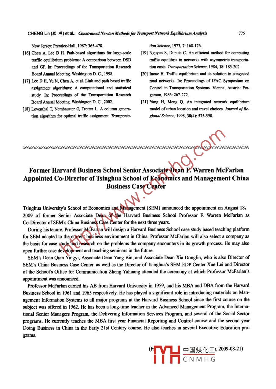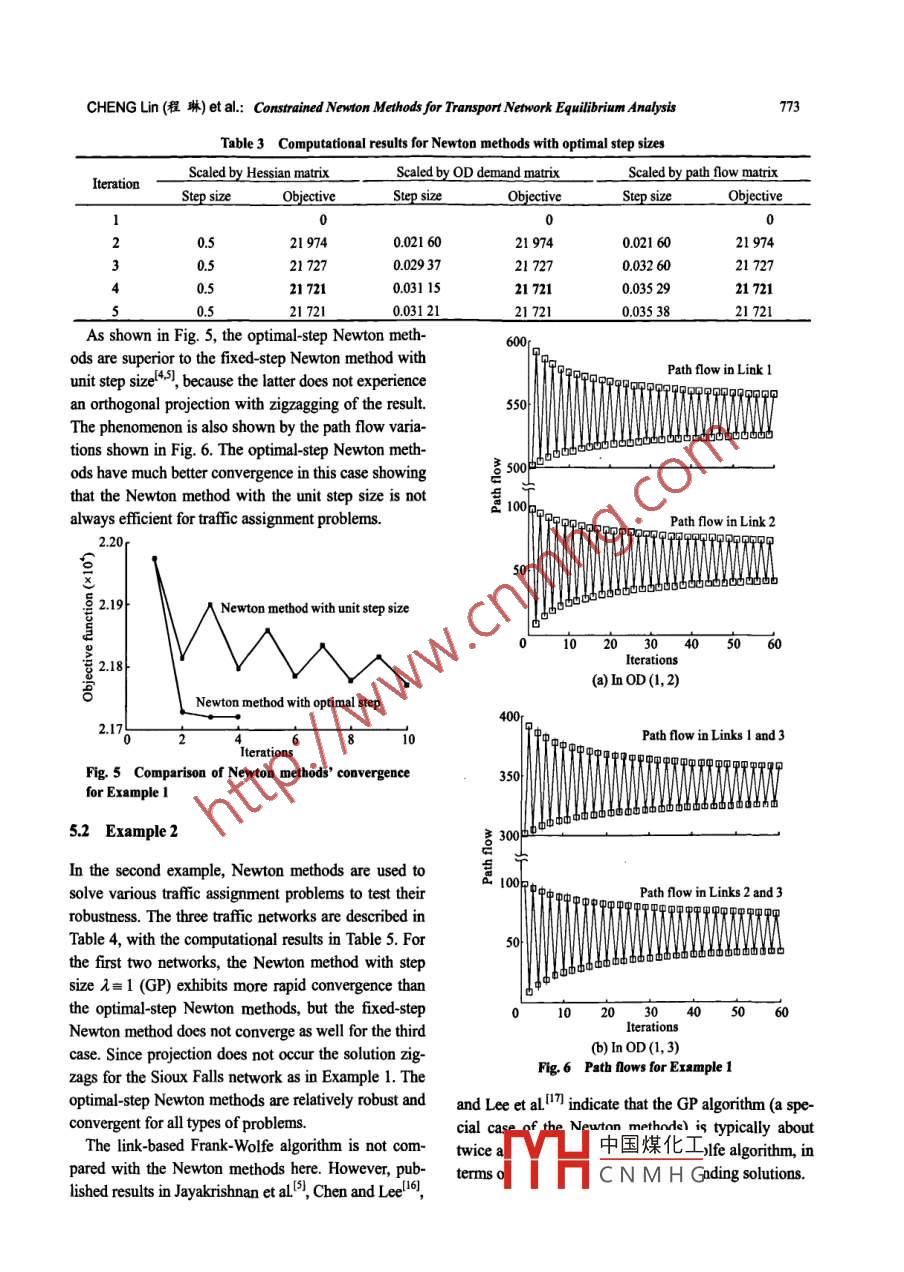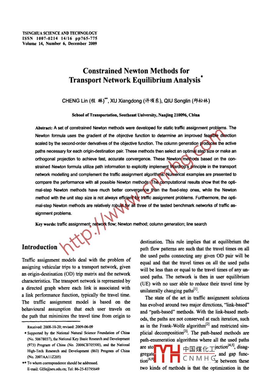 TSINGHUA SCIENCE AND TECHNOLOGYISSN 1007-0214 14/16 pp765-775Volume 14, Number 6, December 2009Constrained Newton Methods forTransport Network Equilibrium Analysis'CHENG Lin (程琳)", xU Xiangdong (許項(xiàng)東), QIU Songlin (邱松林)School of Transportation, Southeast University, Nanjing 210096, ChinaAbstract: A set of constrained Newton methods were developed for static tafflcf assignment problems. TheNewton formula uses the gradient of the objective function to determine an improved feasible directionscaled by the second-order derivatives of the objective function. The column generation produces the activepaths necessary for each origin-destination pair. These methods then select an optimal step size or make anorthogonal projection to achieve fast, accurate convergence. These Newton methods based on the con-strained Newton formula utilize path information to explicitly implement Wardrop's principle in the transportnetwork modelling and complement the traffc assignment algorithms. Numerical examples are presented tocompare the perfomance with all possible Newton methods. The computational results show that the opti-mal-step Newton methods have much better convergence than the fxed-step ones, while the Newtonmethod with the unit step size is not always eficient for trffic assignment problems. Furthermore, the opti-mal-step Newton methods are relatively robust for all three of the tested benchmark networks of traffic as-signment problems.Key words: taffic assignment; network flow; Newton method; column generation; line searchdestination. This rule implies that at equilibrium theIntroductionpath flow patterns are such that the travel times on allthe used paths connecting any given OD pair will beTraffic assignment models deal with the problem ofequal and that the travel times on all the used pathsassigning vehicular trips to a transport network, givenwill be less than or equal to the travel times of any un-an origin-destination (OD) trip matrix and the networkused paths. The network is then in user equilibriumcharacteristics. The transport network is represented by(UE) with no user able to reduce their travel time bya directed graph where each link is associated withunilaterally changing pathsl'.a link performance function, typically the travel time.The state of the art in taffic assigoment solutionsThe traffic assignment model is based on thebehavioural assumption that each user travels onhas evolved around two major directions,“l(fā)ink-based"and“patb-based" methods. With the link-based meth-the path that minimizes the travel time from origin toods, the paths are not conserved at each iteration, suchReceived: 2008-10-20; revised: 2009-06-09as in the Frank-Wolfe algorithm4 and restricted sim-* Supported by the National Naural Science Foundation of Chinaplicial decomposition5. The path-based methods are(No. 50678037), the National Key Basic Research and Developmnentpath-enumeration algorithms where all the used paths(973) Progam of China No. 206C70550), and the Nationalare sto中國(guó)煤化Tiectont, disag'High-Tech Research and Develpment (863) Program of Chinagregatoand gap func-(No. 20A112052)5** To whom correspondence should be adressed.YHcNMHGebetwentheseE-mail: GlSt@secu.edu.cn; Tel: 86 25- 83795649two kinds of methods is that the optimization in the766Tsinghua Science and Technology, December 2009, 14(6): 76-775link-based methods is performned in the link-flow do-has a given tafic demand qw The user equilibriummain, while that of the path-based methods is per-assignment problem is stated as follows.formed in the path-flow domain.min z(x)=Zj。 t。(s)ds(1a)The by-product of path-based methods is the abun-dant information on the path flow patterns at user equi-s.t.2 f"=q, Vw∈W(1b)librium. As is well known, the path flow pattern is notunique at user equilibrium'", but it is used in variousx=E 2 f".8, VaEA(1c)applications. For example, a path flow solution istypically used for real-time assignments, which is notf"≥0,Vk∈Kw, w∈W(1d)possible with the link-based Frank-Wolfe algorithm, inwhere xa is the link flow. ta is the travel time on link a.advanced traveller information systems or advancedδ%=| if link a belongs to path k; otherwise, 8k =0.traffic management systemslto. Sensitivity analysesl"f" is the flow on path k within OD pair w. Kw is the setrequire a set of reference path flows, from which a par-of paths within OD pair w. qw is the origin-destinationticular path flow patterm can be extracted. The Newtondemand between pair w.methods can be used to provide reference path sets forThe user equilibrium assignment problem is path-such flow sensitivity analyses. The path solution isformulated due to the constraints of Eqs. (lb)-(1d).related to a class of bilevel problemstas which uses theAltermatively, the same problem can be formulatedsensitivity of the link flow to the OD demand. Whenusing link variables indexed by origin or destination'!.path travel costs are nonadditive or nonlinear's, linkThis paper focuses on the formulation using path vari-flows can not be used alone to formulate and solve theables. Consistent with the necessary and sufficienttraffic assignment. Thus all of these types of problemsconditions of optimality, the equilibrium condition forneed a method to explicitly formulate and solve theeach OD pair is stated asproblem in the path flow domain.Zo.8x=i; if">0)This paper presents constrained Newton methods forVk, wsolving path-formulated static traffic assignment prob-Zt&≥i if" =0|lems. Column generation, orthogonal projectiont orine searchl4 can be incorporated into the solutionwhere r = min{t.δ%x} is the shortest path travelprocedure. With column generation, the active pathstime within OD pair w, equal to the Lagrange multi-joining each OD pair are generated only when needed.plier at this point of Eq. (lb) at the optimal point.The line search or orthogonal projection methods areThe solution of the UE assignment model can beused to avoid i