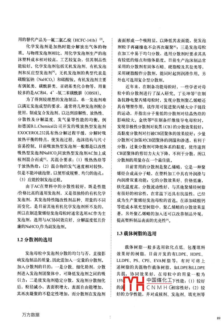 文章編號(hào):1005-360(2008)03008805聚烯烴發(fā)泡母粒的研制及生產(chǎn)現(xiàn)狀與展望Actuality and Prospect of research and Development of FoamingMaster Batch of polyolefin郭娟2,劉長(zhǎng)維',張進(jìn)2 Guo Juan2, Liu Changwei, Zhang Jin2京化工大學(xué)材料科學(xué)與工程學(xué)院,北京100029可北理工大學(xué),河北唐山0630091. College of Matenals Science and Engineenng. Beiing University of Technology, Being 100029, China2. Hebei Polytechnic University, Tangshan 063009, China摘要:述了裁泡母粒的組成發(fā)泡劑、分散劑、就體制脂和腦發(fā)海劑的選用鼠則及對(duì)發(fā)泡母粒性能的影響:分析了近年來發(fā)泡母粒的生產(chǎn)應(yīng)用狀況晨置了發(fā)泡母粒的應(yīng)用動(dòng)向。e Abstract: It expounded the composition of the foaming master batch, the choosing principle of vesicantdispersant, barrier resin and assistant vesicant as well as their effects on the properties offoaming master batch. it also analyzed the production and application of foaming master batchin recent years, and predicted the application trend of foaming master batch垂關(guān)鍵詞:聚烴;發(fā)泡母粒;分散劑:發(fā)泡劑●中圖分類號(hào):TQ3251非文獻(xiàn)標(biāo)識(shí)碼:An Key words: Polyolefin; Foaming master batch; Dispersant; Vesicant普通發(fā)泡劑在加工泡沫塑料時(shí)存在分散性發(fā)泡母粒一般由發(fā)泡劑、分散劑、載體樹脂差、粉塵飛揚(yáng)、計(jì)量不準(zhǔn)等缺陷,因此工業(yè)生助發(fā)泡劑4部分組成產(chǎn)中常采用改性發(fā)泡劑來提高其加工性能,即將發(fā)泡劑制成發(fā)泡母粒用于生產(chǎn)泡沫塑料制品。將11發(fā)泡劑選擇聚合物基體、載體樹脂、發(fā)泡劑、分散劑、發(fā)泡助劑、加工助劑等配制成高濃度分散體,用雙螺發(fā)泡劑可分為物理發(fā)泡劑和化學(xué)發(fā)泡劑。按桿擠出機(jī)加工成發(fā)泡母粒。發(fā)泡母粒的使用不僅:發(fā)泡劑的分子組成,可分為無機(jī)發(fā)泡劑和有機(jī)發(fā)簡(jiǎn)化了泡沫塑料制品生產(chǎn)工藝,而且具有許多優(yōu)}泡劑2。點(diǎn),如節(jié)省原料,減少對(duì)設(shè)備的磨損,提高生產(chǎn)物理發(fā)泡劑又稱揮發(fā)性發(fā)泡劑,一般是能夠效率,減輕制品質(zhì)量、提高制品剛度和尺寸精度、}溶于樹脂的低沸點(diǎn)液體或易升華的固體,在塑料防止縮孔與變形等。目前母?;殉蔀榘l(fā)泡劑偶發(fā)泡過程中,僅是物理狀態(tài)發(fā)生了變化,化學(xué)組氮二甲酰胺(AC)的改性趨勢(shì)之一,它對(duì)推動(dòng)泡;成不變。使用物理發(fā)泡劑生產(chǎn)泡沫制品,發(fā)泡溫沫塑料工業(yè)的迅猛發(fā)展起了很大作用。度低,發(fā)泡工藝簡(jiǎn)單,成本低,缺點(diǎn)是發(fā)氣量不大。常V凵中國煤化工己烷、三氯氟甲烷1發(fā)泡母粒的組成及性能CNMHG以下即為氣體,因CFC-11對(duì)大氣臭氧層具有破壞作用,因此其最常s[收贏漢搞123用的替代產(chǎn)品為一氟二氯乙烷(HCFC-141b)因表面形成一個(gè)吸附層,以降低其表面能,使發(fā)泡化學(xué)發(fā)泡劑是加熱時(shí)能分解放出氣體的物:劑粒子再碰撞也不會(huì)再次凝聚6;三是發(fā)泡母粒質(zhì)。與物理發(fā)泡劑相比,用化學(xué)發(fā)泡劑生產(chǎn)的泡在加工中易于均勻分散,選用分散劑時(shí)要求其具沫塑料成本相對(duì)較高,工藝較復(fù)雜,但其制品性氵有較低的熔點(diǎn)和熔體黏度。目前生產(chǎn)泡沫制品常能較好?;瘜W(xué)發(fā)泡劑包括無機(jī)發(fā)泡劑、有機(jī)發(fā)泡采用的分散劑有固體石蠟、硬脂酸及其鹽類等,劑和反應(yīng)型發(fā)泡劑。無機(jī)發(fā)泡劑的典型代表是:采用硬脂酸作分散劑,能同時(shí)起到潤(rùn)滑作用。另碳酸氫鈉(NalH(O3)和碳酸銨。有機(jī)發(fā)泡劑主要}外也可選用復(fù)合型分散劑。有偶氮類、磺酰肼類、亞硝基類化合物等,用量近年來,在制備功能母粒時(shí),一些學(xué)者對(duì)母較多的是AC和4,4’-氧二苯磺酰肼(OBSH)粒中的分散劑進(jìn)行了深入研究。丁長(zhǎng)坤等在制為了得到較理想的發(fā)泡制品,單一發(fā)泡劑難備抗靜電聚丙烯母粒時(shí),發(fā)現(xiàn)分散劑聚乙烯蠟還以滿足發(fā)泡成型的要求,通常將幾種發(fā)泡劑配合:具有增塑作用,該作用可促進(jìn)聚丙烯大分子鏈段使用,制成復(fù)合發(fā)泡劑,以達(dá)到溶解性、放熱性、:的運(yùn)動(dòng),并指出分子量低的分散劑對(duì)結(jié)晶熱焓的分散性及分解溫度、發(fā)氣量等性能的均衡。例:影響較大。金欣等在制備纖維級(jí)導(dǎo)電母粒時(shí),如德國 B L Chemical公司開發(fā)的吸放熱型發(fā)泡劑:發(fā)現(xiàn)非極性分散劑對(duì)炭黑(CB)的分散效果較好;EXOCEROL232具有熱分解過程平緩,分解時(shí)吸高黏度分散劑對(duì)打破CB團(tuán)聚體的效果較好;少量放熱平衡的特點(diǎn),使發(fā)泡過程、泡沫結(jié)構(gòu)與尺寸:分散劑可加強(qiáng)對(duì)CB團(tuán)聚體的潤(rùn)濕和滲透,有利于容易控制。目前吸放熱型發(fā)泡劑一般都是以改性:分散;過量分散劑可降低體系的黏度,使傳遞到吸熱型發(fā)泡劑 Nahco同放熱型發(fā)泡劑AC加上成;CB團(tuán)聚體的剪切力大大下降,不利于分散,所以核劑混合而成,其混合要求:(1)吸熱熱焓等:分散劑的用量存在一個(gè)最佳值。于放熱熱焓;(2)混合物的發(fā)氣速度相對(duì)較快,目前常用的分散劑是聚乙烯蠟,它是一種聚但是